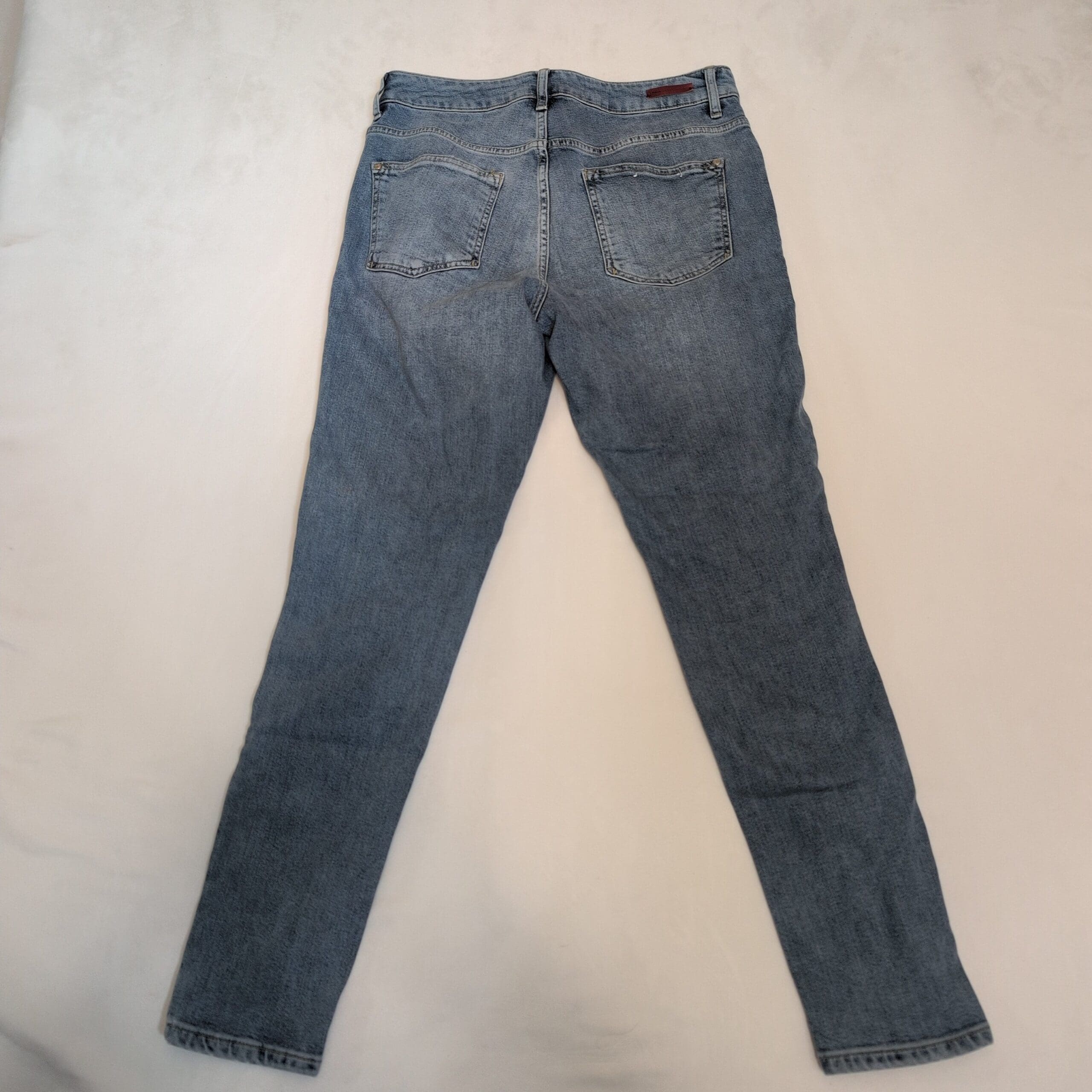 Pilcro And The Letterpress women’s skinny jeans in blue, size 30 (standard). Features pearl embellishments across the front pockets and upper thighs for a stylish, eye-catching finish. Classic five-pocket construction with belt loops and zip fly. Gently pre-owned and ready to wear — see photos for details.