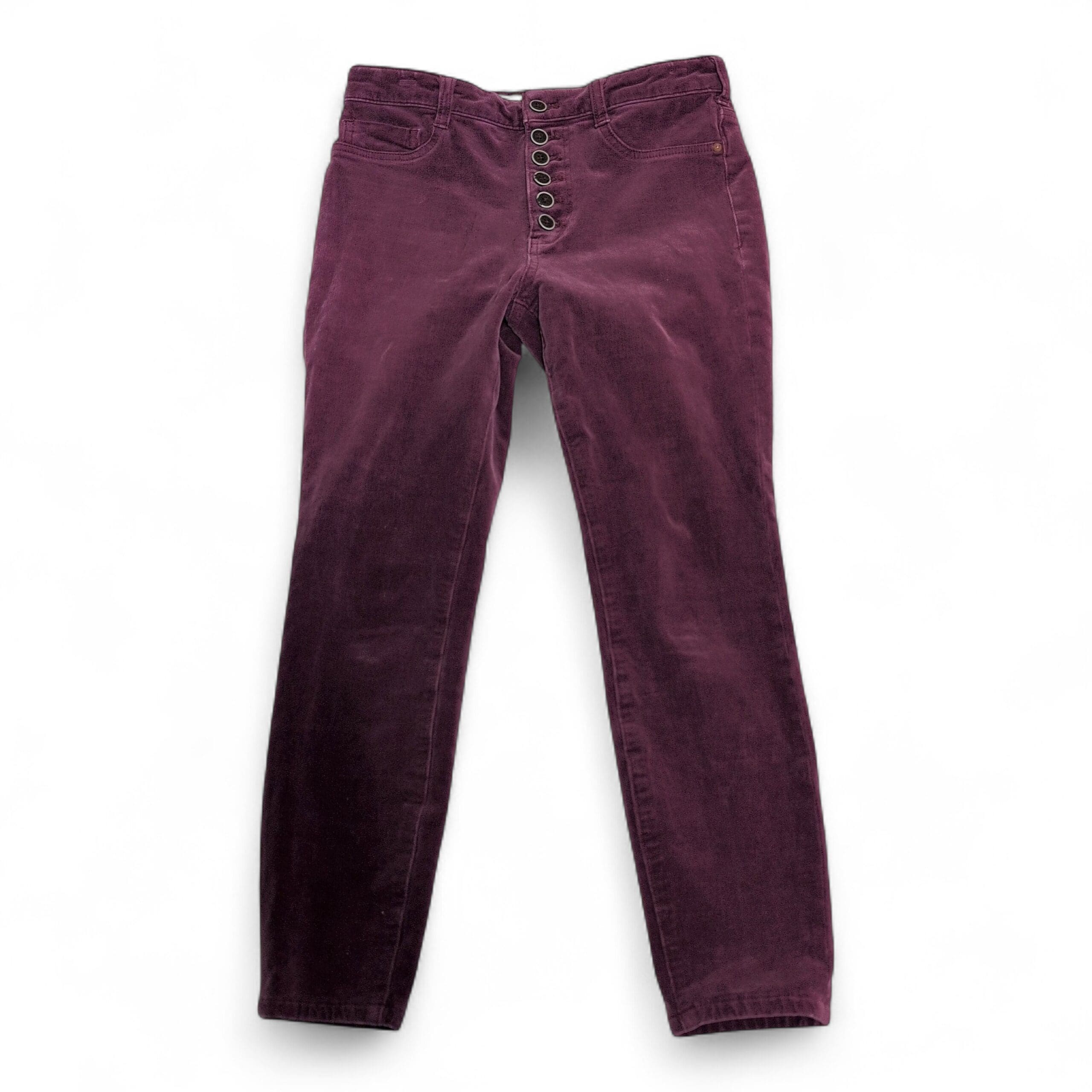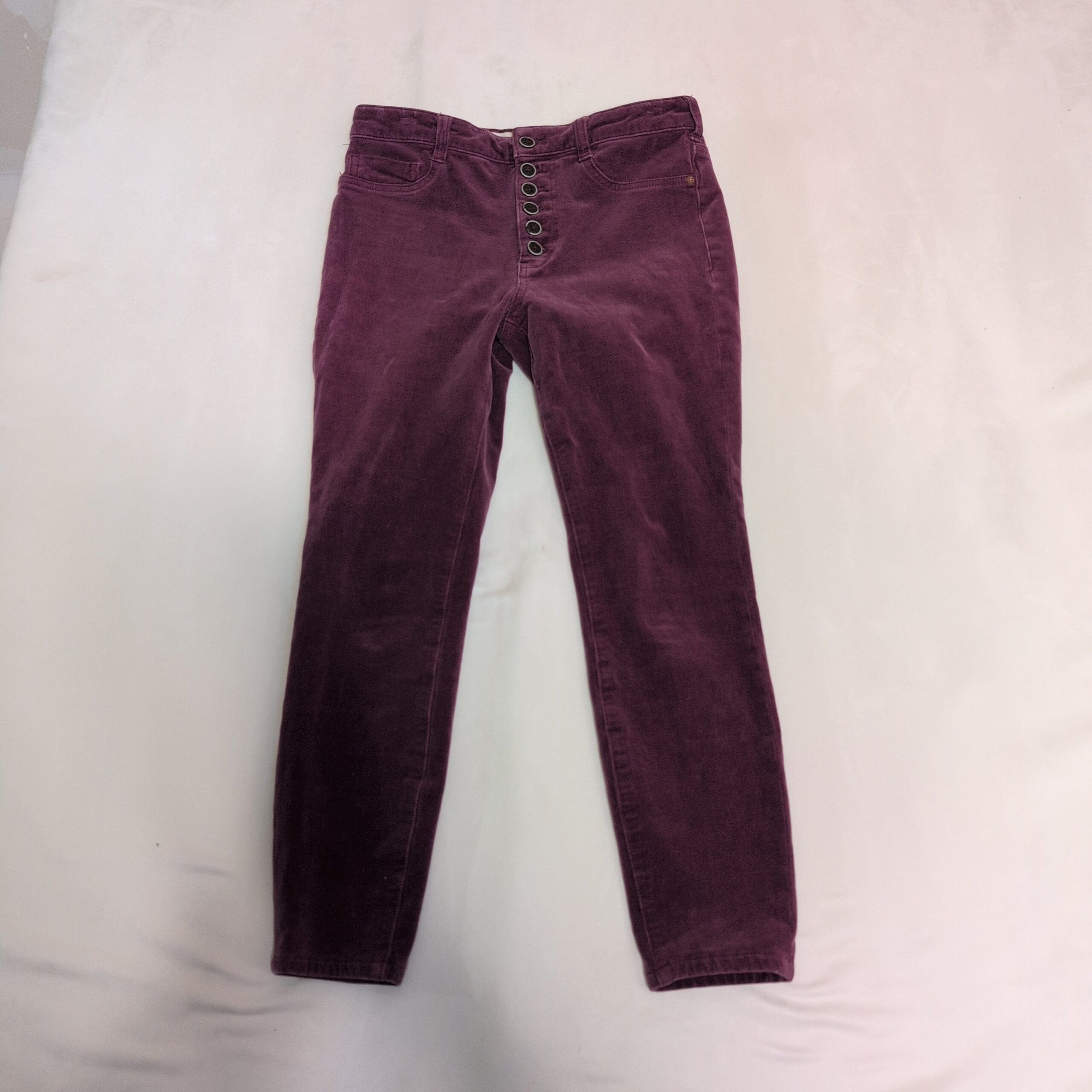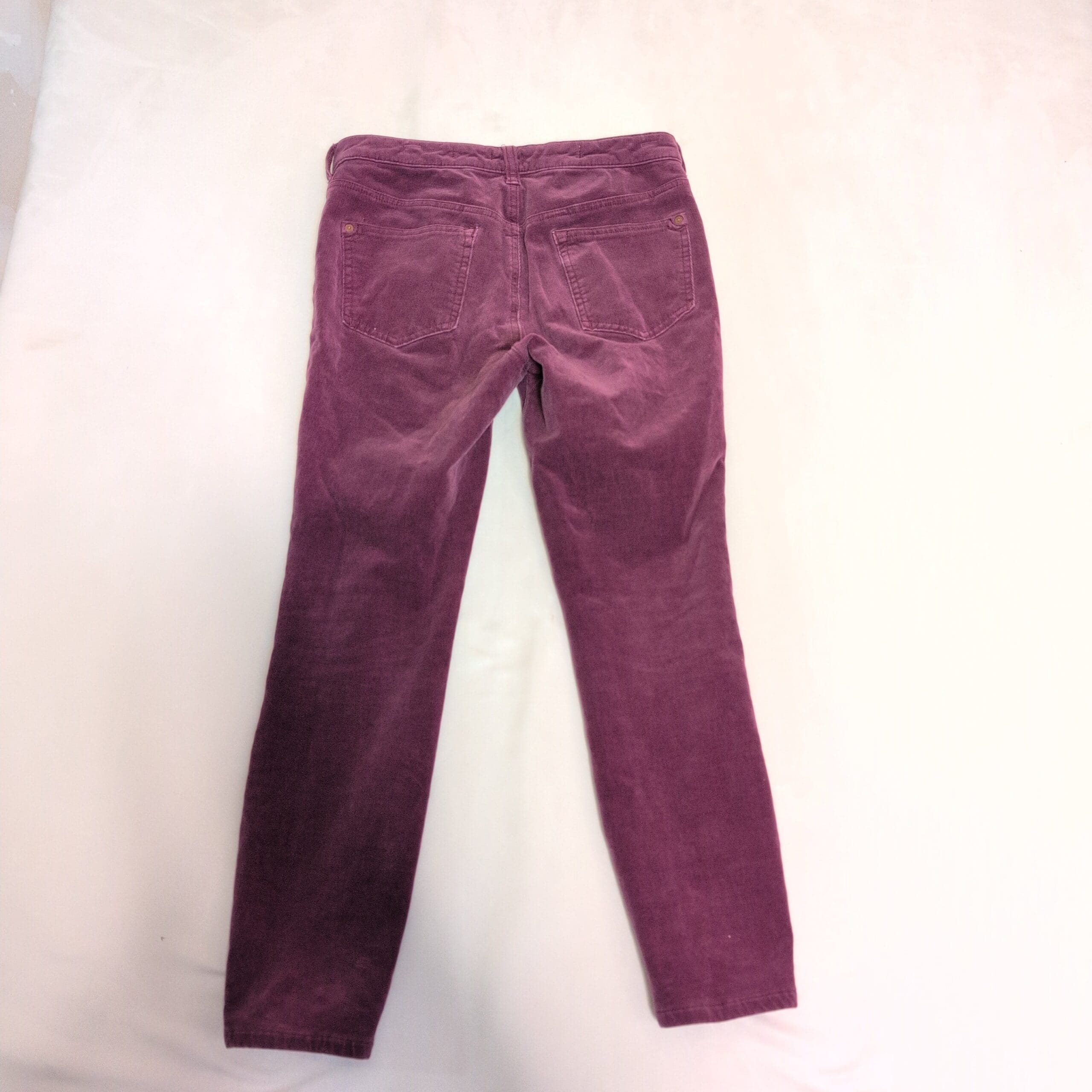 Pilcro corduroy skinny pants in a rich pink-purple color. Size 29 (women). Slim, tapered silhouette with a five-button front closure and classic five-pocket styling. Soft corduroy fabric provides texture and seasonal warmth while maintaining a polished casual look. Good used condition — free of major rips, tears, or stains; typical light wear may be present. Color may vary slightly from photos due to lighting.