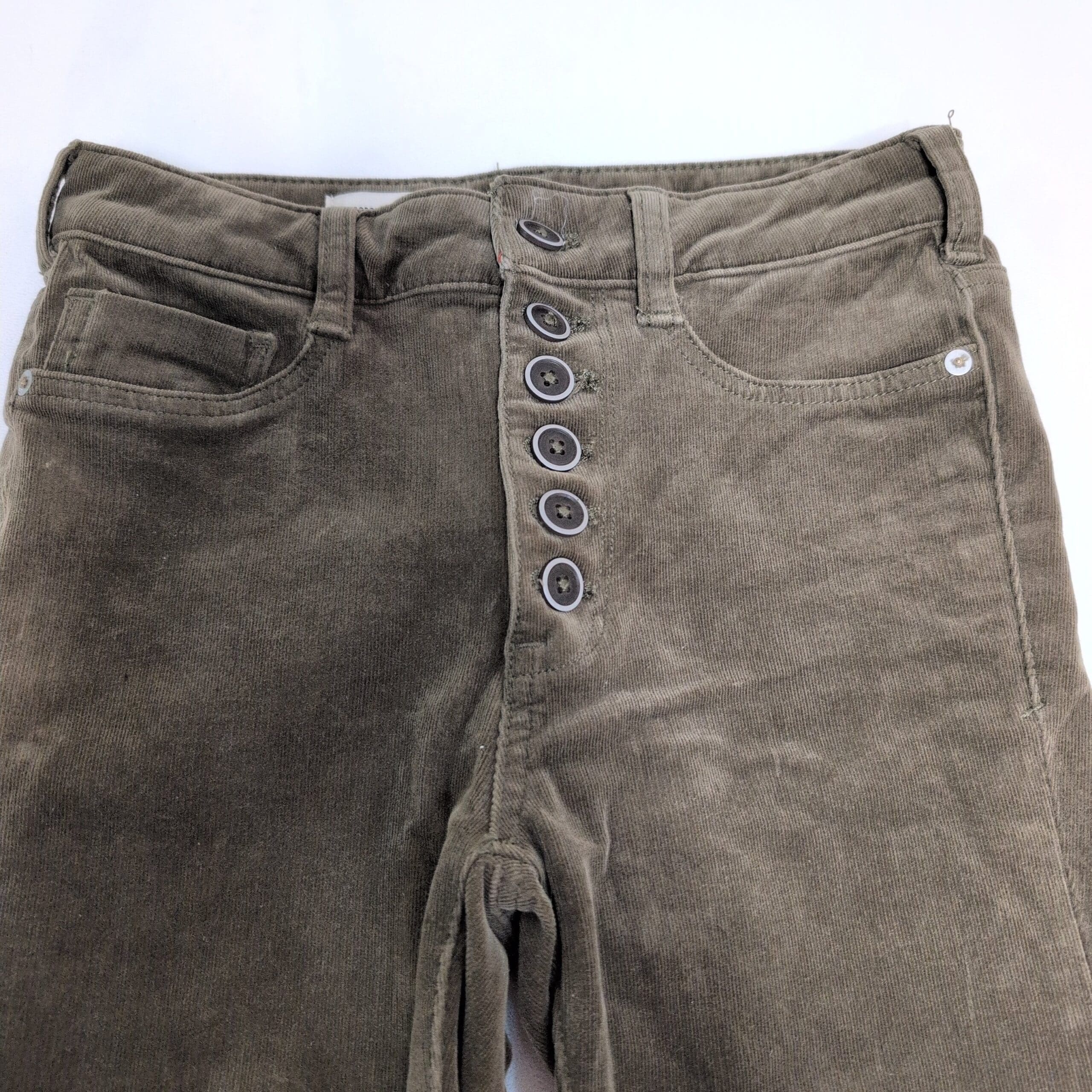 Pilcro & The Letterpress women’s corduroy skinny pants in olive green, size 26. High-rise silhouette with a five-button front closure and classic five-pocket styling. Slim through the hip and thigh with a long, narrow leg — soft corduroy texture makes these ideal for fall and winter wardrobes. Style with ankle boots, cozy sweaters, or a tailored blazer for an elevated casual look.