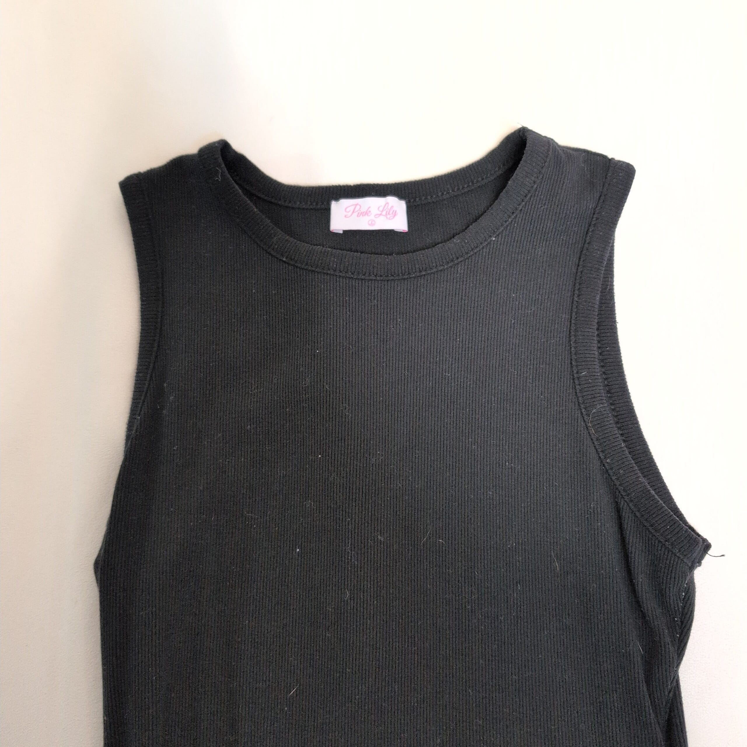 Black ribbed sleeveless bodysuit by Pink Lily — Size L. Features a crew neckline, fitted silhouette, and a thong-style snap closure for a smooth, tucked-in look. Stretch ribbed knit makes it a versatile layering piece for day or night.