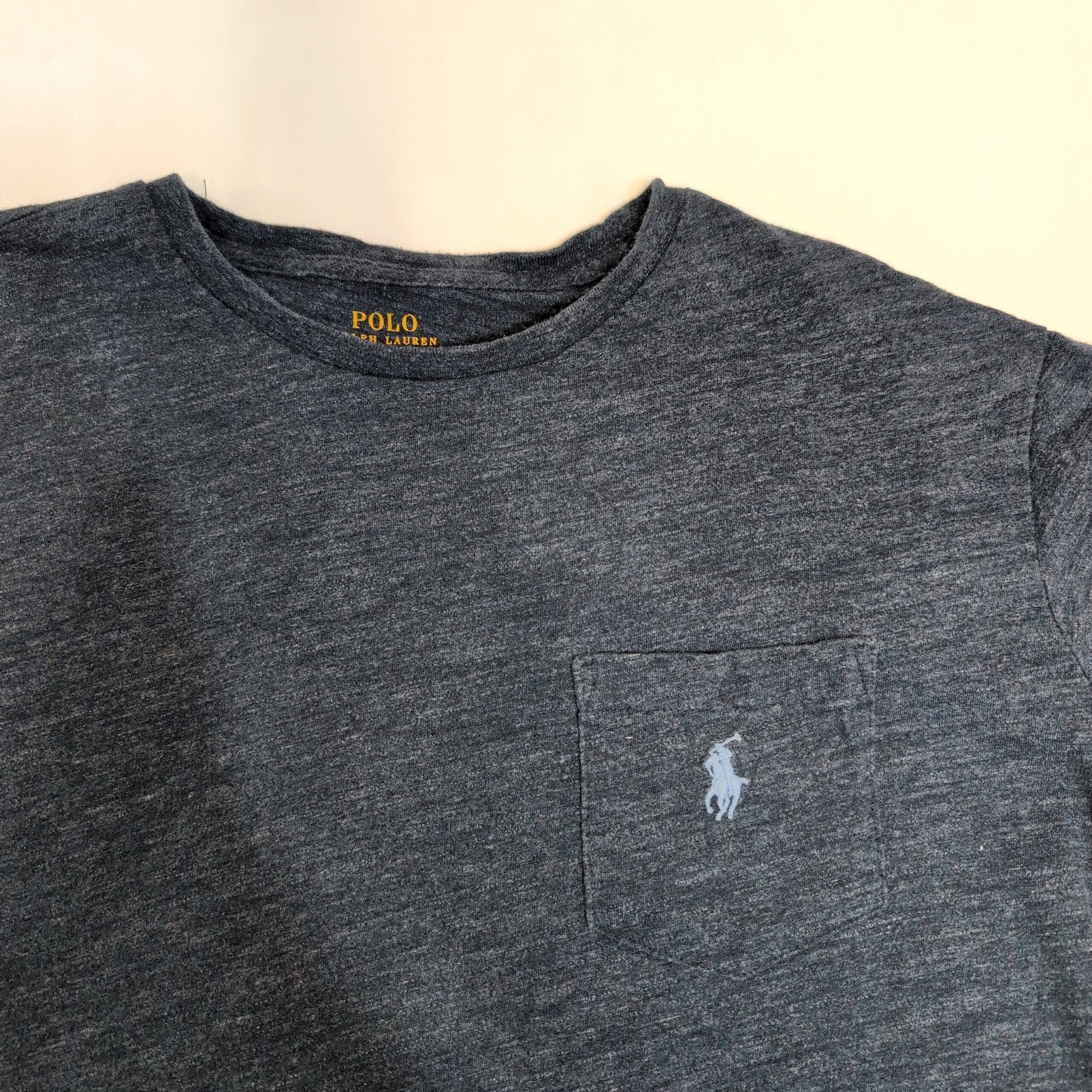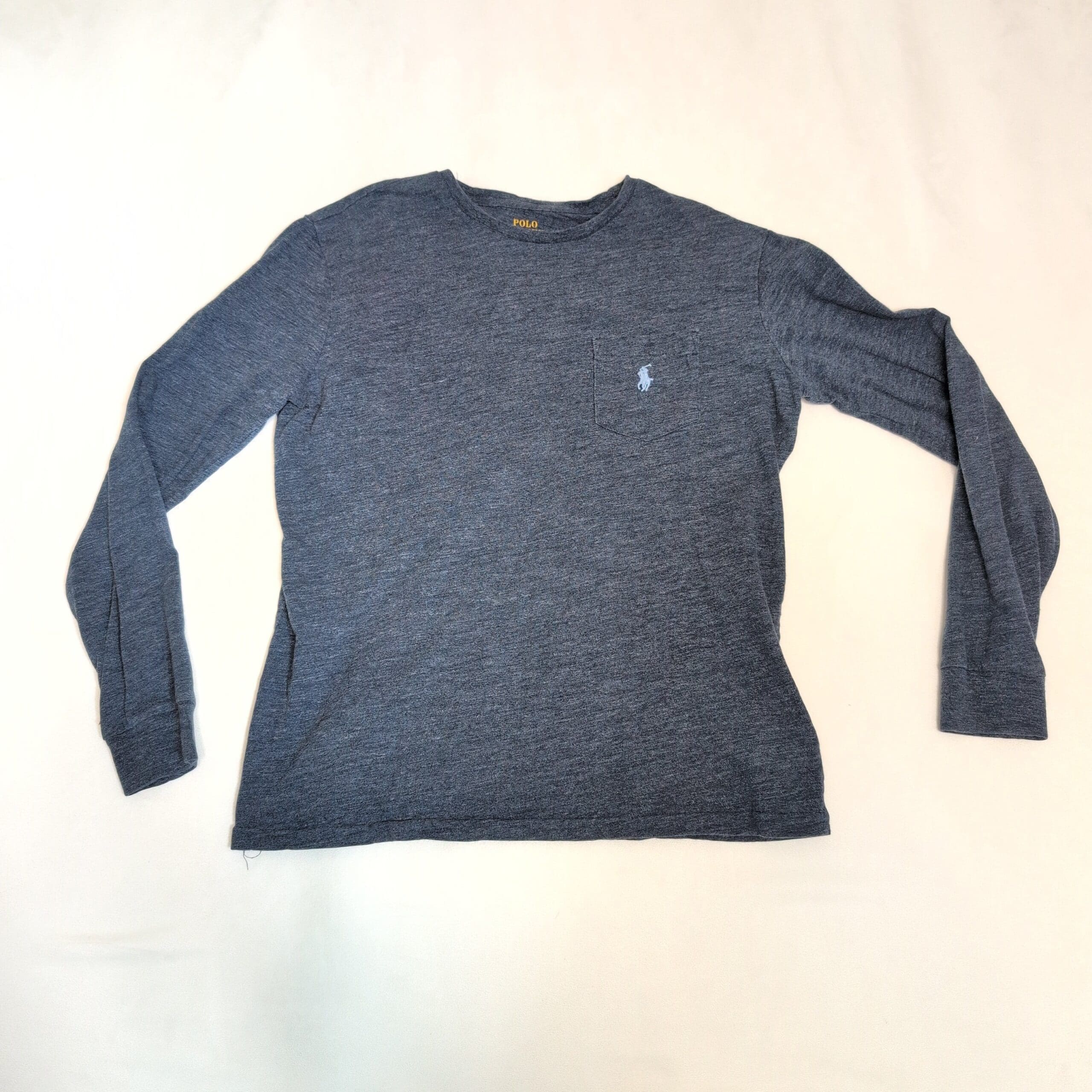 Polo Ralph Lauren men’s long-sleeve pocket tee in heathered blue. Size M (standard). Classic crewneck with a chest pocket and signature embroidered pony — soft cotton-blend jersey that’s lightweight and great for layering or casual wear. True to size and easy to style.