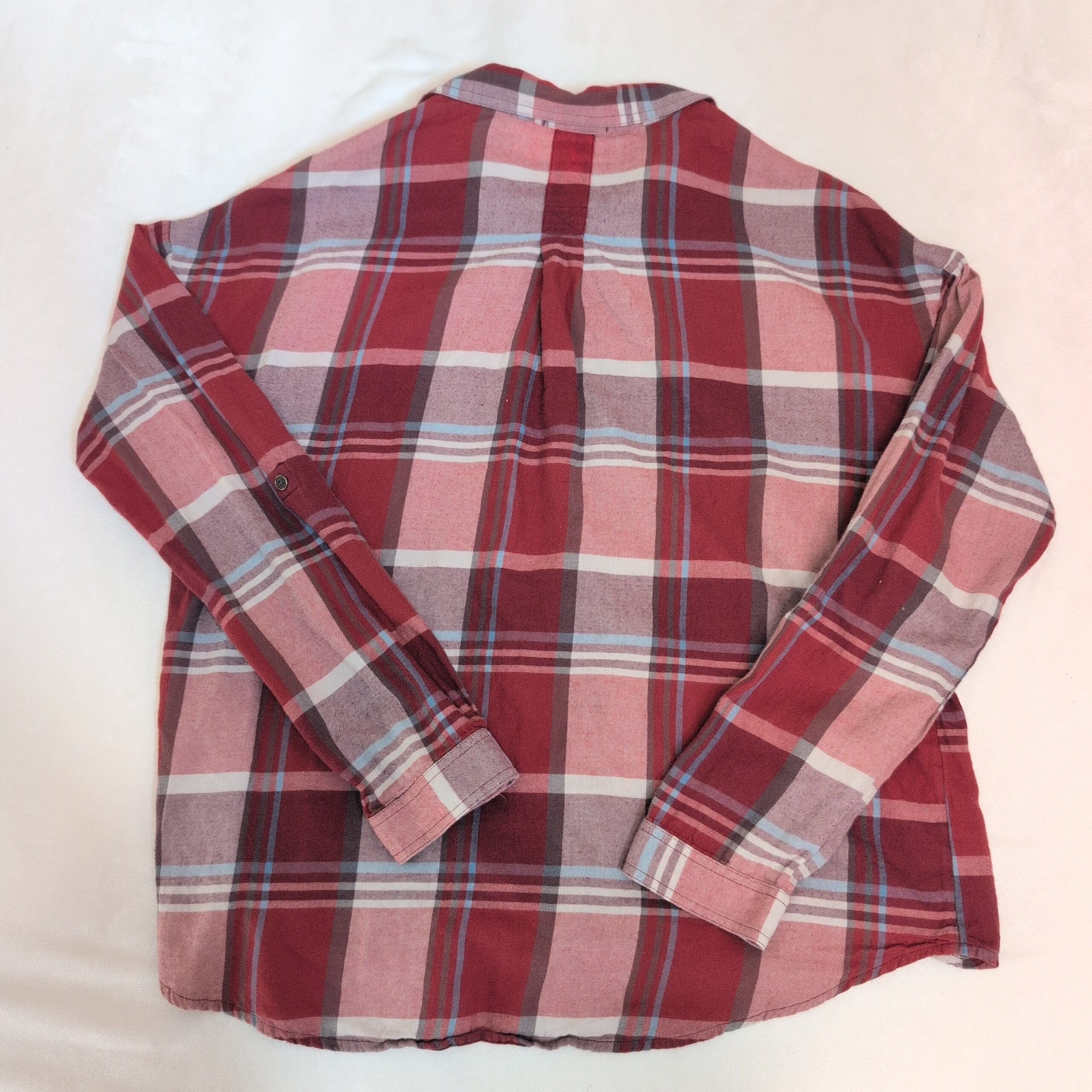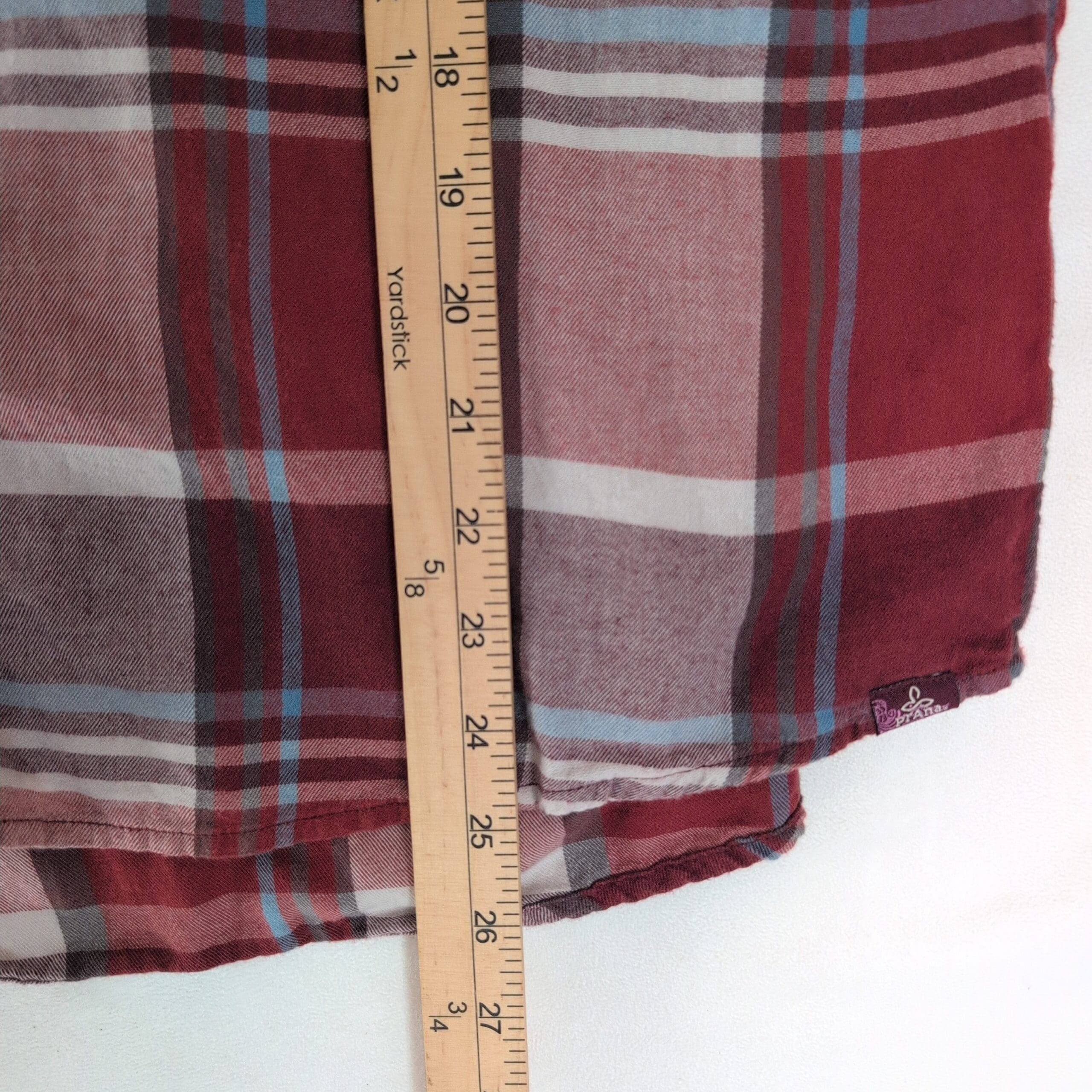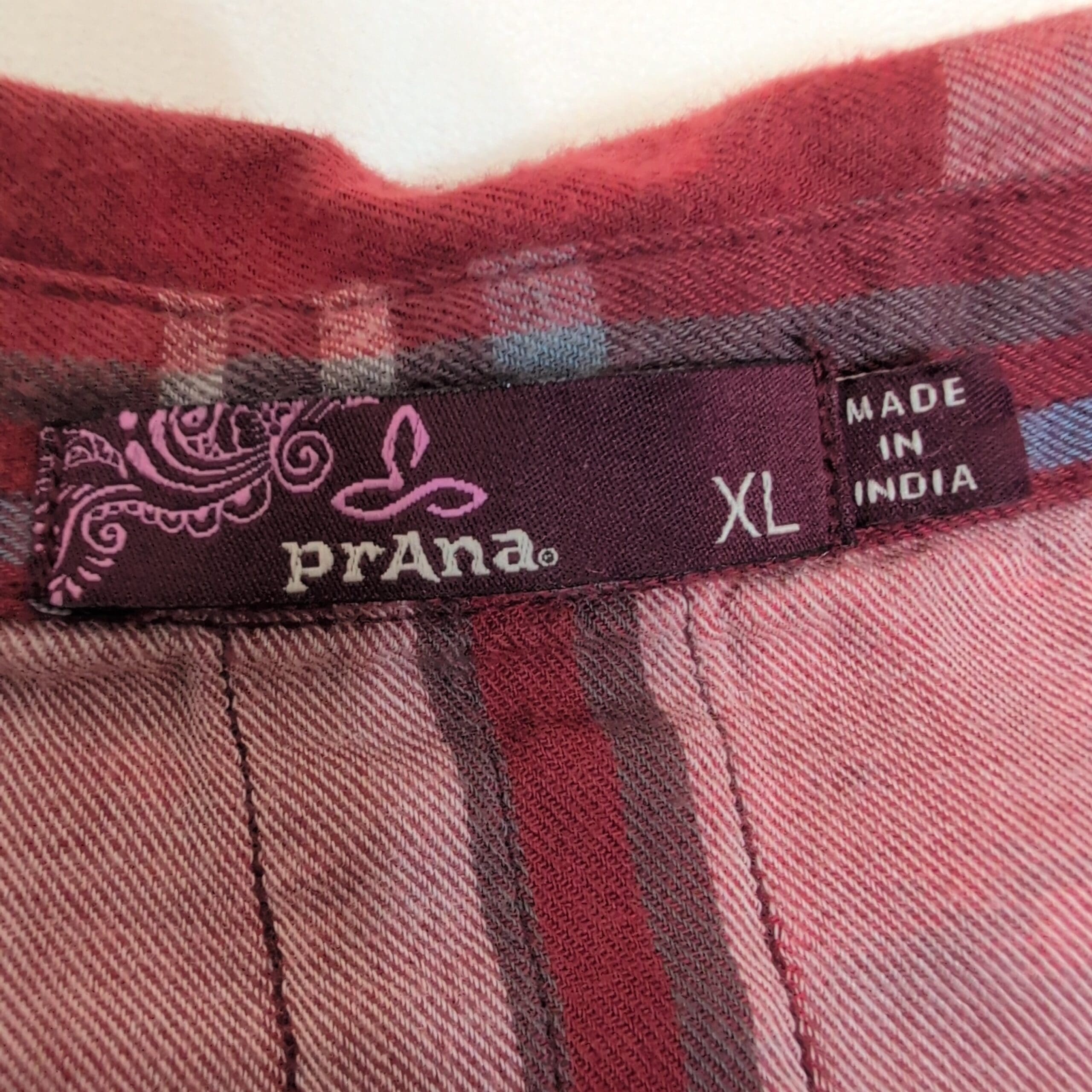 Prana women’s XL plaid button-down in warm orange and cranberry tones. Lightweight woven long sleeve with a single chest pocket, button cuffs, and a curved hem — an easy layering piece for casual, travel, or outdoor-inspired outfits. Size: XL (standard). Department: Women.