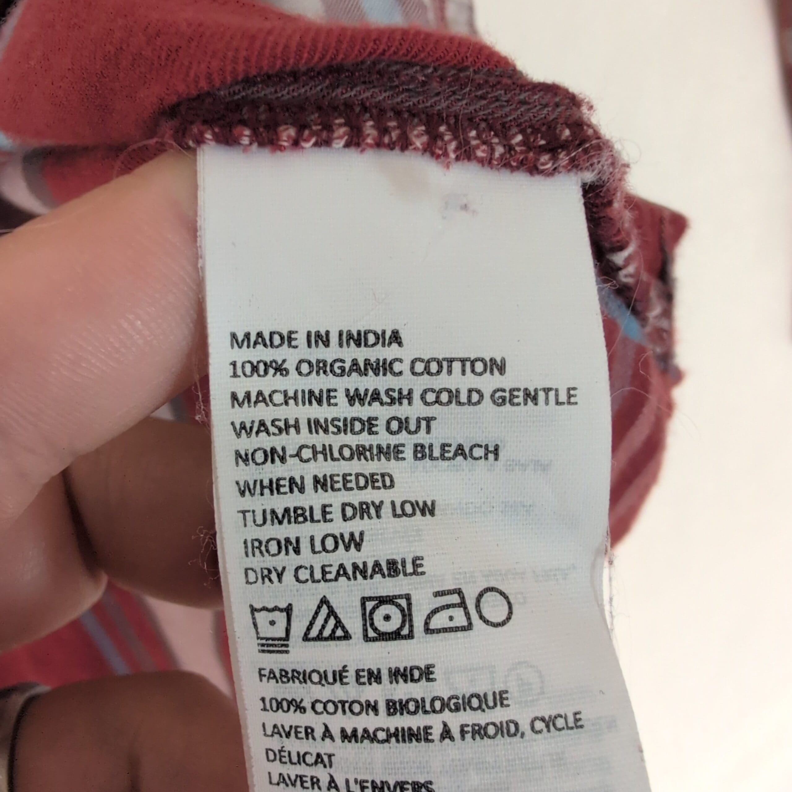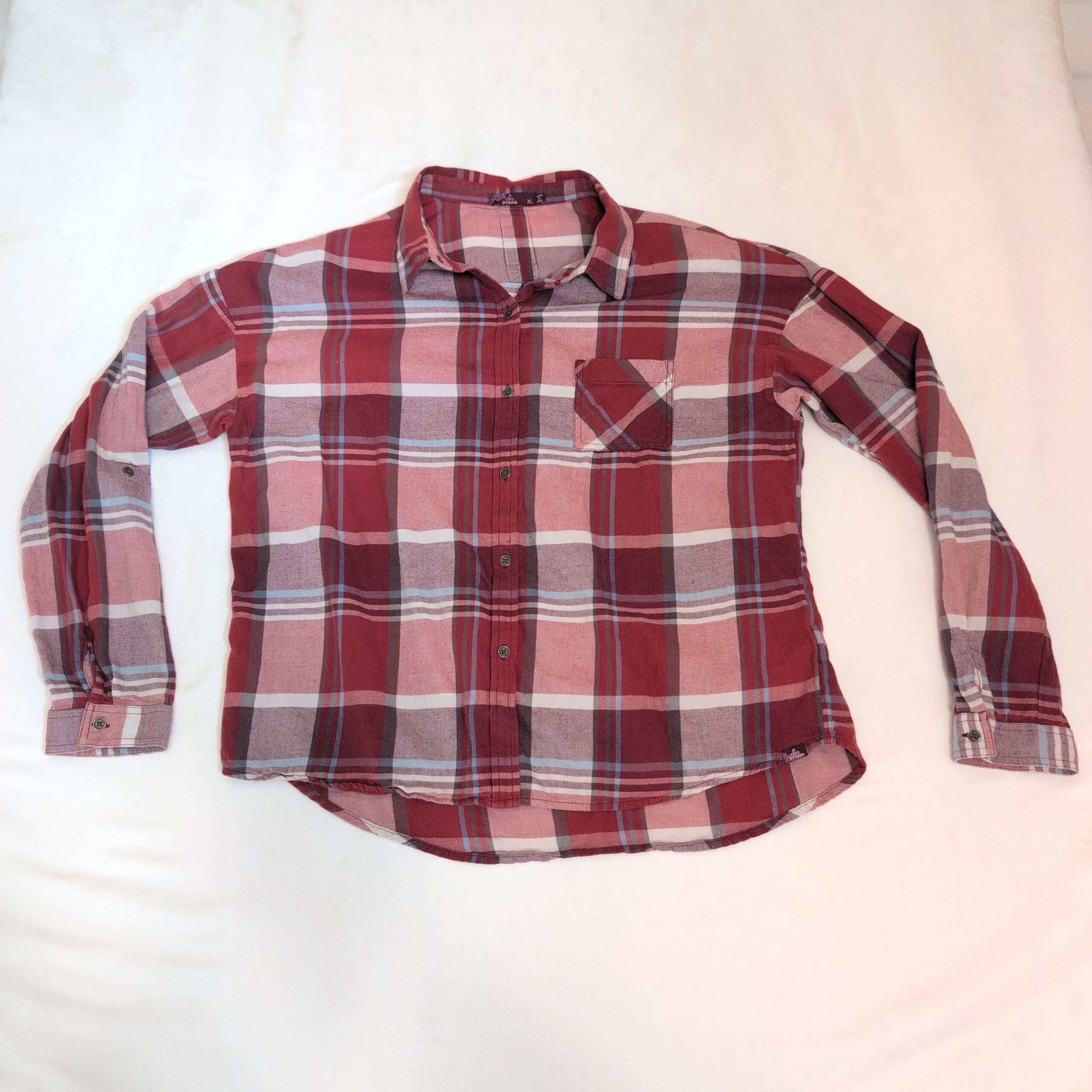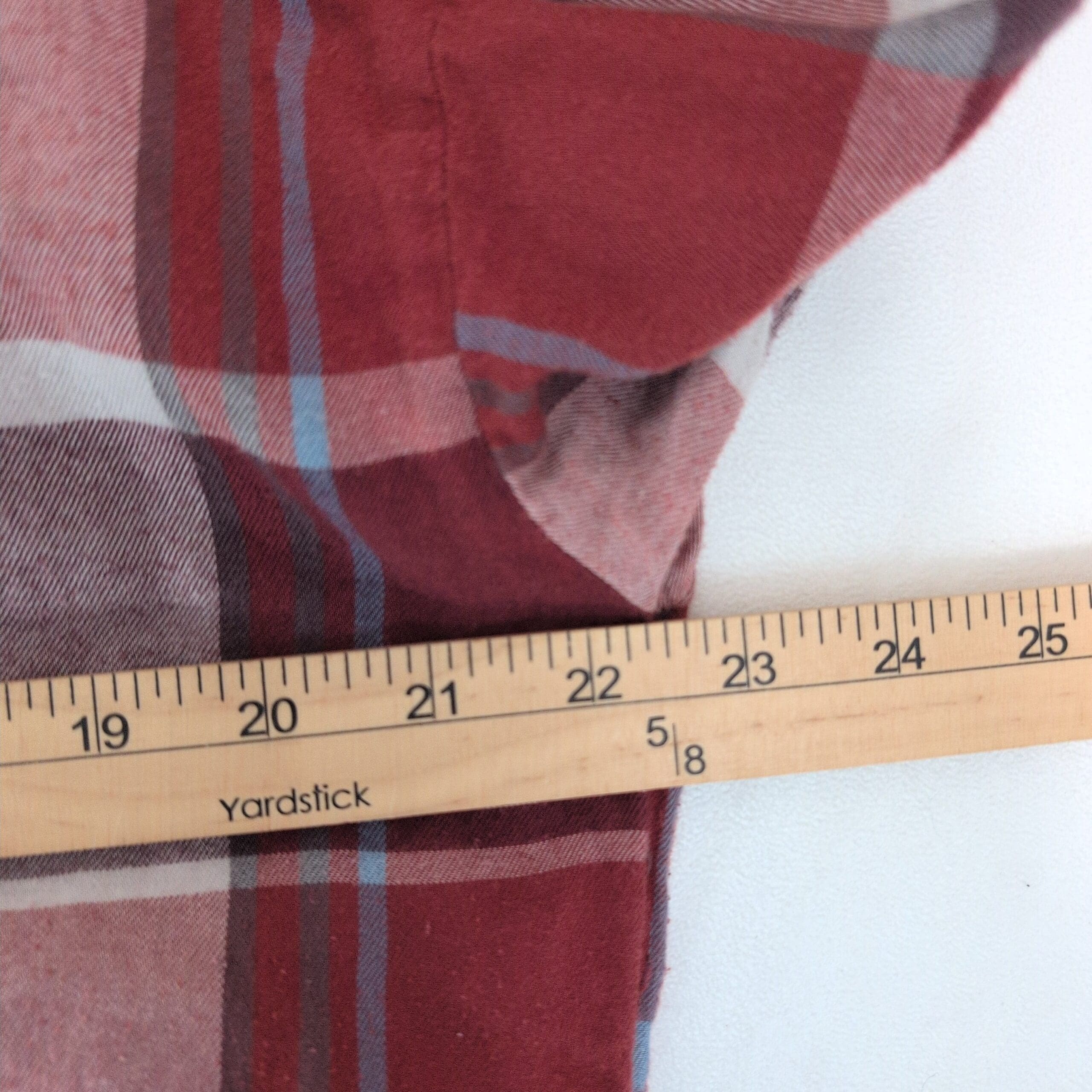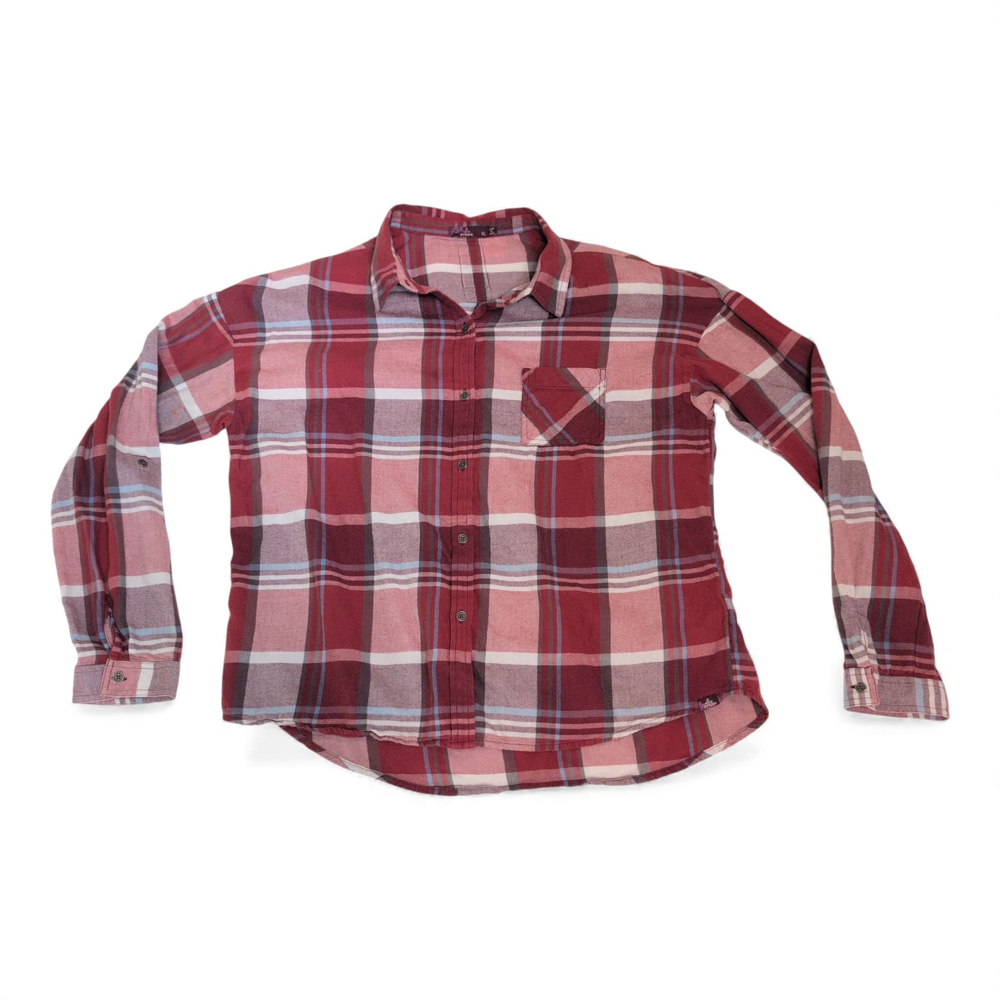 Prana women’s XL plaid button-down in warm orange and cranberry tones. Lightweight woven long sleeve with a single chest pocket, button cuffs, and a curved hem — an easy layering piece for casual, travel, or outdoor-inspired outfits. Size: XL (standard). Department: Women.