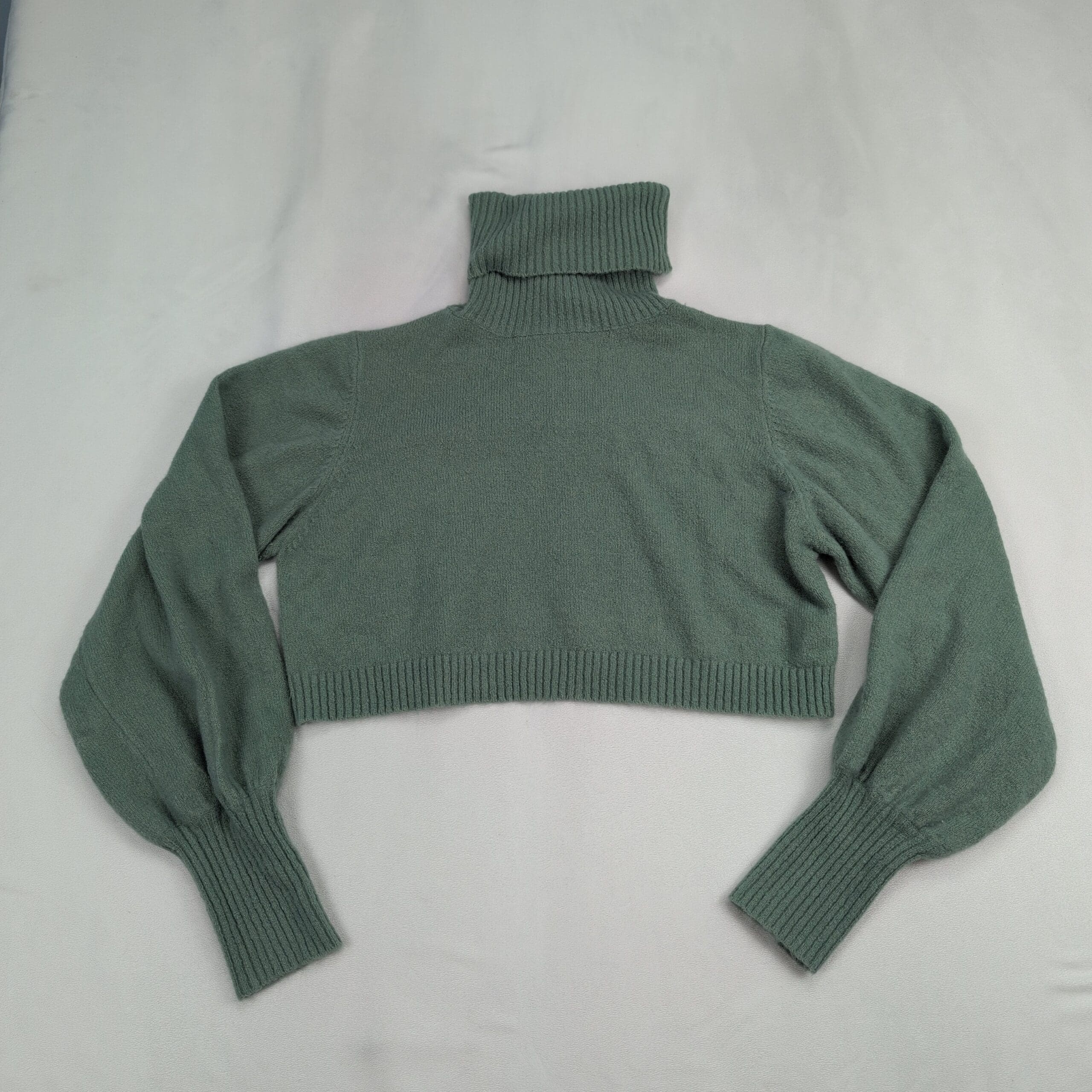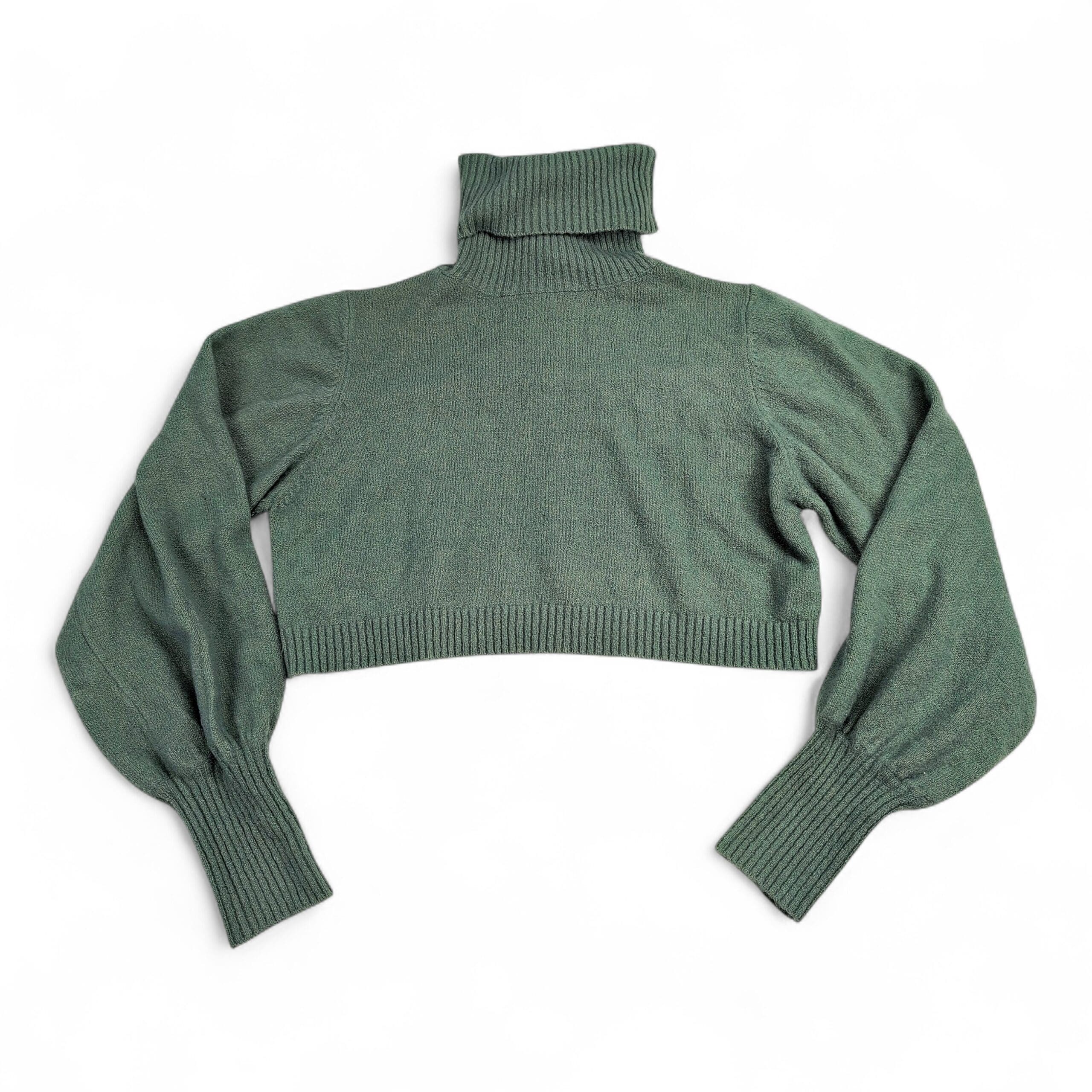 Princess Polly cropped turtleneck sweater in a muted sage green, size 4 (standard). Soft knit with a high ribbed turtleneck, cropped ribbed hem, and voluminous balloon sleeves finished with long ribbed cuffs — a chic layered piece for cooler days.