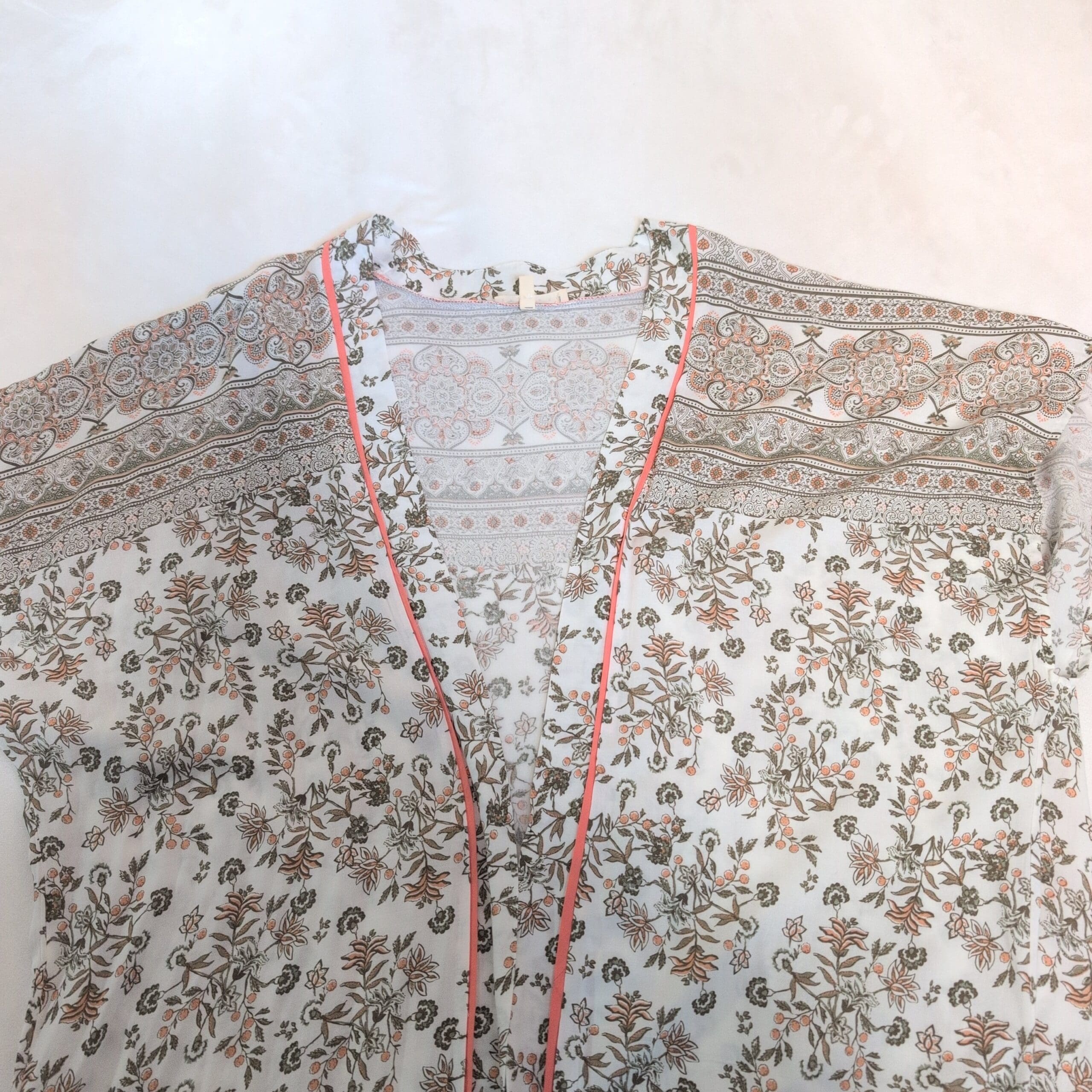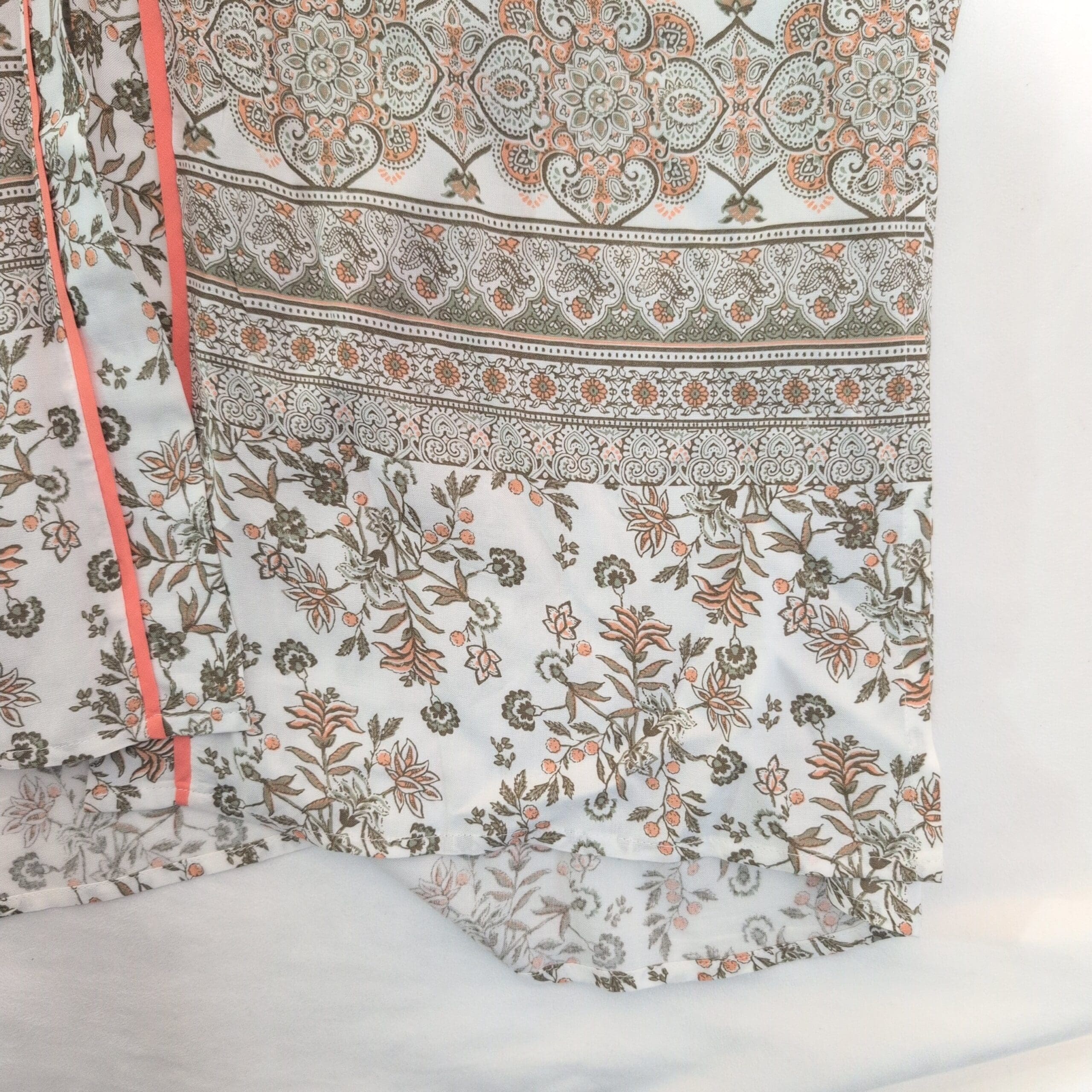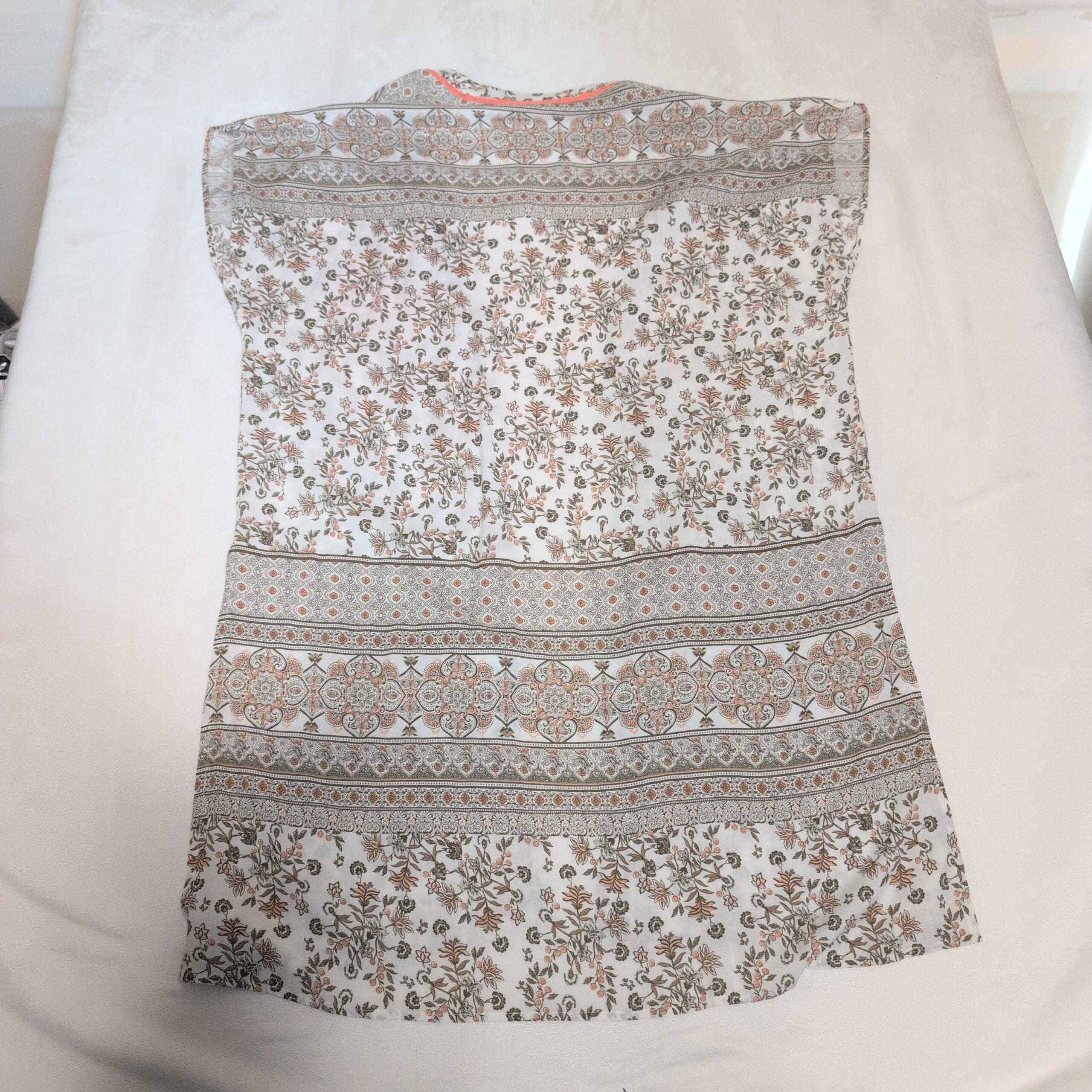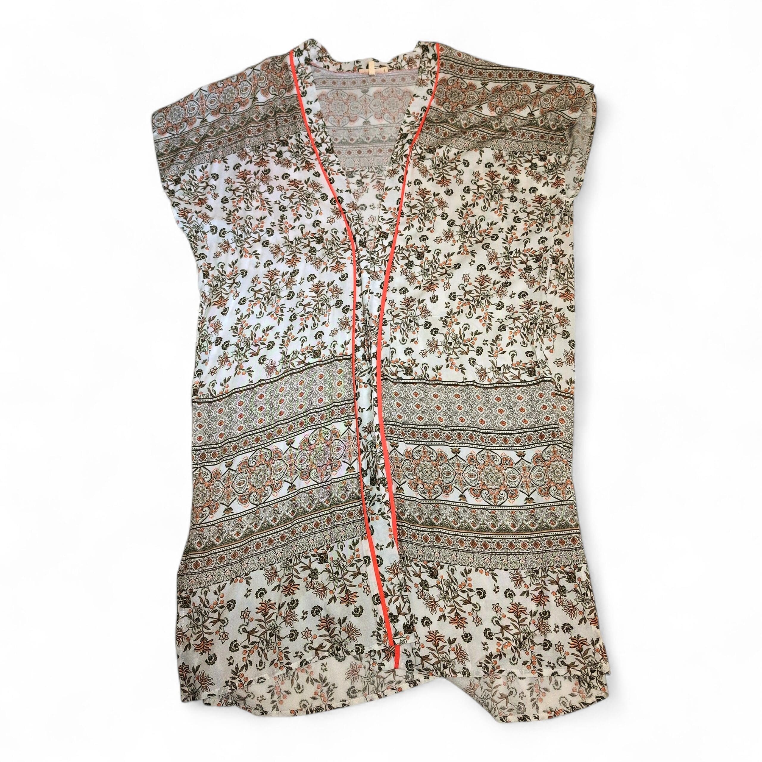 Lightweight white Promesa tunic featuring a delicate floral and banded paisley print. V-neckline with coral contrast piping, short cap sleeves, and a relaxed tunic-length silhouette—perfect for layering over jeans or leggings. Airy, semi-sheer fabric with a soft, flowy drape.