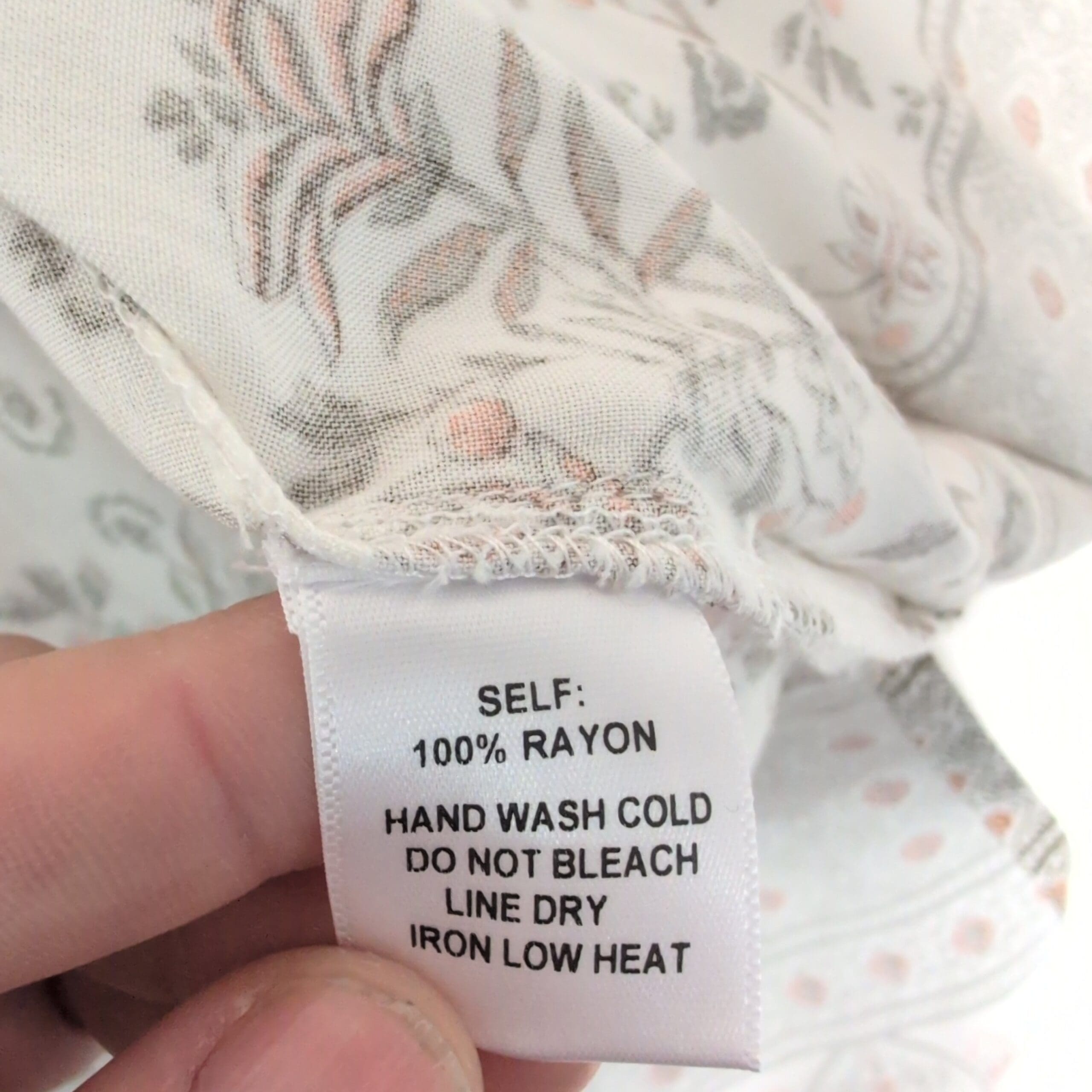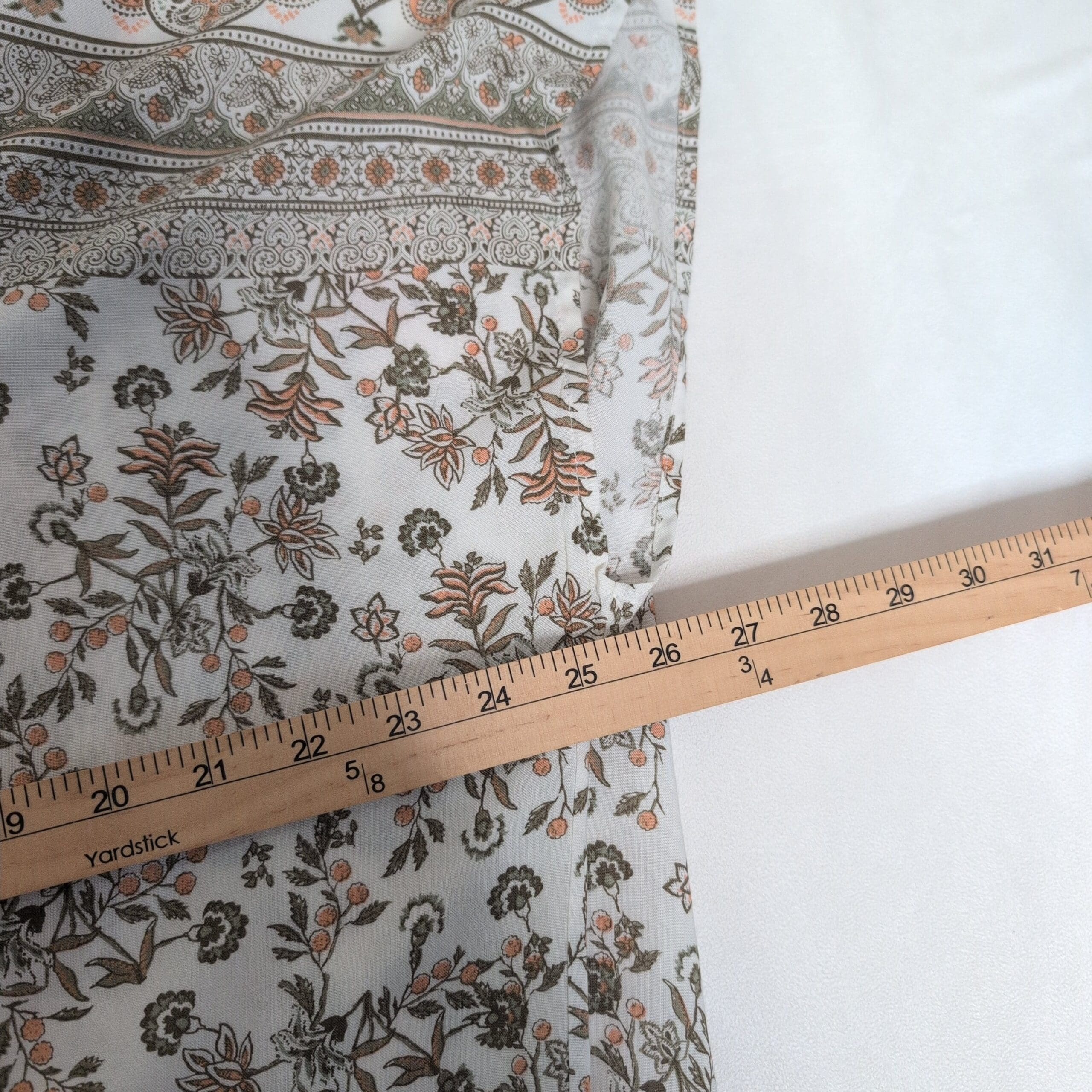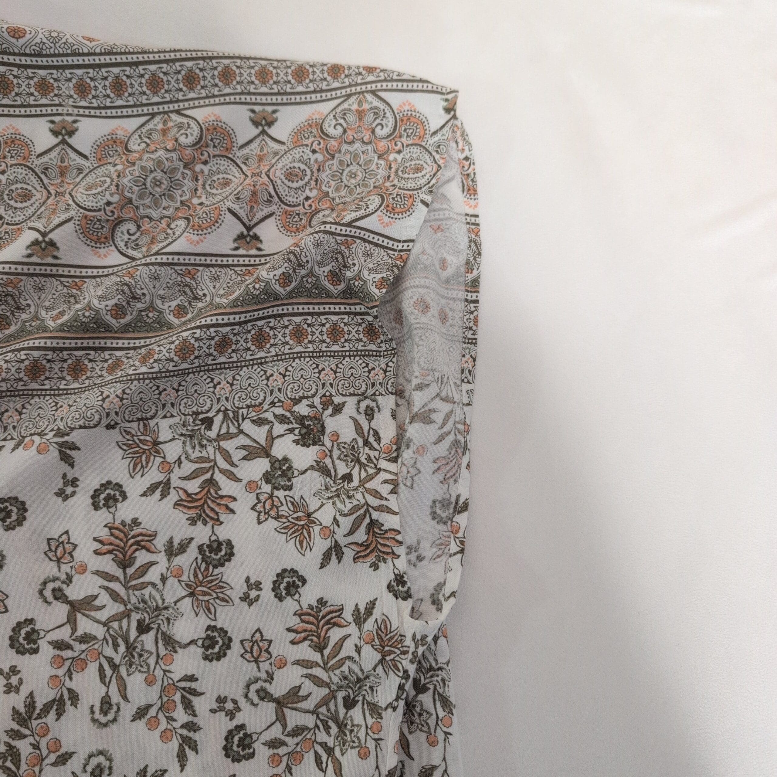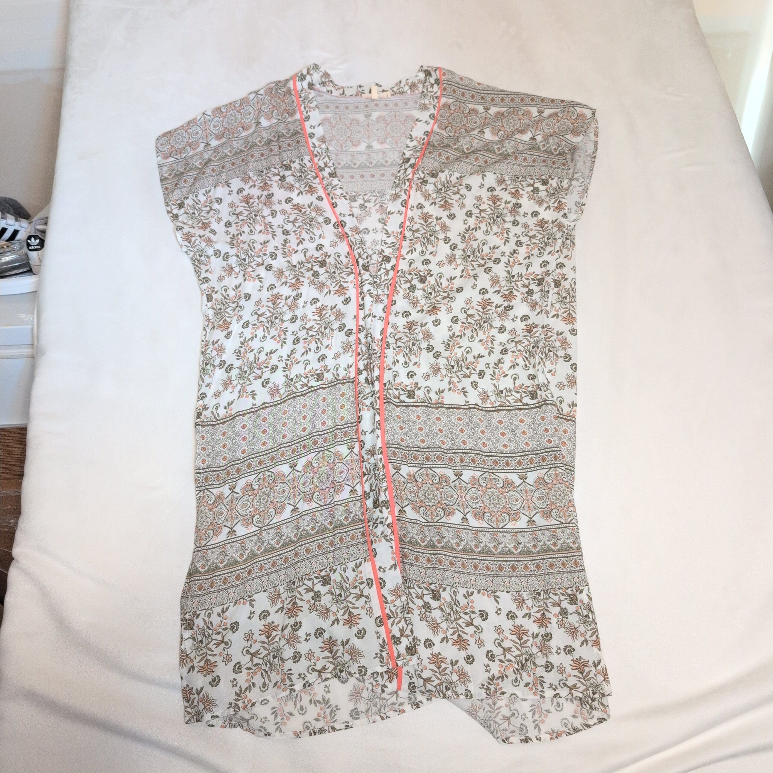 Lightweight white Promesa tunic featuring a delicate floral and banded paisley print. V-neckline with coral contrast piping, short cap sleeves, and a relaxed tunic-length silhouette—perfect for layering over jeans or leggings. Airy, semi-sheer fabric with a soft, flowy drape.
