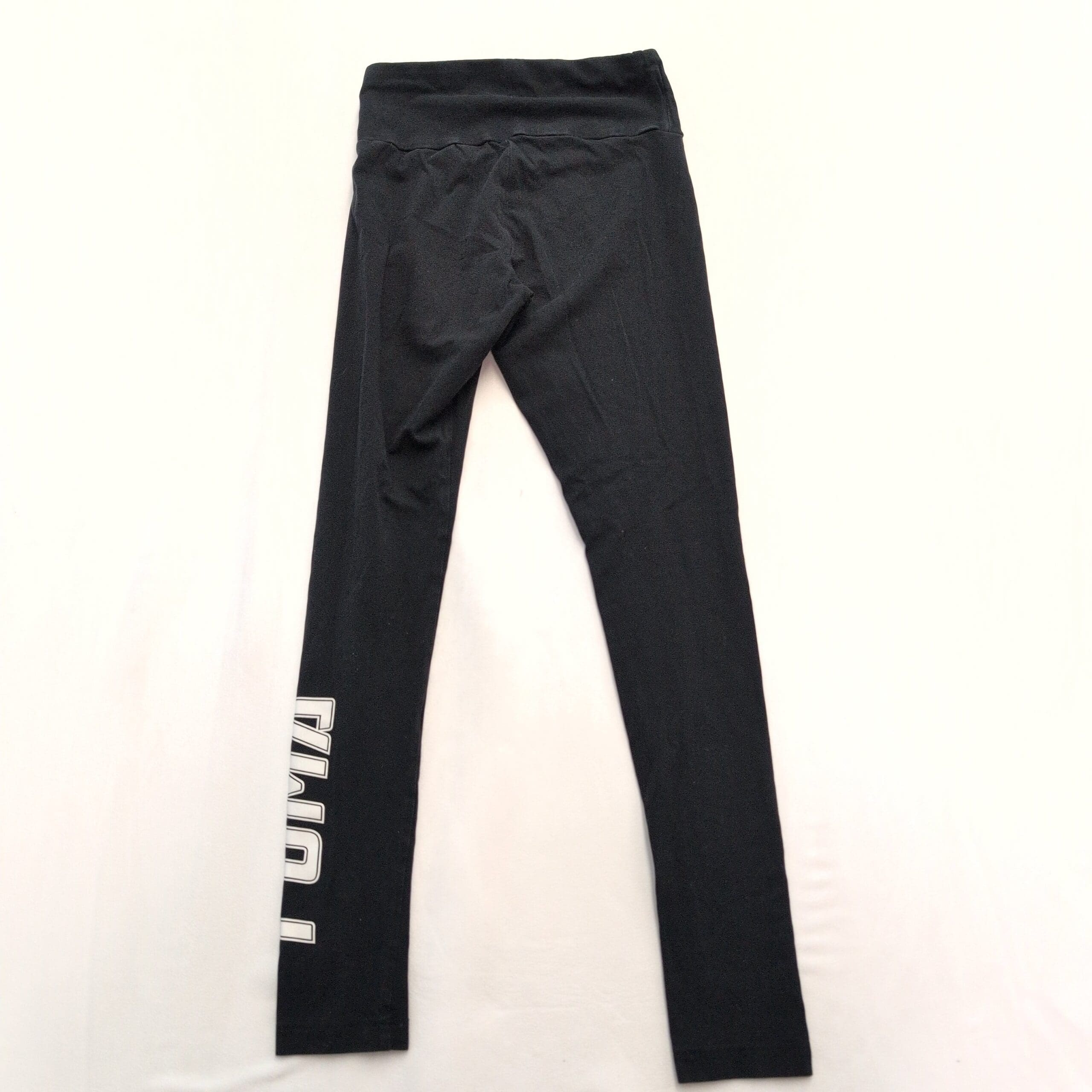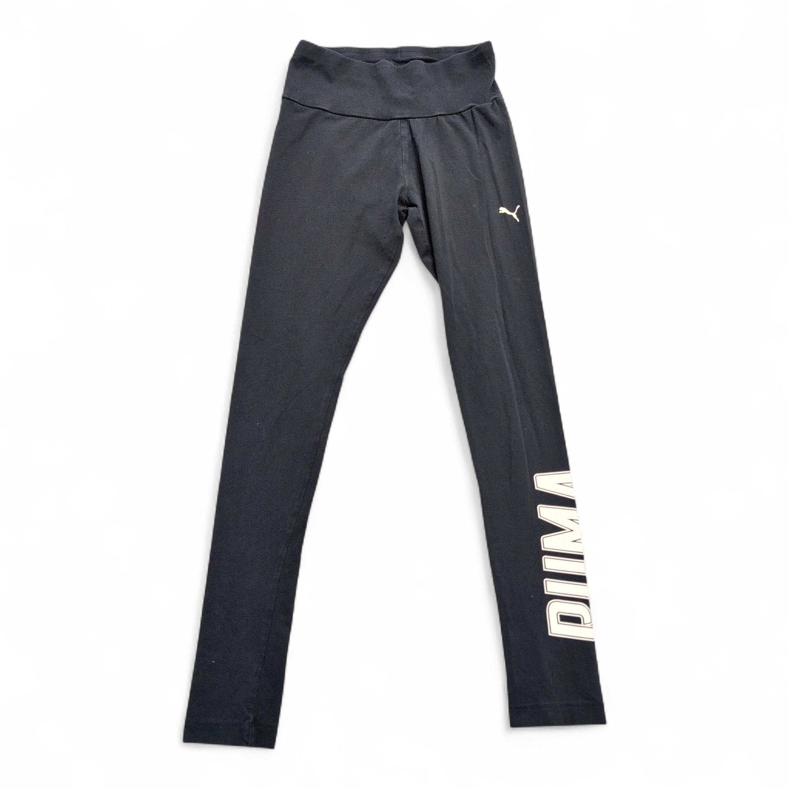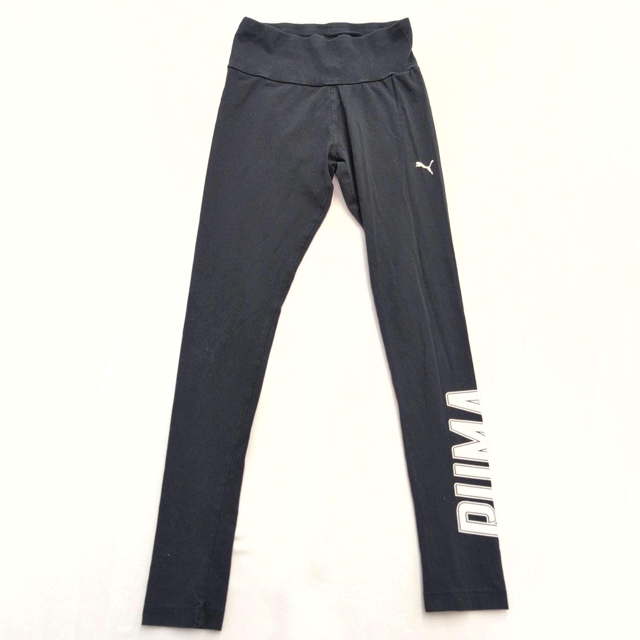 Puma women’s black high-waist leggings in size XS. Full-length athletic leggings featuring a wide, supportive waistband, small Puma cat logo at the hip, and bold vertical PUMA lettering down the lower leg — great for workouts or everyday athleisure. Stretchy performance fabric offers a snug, comfortable fit.