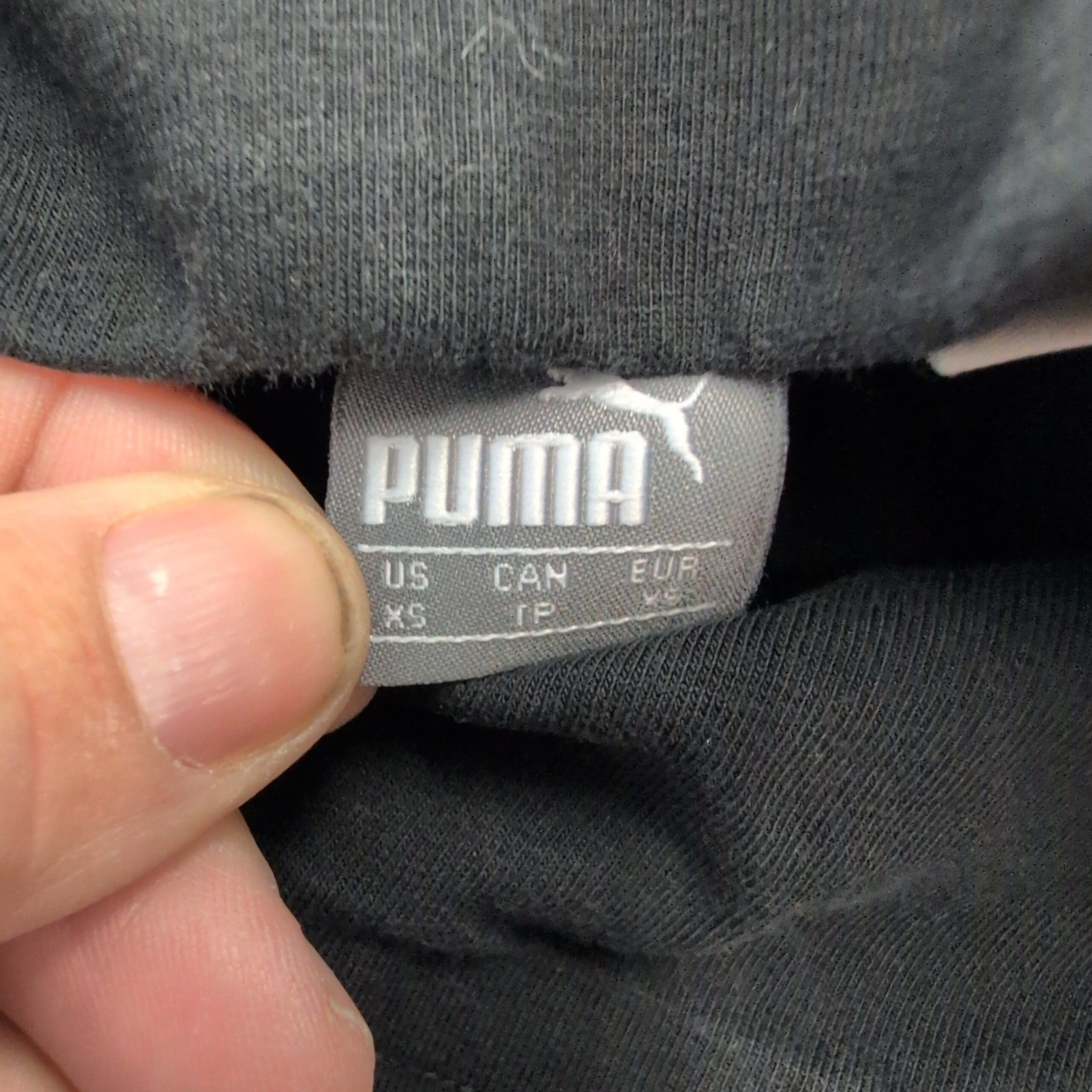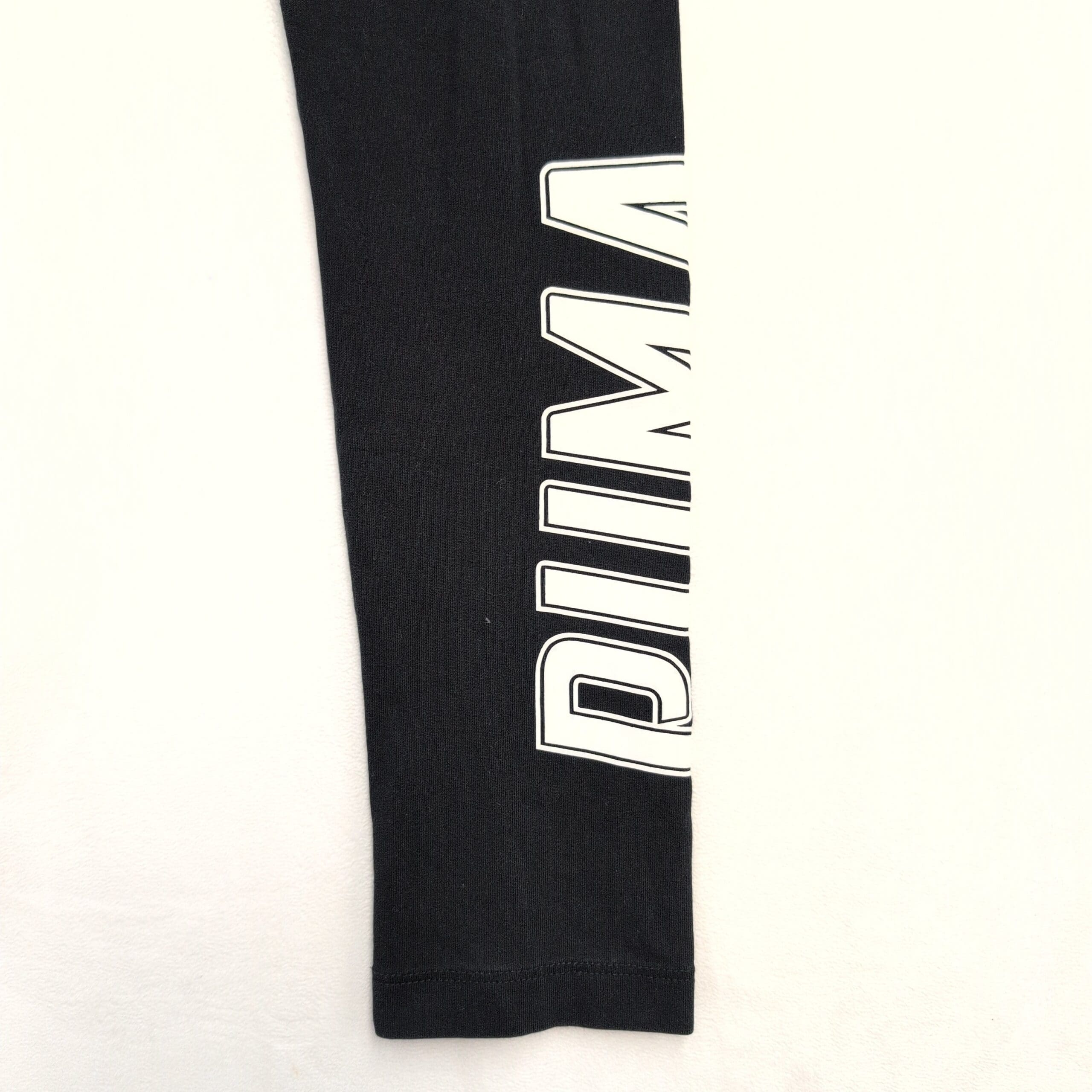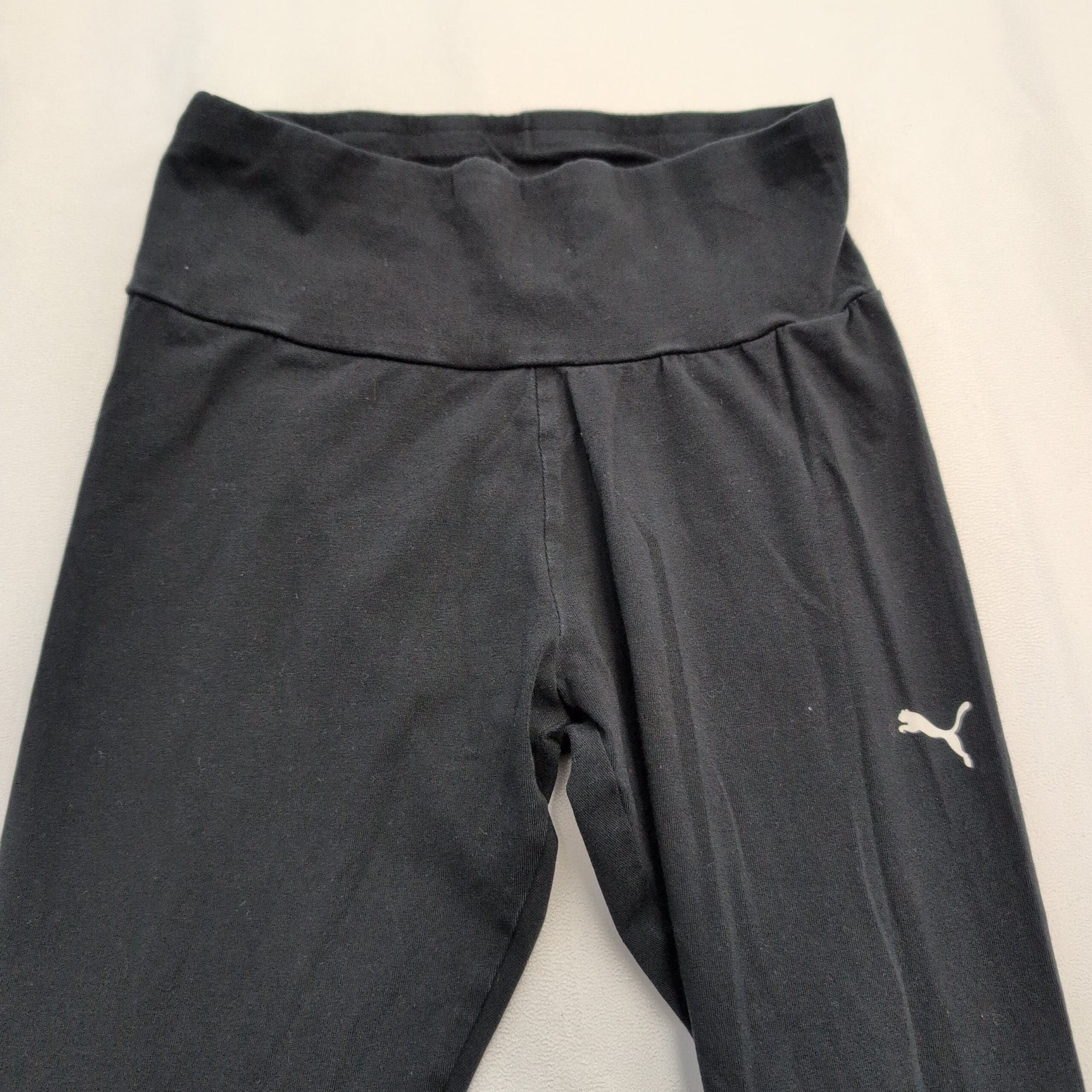 Puma women’s black high-waist leggings in size XS. Full-length athletic leggings featuring a wide, supportive waistband, small Puma cat logo at the hip, and bold vertical PUMA lettering down the lower leg — great for workouts or everyday athleisure. Stretchy performance fabric offers a snug, comfortable fit.