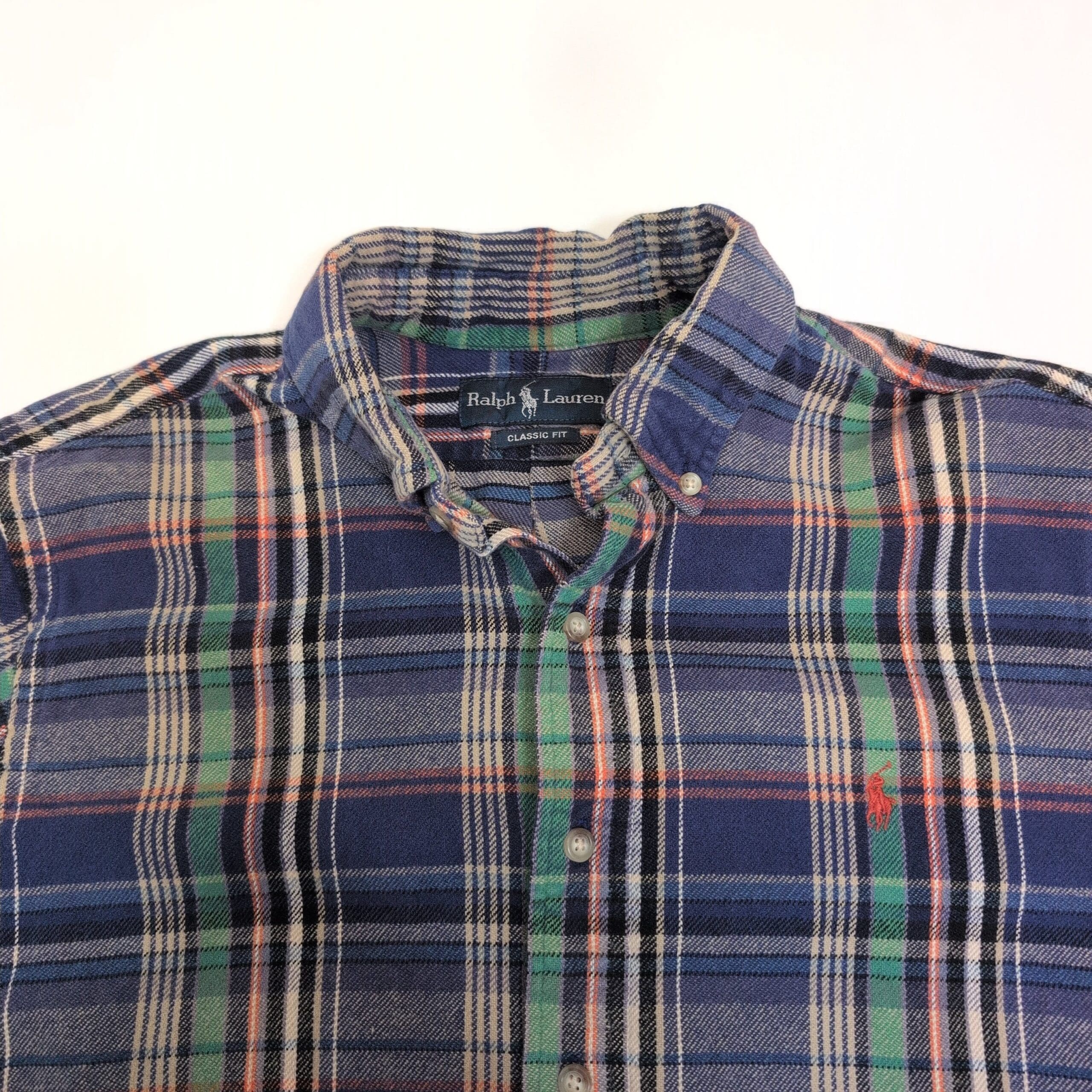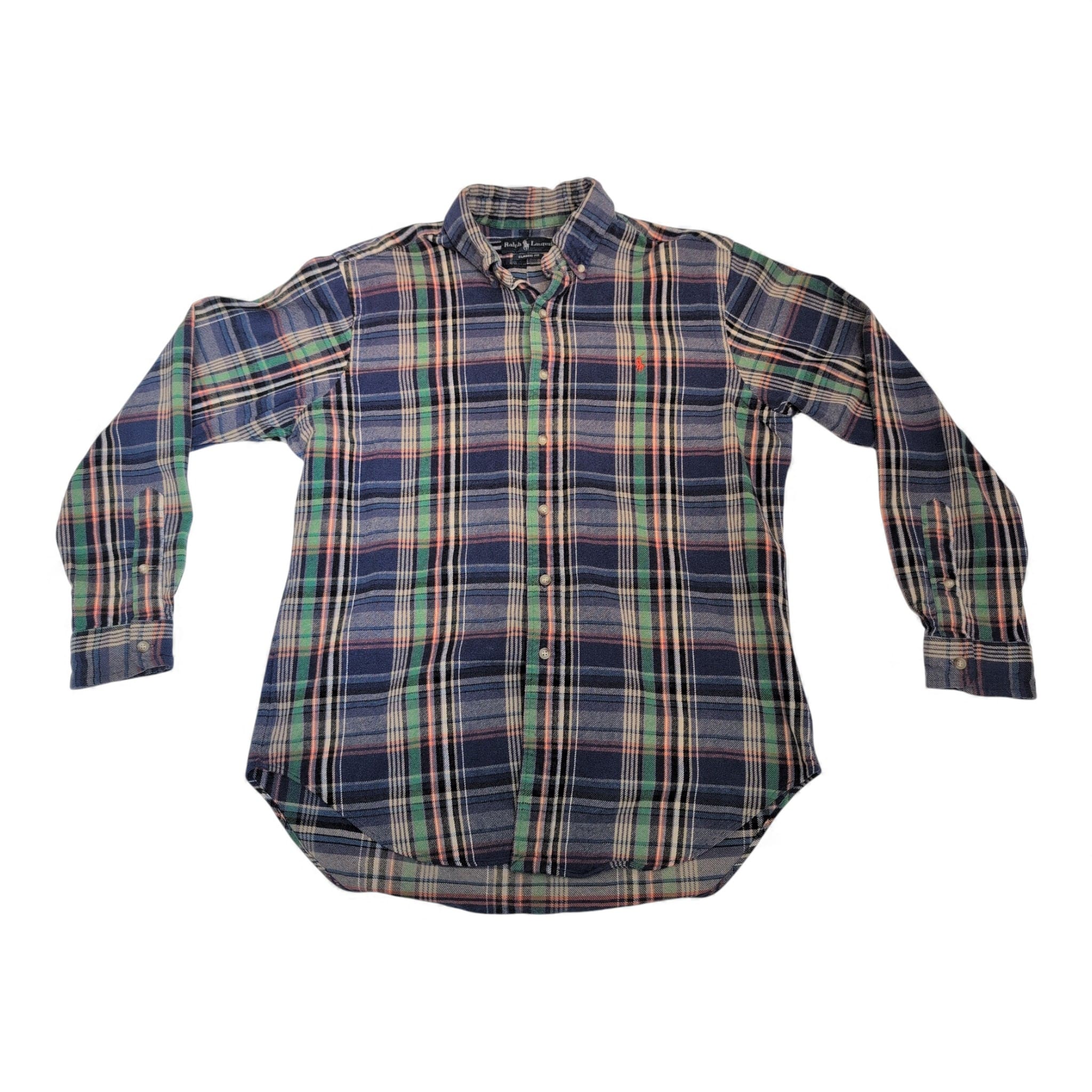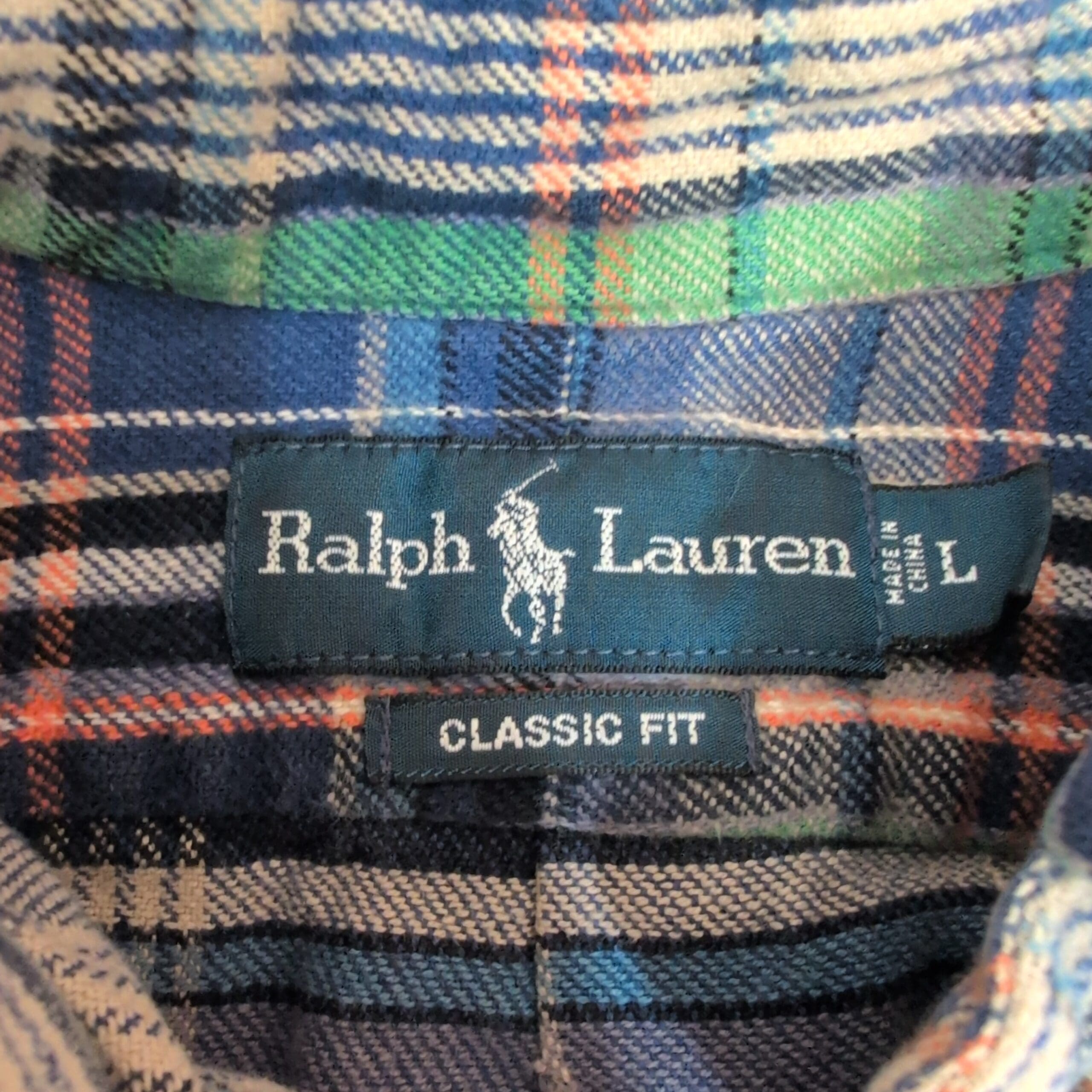 Ralph Lauren men’s long-sleeve button-down shirt in size L. Classic blue plaid pattern with green and red accent stripes and signature embroidered pony on the chest. Button-down collar and full button front for a timeless casual look, great for layering or wearing on its own. Size: L (standard).