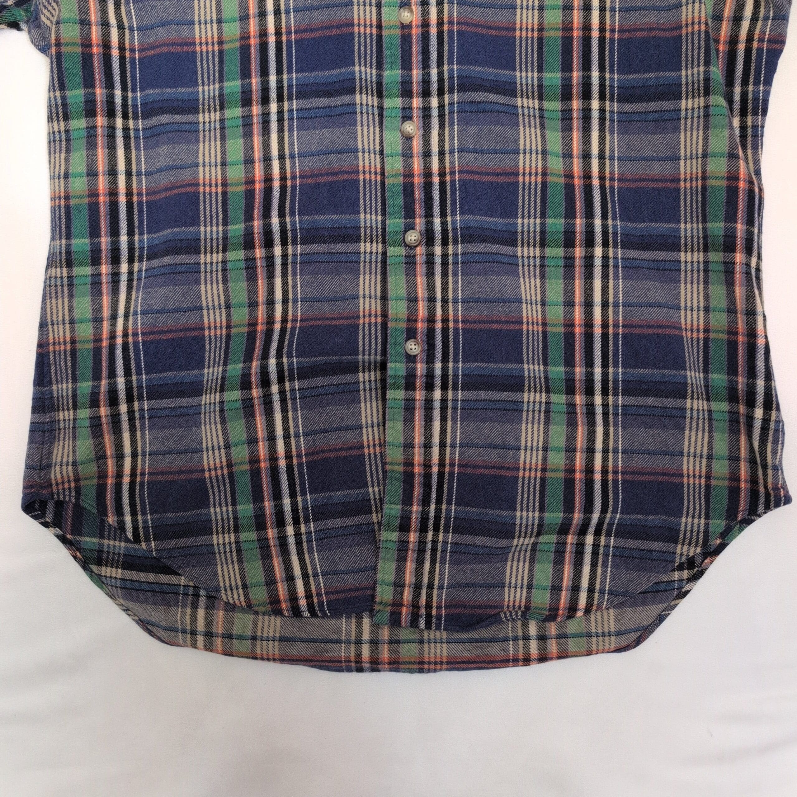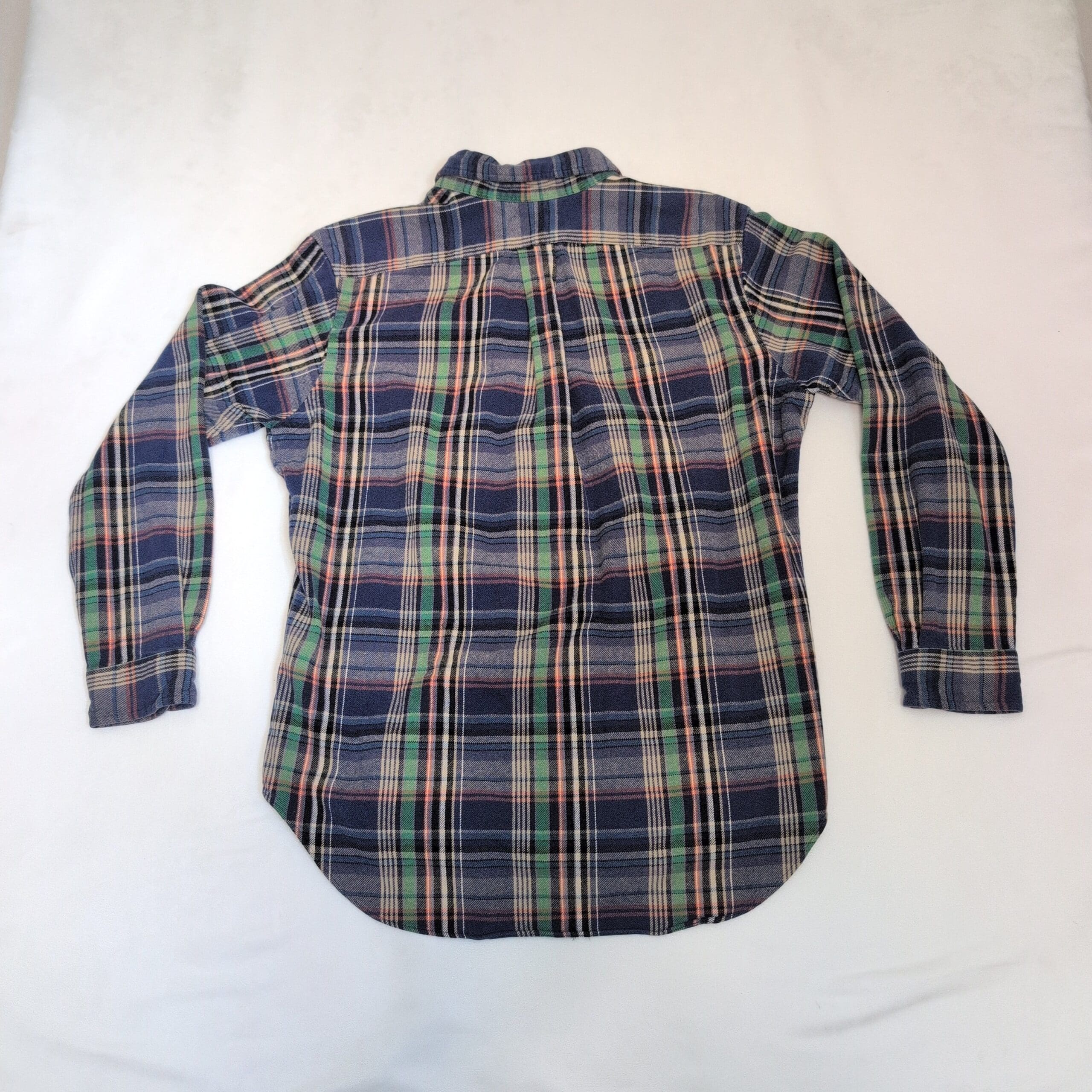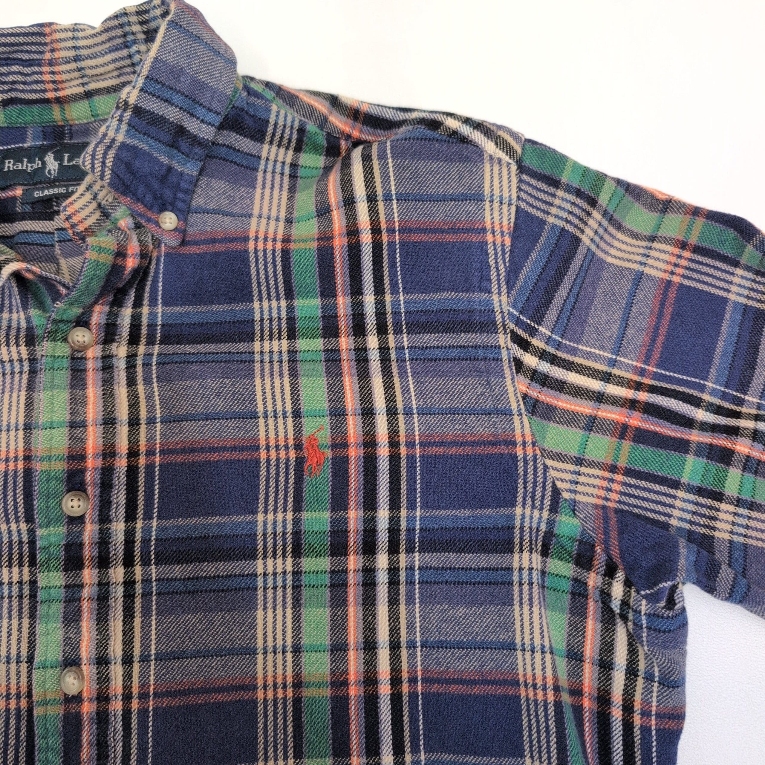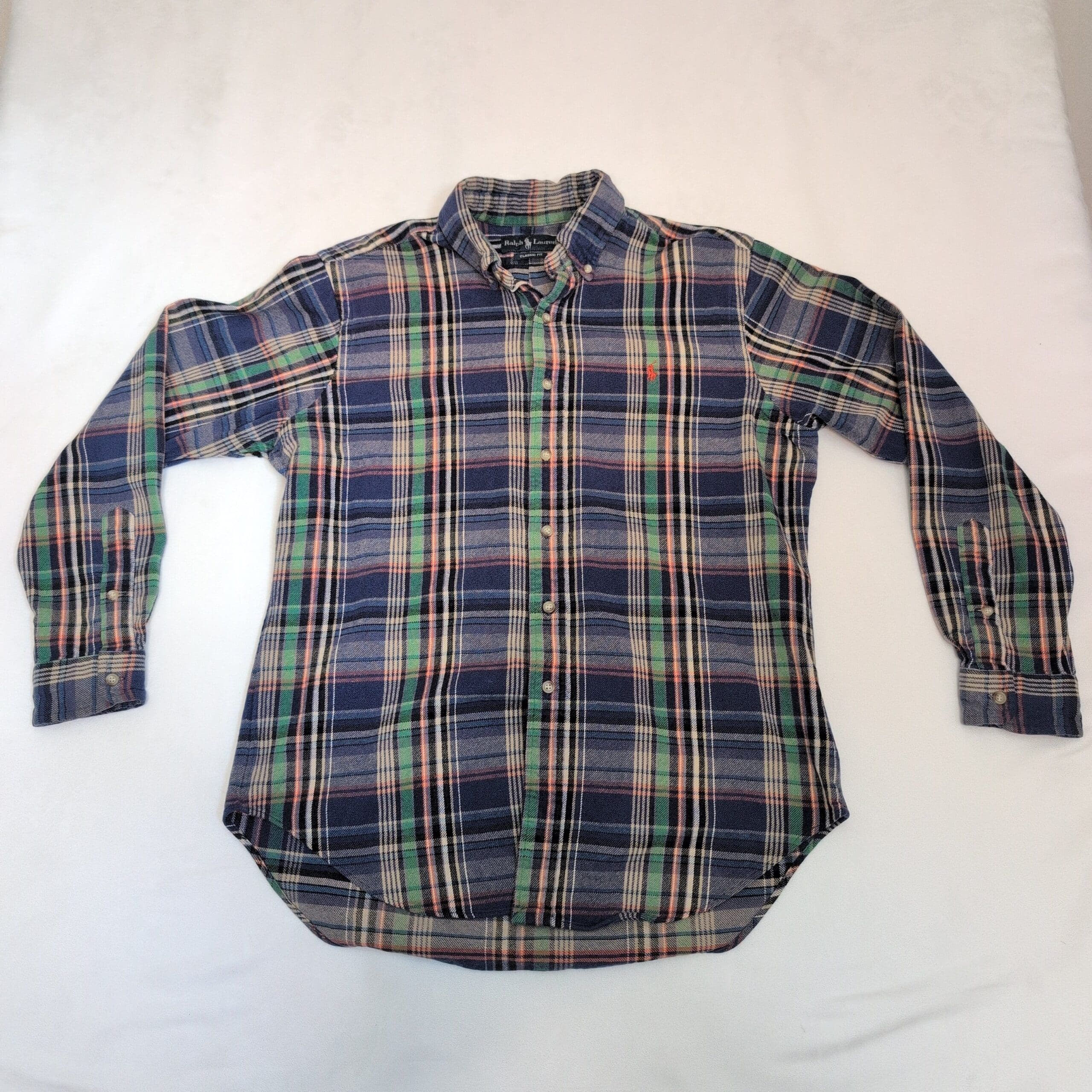 Ralph Lauren men’s long-sleeve button-down shirt in size L. Classic blue plaid pattern with green and red accent stripes and signature embroidered pony on the chest. Button-down collar and full button front for a timeless casual look, great for layering or wearing on its own. Size: L (standard).