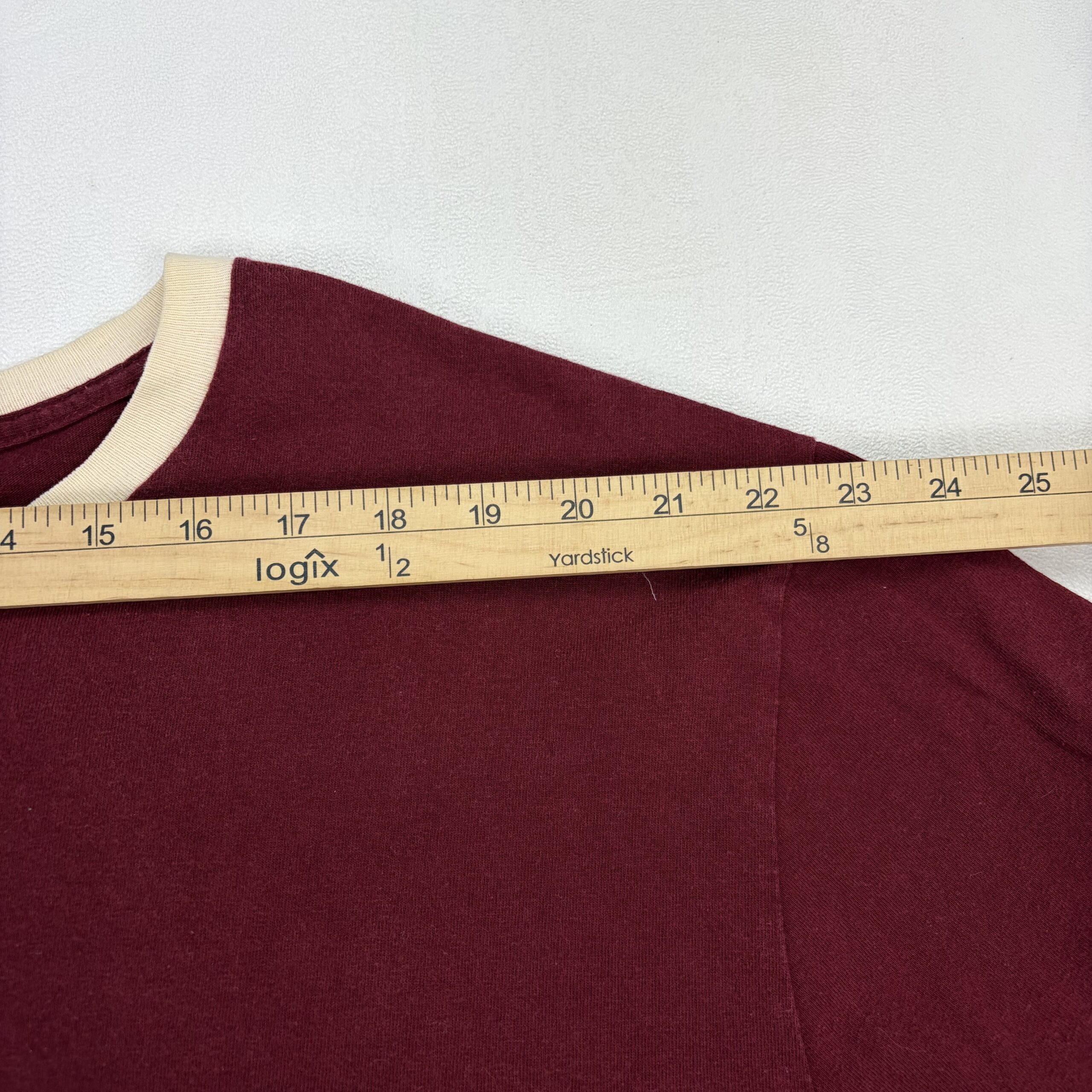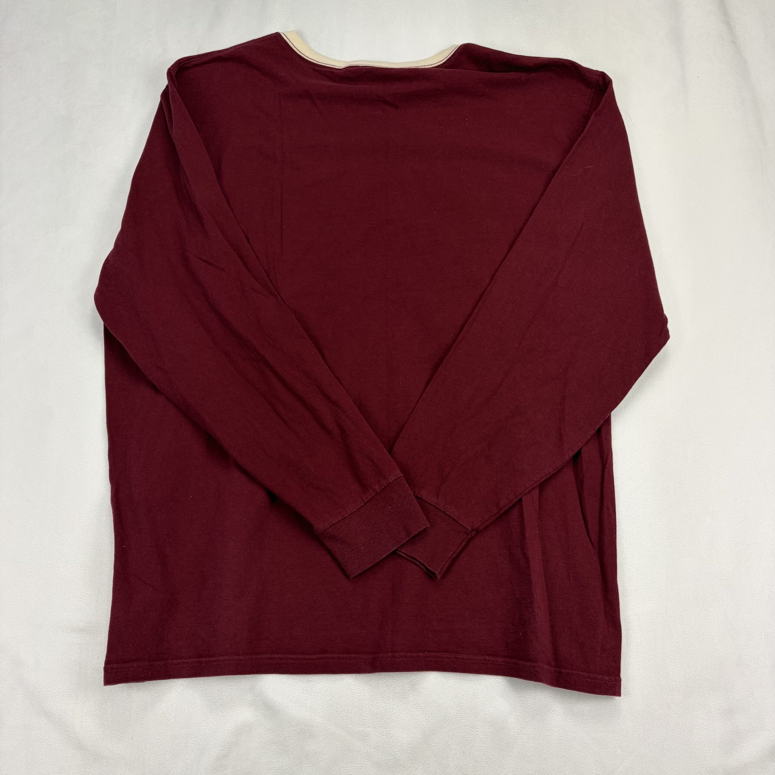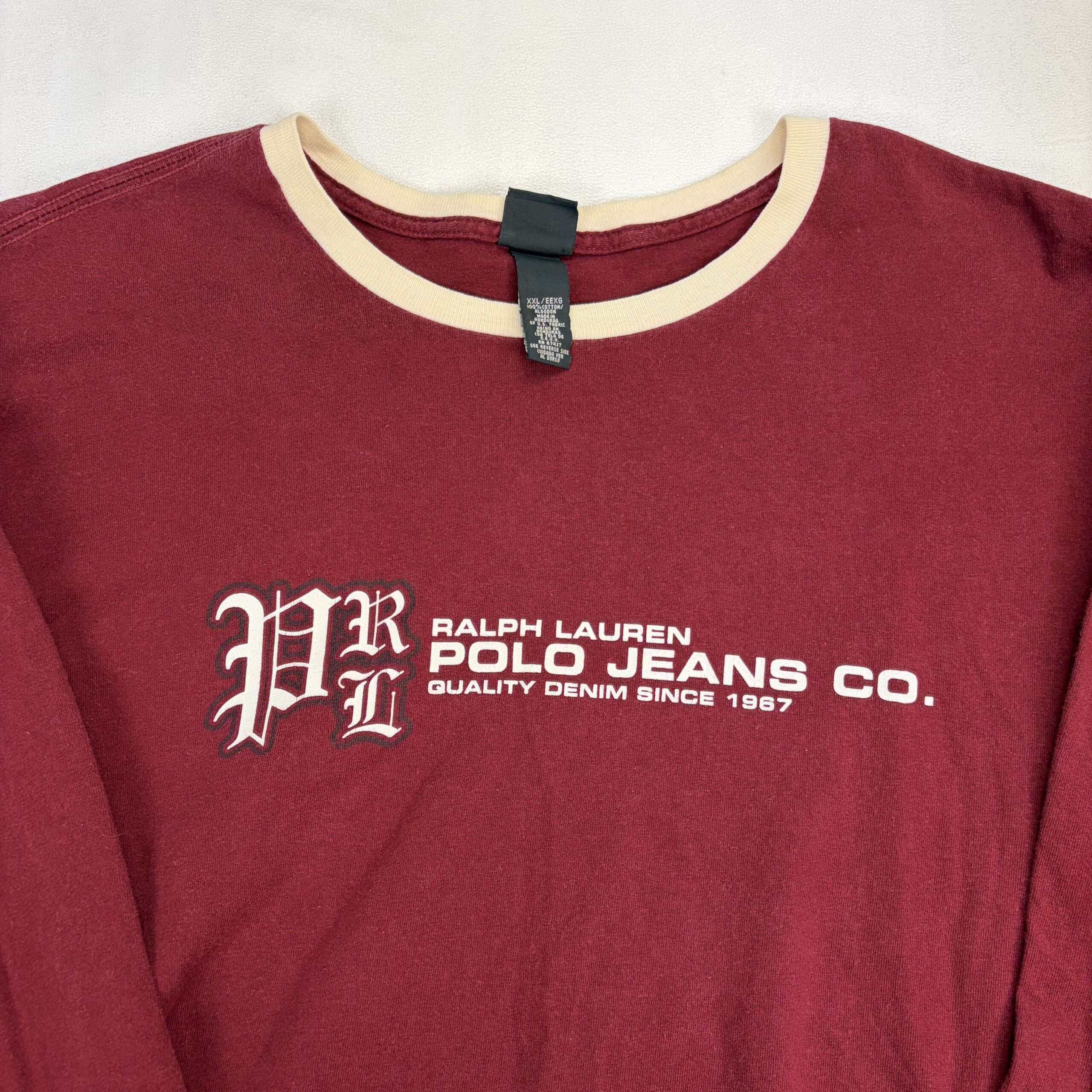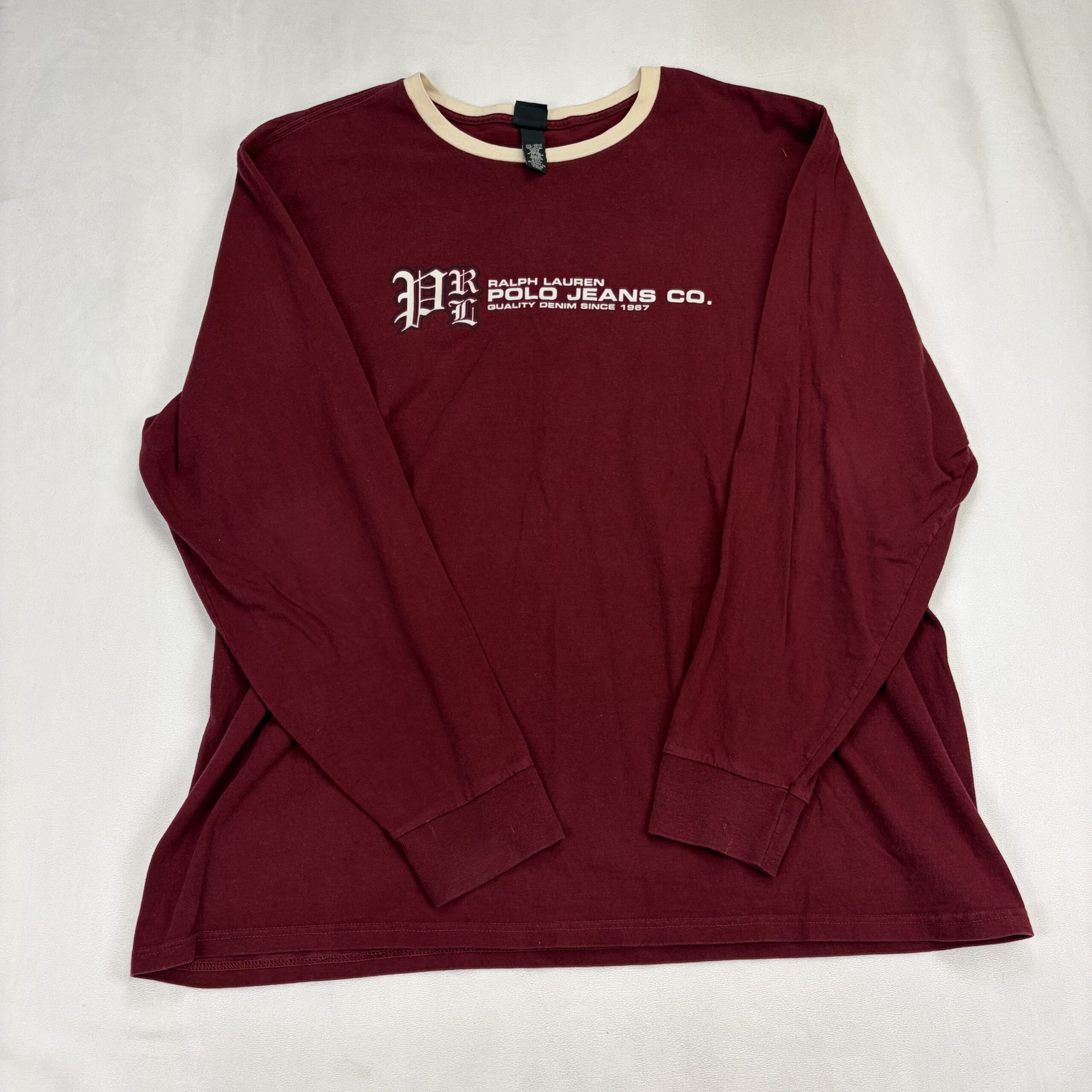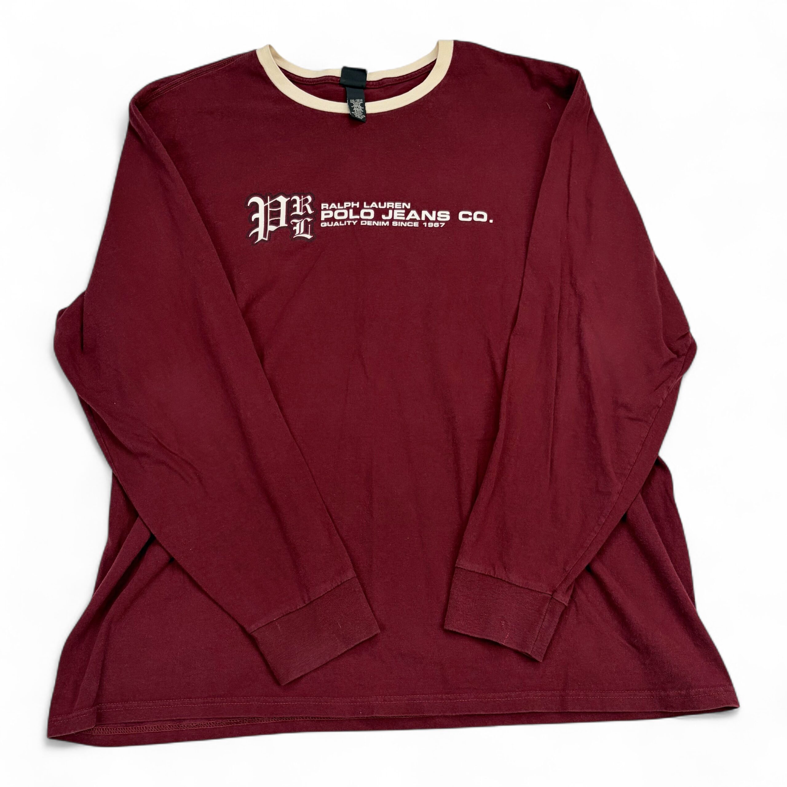 Ralph Lauren Polo Jeans Co. women’s long sleeve tee in XXL (Plus). Burgundy/maroon body with cream contrast ringer at the collar and white chest logo print. Classic crewneck silhouette with ribbed cuffs — casual, comfortable top for everyday wear.