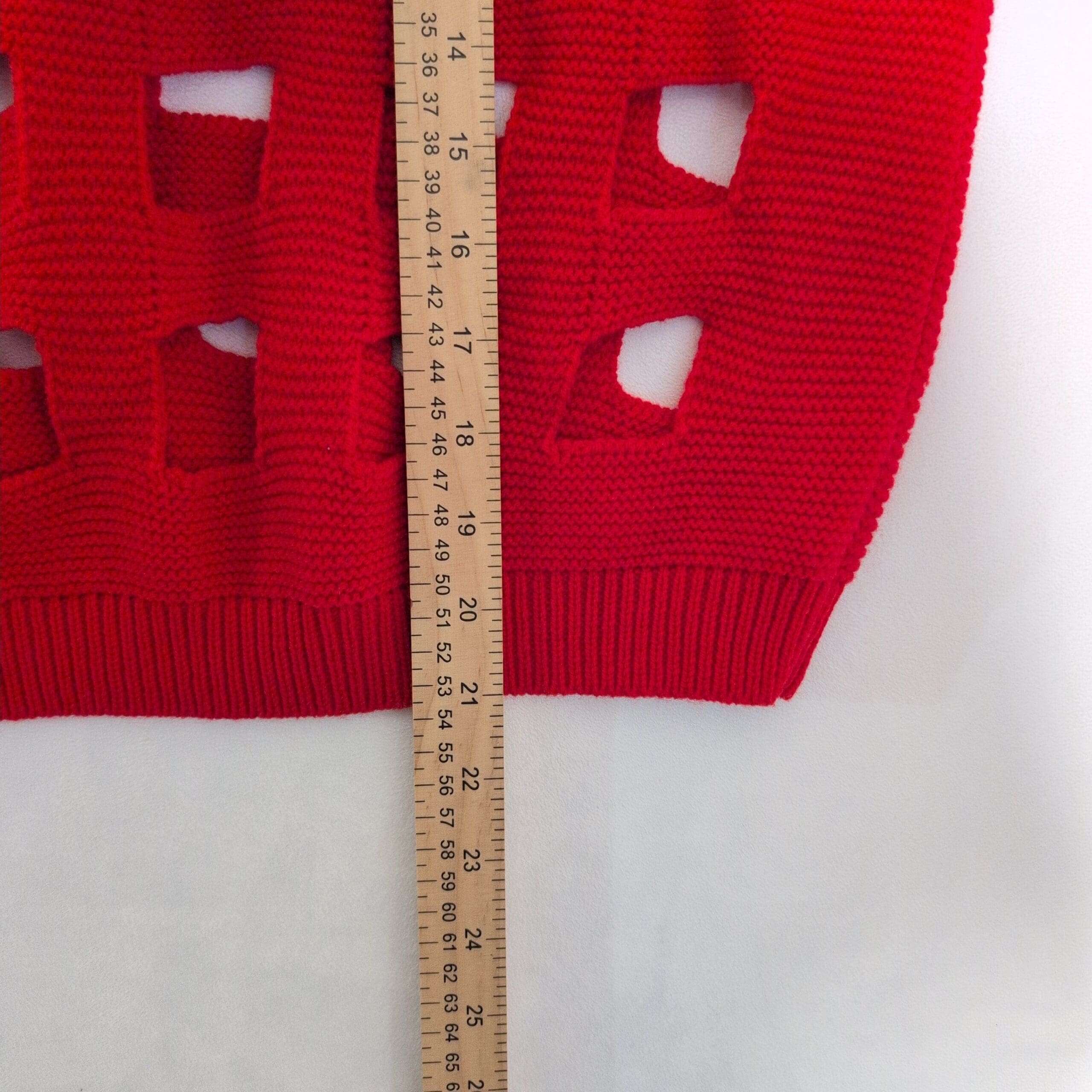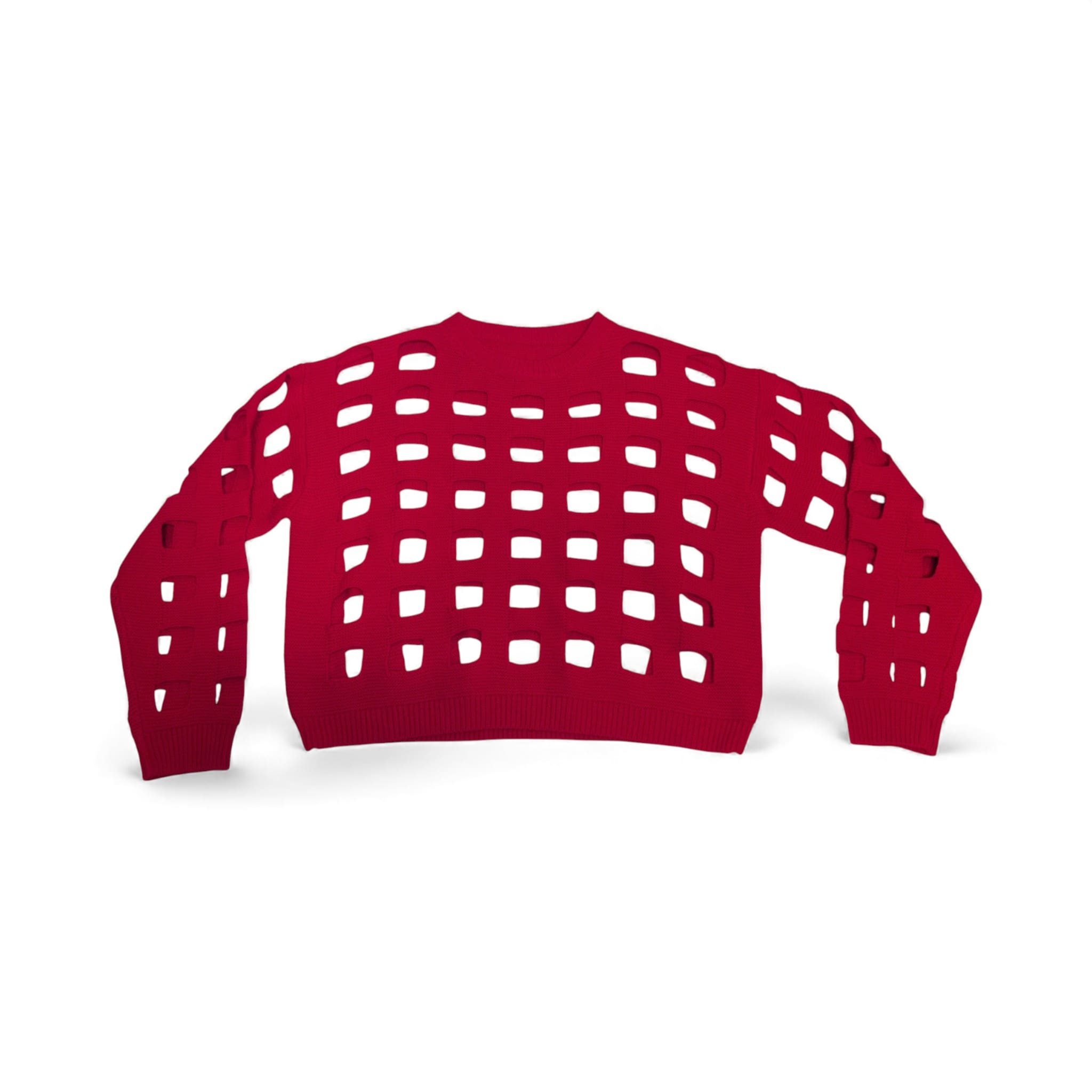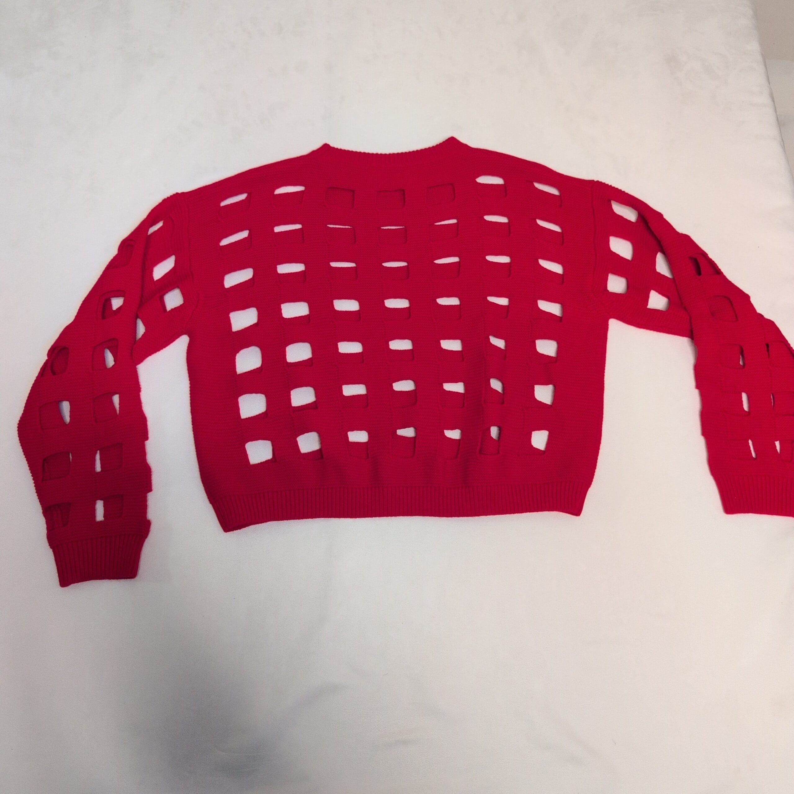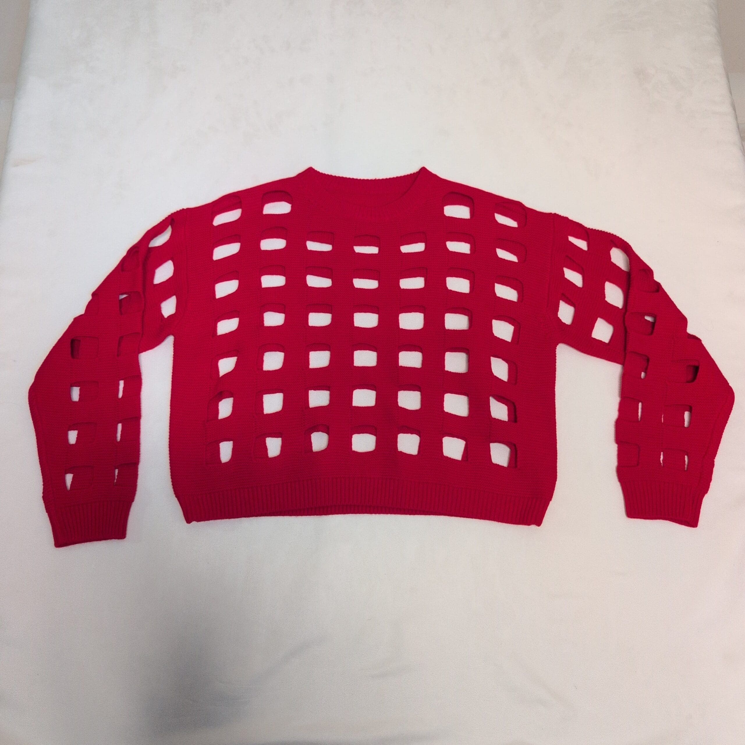 Bright red women’s crewneck sweater with a bold grid of square cutouts for a modern, statement look. Features ribbed crew neckline, long sleeves, ribbed cuffs and hem, and a relaxed fit that appears close to a medium — please see photos for exact measurements. Unknown brand; tags have been removed. Review all images for condition and fit details.