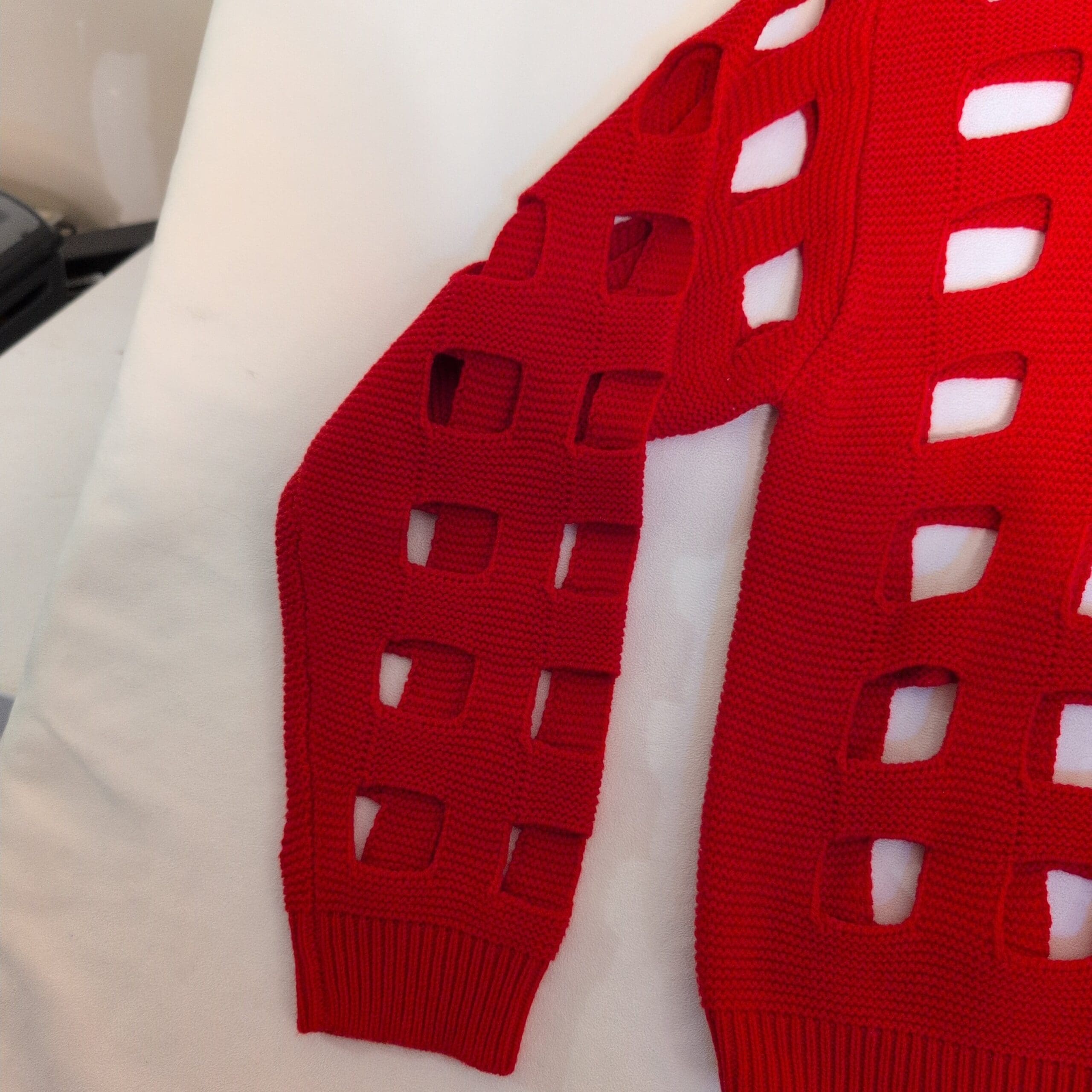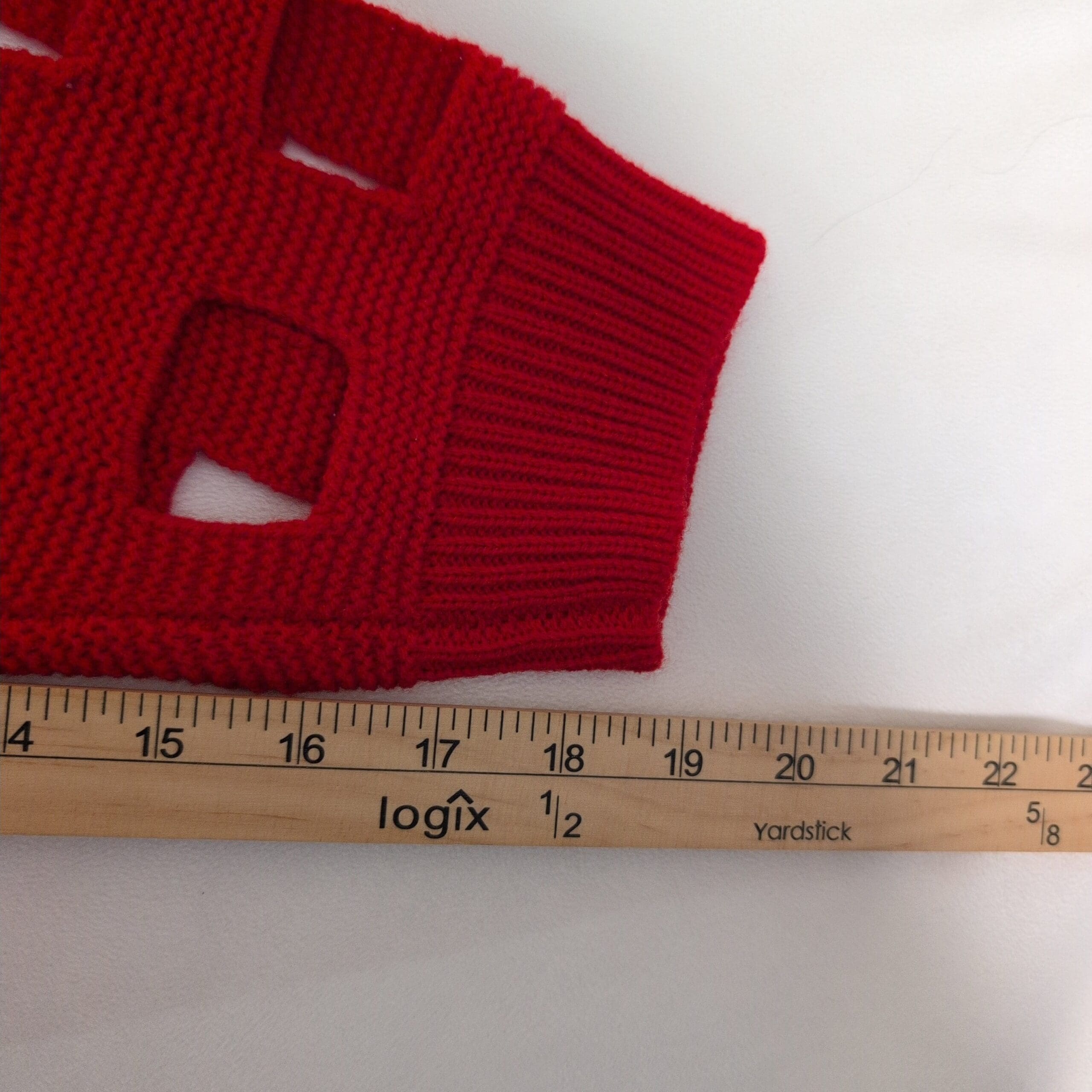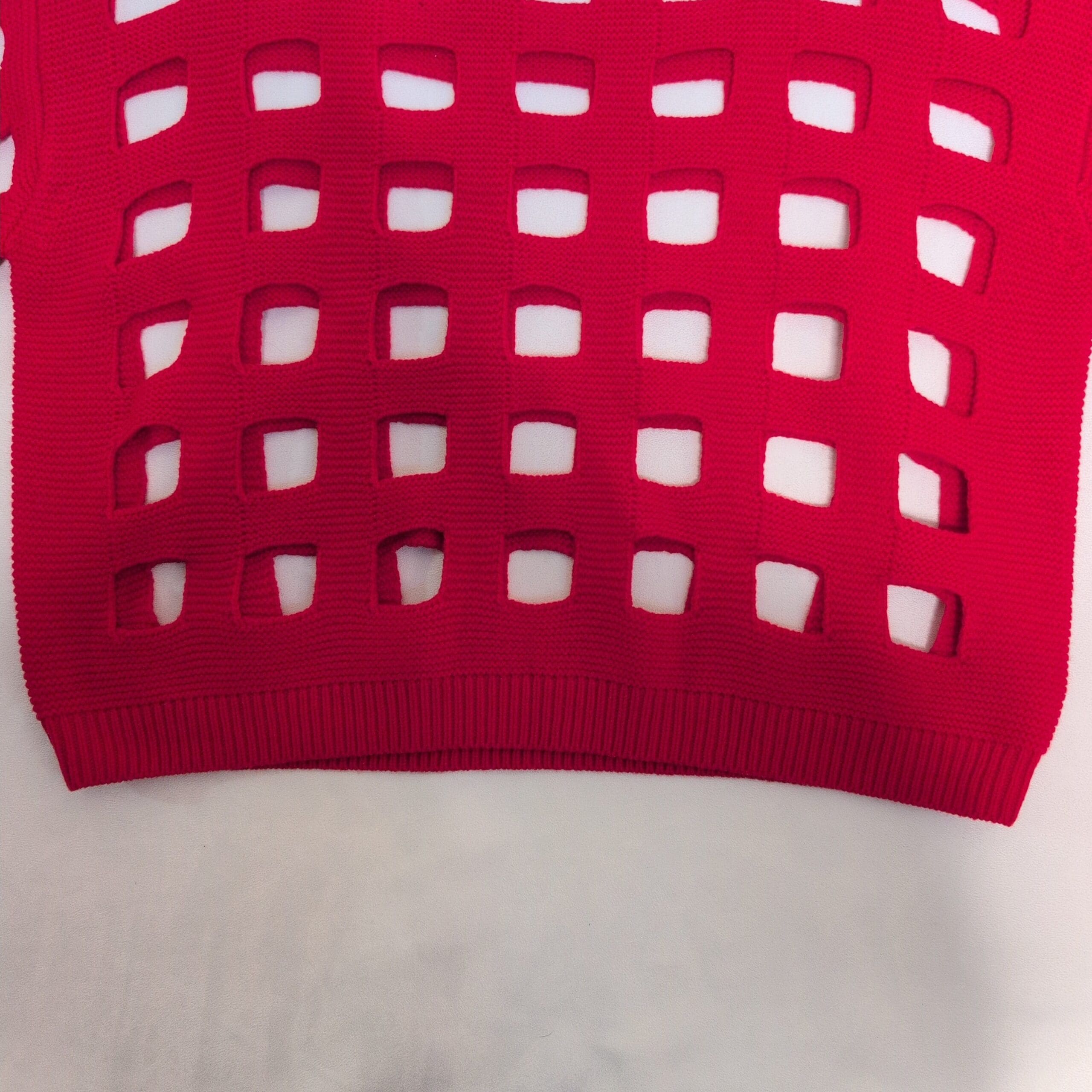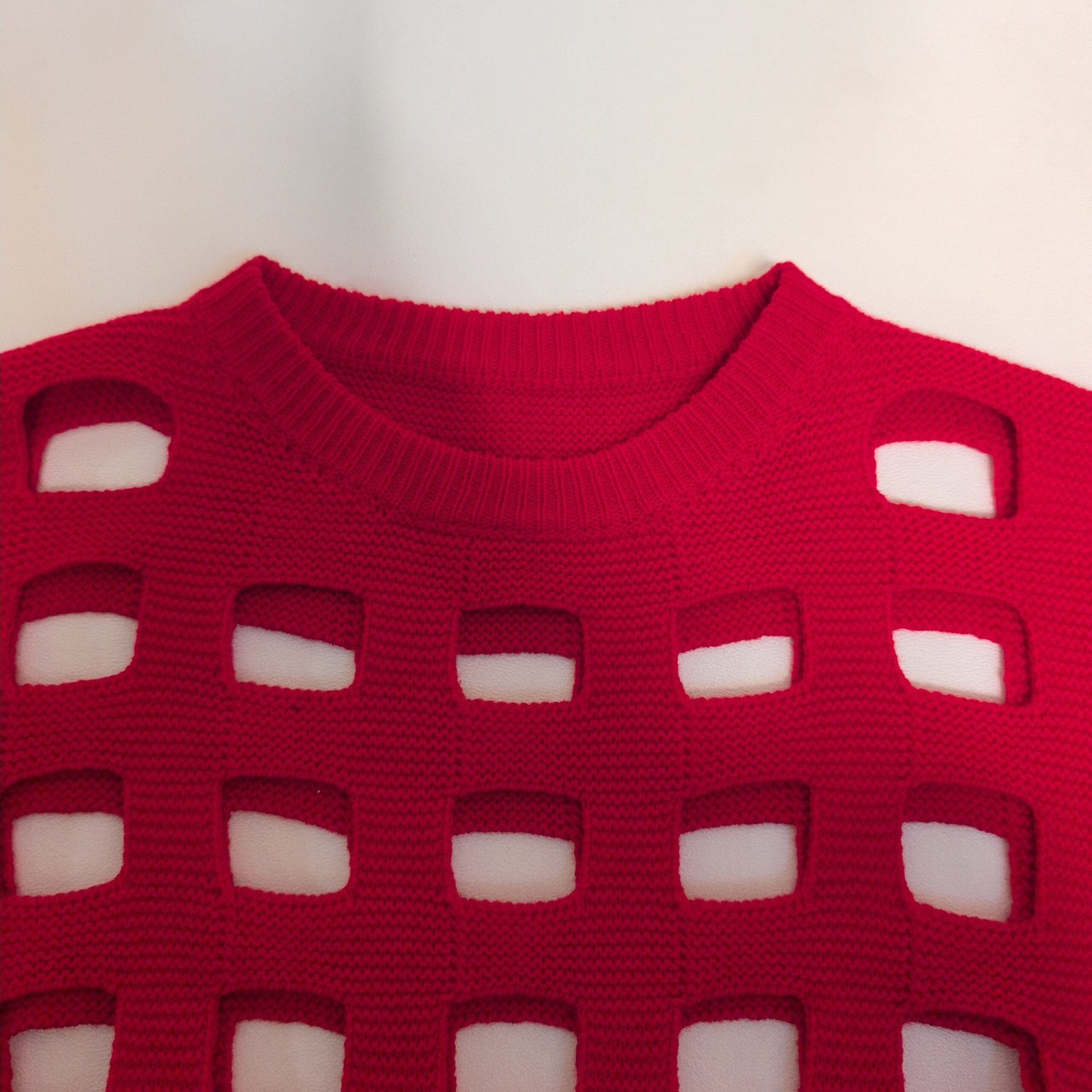 Bright red women’s crewneck sweater with a bold grid of square cutouts for a modern, statement look. Features ribbed crew neckline, long sleeves, ribbed cuffs and hem, and a relaxed fit that appears close to a medium — please see photos for exact measurements. Unknown brand; tags have been removed. Review all images for condition and fit details.