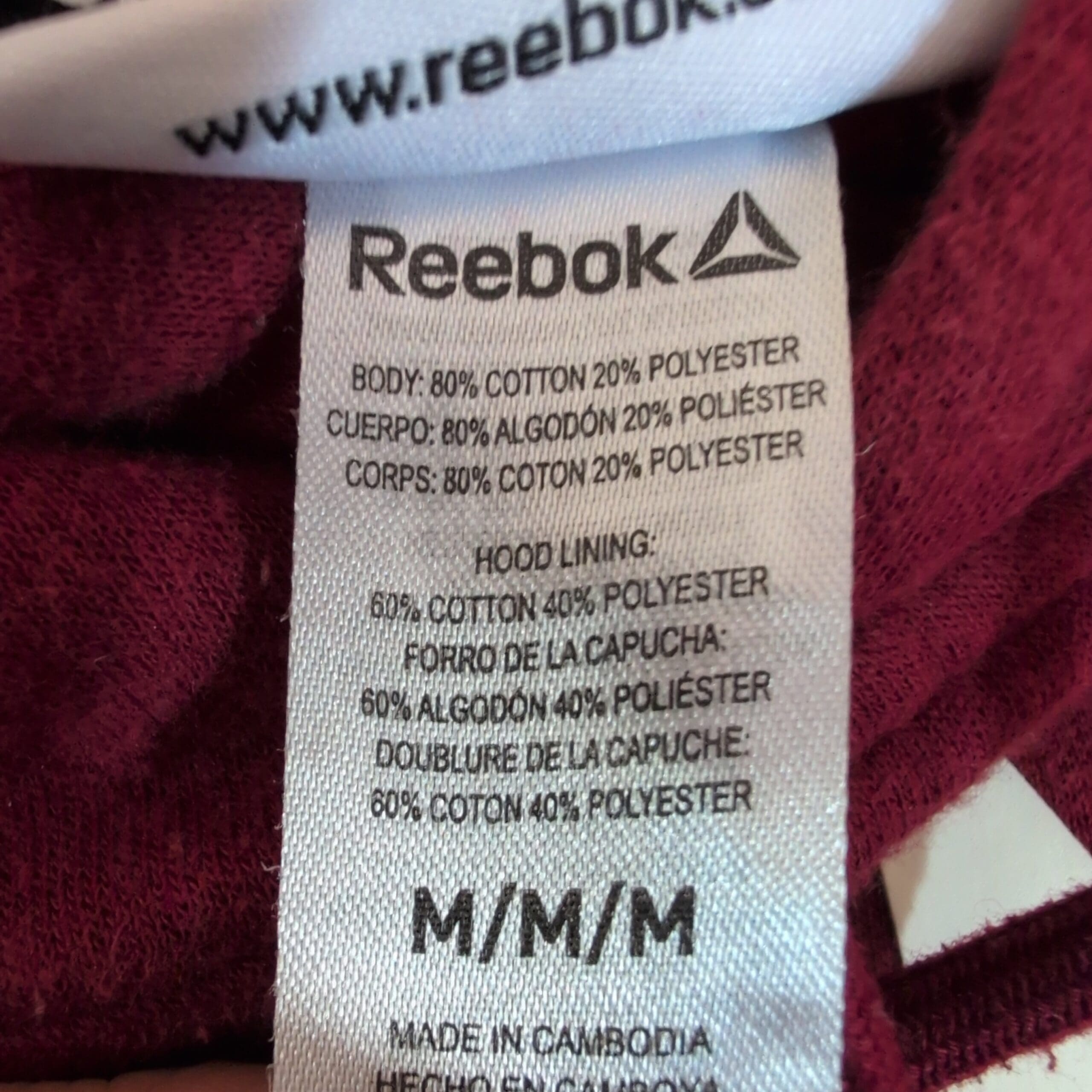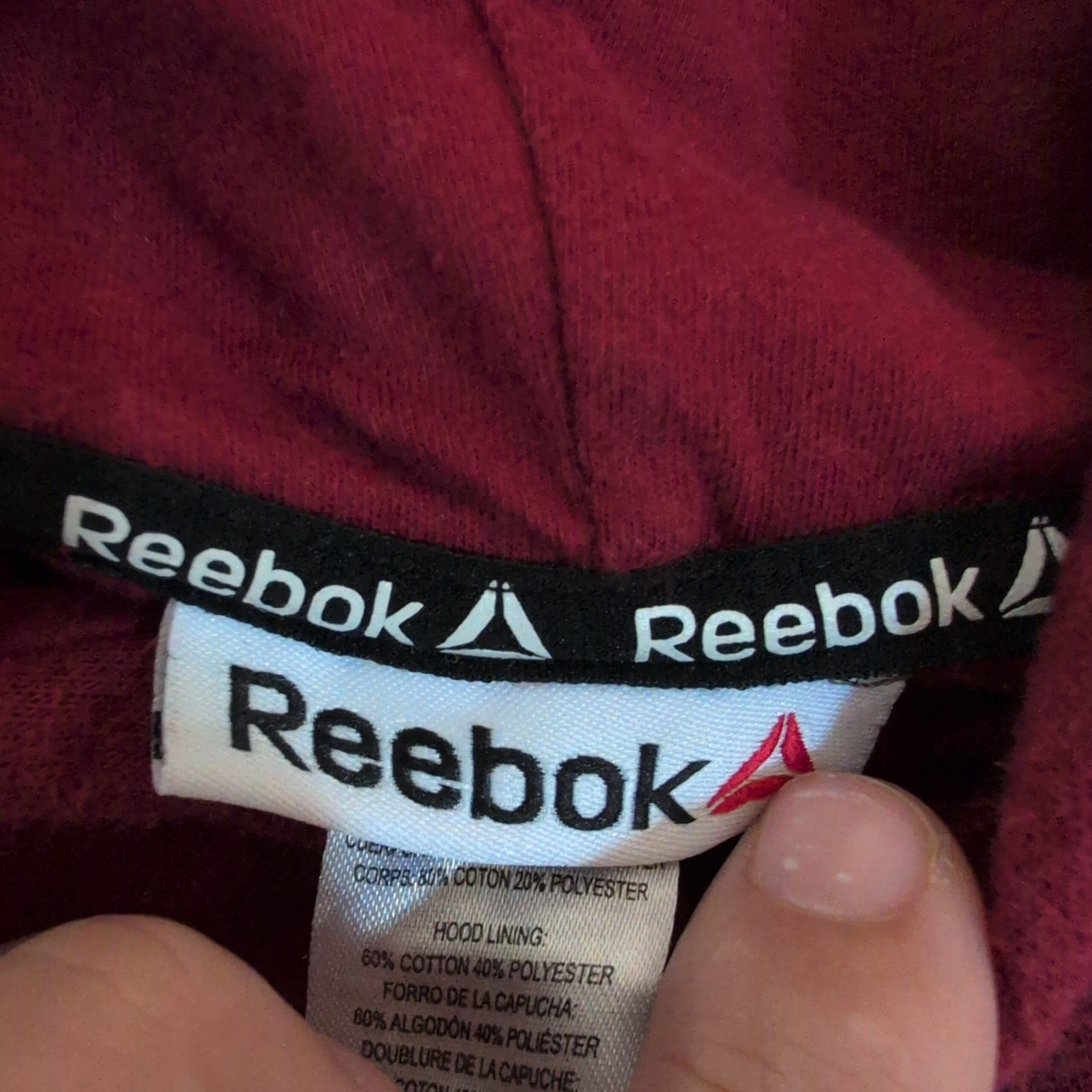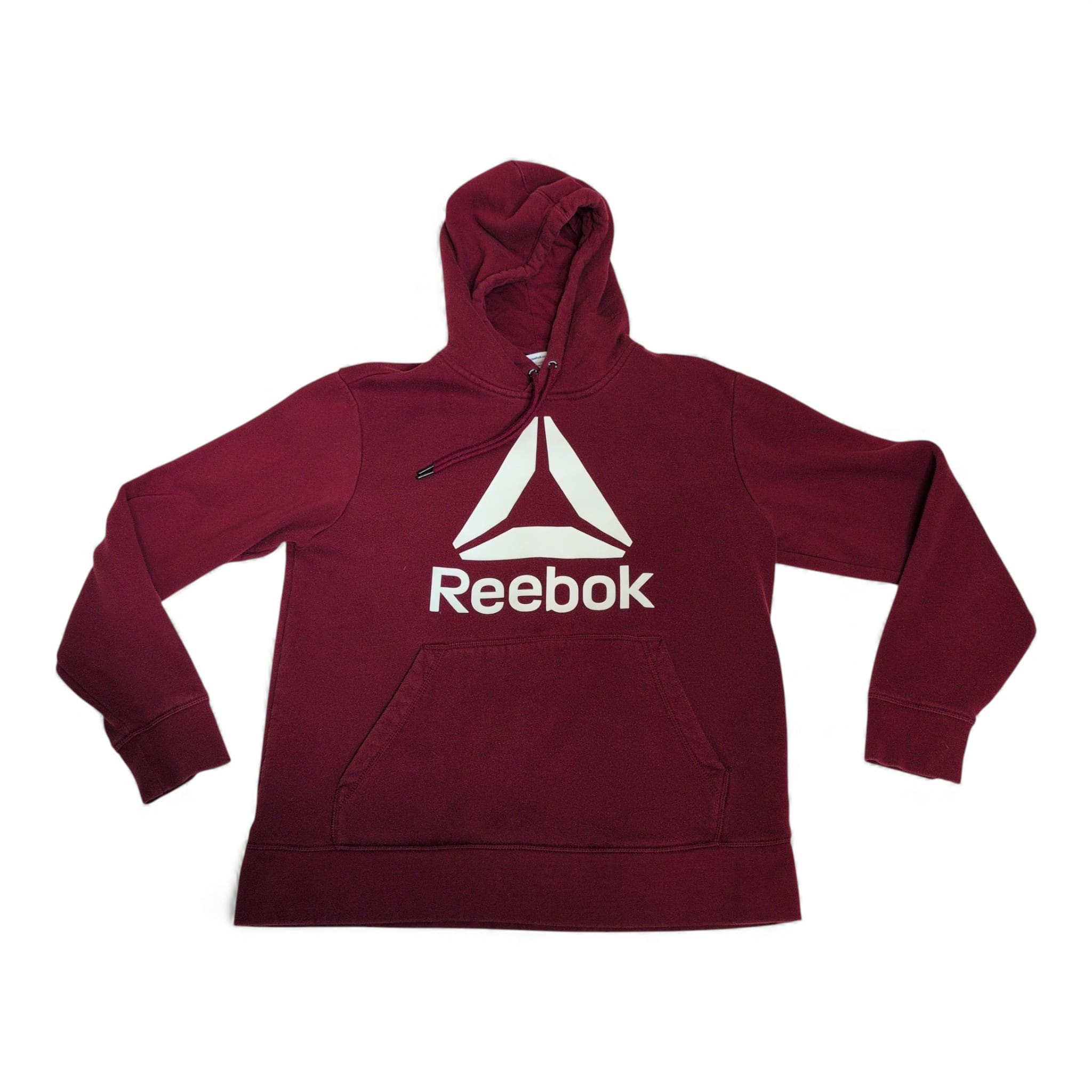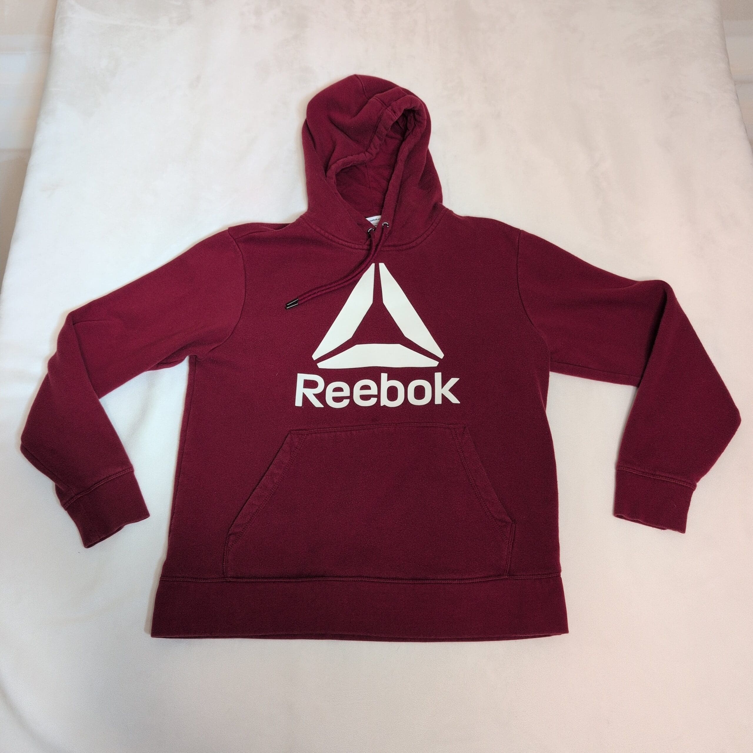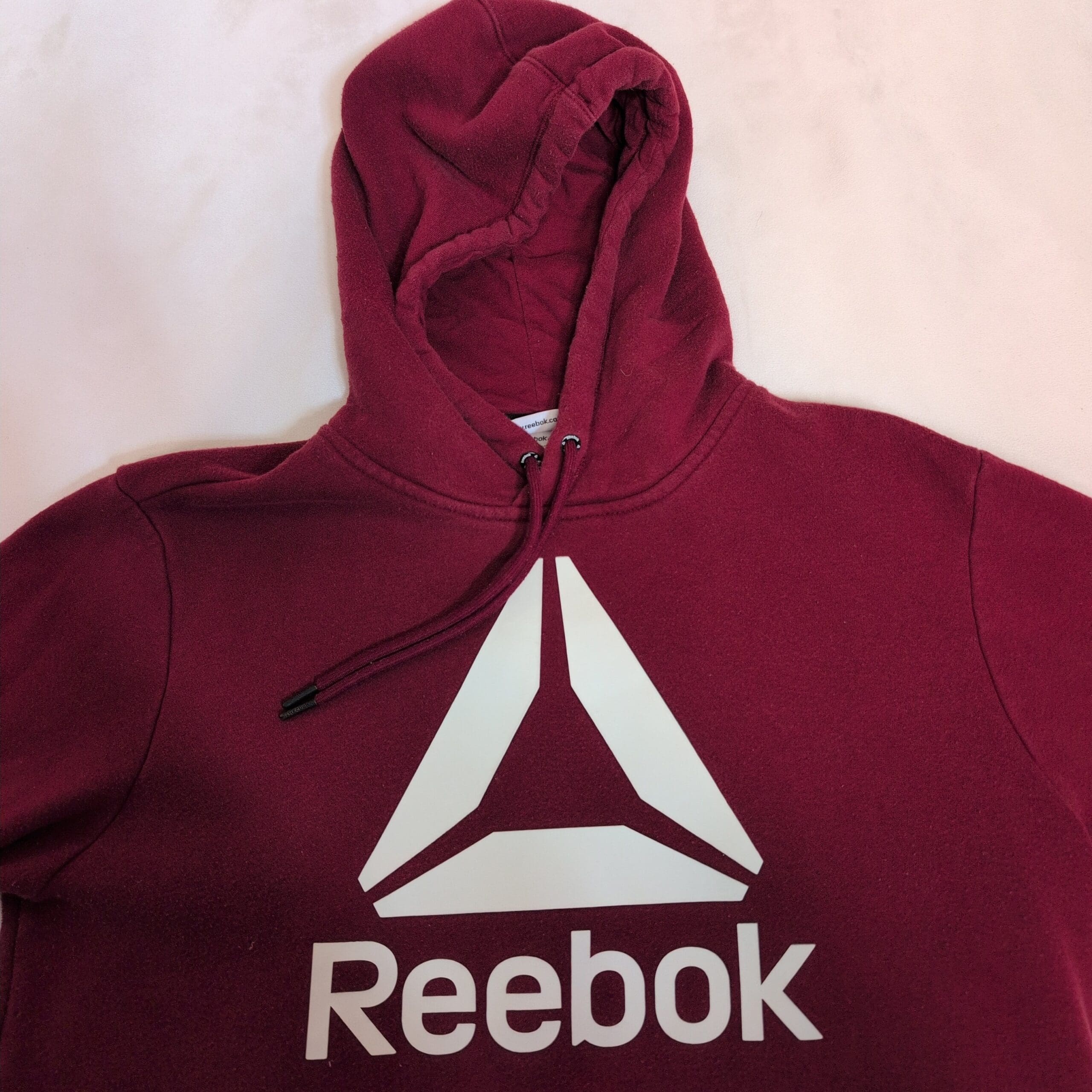 Reebok men’s pullover hoodie in red (pictured). Size M (standard). Features a large white Reebok logo on the chest, drawstring hood, kangaroo pocket, and ribbed cuffs and hem for a classic, comfortable fit. Perfect for workouts or everyday casual wear. Gently used — clean with light, normal wear; no stains, holes, or major defects visible in photos.