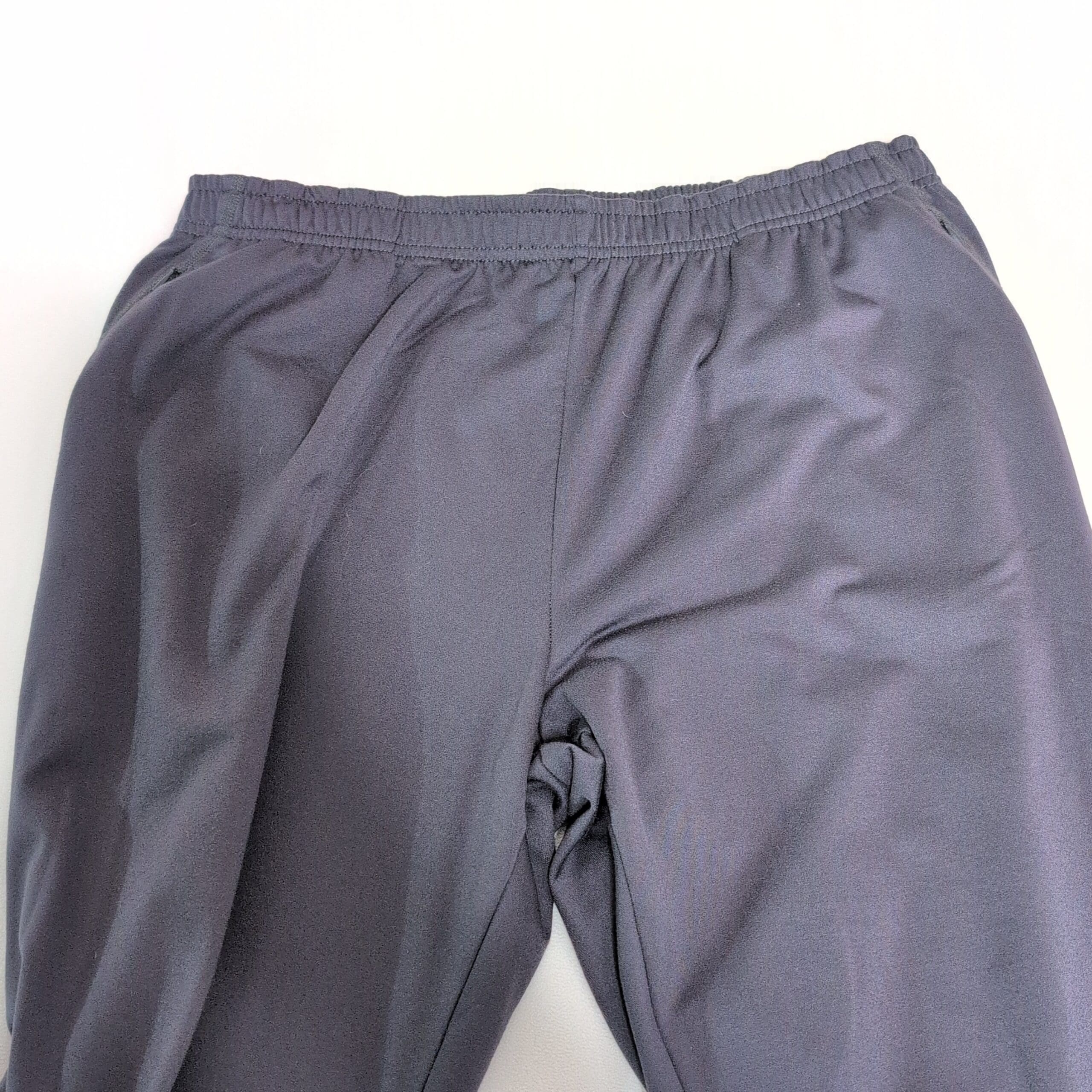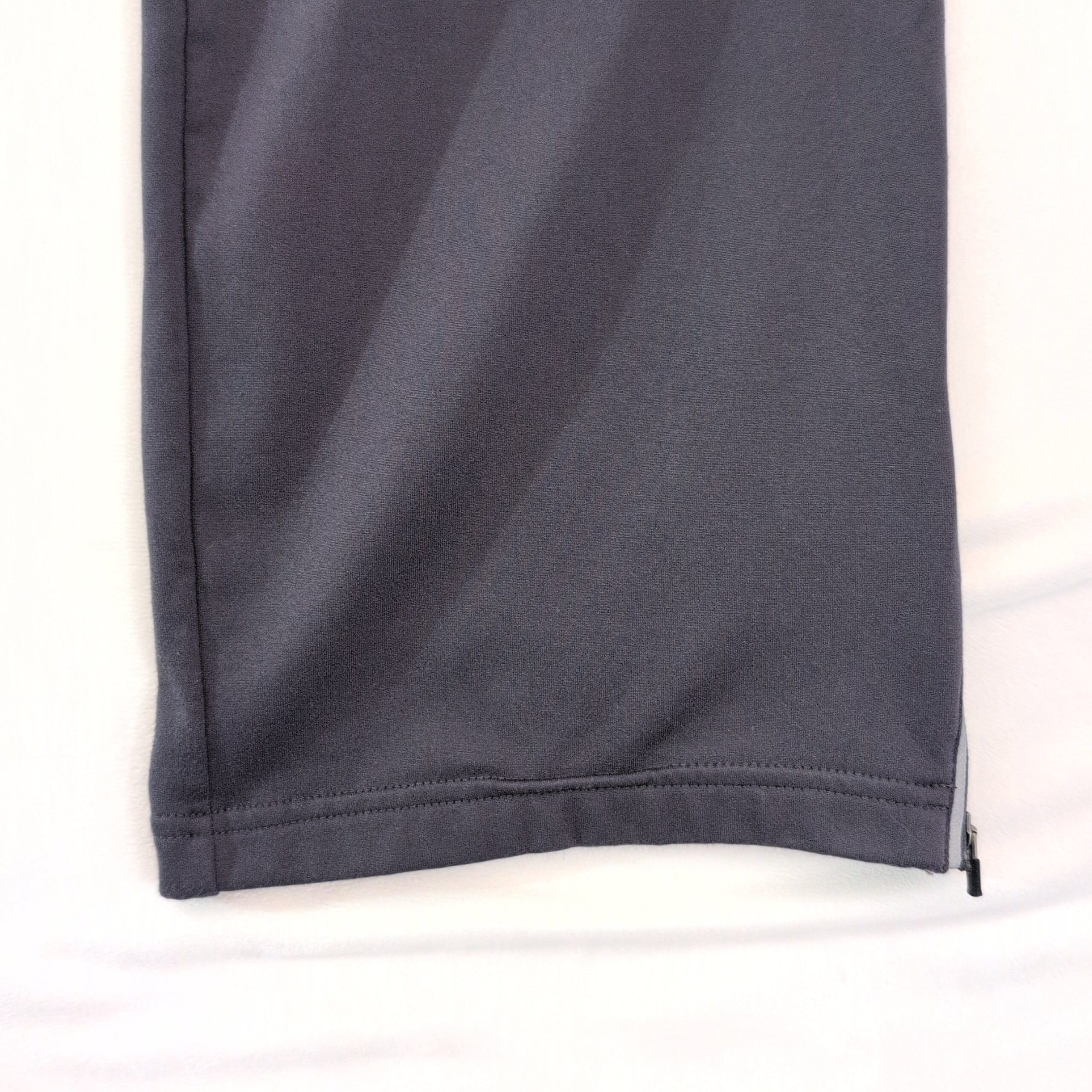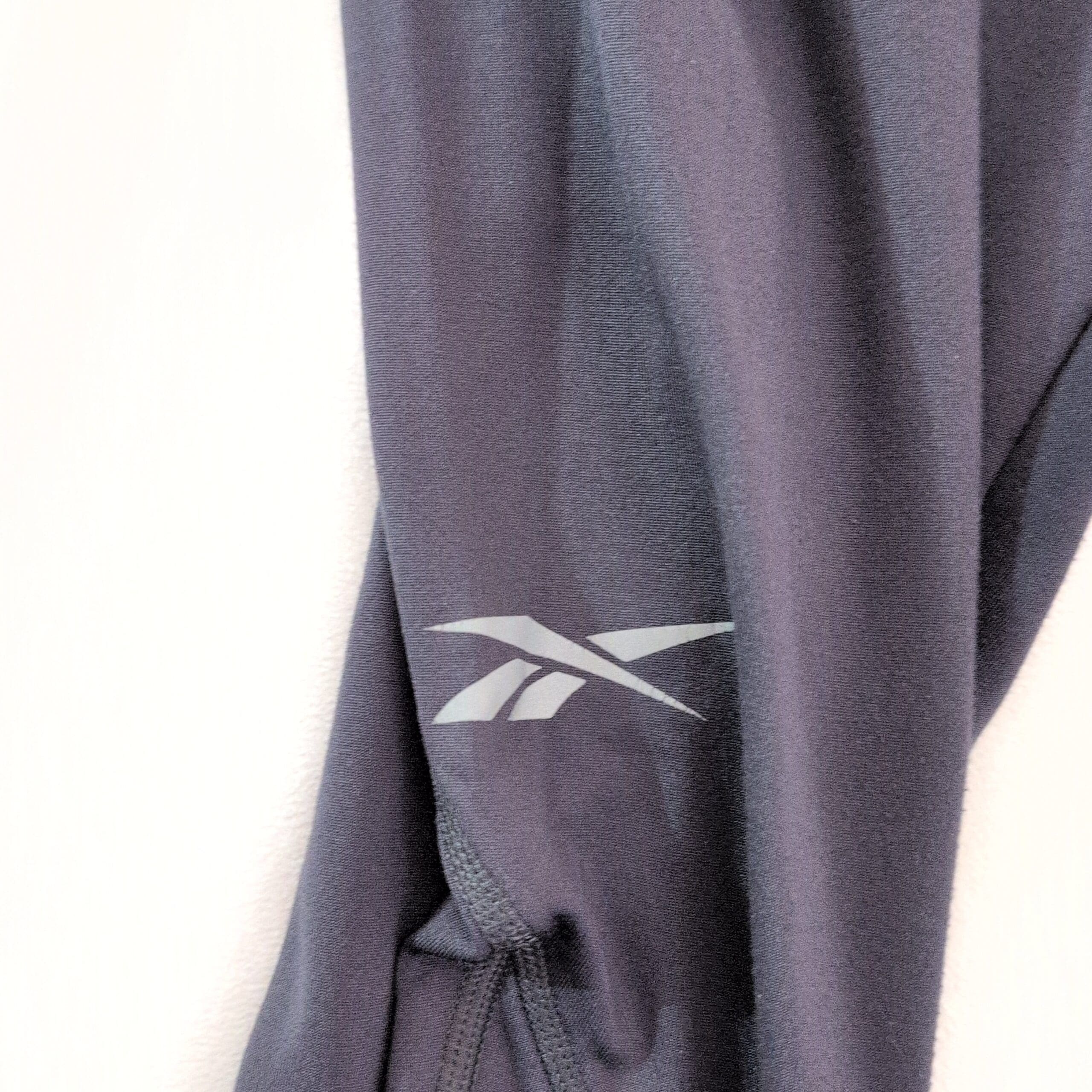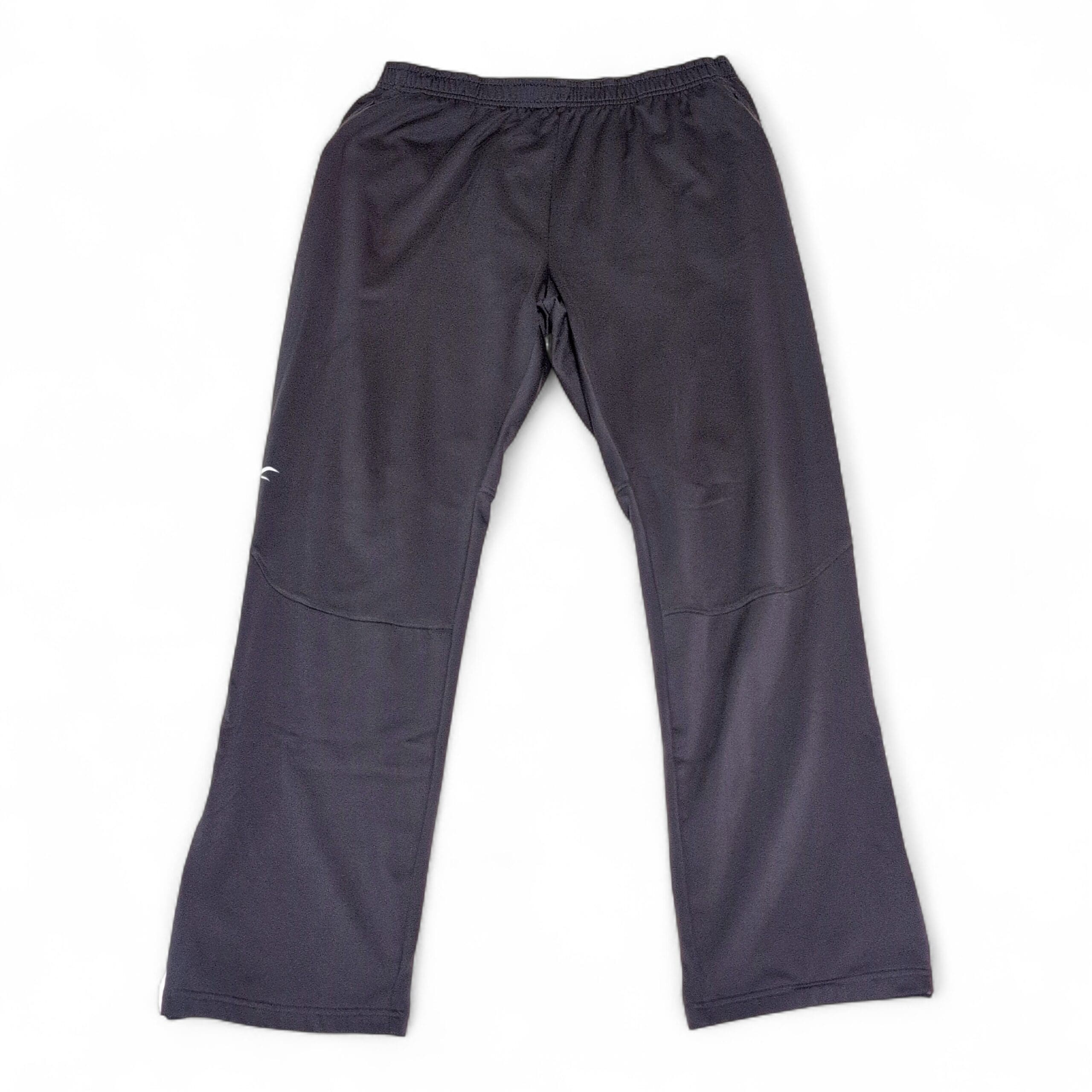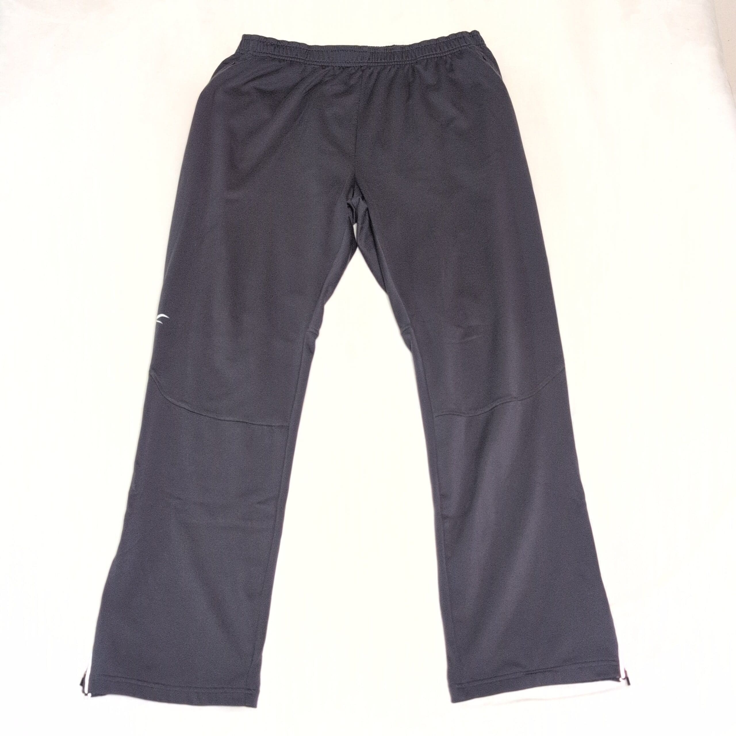 Reebok women’s gray track pants in size L. Lightweight, breathable performance fabric with an elastic waistband for a comfortable fit. Slight bootcut/flare with knee seam detailing and a small Reebok logo on the left thigh. Ankle zippers for easy on/off and versatile for workouts or everyday athleisure.