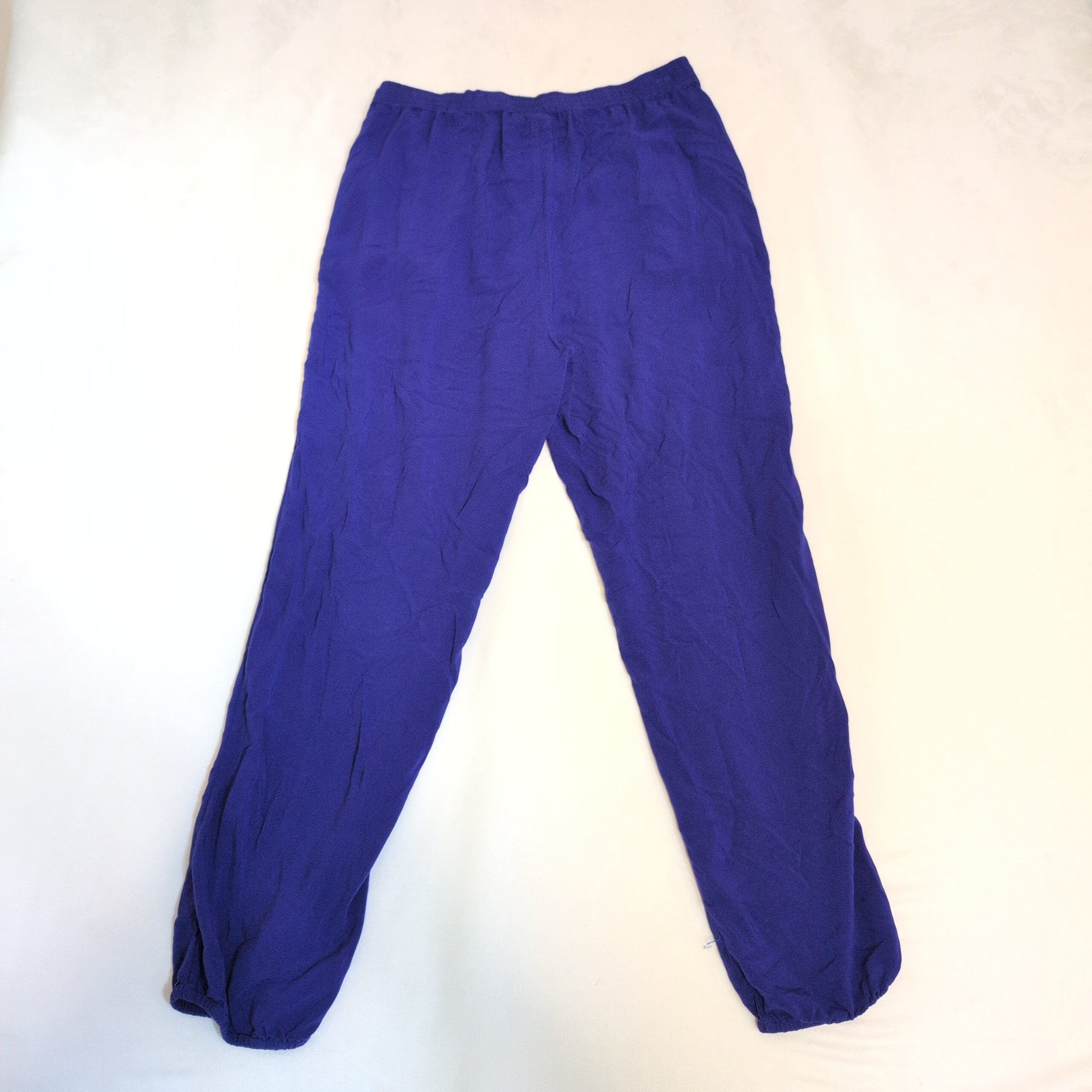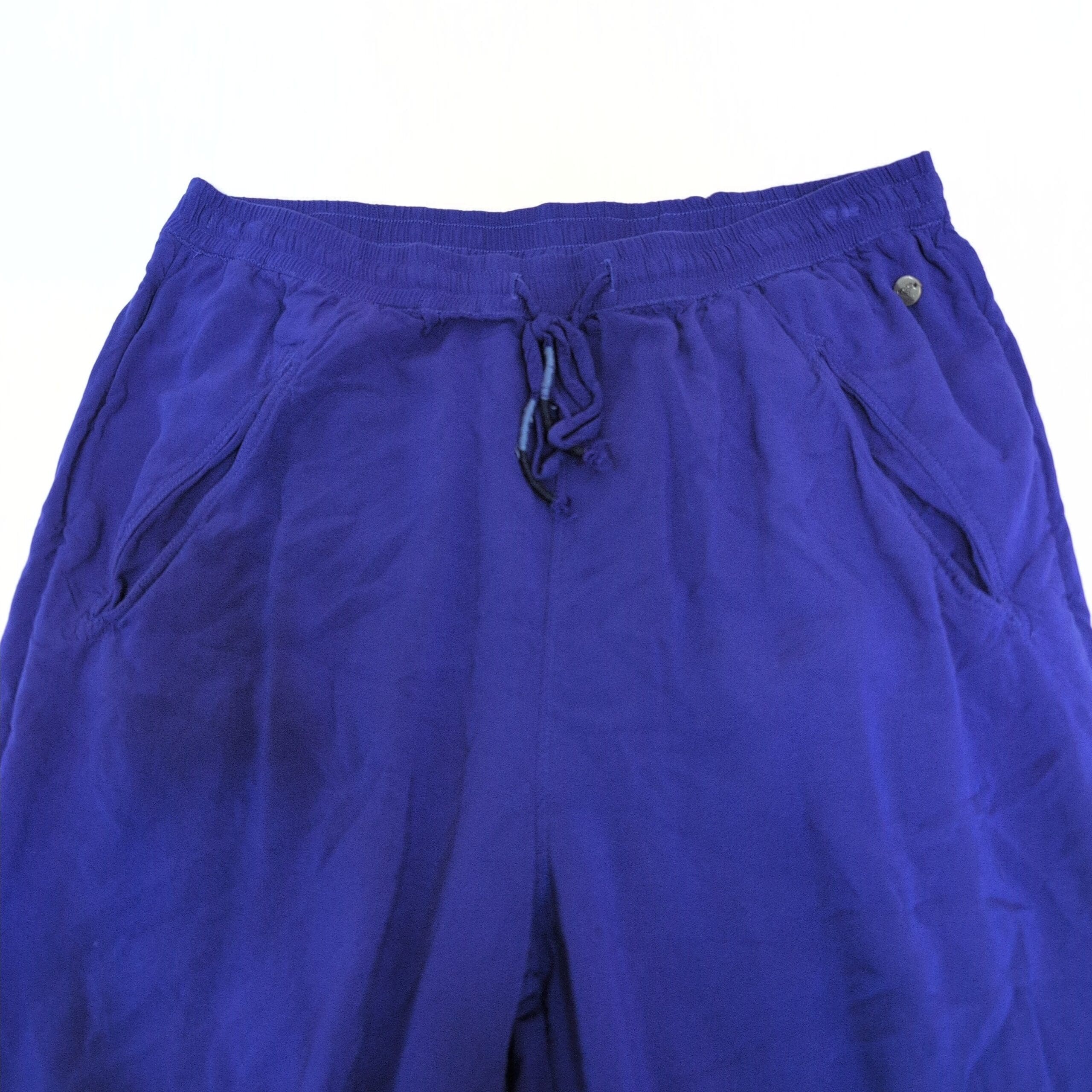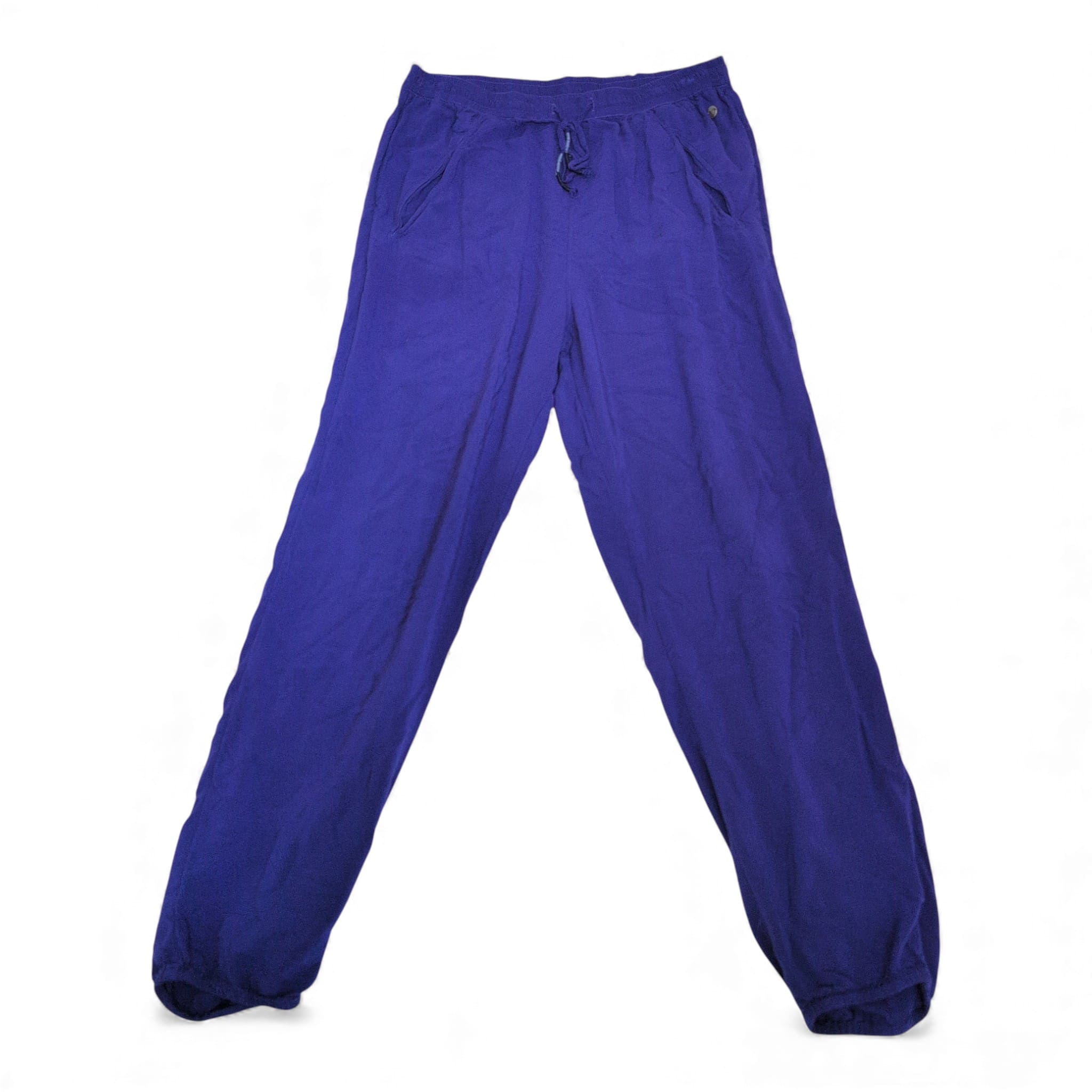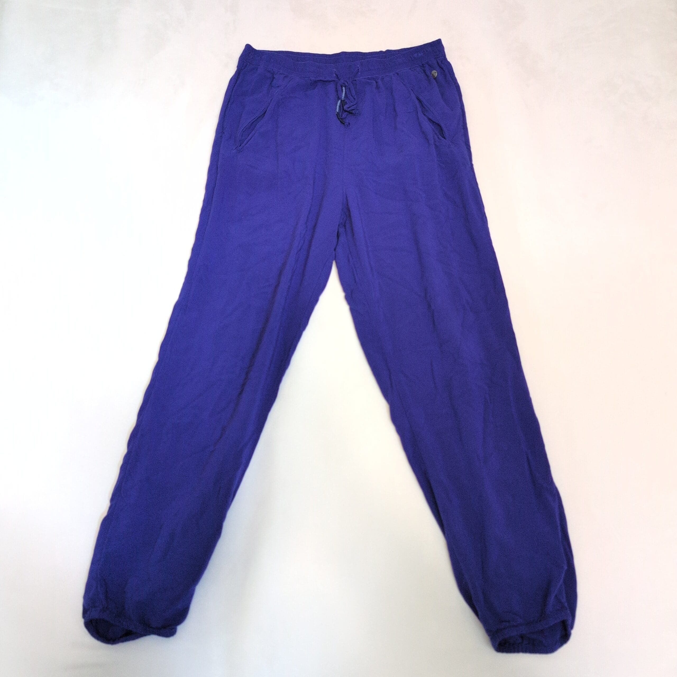 Roxy women’s track pants/joggers in vibrant blue. Size M (standard). Features an elastic waistband with adjustable drawstring, two front pockets, relaxed leg and elasticized ankle cuffs for a comfortable fit. Versatile for casual wear, travel, or lounging. See photos for details.