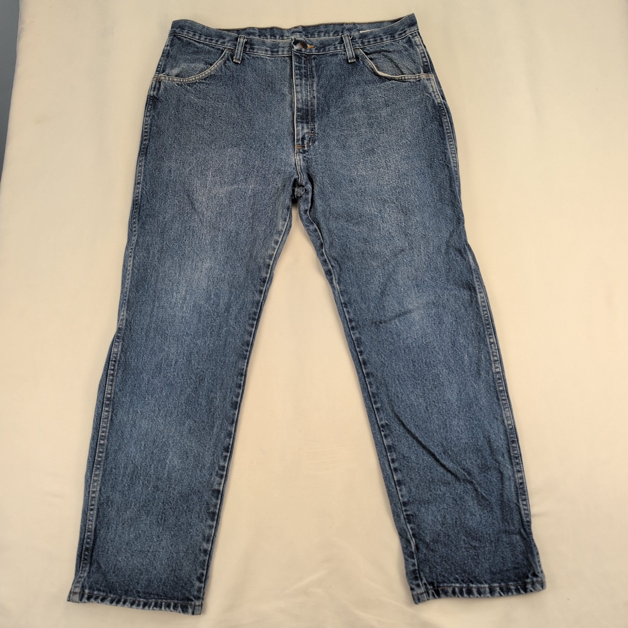Rustler men’s straight leg jeans in classic medium blue denim. Size: 40×30 (waist 40, inseam 30). Excellent used condition — free of major rips, tears, or stains. Typical light wear and overall fading consistent with prior use; faint creasing at knees and seat as shown in photos. Five-pocket styling with button-and-zipper closure. Comfortable, timeless pair perfect for everyday wear.