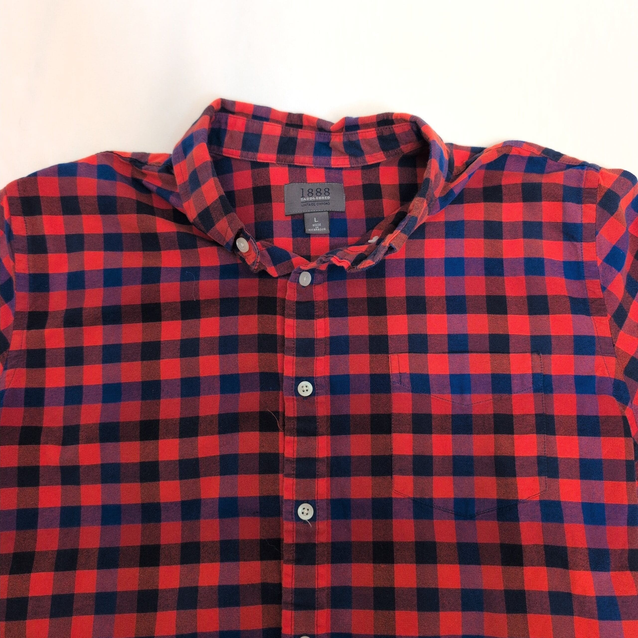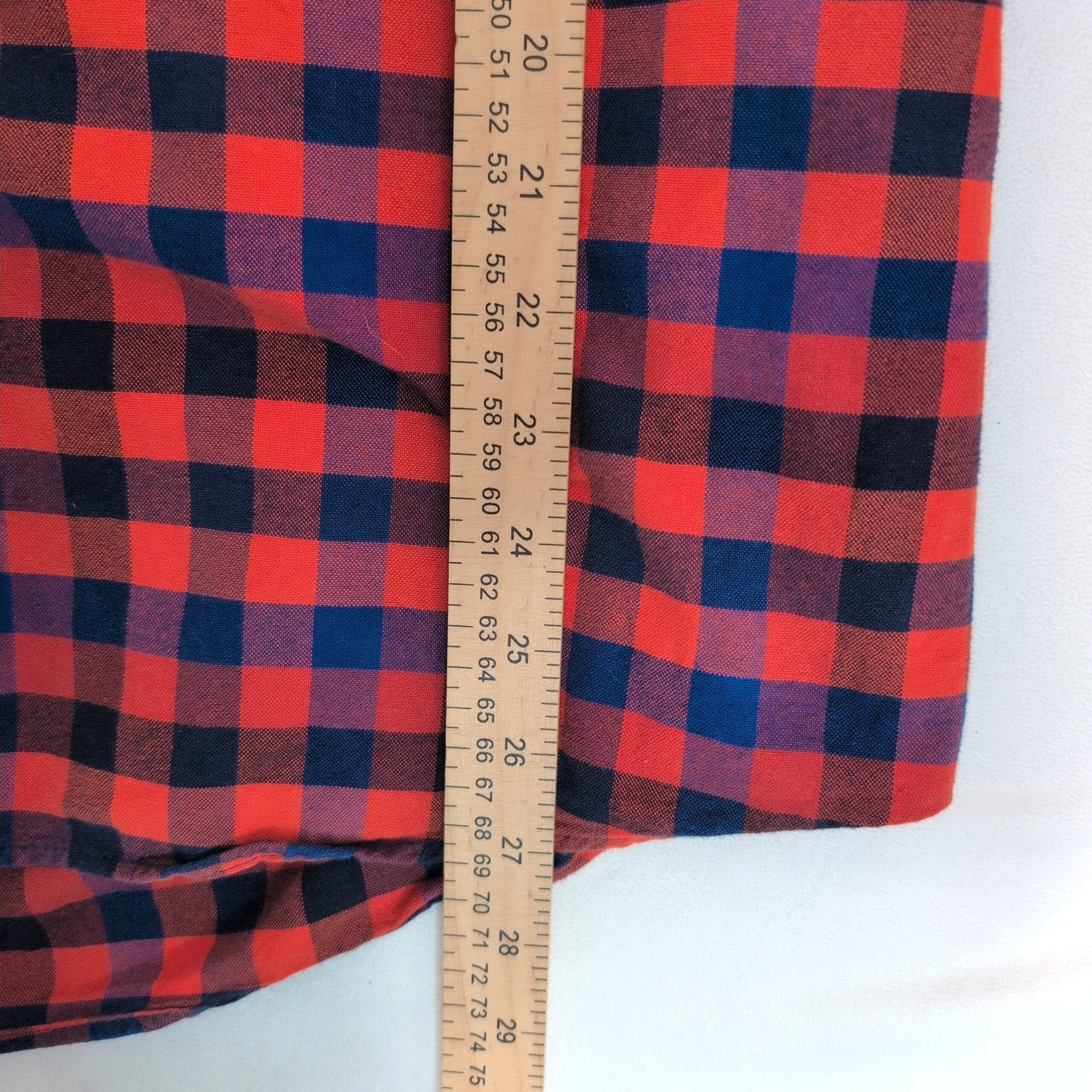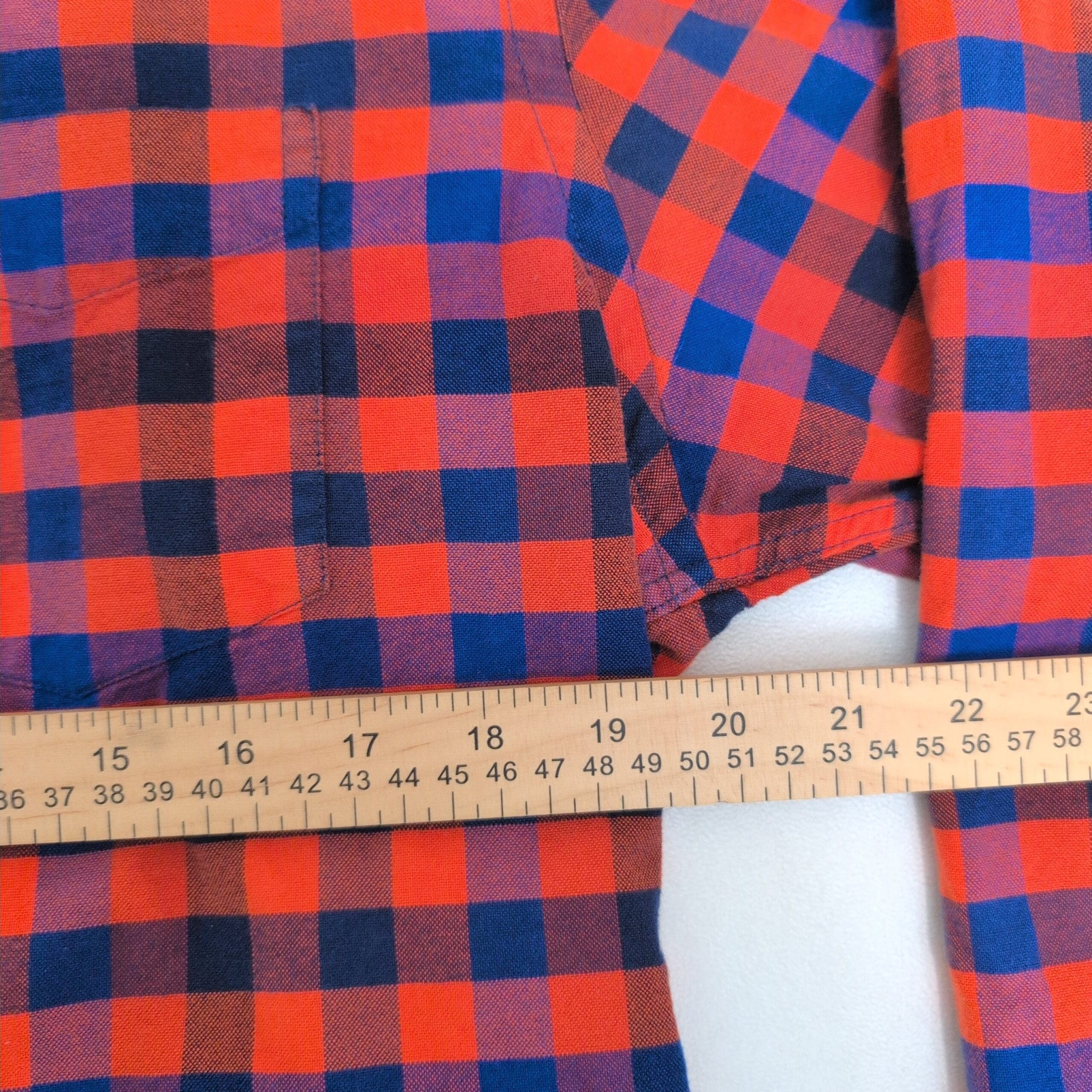 Saddlebred men’s long-sleeve casual button-down in size L. Classic orange plaid check with a full button-front, button cuffs, and a rounded hem—versatile for layering or wearing on its own for a neat, casual look. Standard fit ideal for everyday wear, office-casual, or weekend plans. Pre-owned and in good condition.