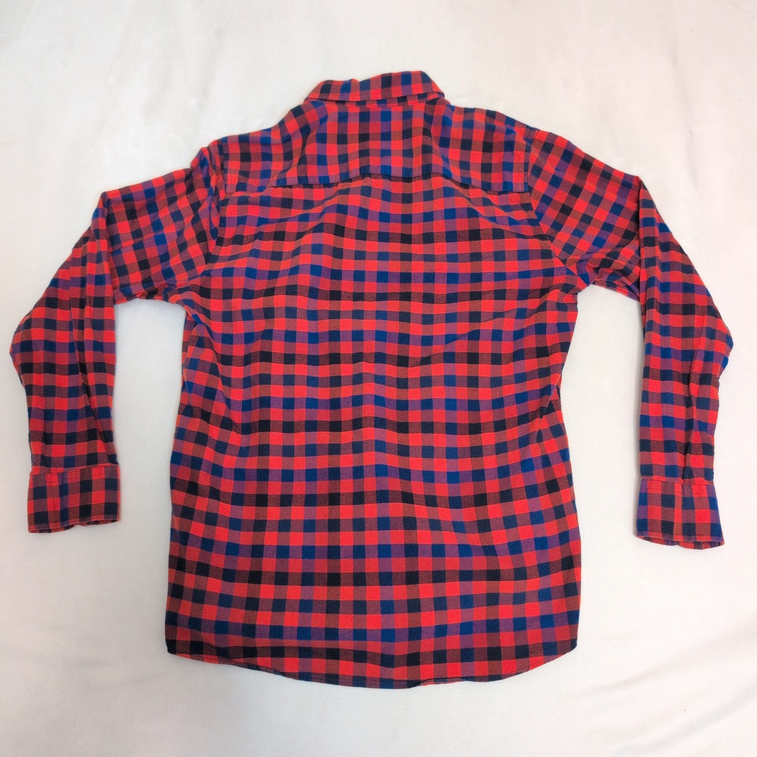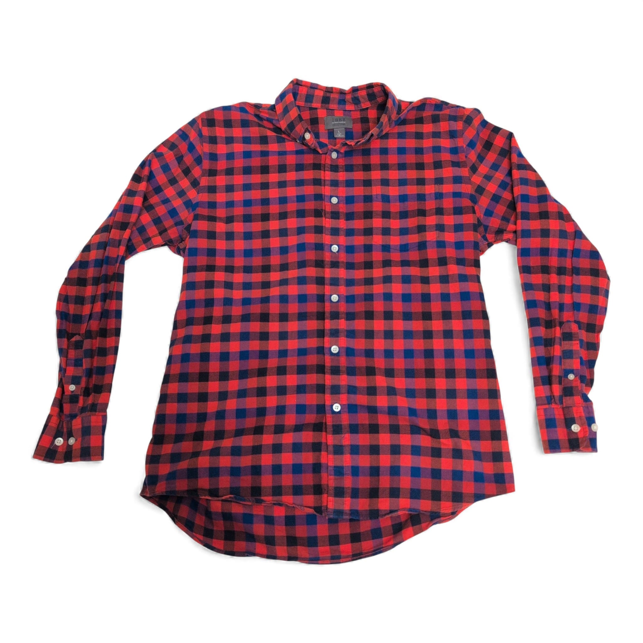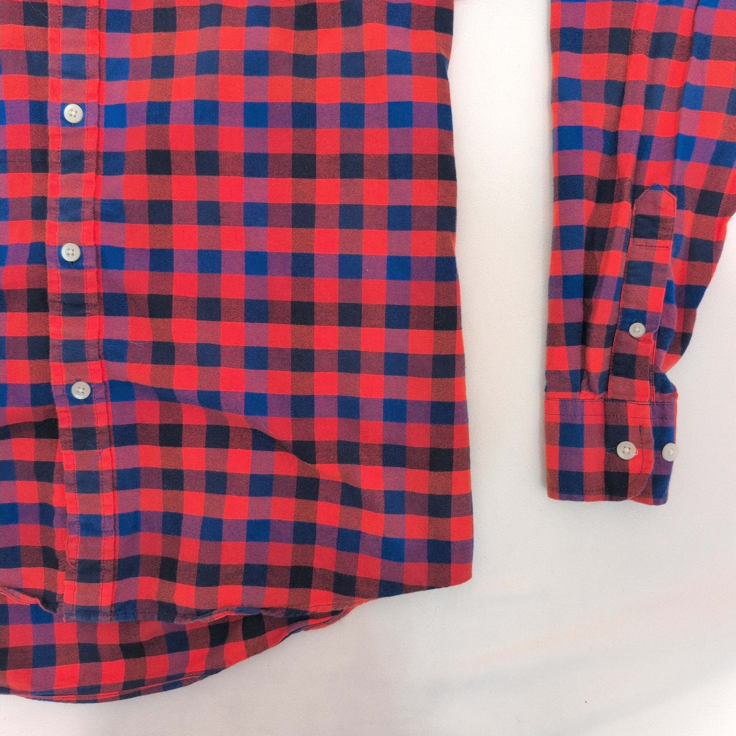 Saddlebred men’s long-sleeve casual button-down in size L. Classic orange plaid check with a full button-front, button cuffs, and a rounded hem—versatile for layering or wearing on its own for a neat, casual look. Standard fit ideal for everyday wear, office-casual, or weekend plans. Pre-owned and in good condition.