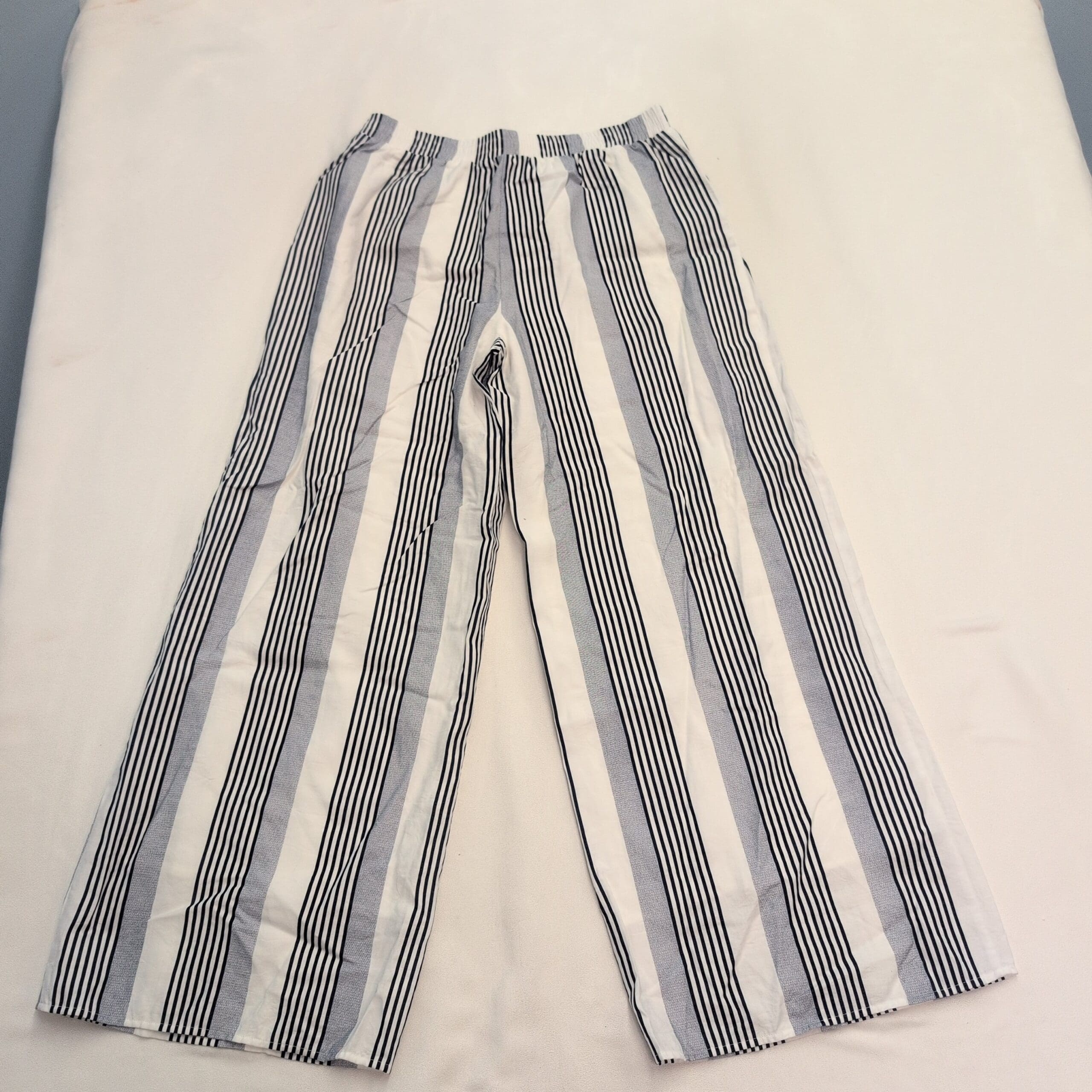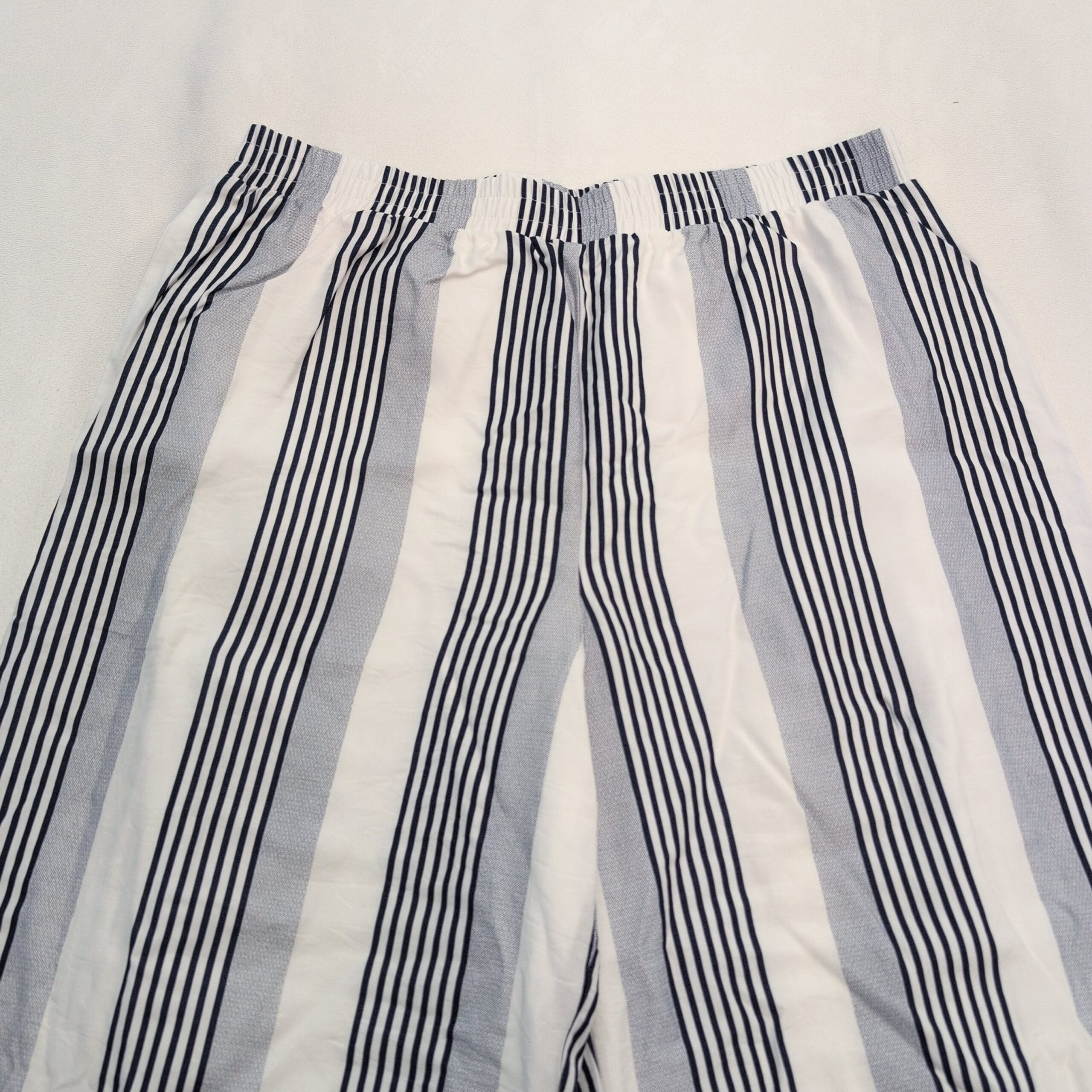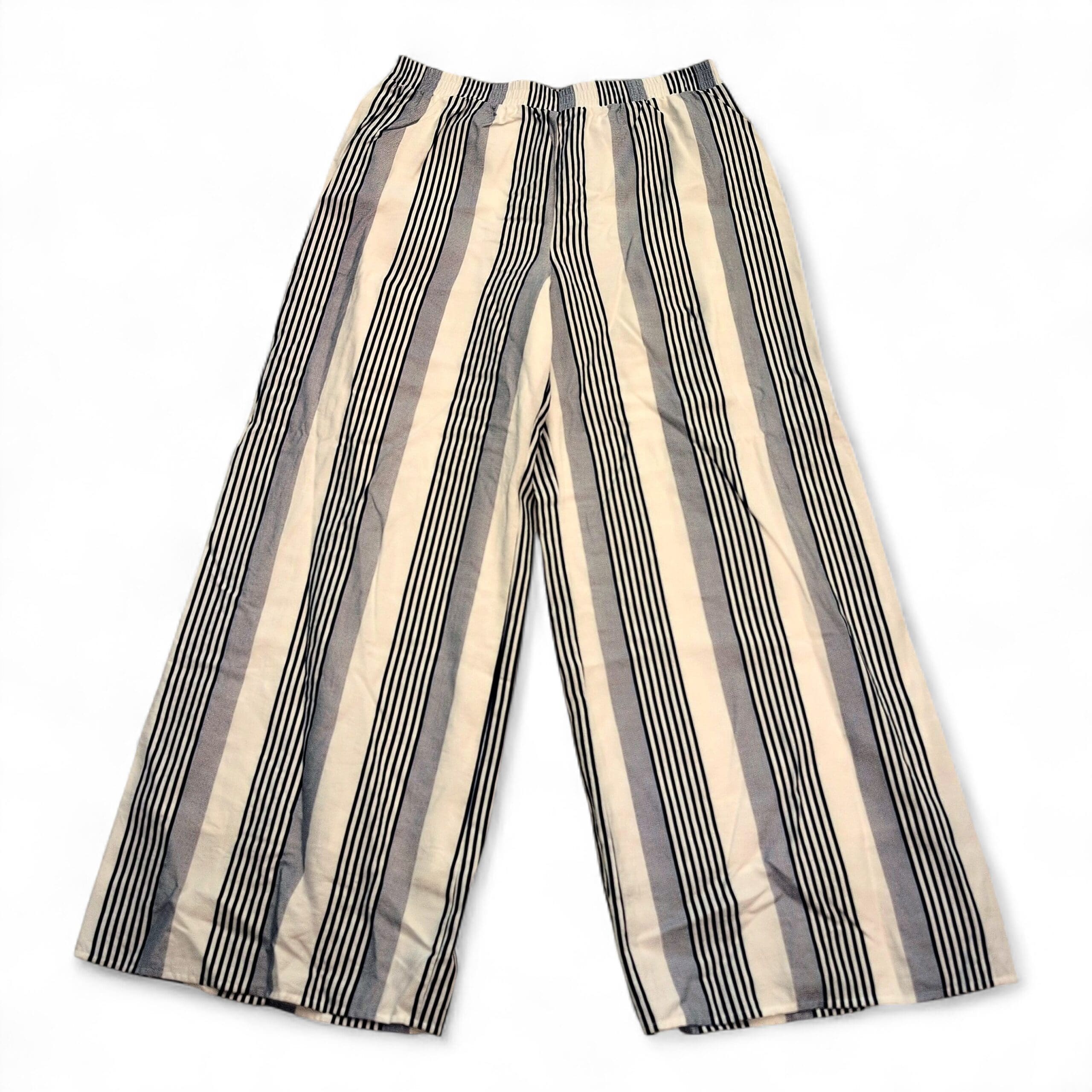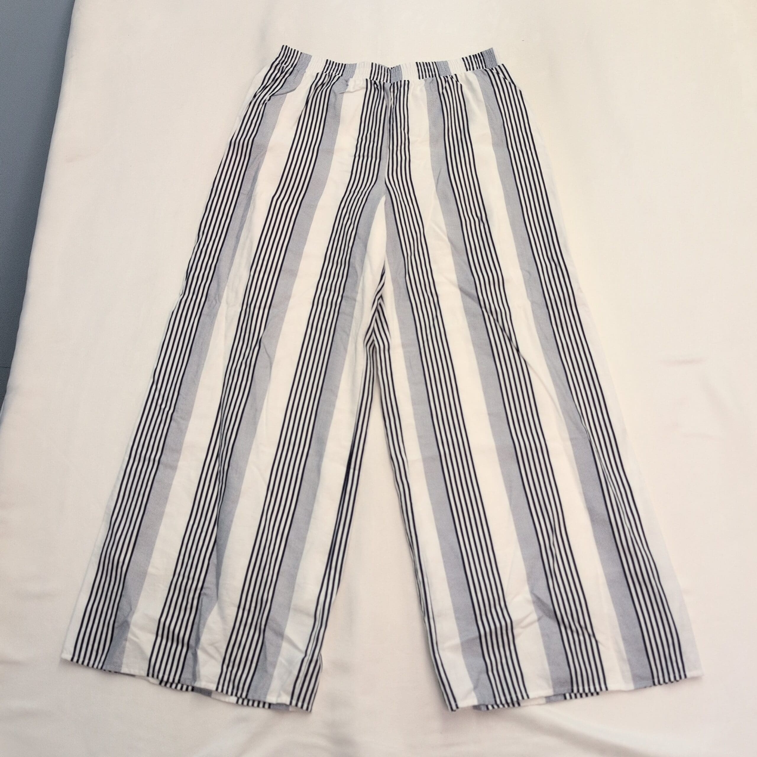Sage the Label wide-leg pants in size L. Lightweight, relaxed silhouette with an elasticized waistband and flattering vertical stripes — white base with navy and gray striping. Breathable, easy-to-wear style perfect for casual or dressed-up summer looks. Gently used and free of major rips, tears, stains, or flaws; typical light wear may be present (see photos).
