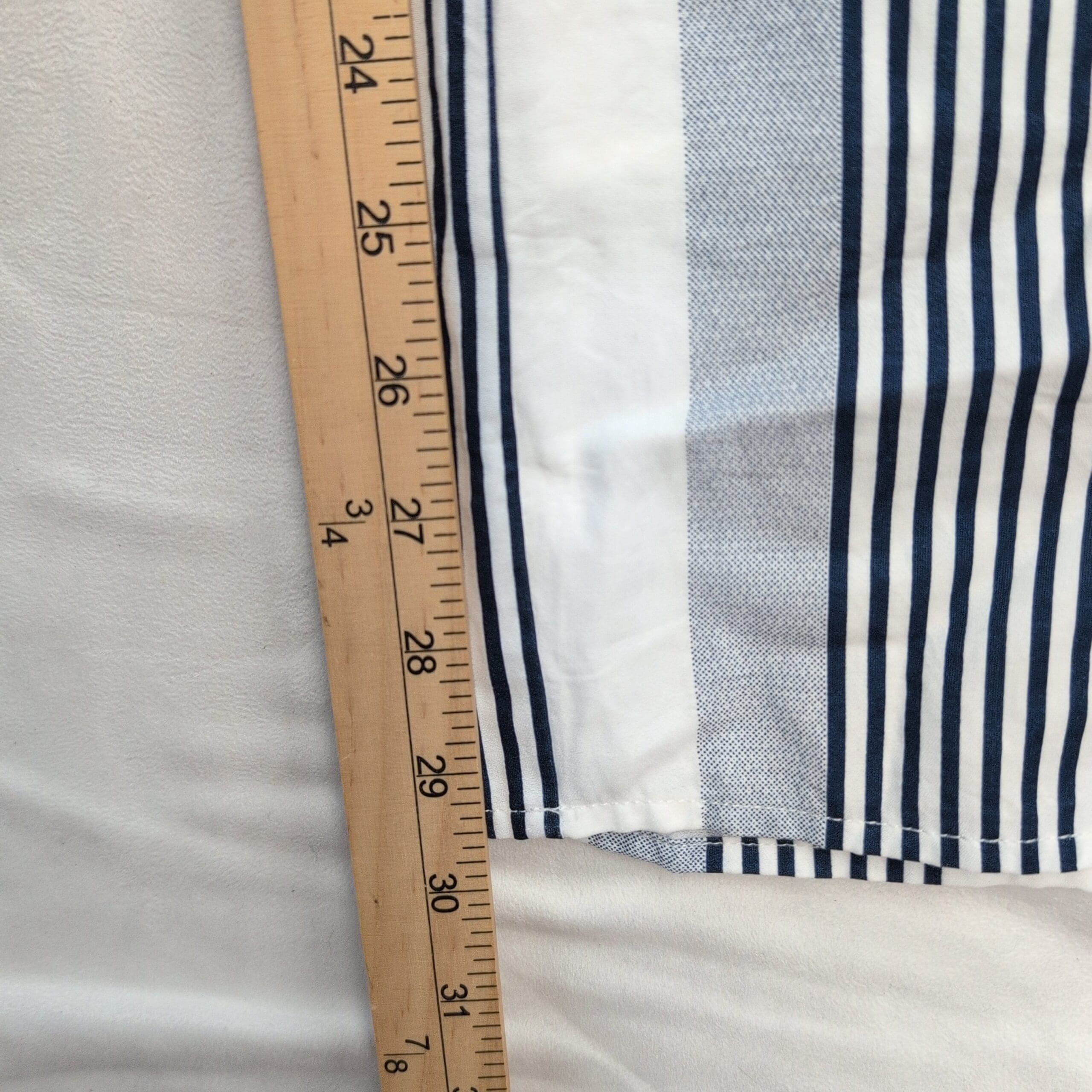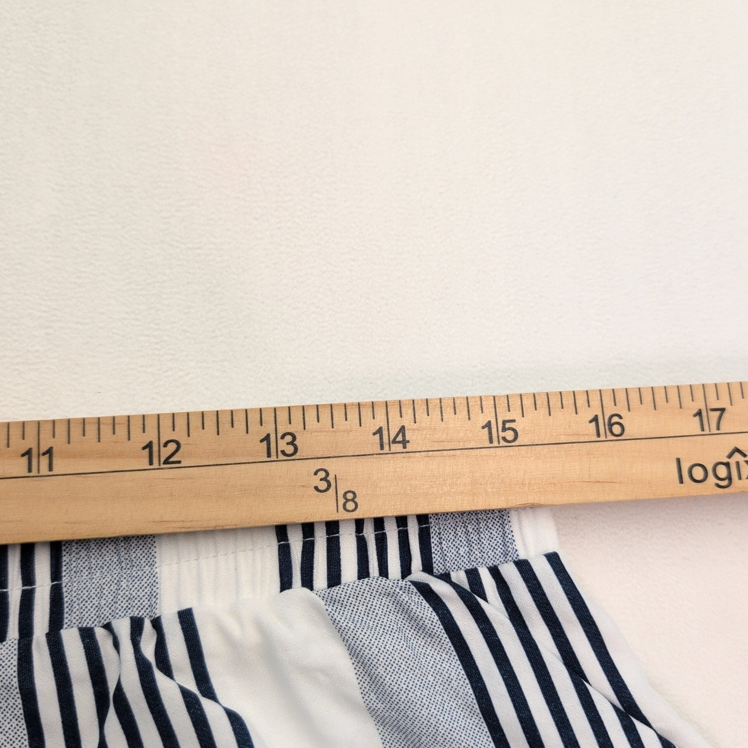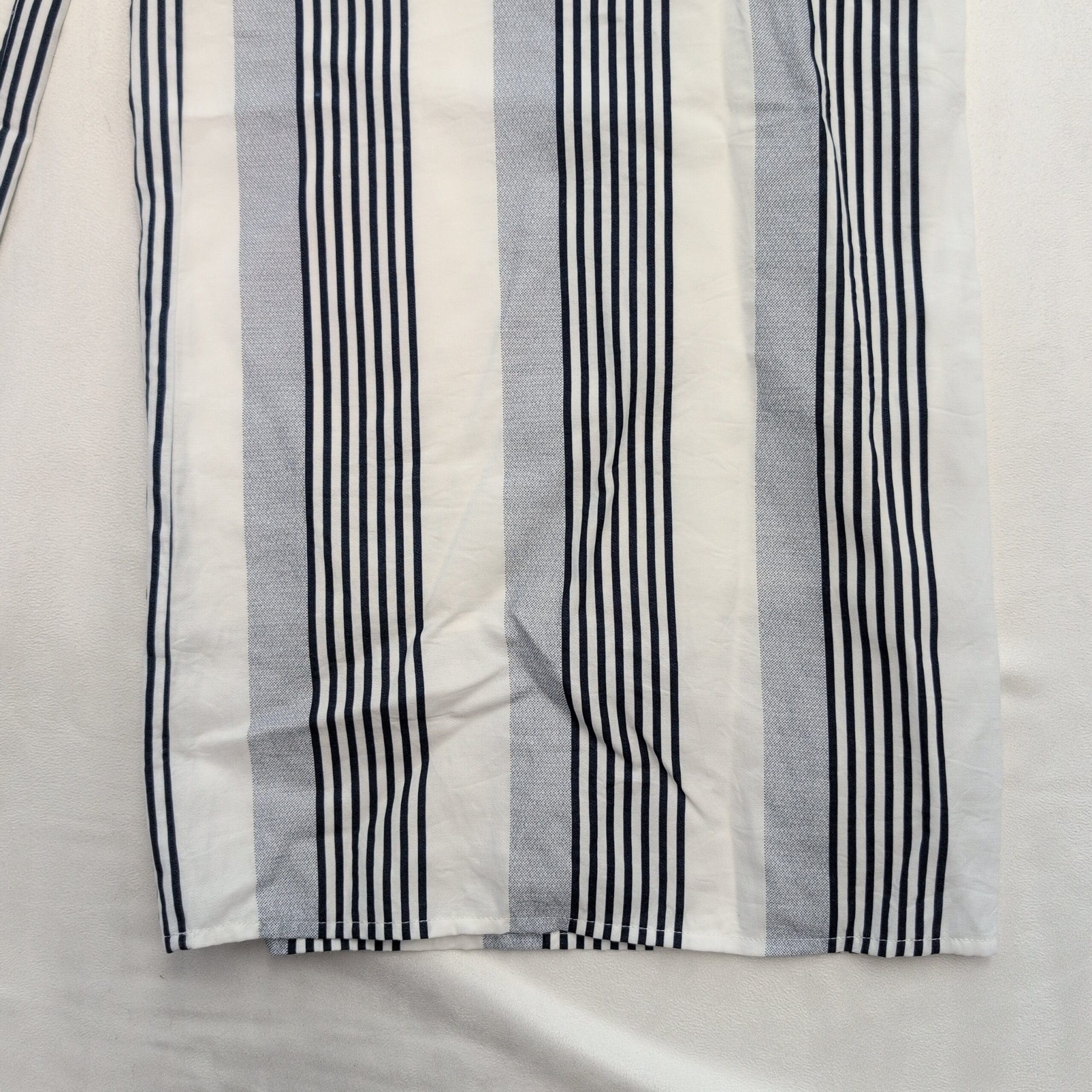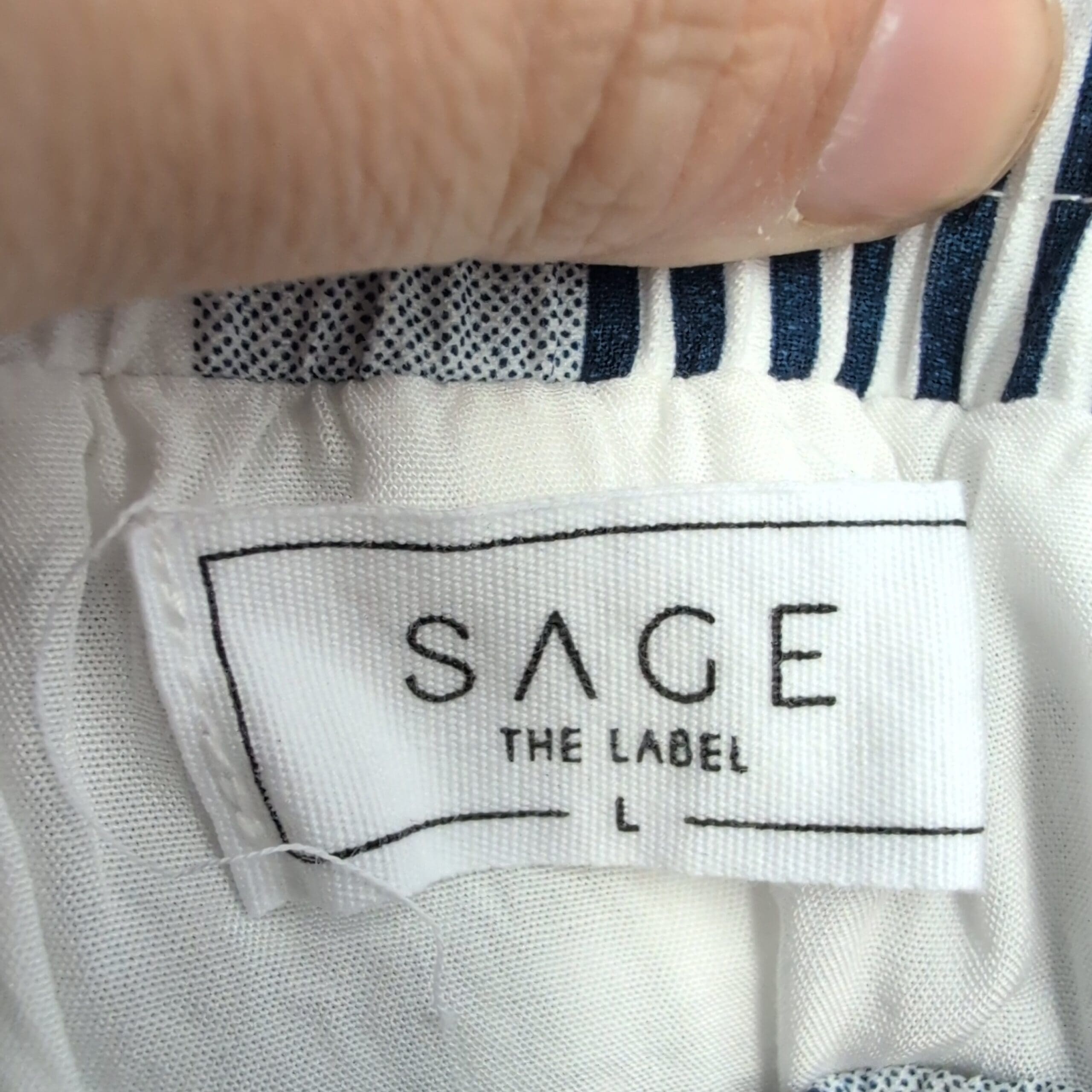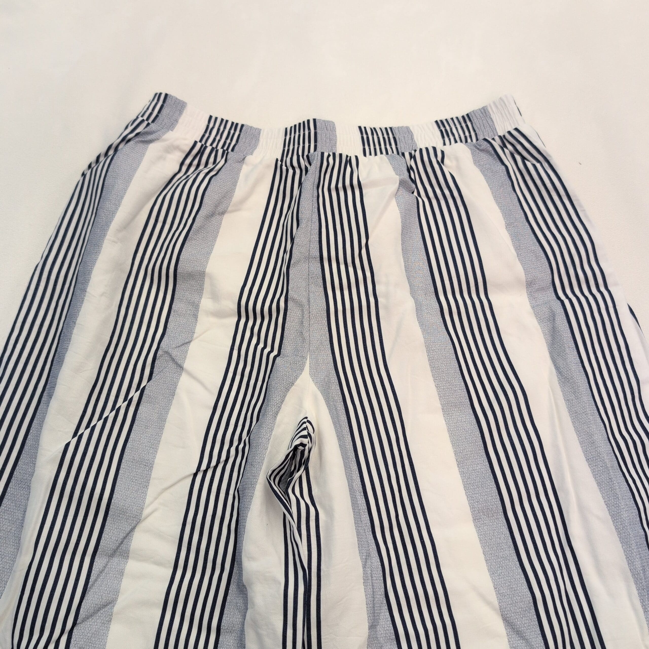 Sage the Label wide-leg pants in size L. Lightweight, relaxed silhouette with an elasticized waistband and flattering vertical stripes — white base with navy and gray striping. Breathable, easy-to-wear style perfect for casual or dressed-up summer looks. Gently used and free of major rips, tears, stains, or flaws; typical light wear may be present (see photos).