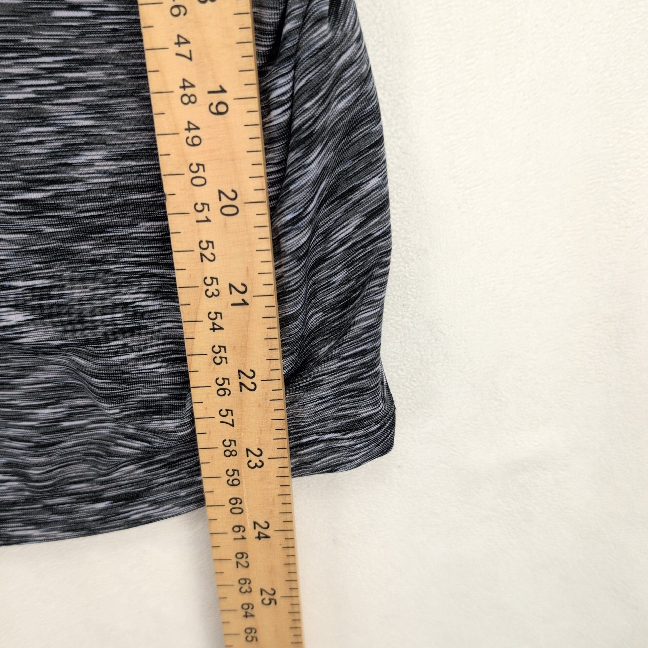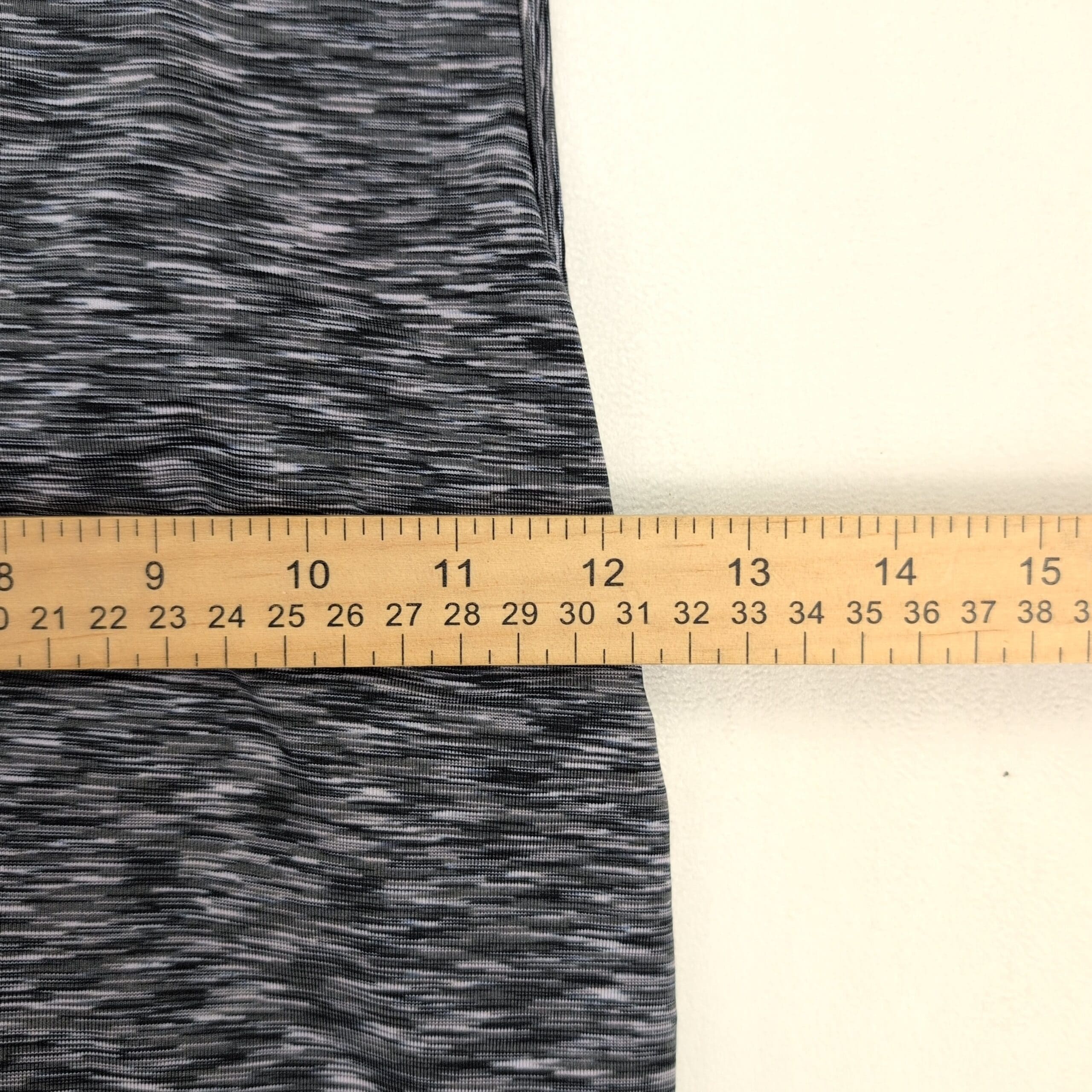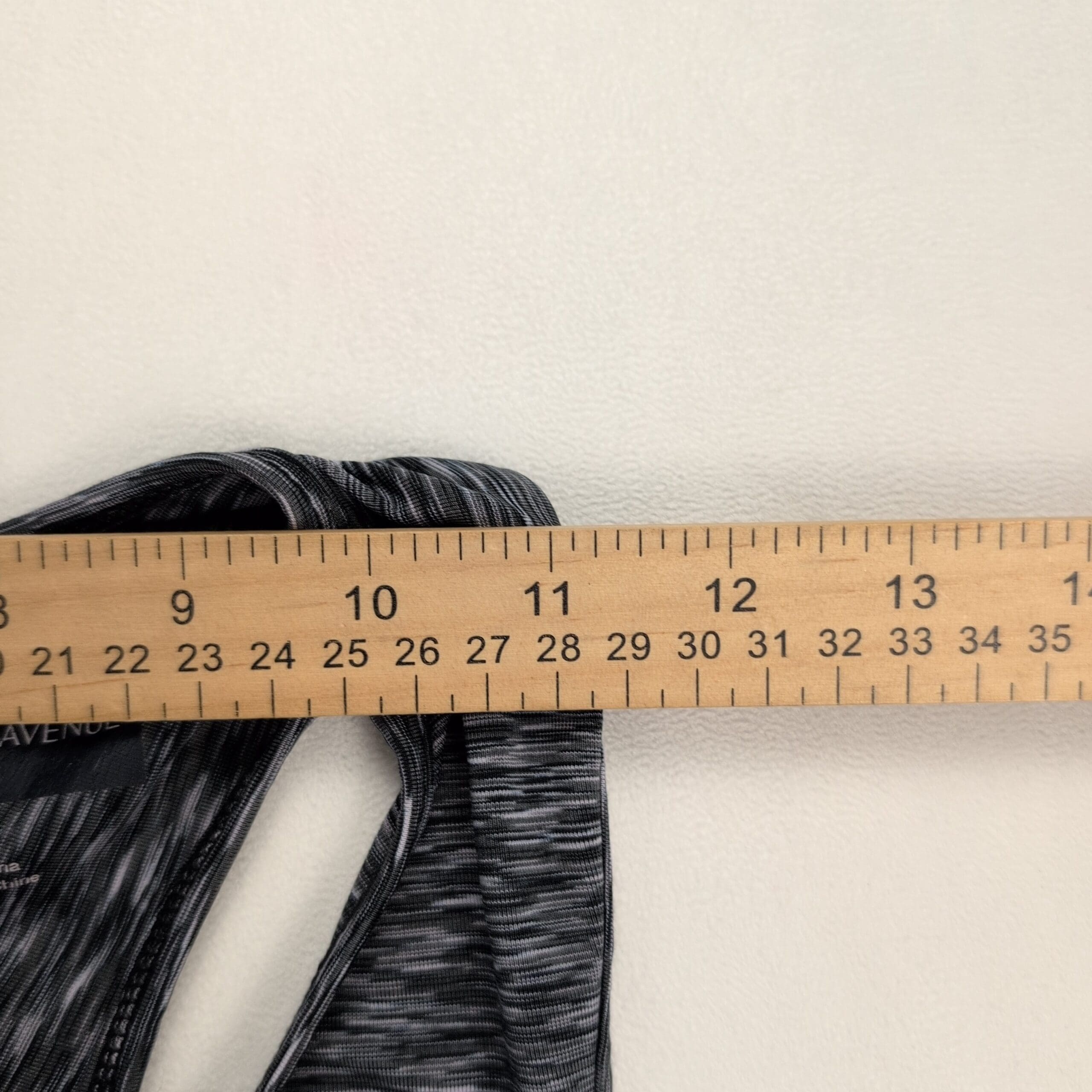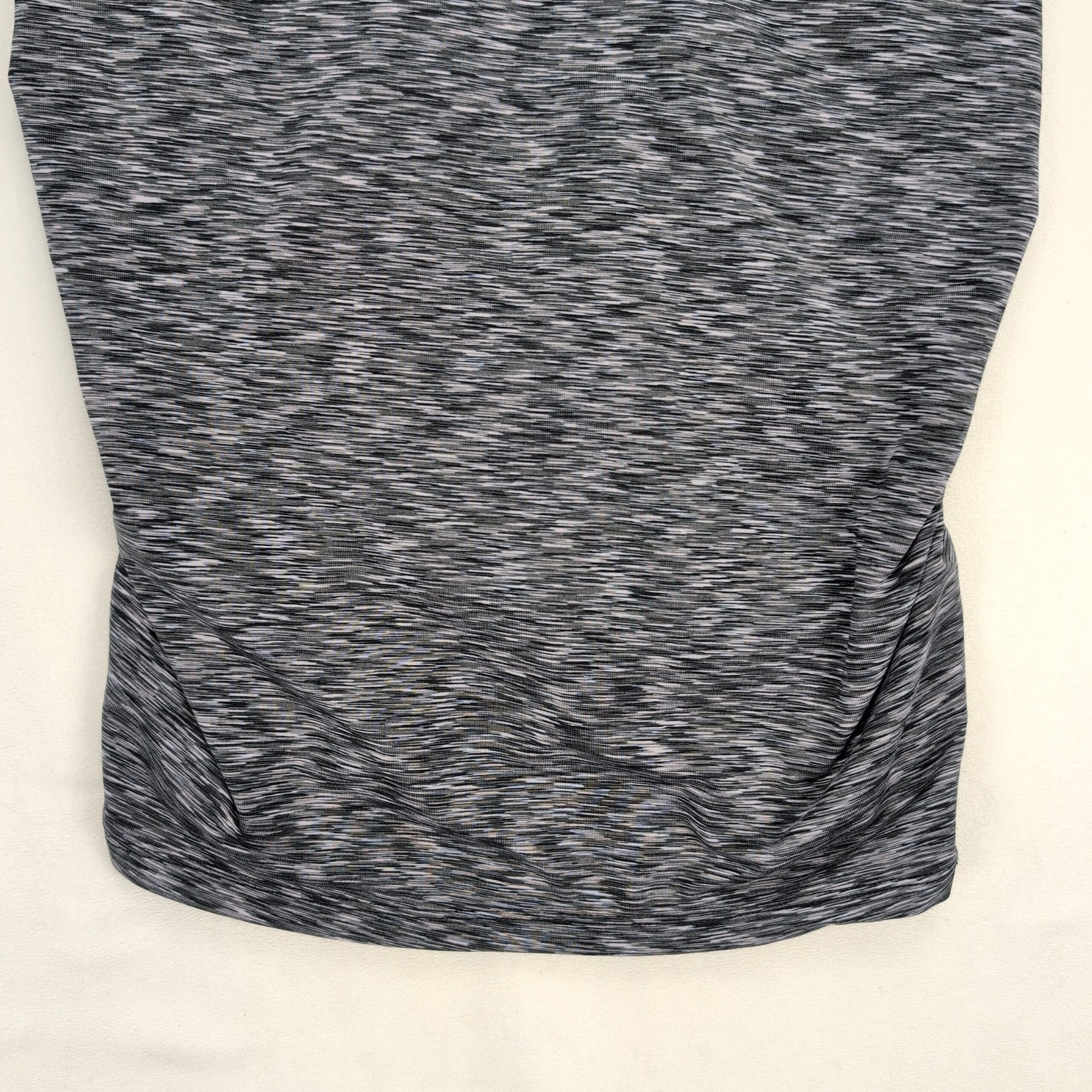 Saks Fifth Avenue women’s racerback tank top in Size S. Gray/black space-dye pattern with a scoop neckline and racerback silhouette for a sporty, streamlined look. Lightweight, stretchy knit with a breathable feel — great for workouts, yoga, or everyday layering. Excellent used condition; free of major rips, tears, stains, or flaws. Typical light wear consistent with normal use.