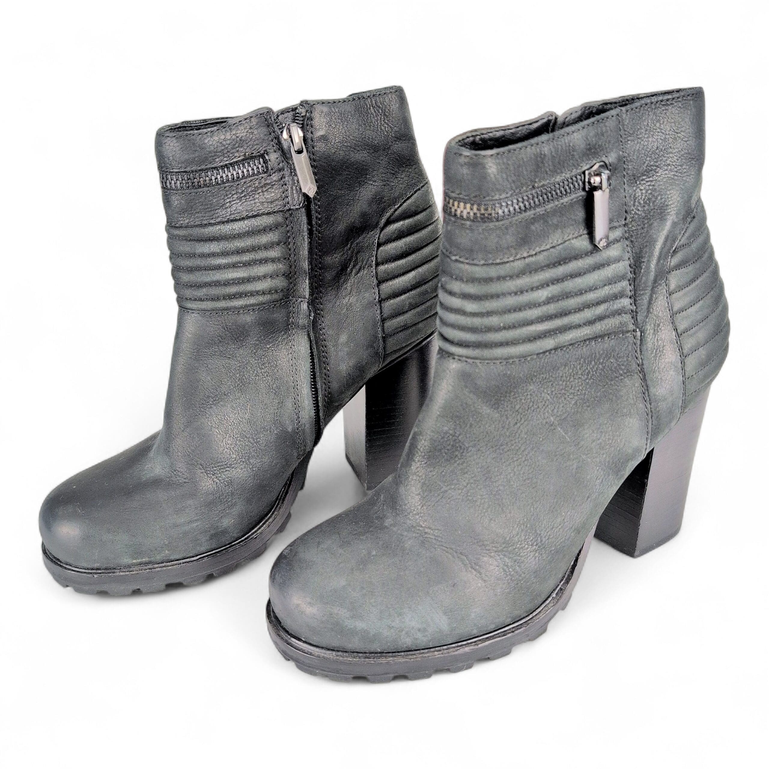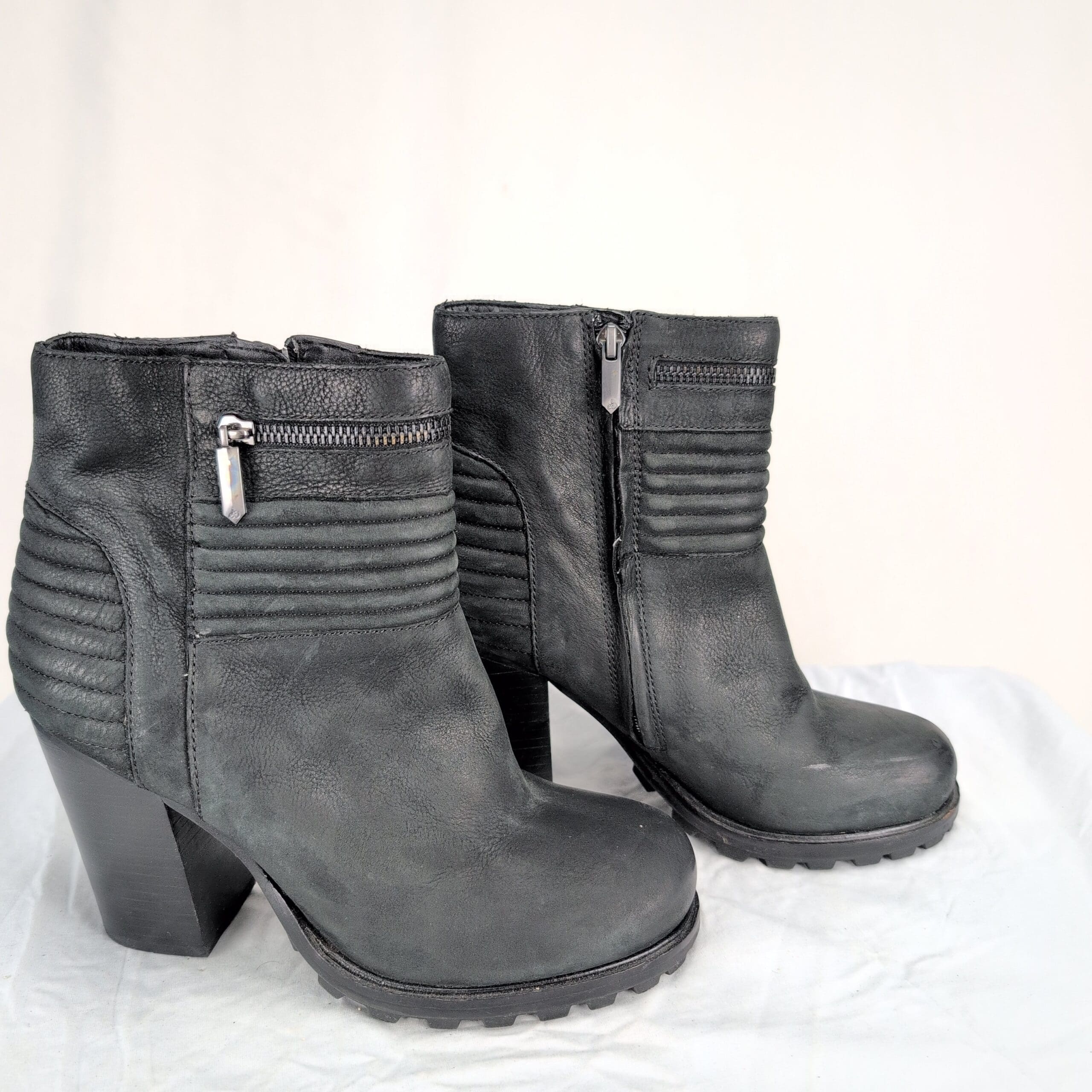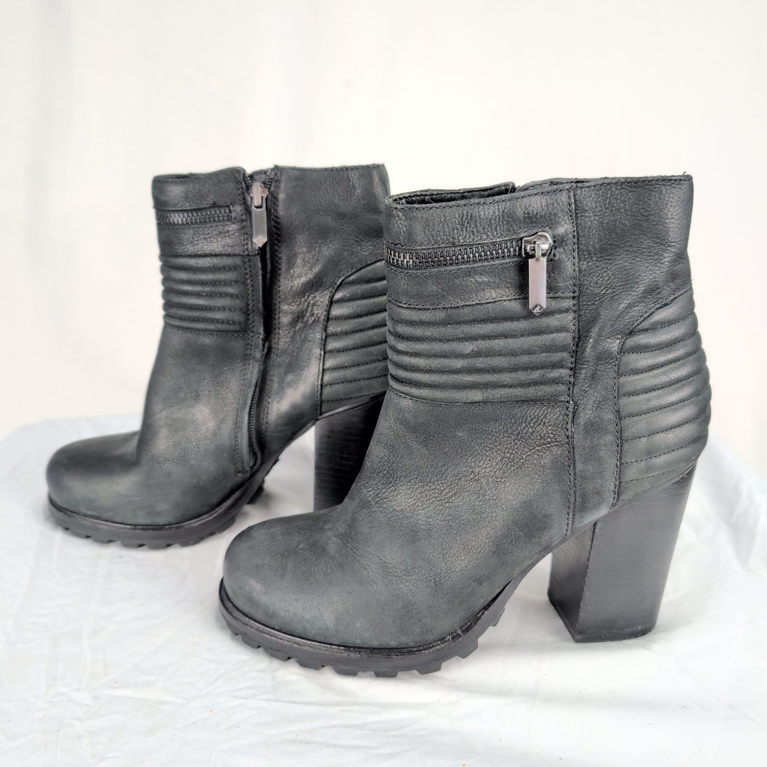 Black leather Sam Edelman ankle boots, women’s size 8.5. Features stacked block heel, side zipper closure, ribbed ankle detailing and lug sole for traction. Leather upper in overall excellent used condition with light scuffs consistent with normal wear. Quality note: minor peeling on the inside lining near the top of the boot. Soles and heels show light wear but remain sturdy — please review photos for details.