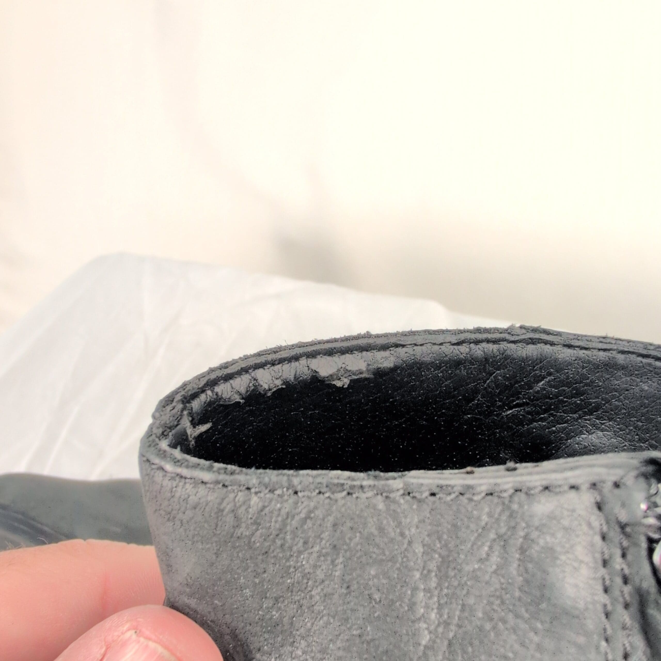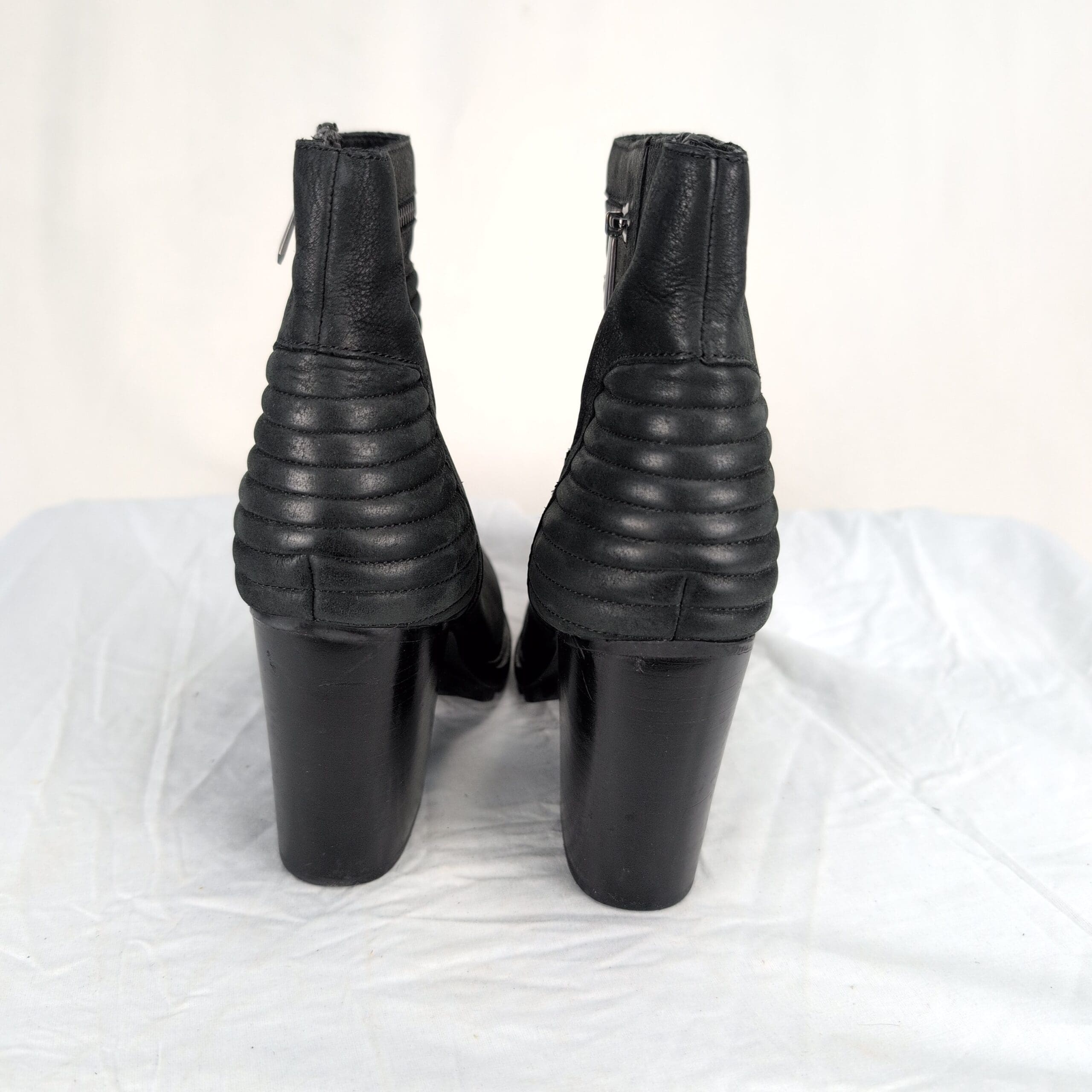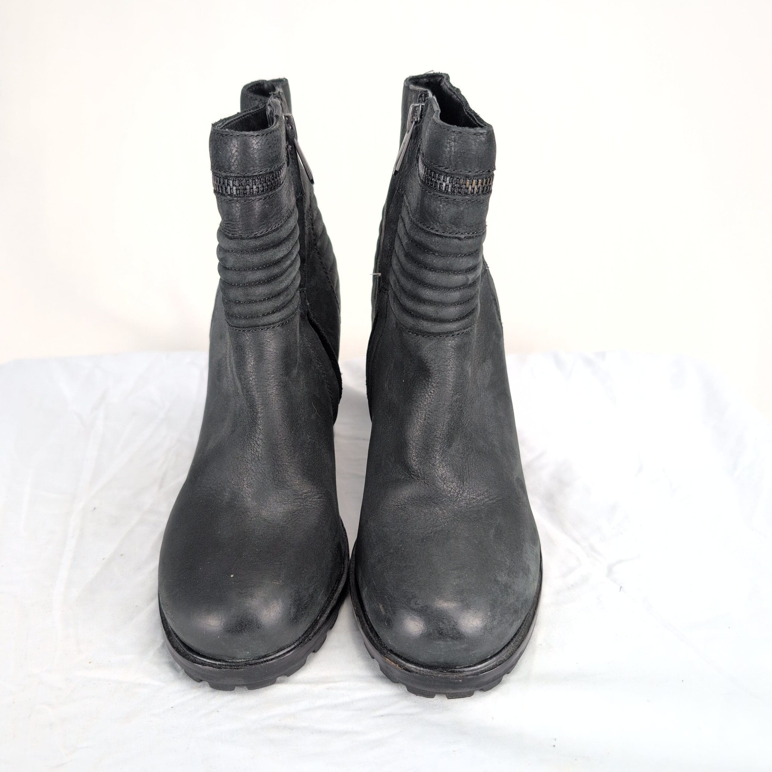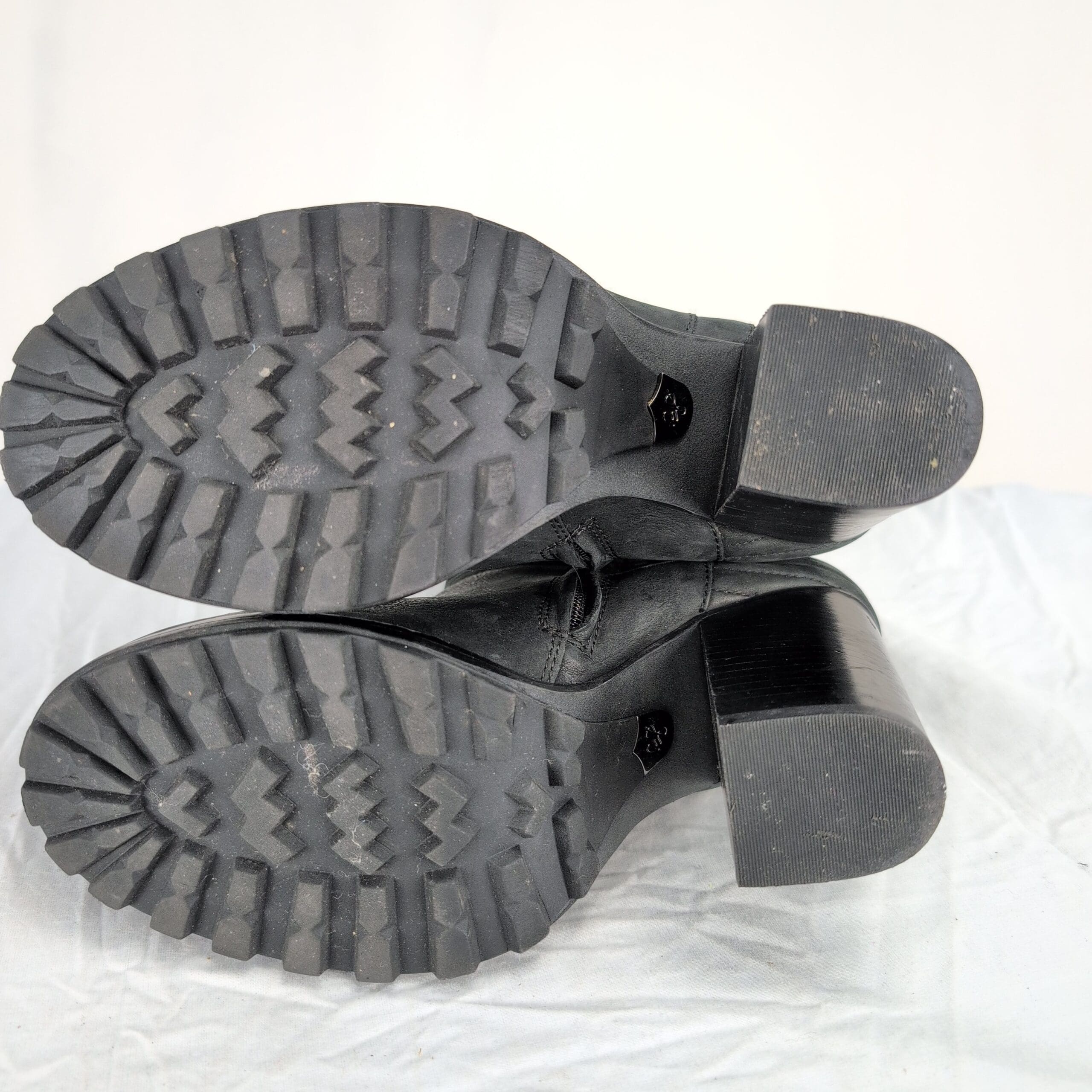 Black leather Sam Edelman ankle boots, women’s size 8.5. Features stacked block heel, side zipper closure, ribbed ankle detailing and lug sole for traction. Leather upper in overall excellent used condition with light scuffs consistent with normal wear. Quality note: minor peeling on the inside lining near the top of the boot. Soles and heels show light wear but remain sturdy — please review photos for details.