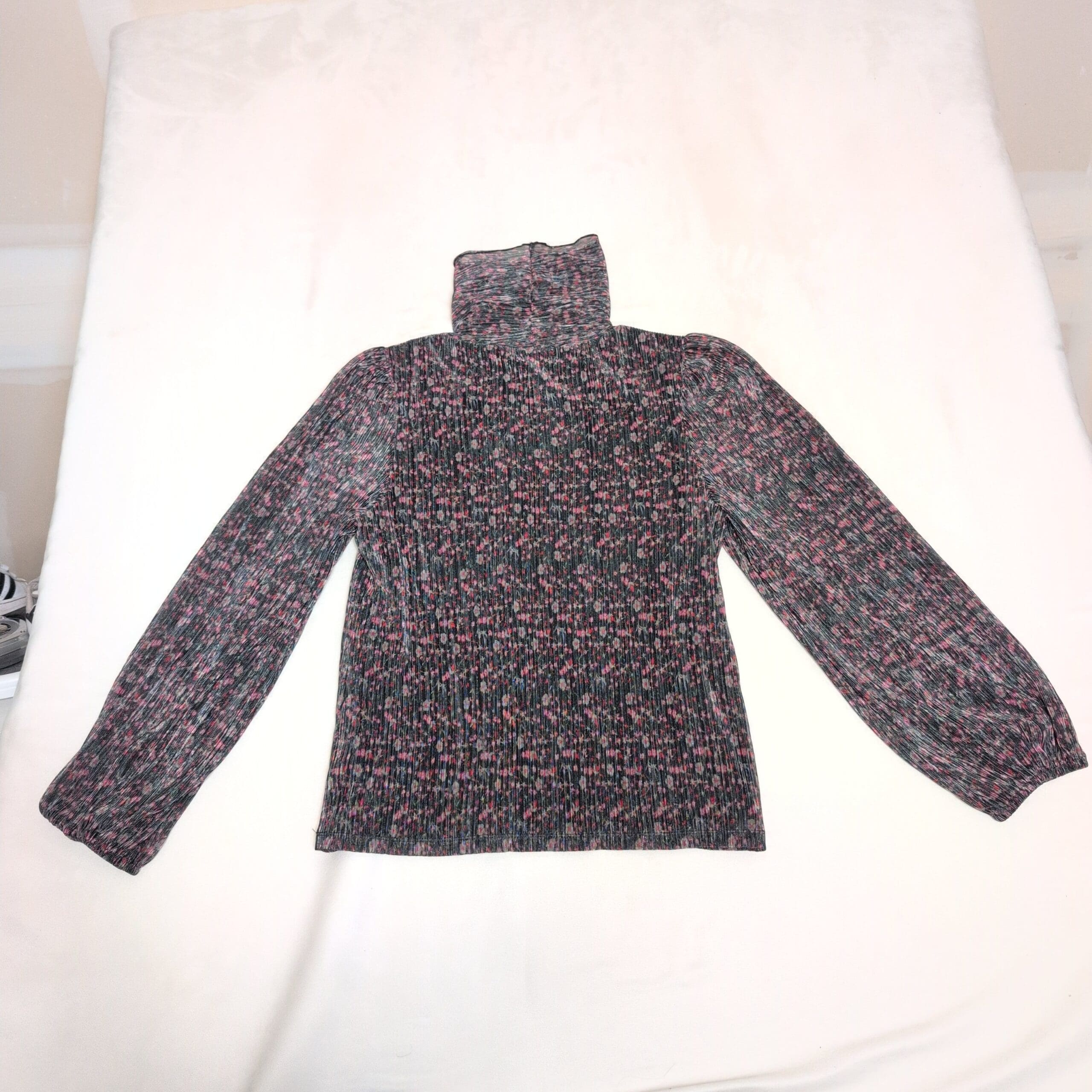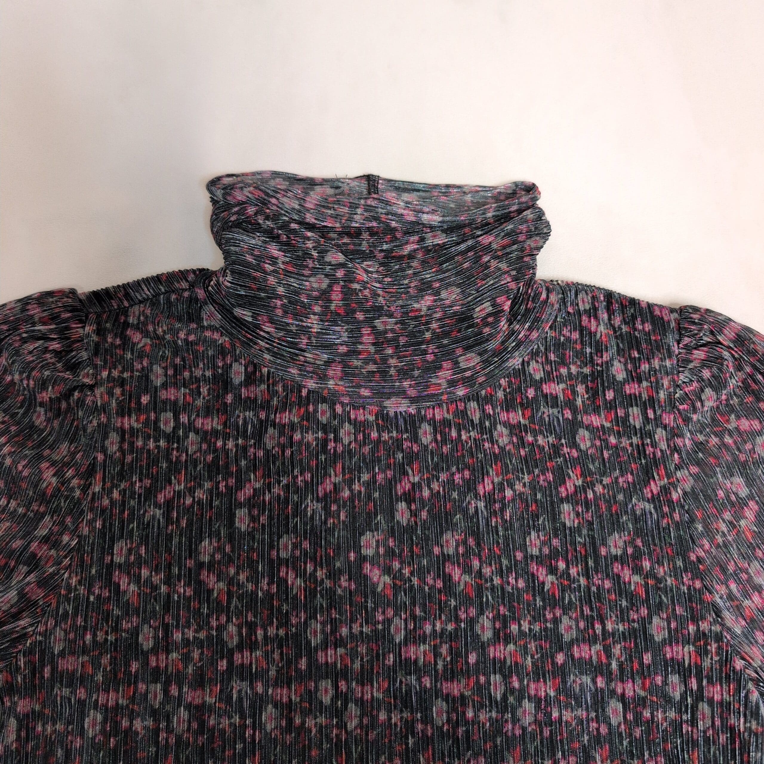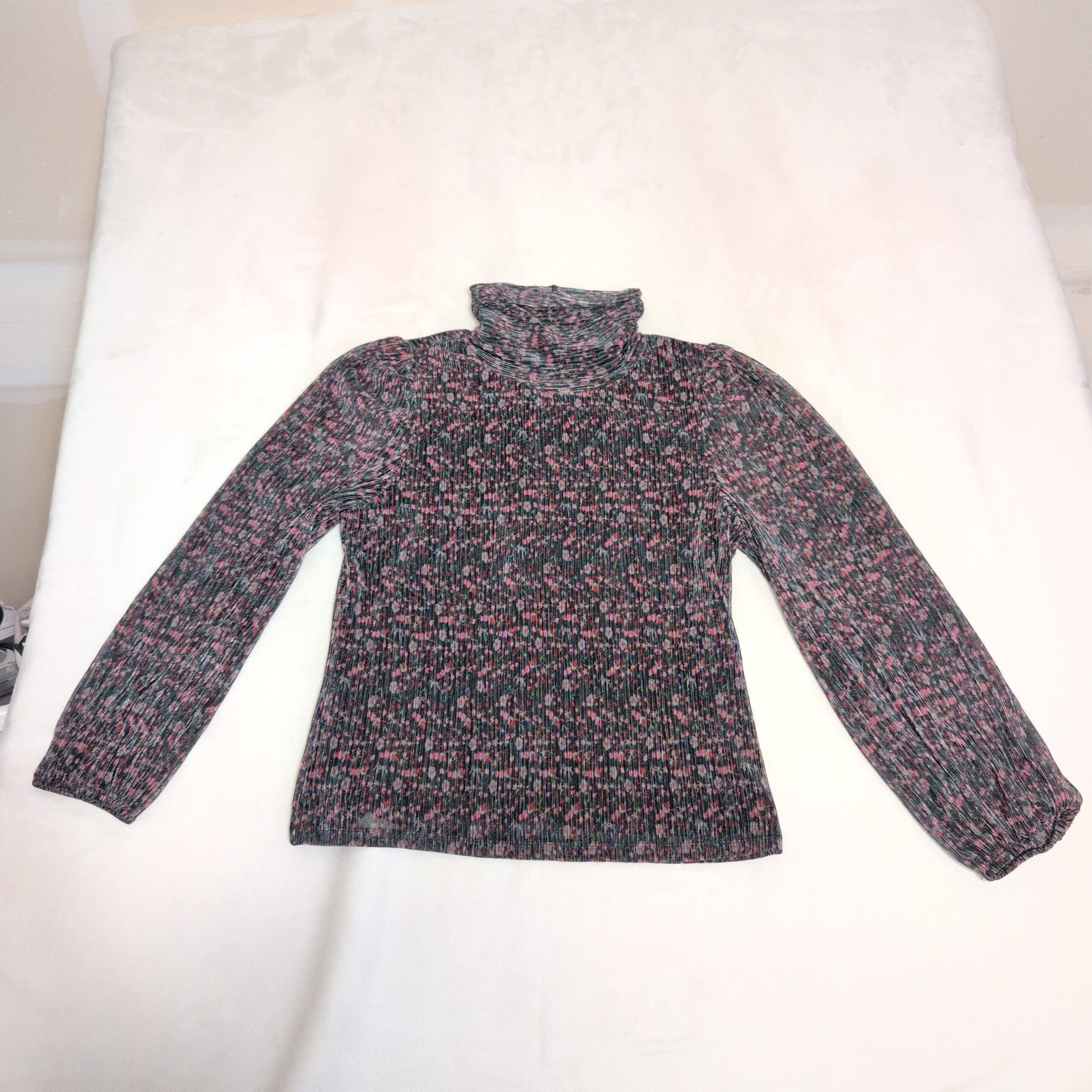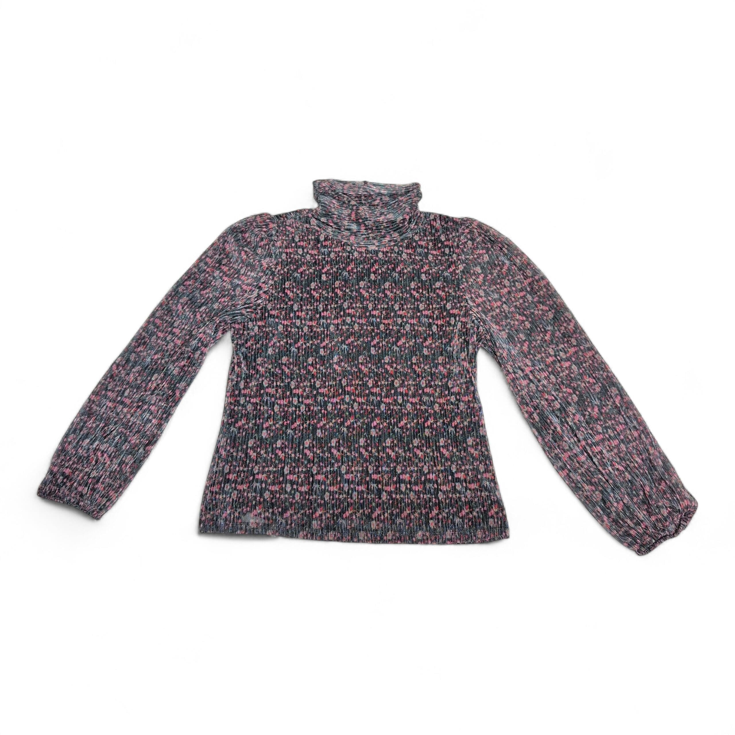 Soft ribbed knit Sanctuary turtleneck in black with pink and teal flecked pattern. Lightweight long-sleeve blouse with a fitted ribbed body and slightly gathered sleeves finished with elastic cuffs. Comfortable turtleneck silhouette—great for layering or wearing on its own. Size XL (standard). Gently used; free of major rips, tears, or stains. Typical light wear consistent with prior use.