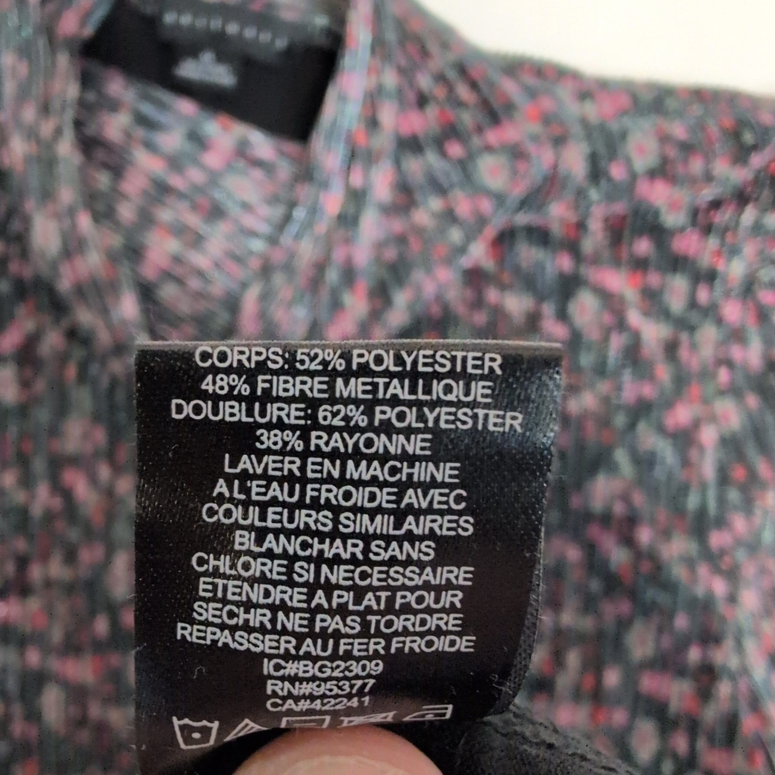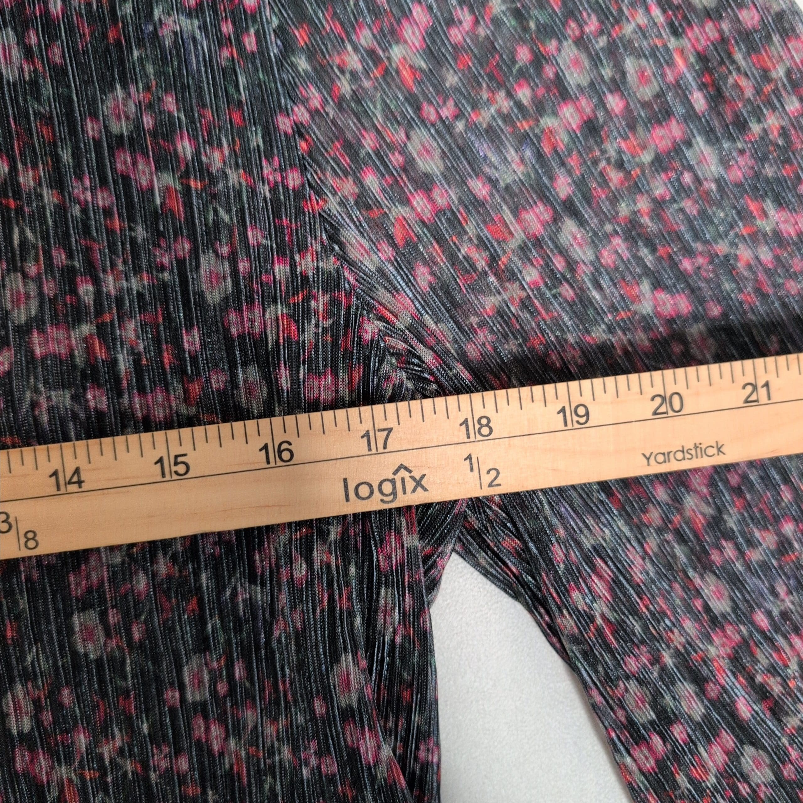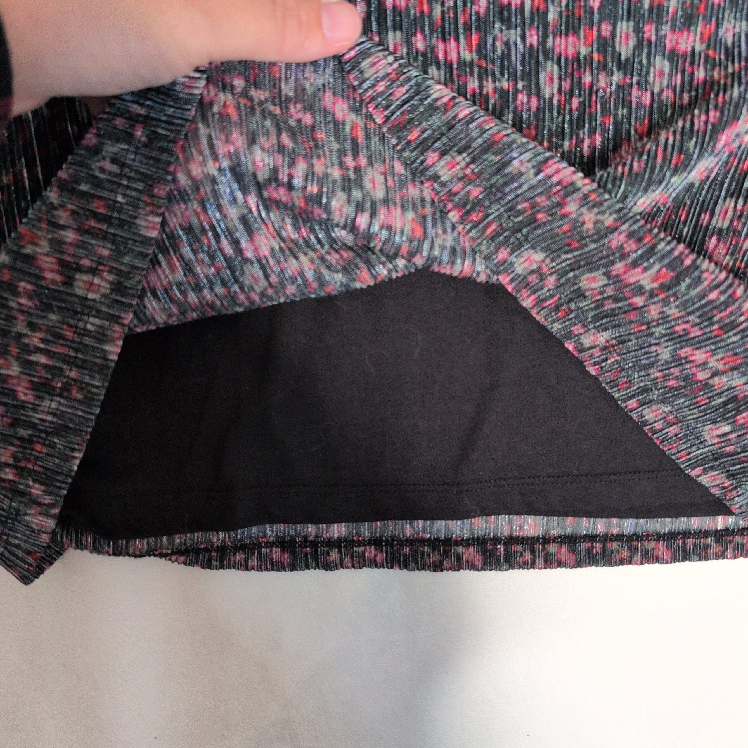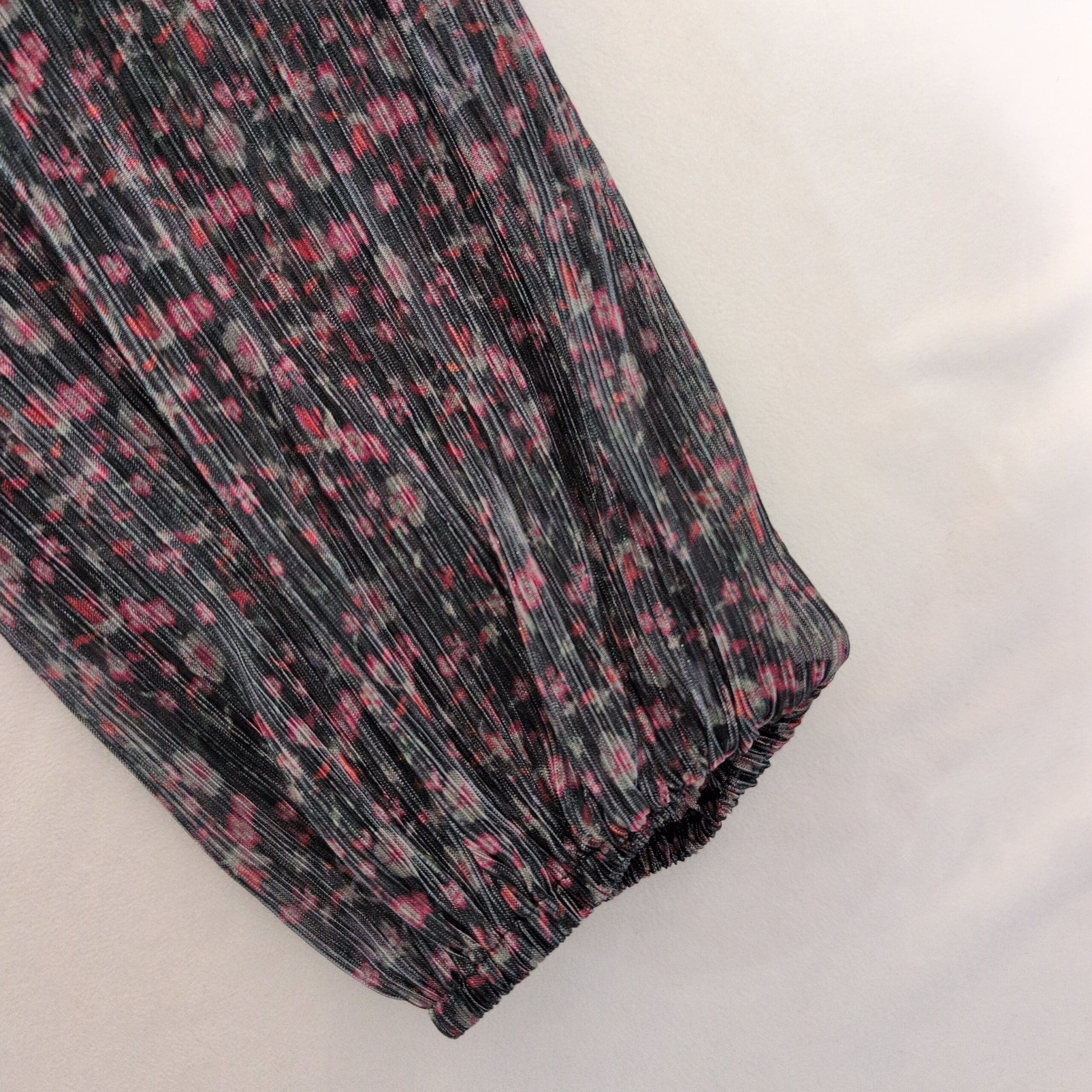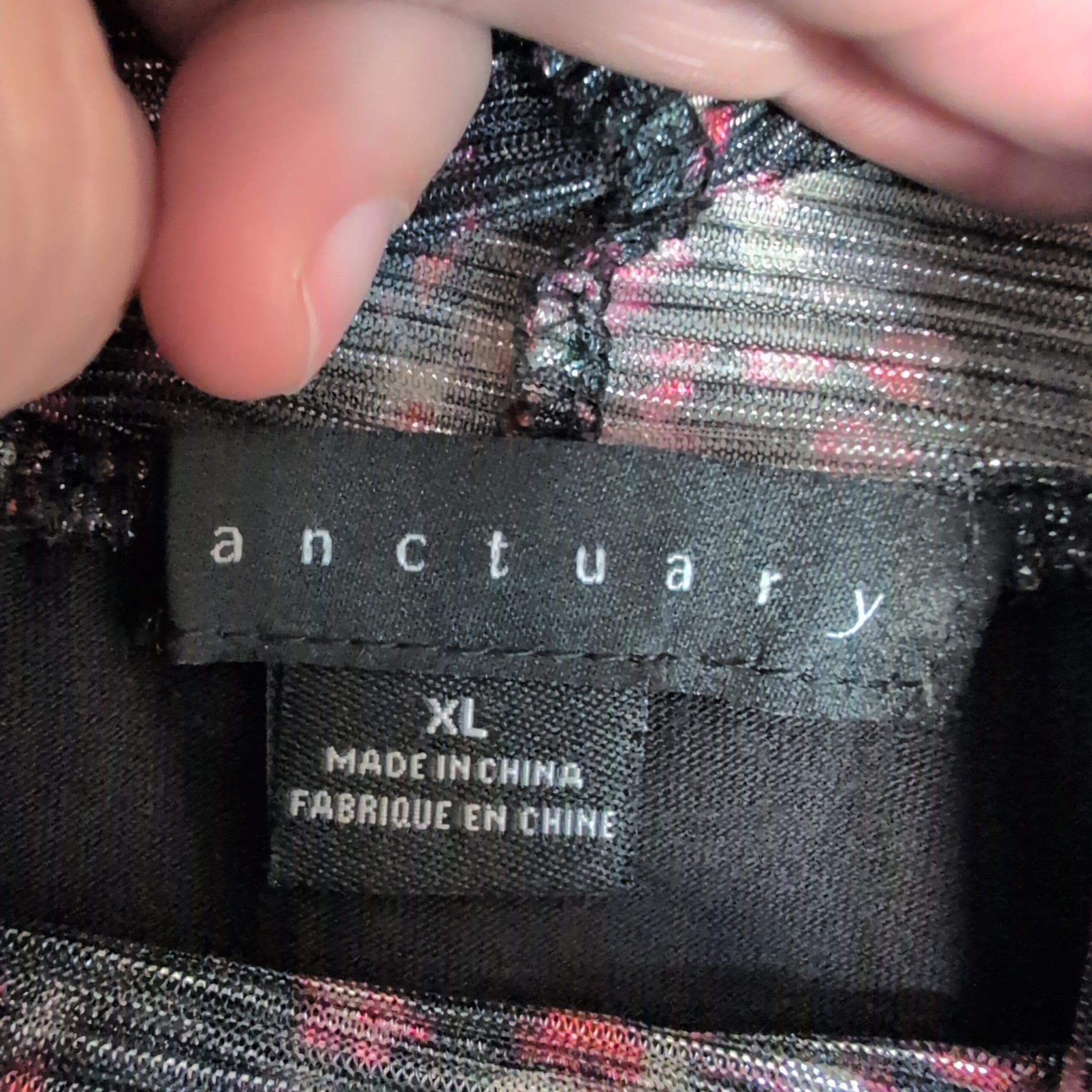 Soft ribbed knit Sanctuary turtleneck in black with pink and teal flecked pattern. Lightweight long-sleeve blouse with a fitted ribbed body and slightly gathered sleeves finished with elastic cuffs. Comfortable turtleneck silhouette—great for layering or wearing on its own. Size XL (standard). Gently used; free of major rips, tears, or stains. Typical light wear consistent with prior use.