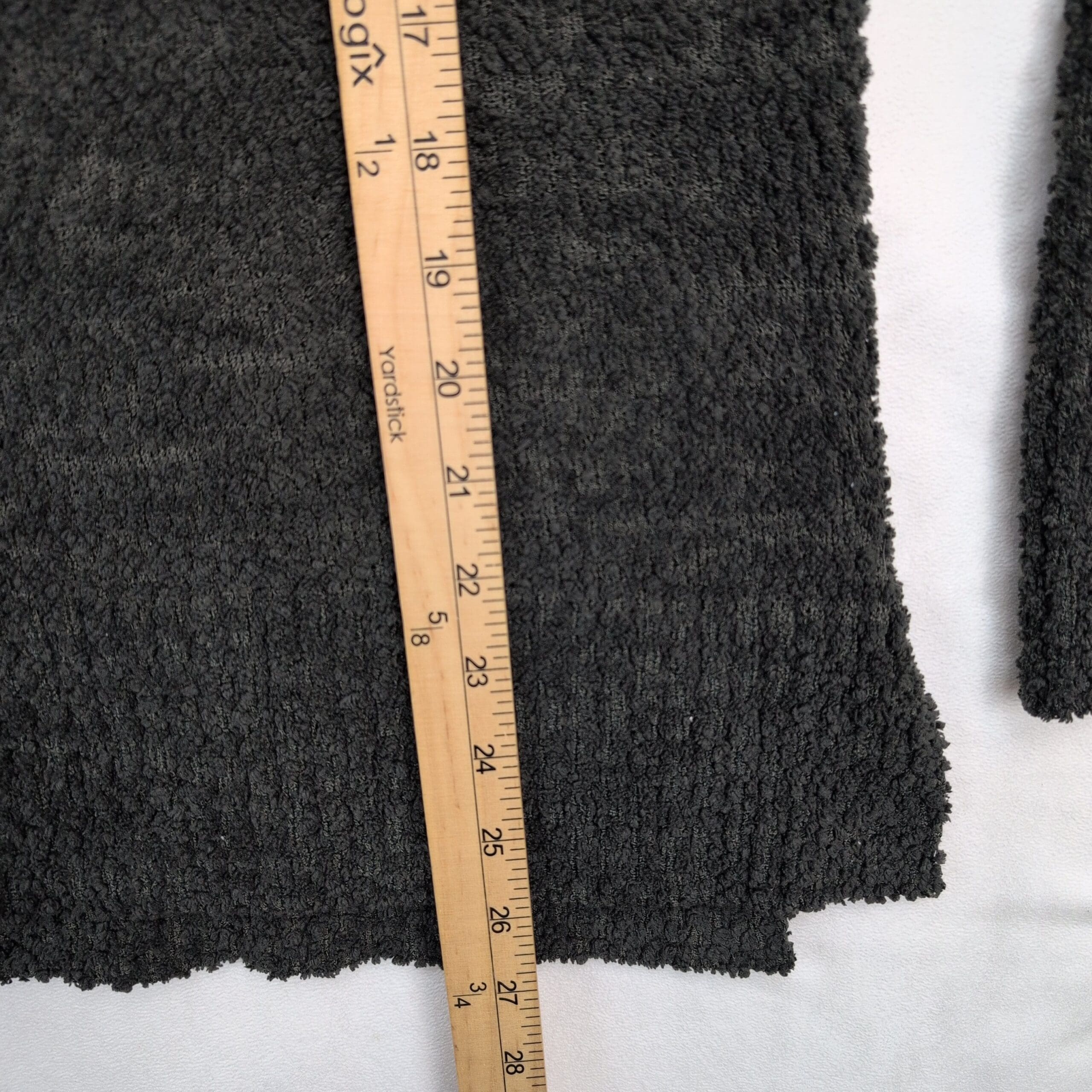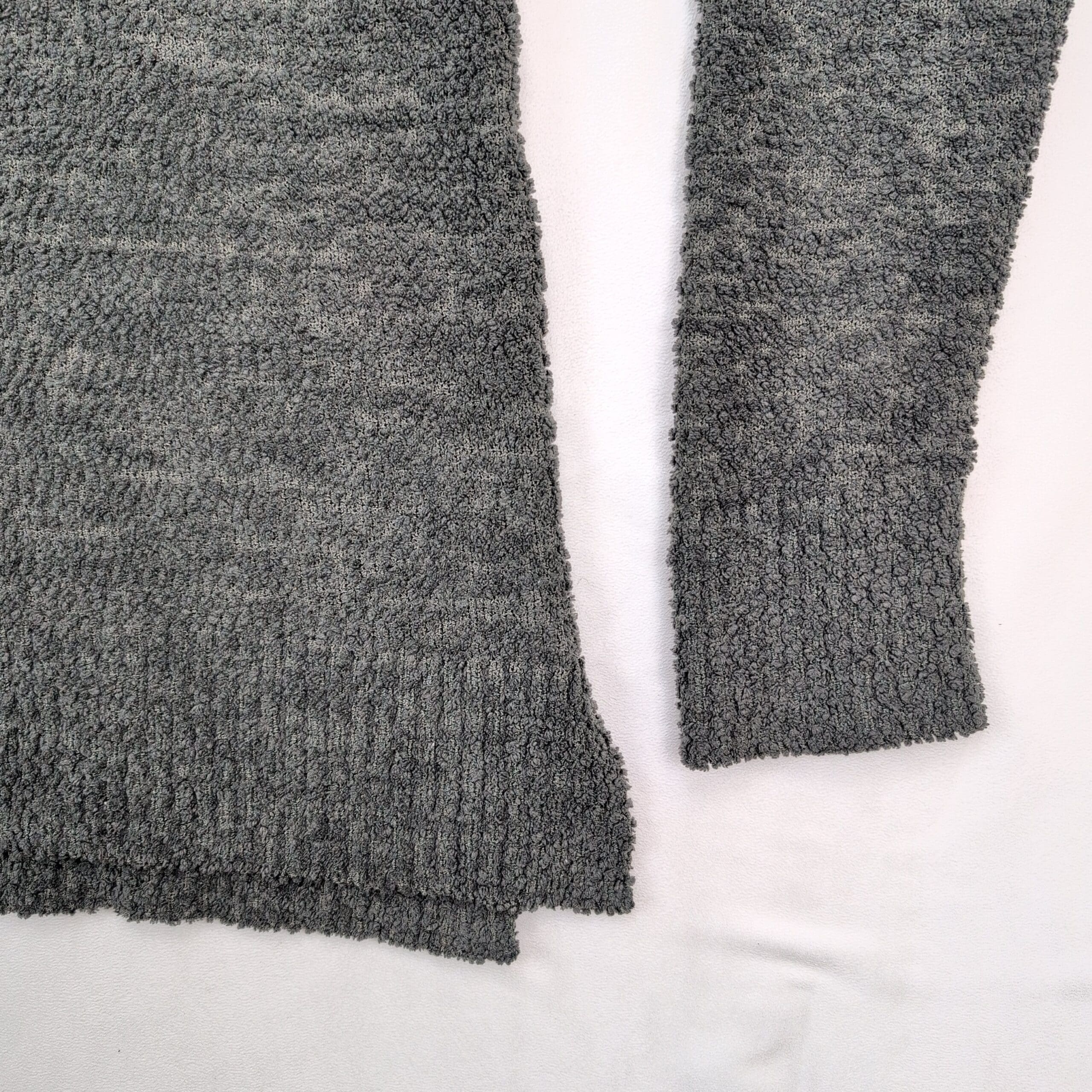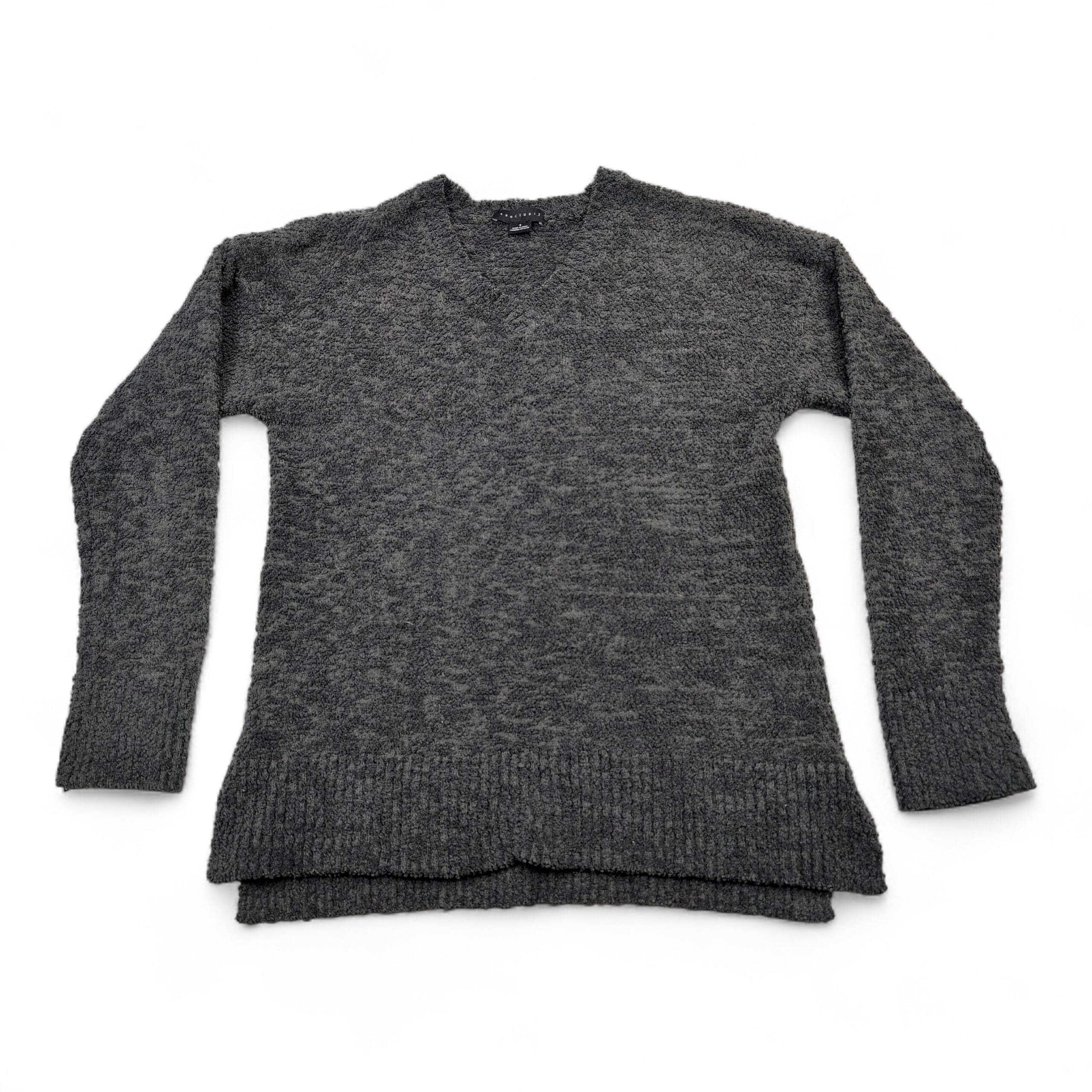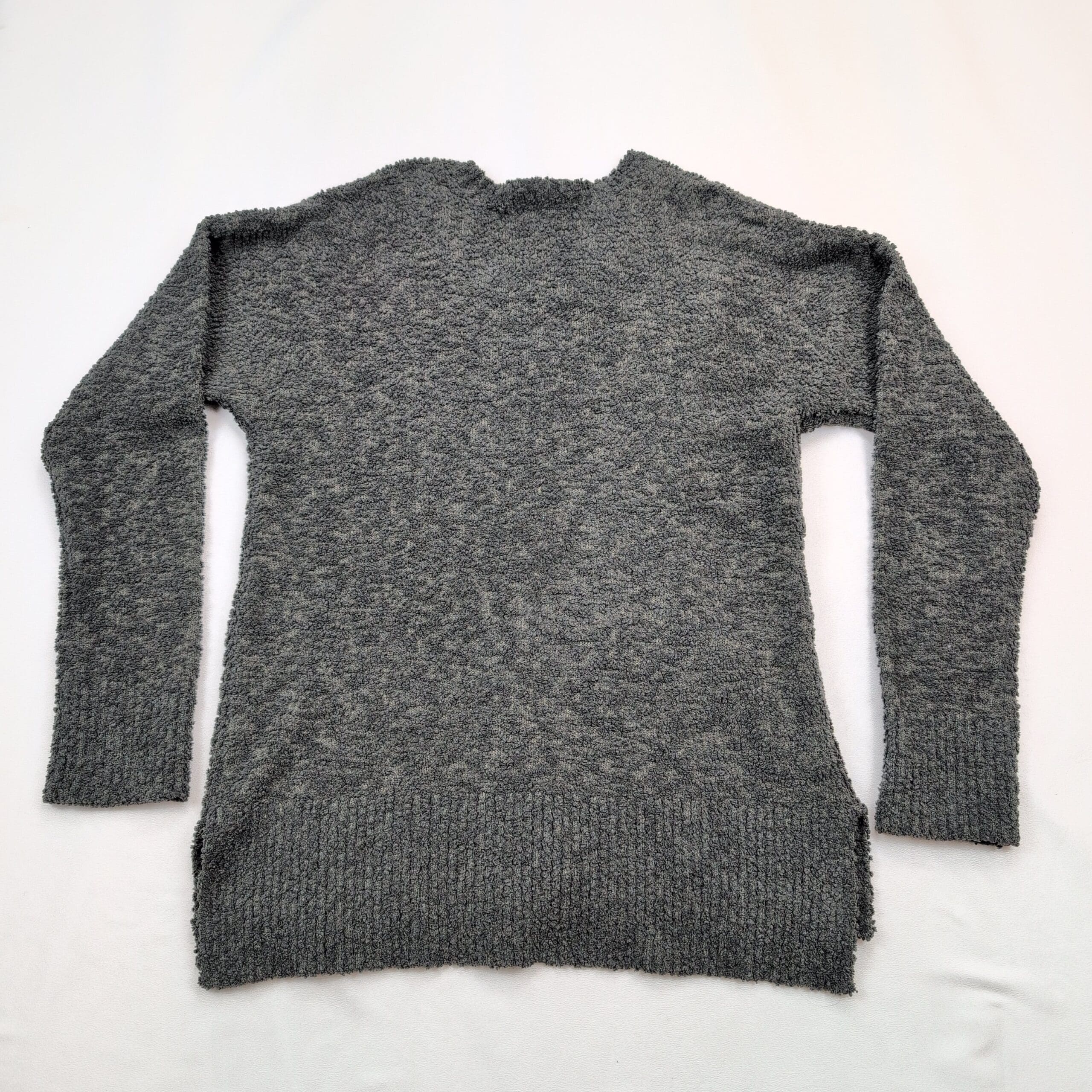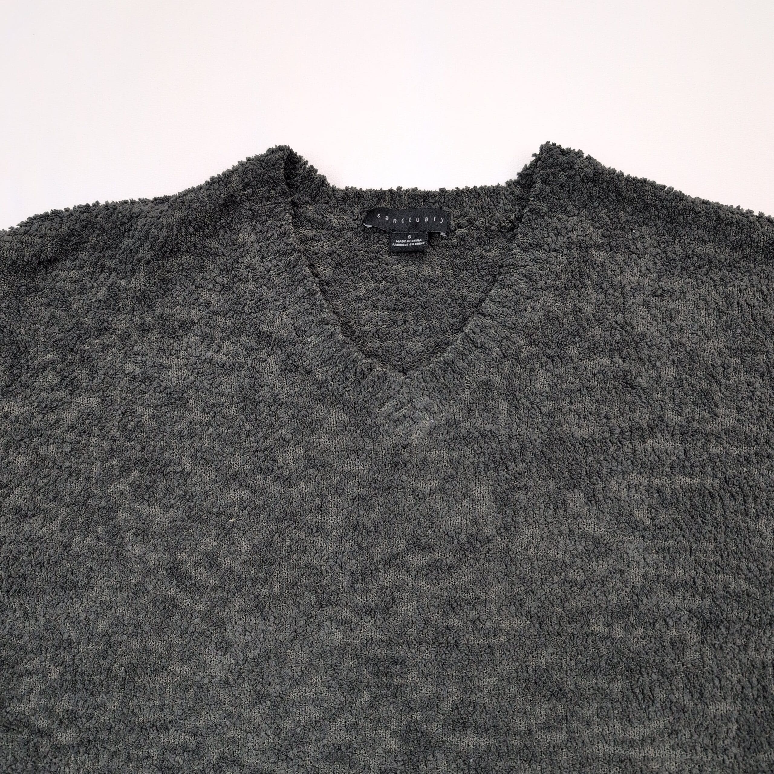 Sanctuary women’s V-neck sweater in charcoal/dark gray, size S. Soft textured knit with a relaxed silhouette, long sleeves, ribbed cuffs and hem, and a subtle high-low split hem for easy layering. Ideal for everyday wear and transitional seasons.