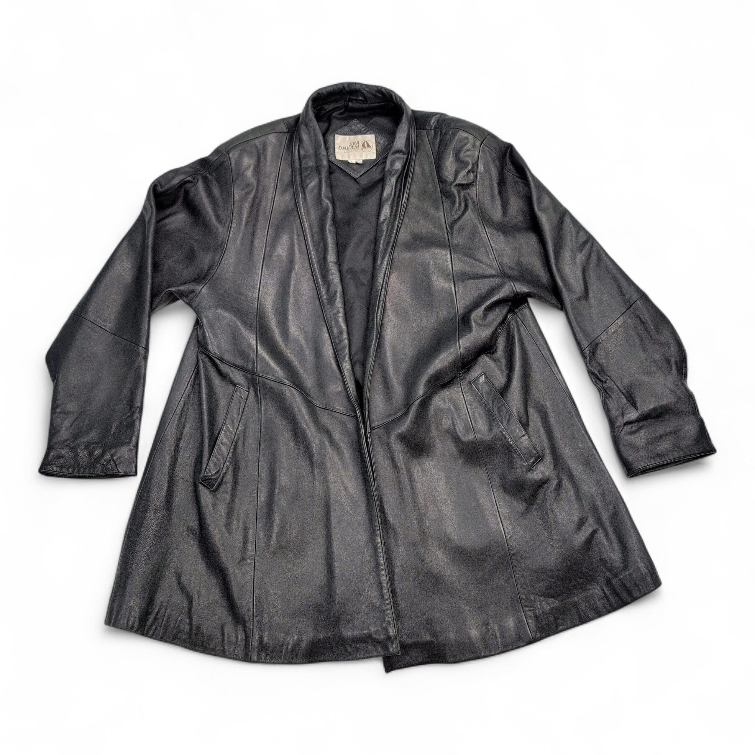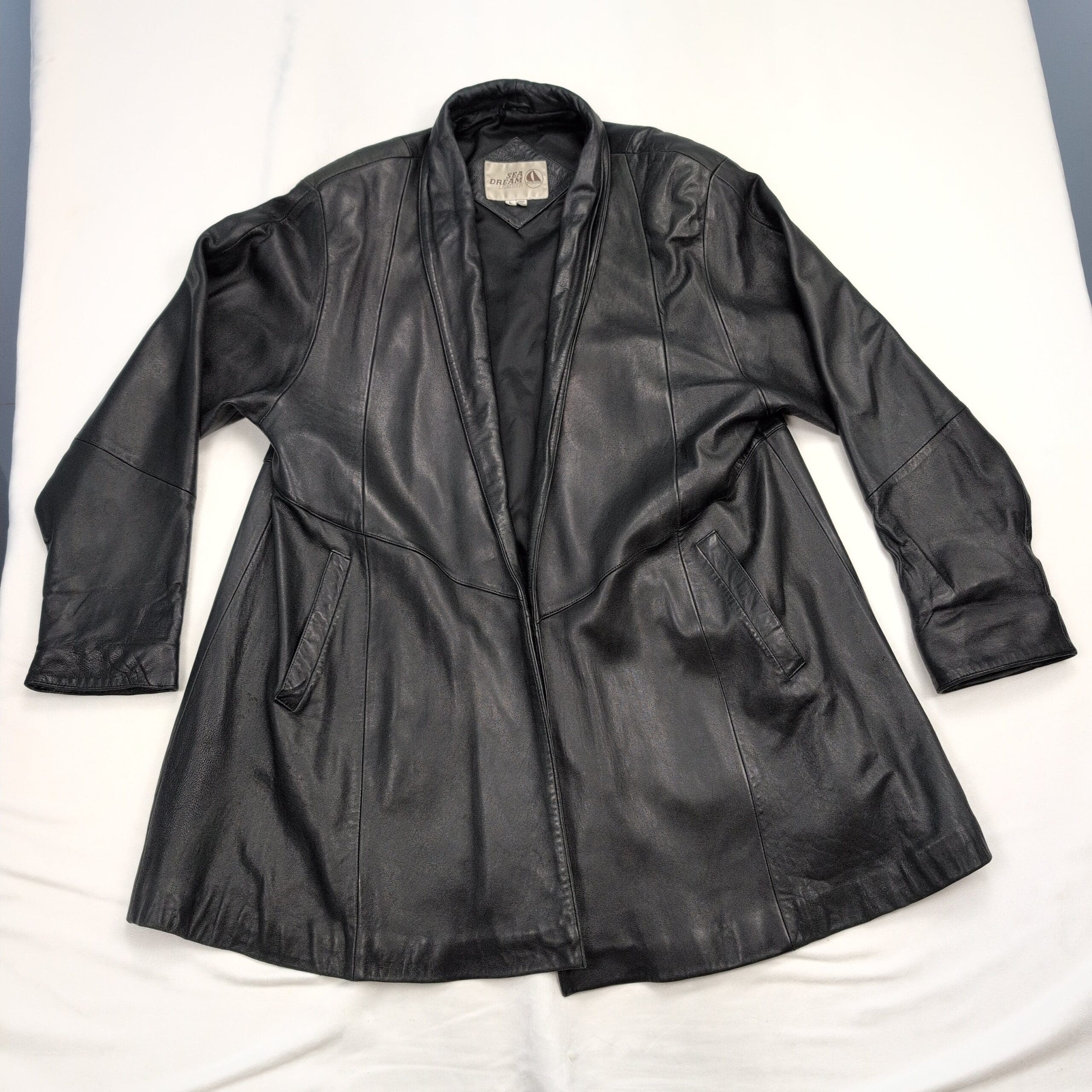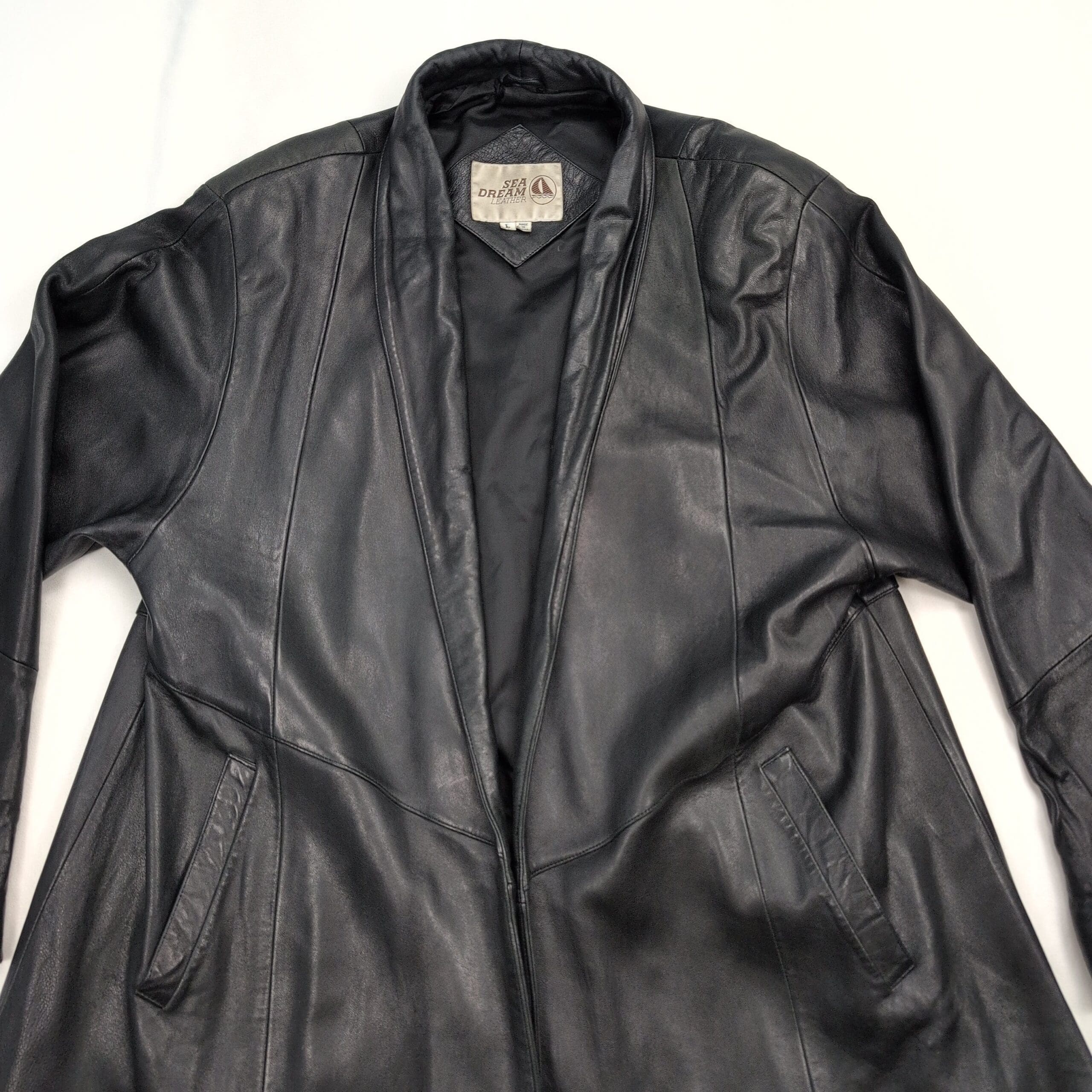 Sea Dreams genuine black leather long jacket — Women’s size L. Classic open-front silhouette with a shawl-style collar and two front welt pockets. Smooth, supple leather exterior with a flattering A-line drape; great for layering over sweaters or dresses.
