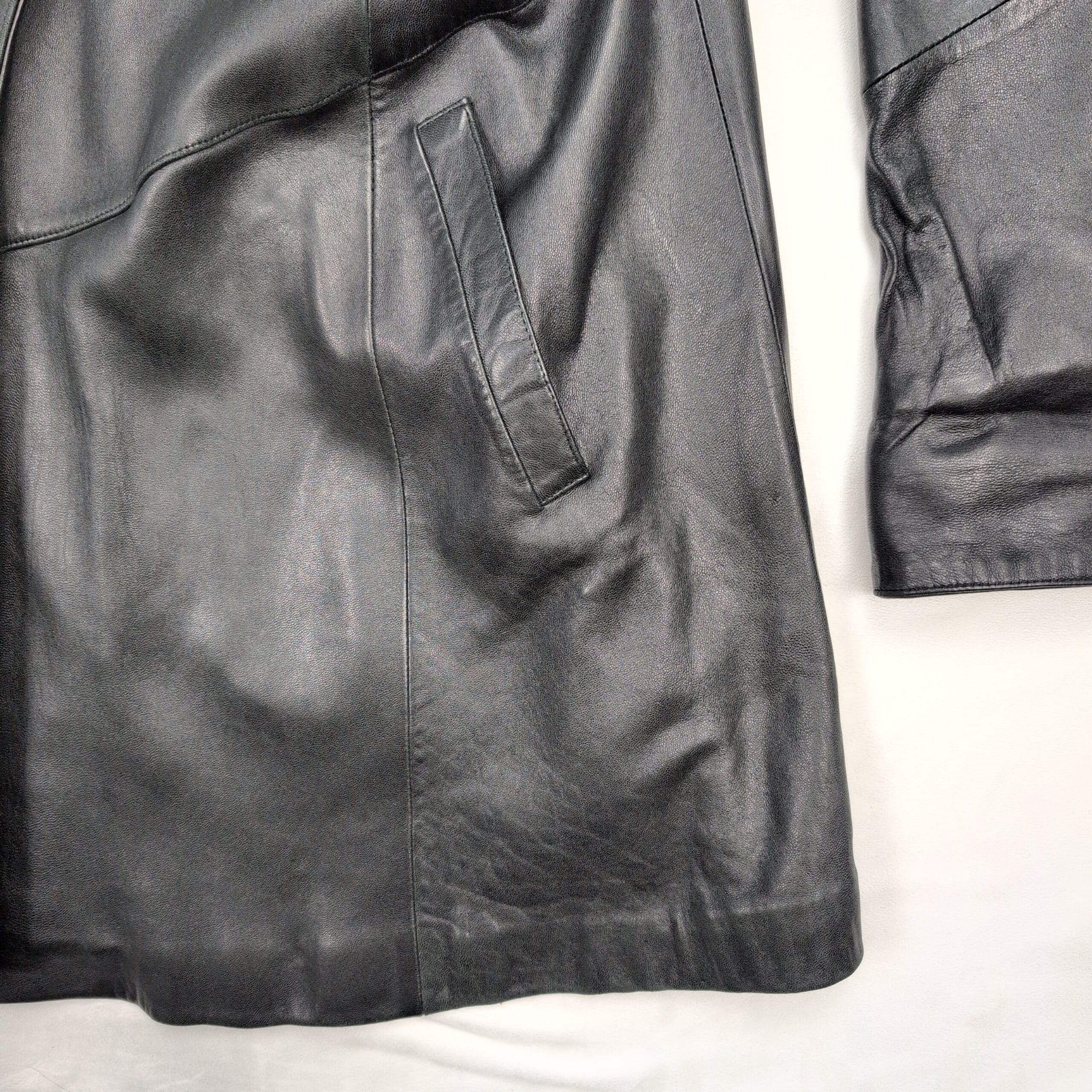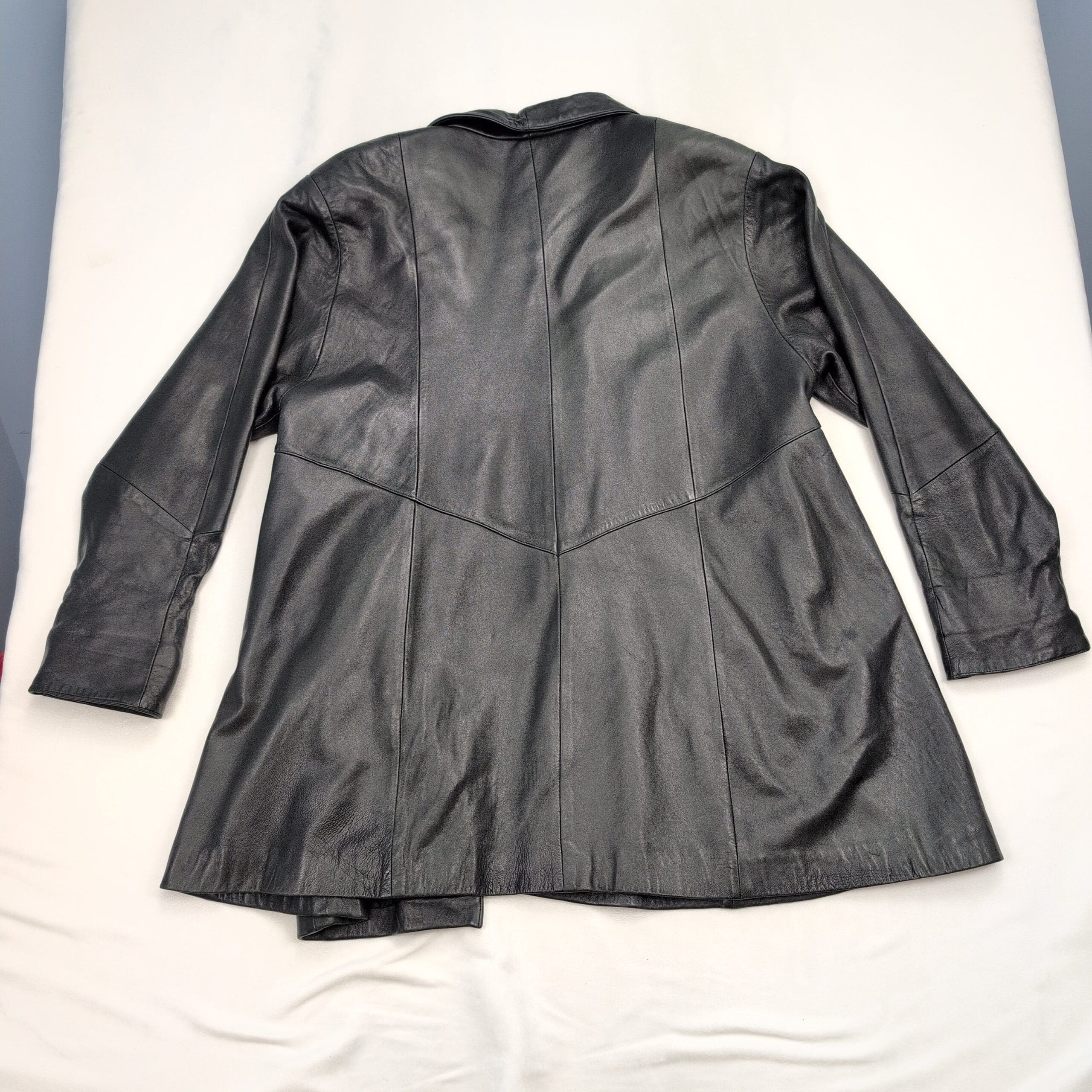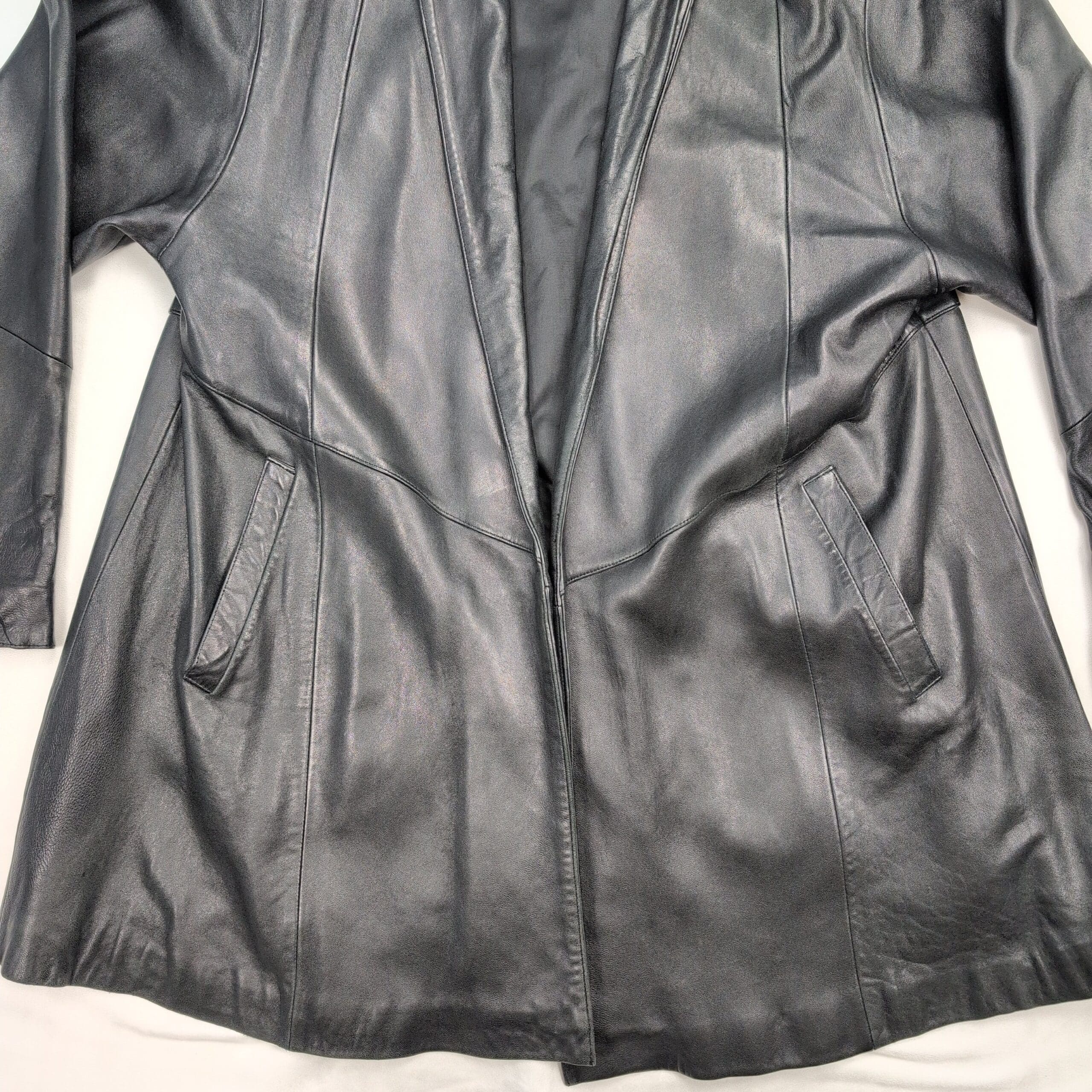 Sea Dreams genuine black leather long jacket — Women’s size L. Classic open-front silhouette with a shawl-style collar and two front welt pockets. Smooth, supple leather exterior with a flattering A-line drape; great for layering over sweaters or dresses.