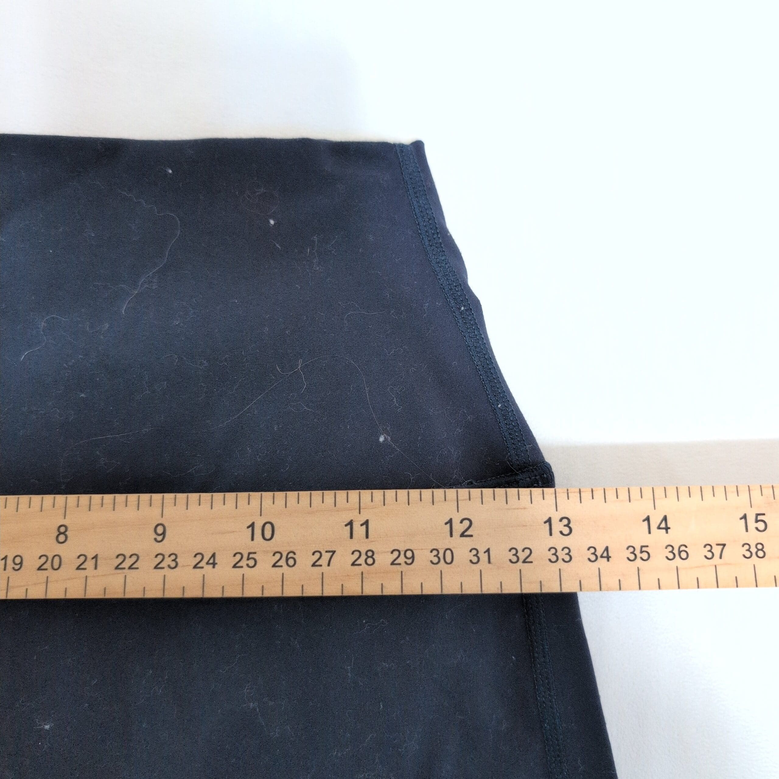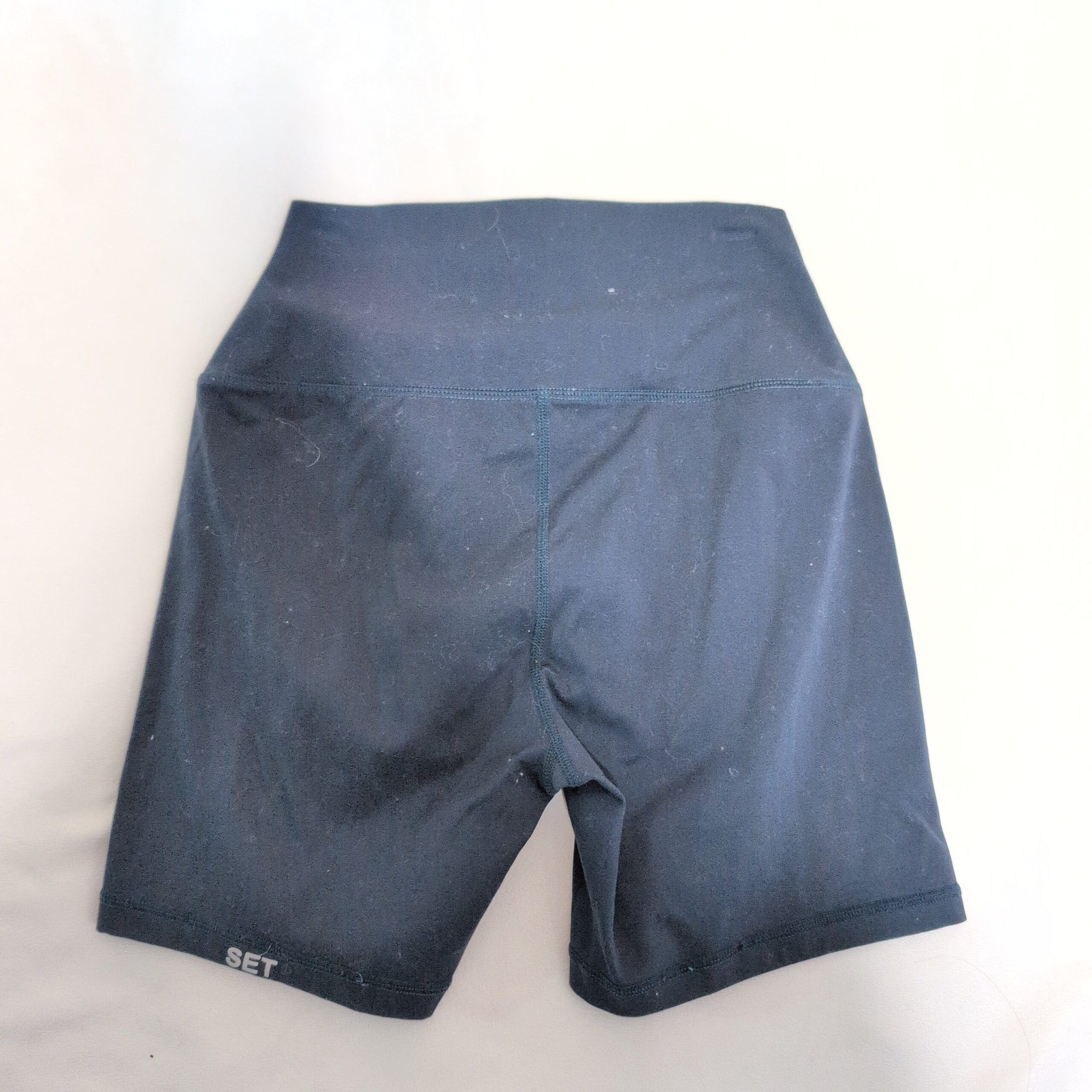 Black high-waisted athletic shorts by Set in women’s size S. Stretchy, supportive waistband and smooth, figure-hugging knit offer comfortable coverage for workouts, yoga, running, or everyday athleisure. Mid-thigh length with flatlock seams and clean construction; no visible logos. Pre-loved condition: gently used with light surface lint and minor pilling consistent with normal wear — see photos for details. Machine wash cold and tumble low or lay flat to dry.