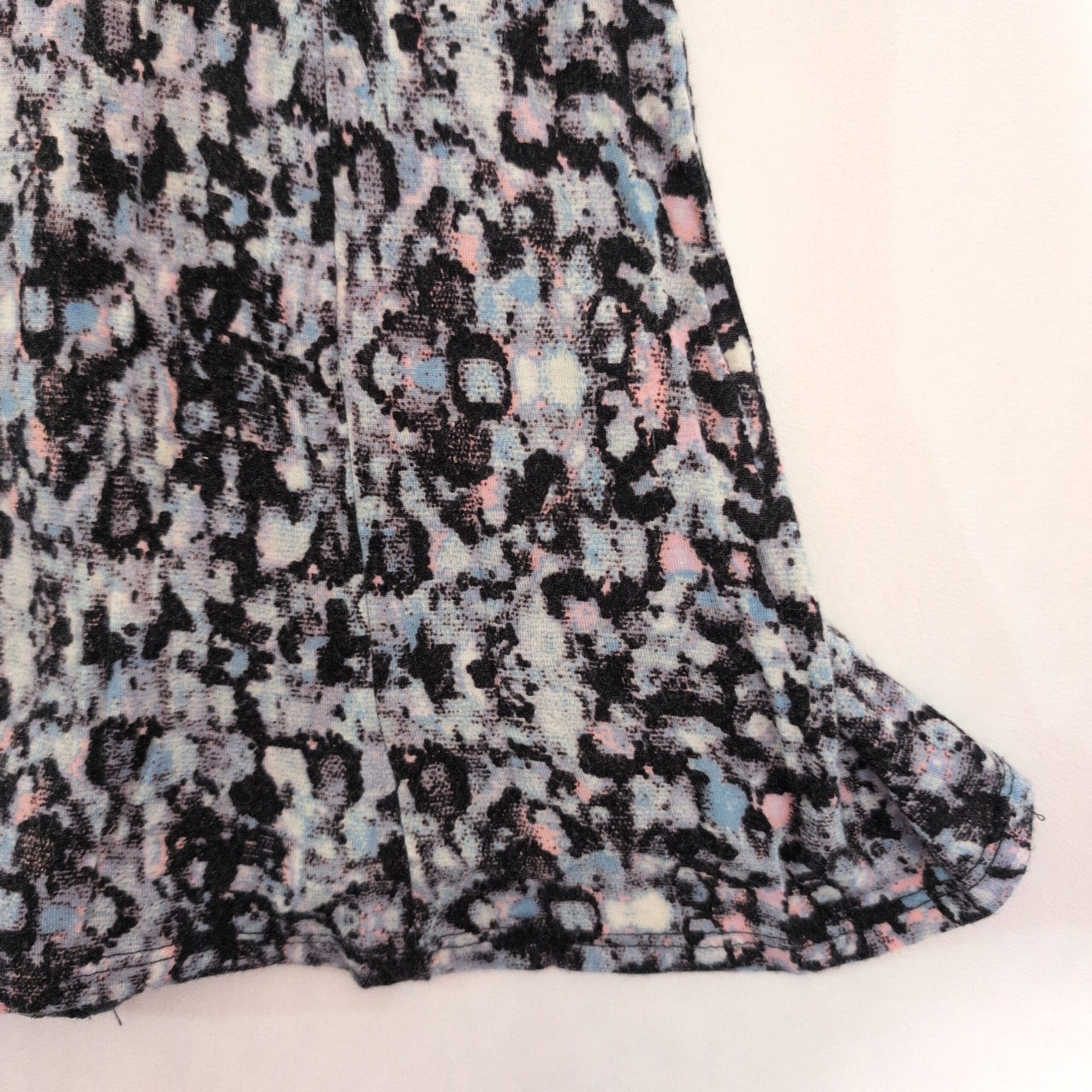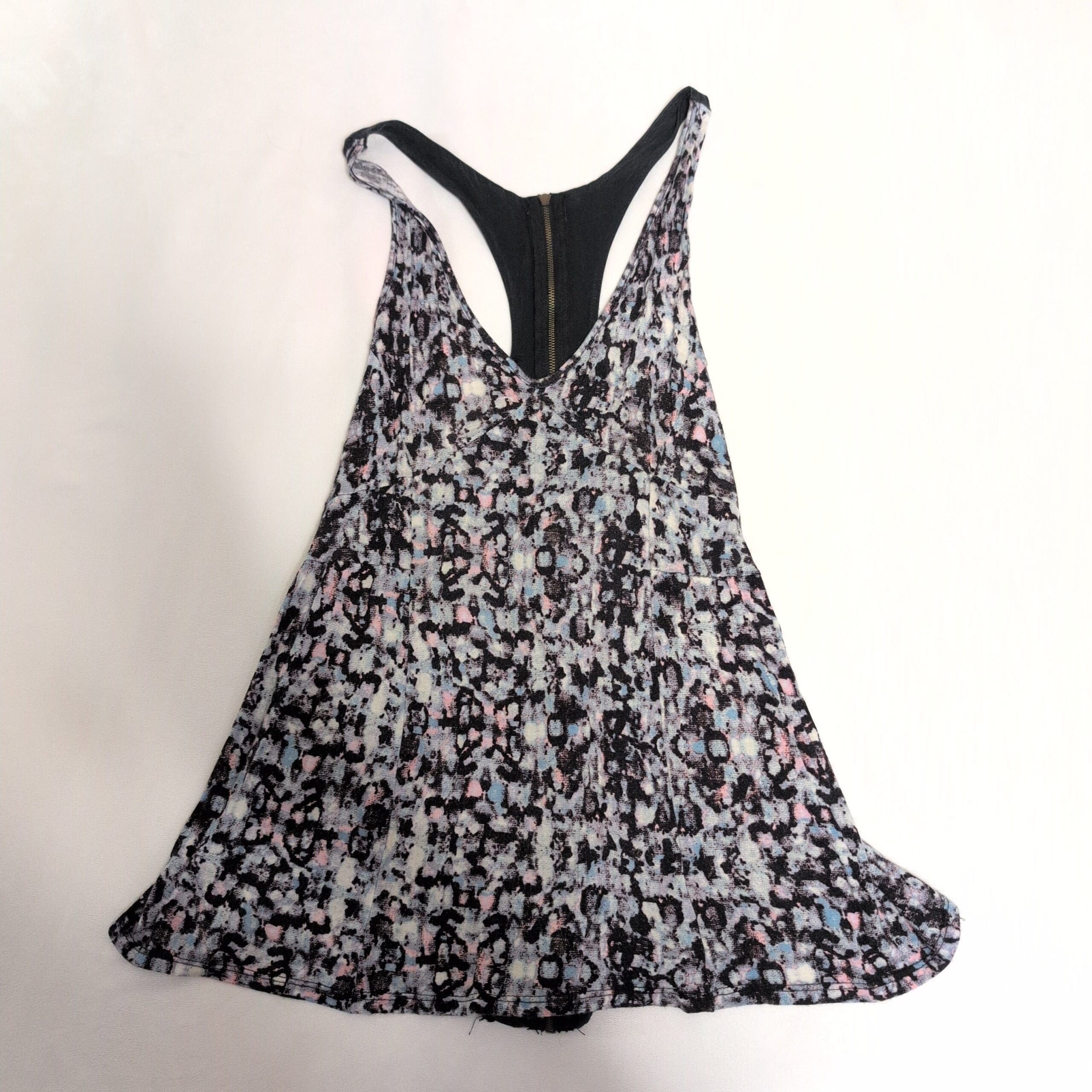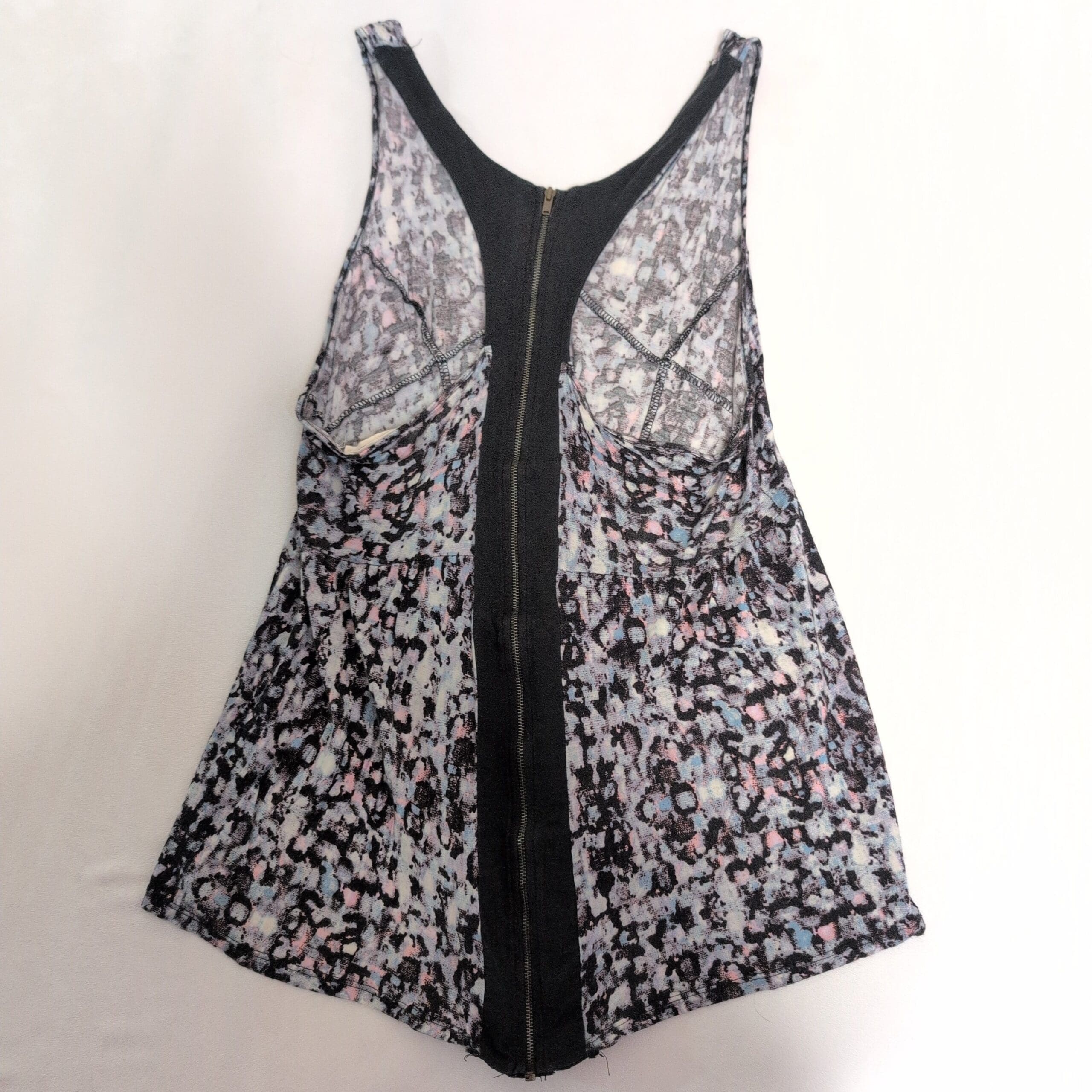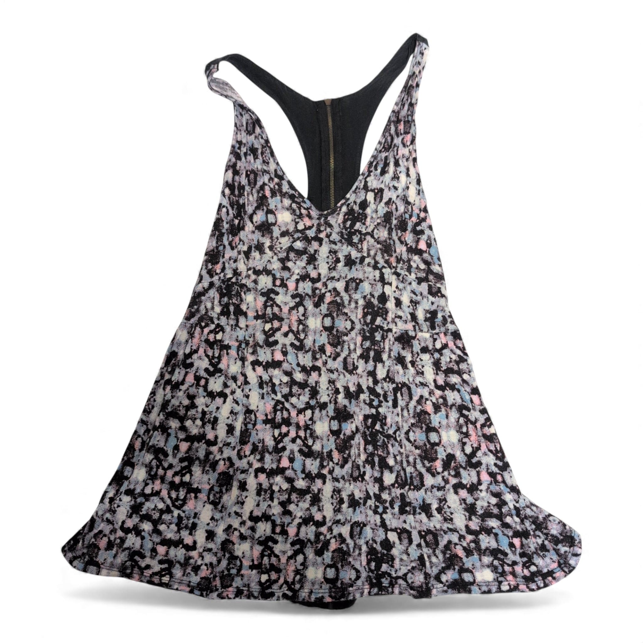 Silence & Noise women’s tank top in size L. Black racerback with a contrasting solid black back panel and center-back zipper. Front showcases a pastel multicolor abstract leopard-like print on a lightweight, flowy silhouette with an A-line hem — great for layering or wearing on its own for a casual, feminine look. Pre-owned and gently used; no noticeable stains, tears, or damage visible.