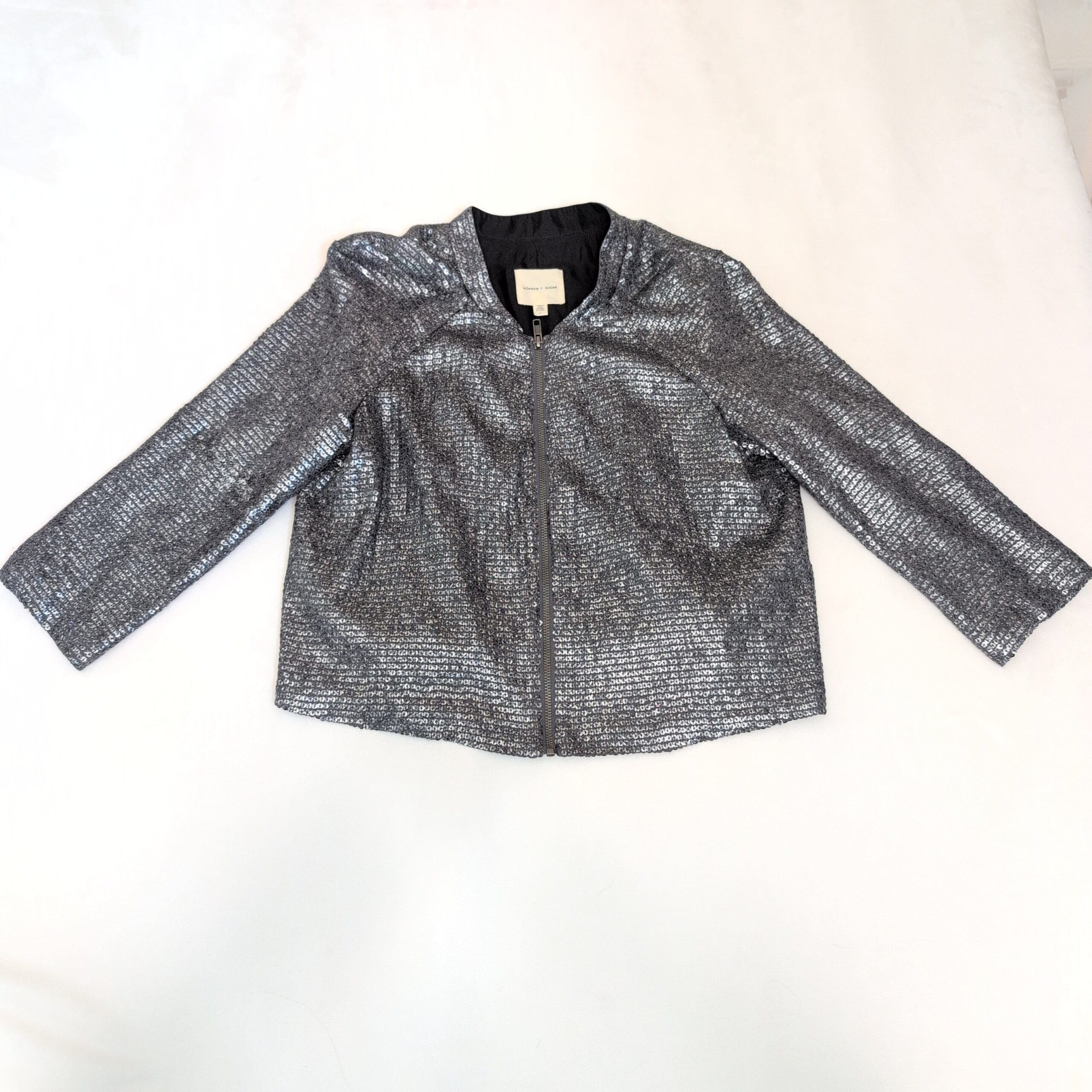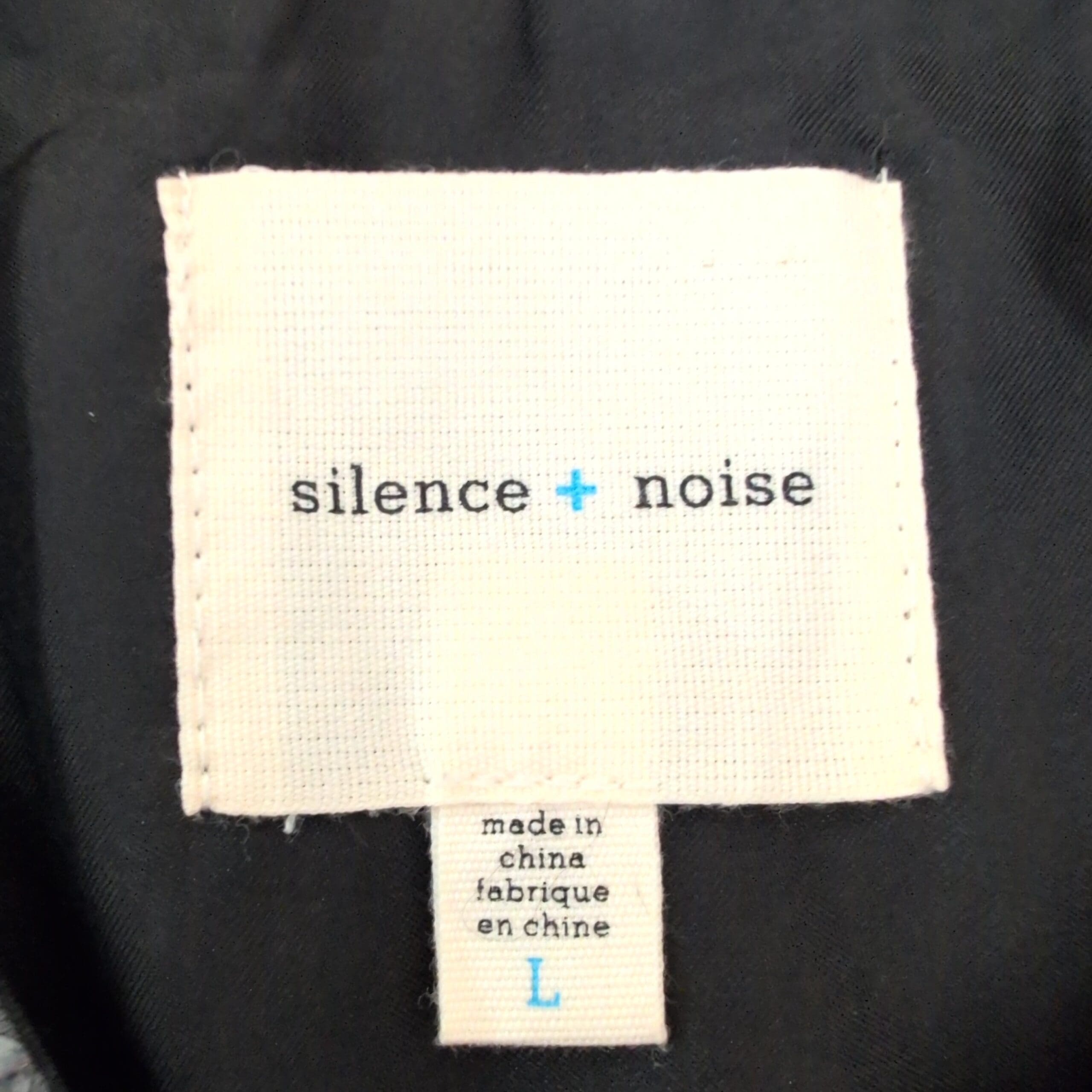 Silence & Noise women’s silver metallic bomber jacket in size L. Shimmery textured fabric with a full front zipper and a rounded, collarless bomber silhouette. Lightweight lined interior for comfortable wear. Relaxed, slightly boxy fit that layers easily over tees or dressier tops — perfect for evening events, holiday parties, or adding a statement finish to casual looks. Excellent pre-owned condition with no noticeable flaws; please see photos for fabric texture and zipper detail.