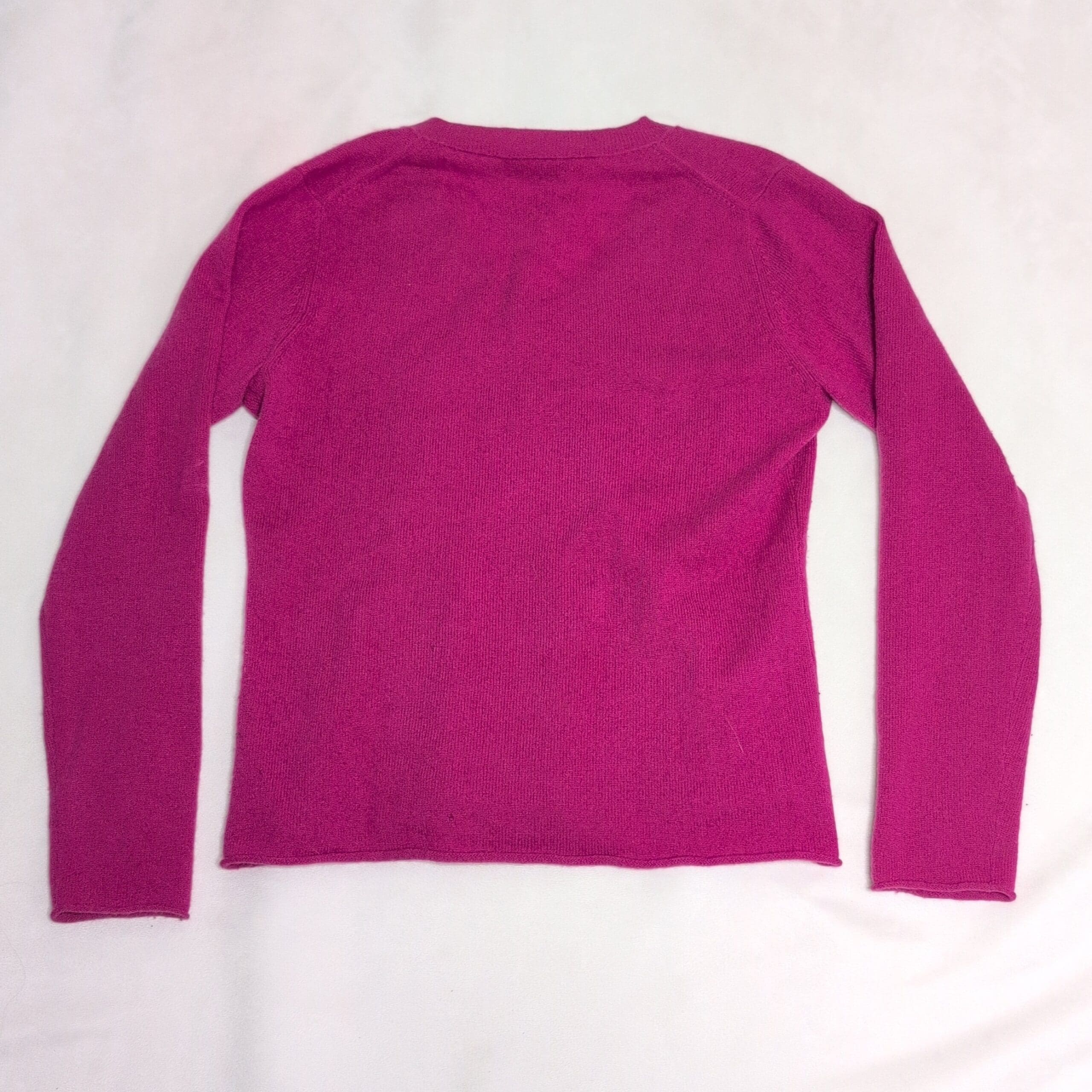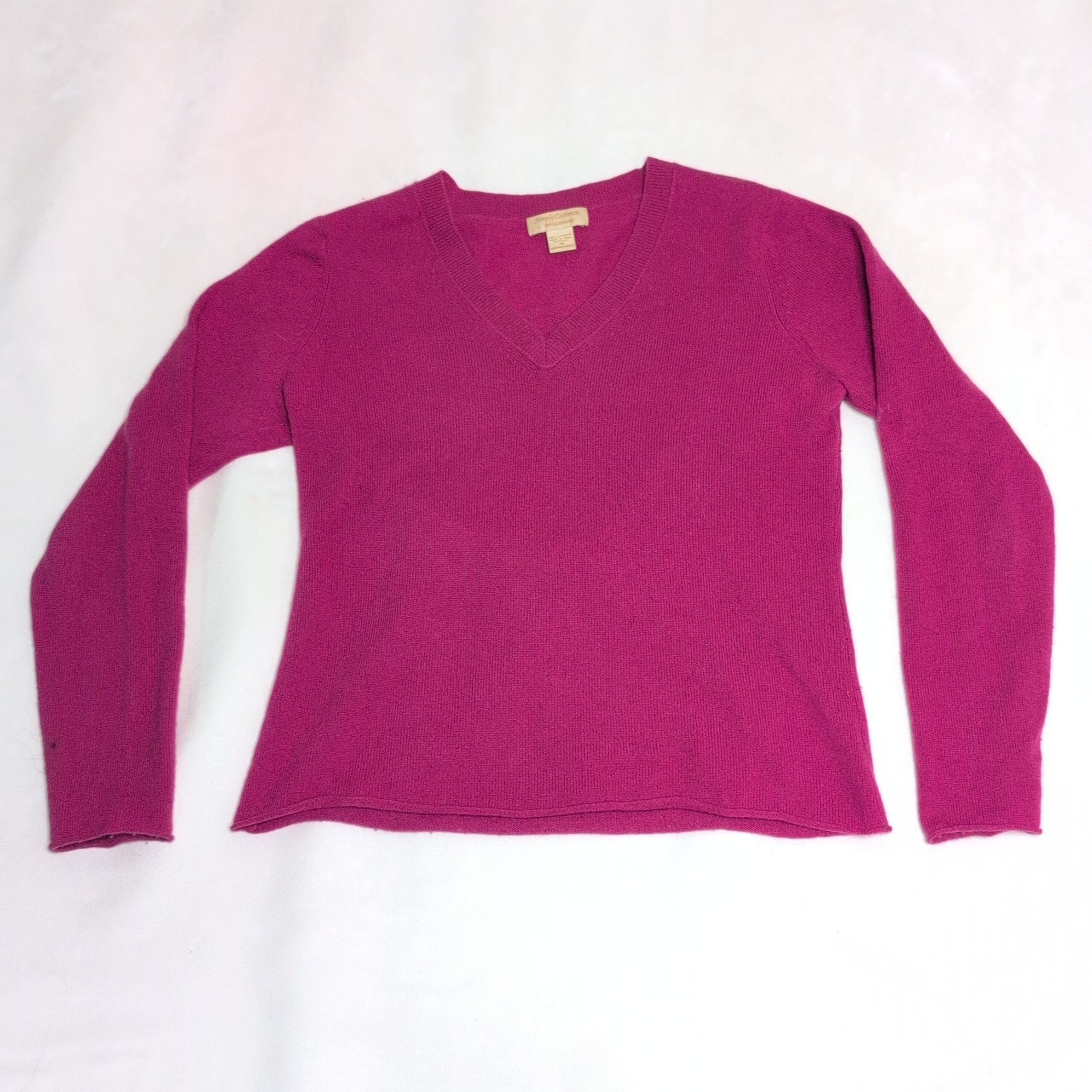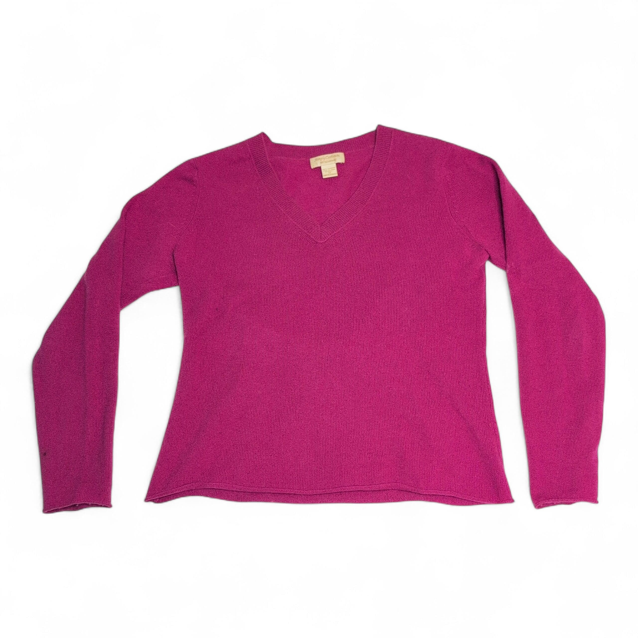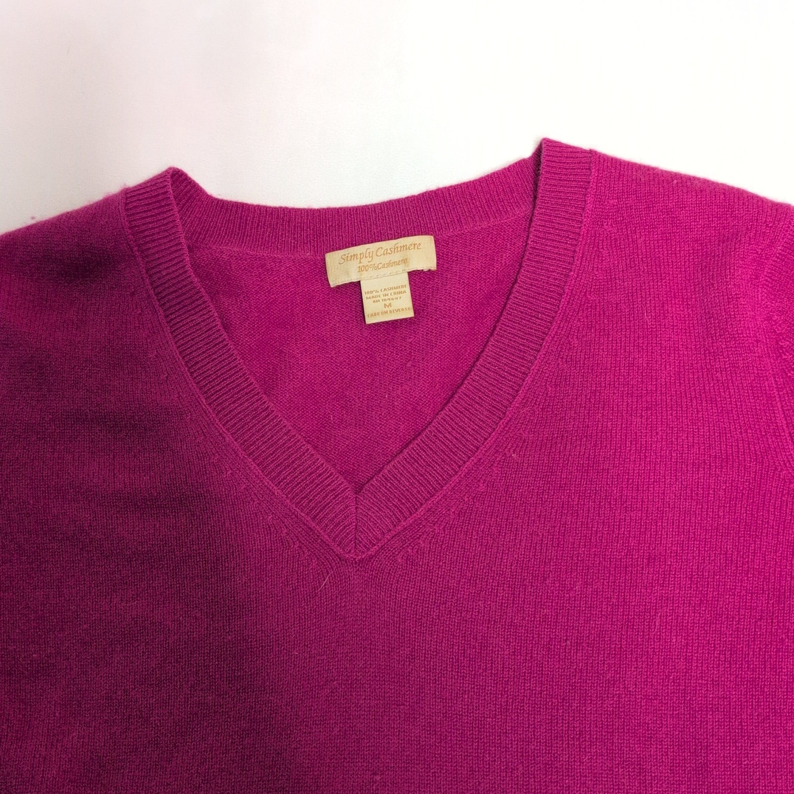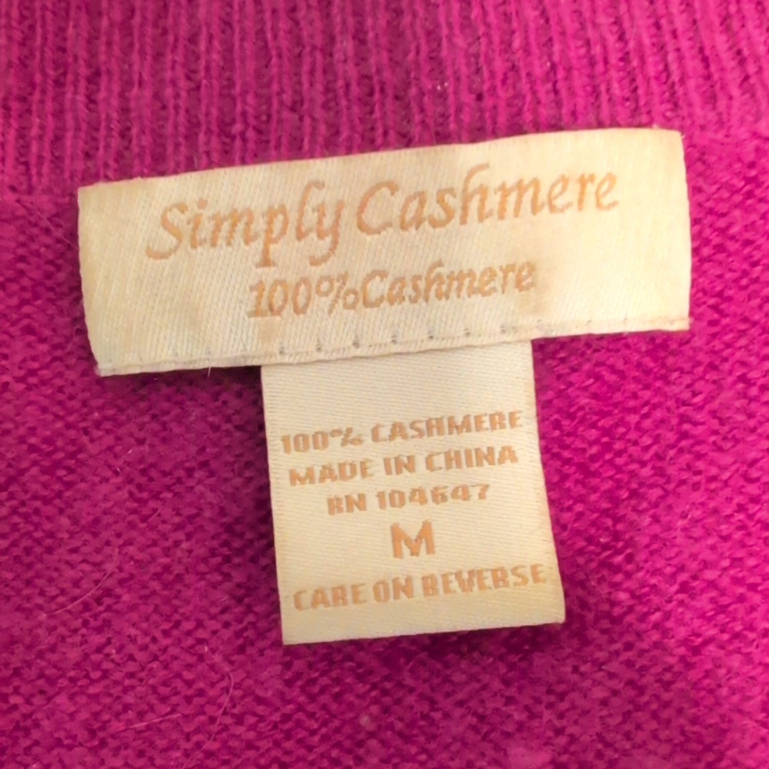 Simply Cashmere 100% cashmere V-neck sweater in a vibrant pink. Size M (standard). Classic long-sleeve silhouette with a ribbed V-neck and hem for a polished, versatile look. Gently used and free of major rips, tears, stains, or flaws; typical light wear and minor pilling may be present — see photos for condition details. Soft, lightweight, and warm; perfect for layering or wearing on its own. Care recommended: hand wash cold or dry clean and lay flat to dry.