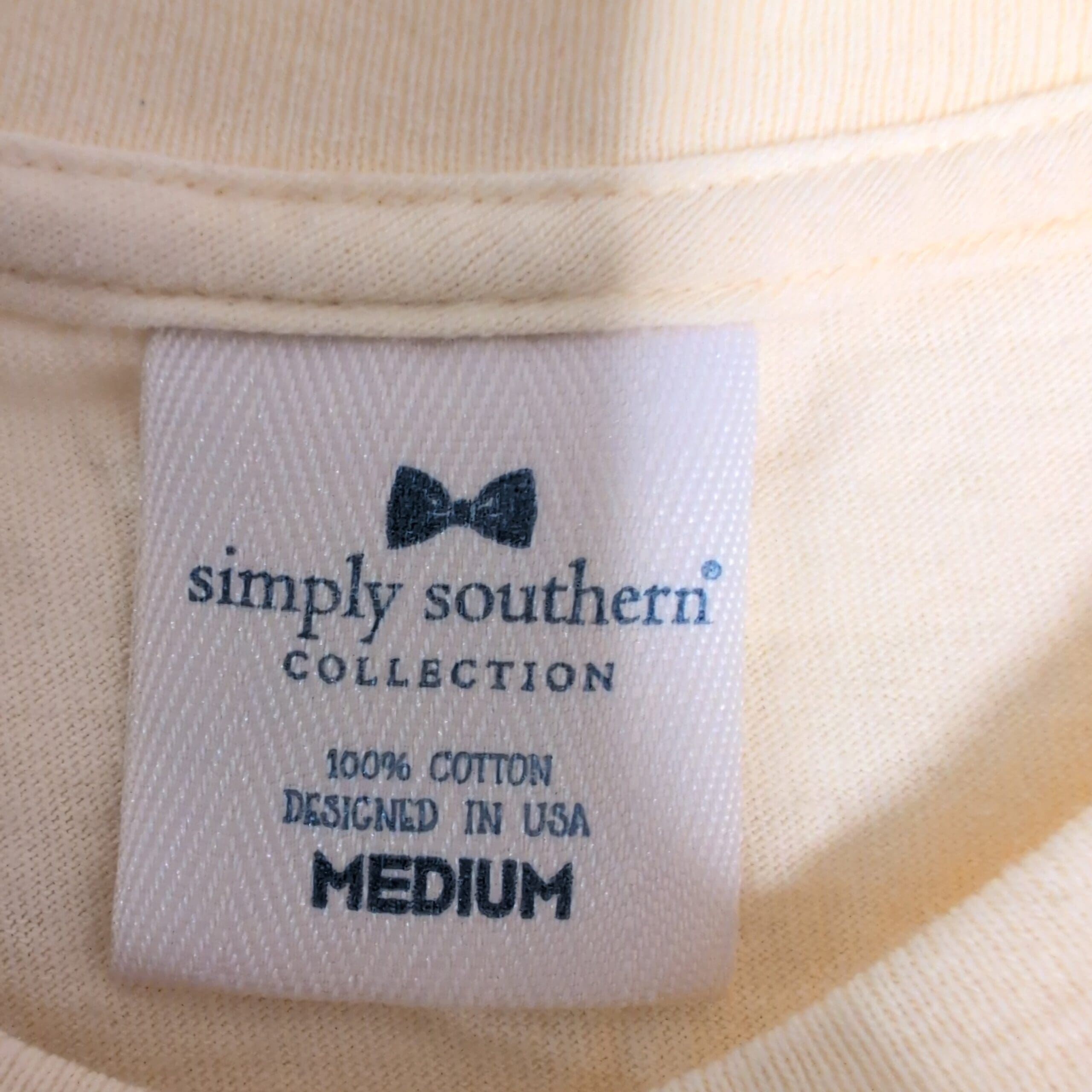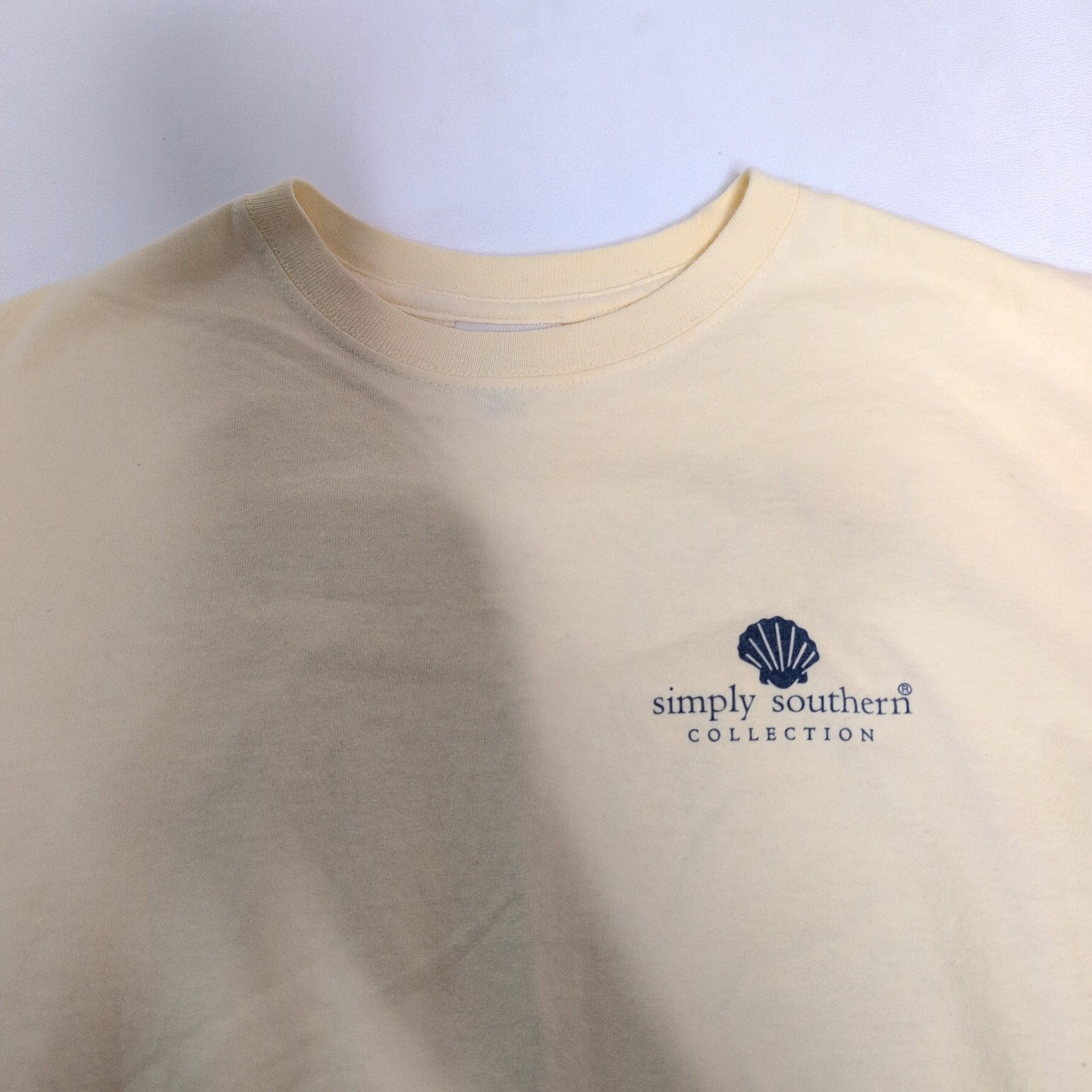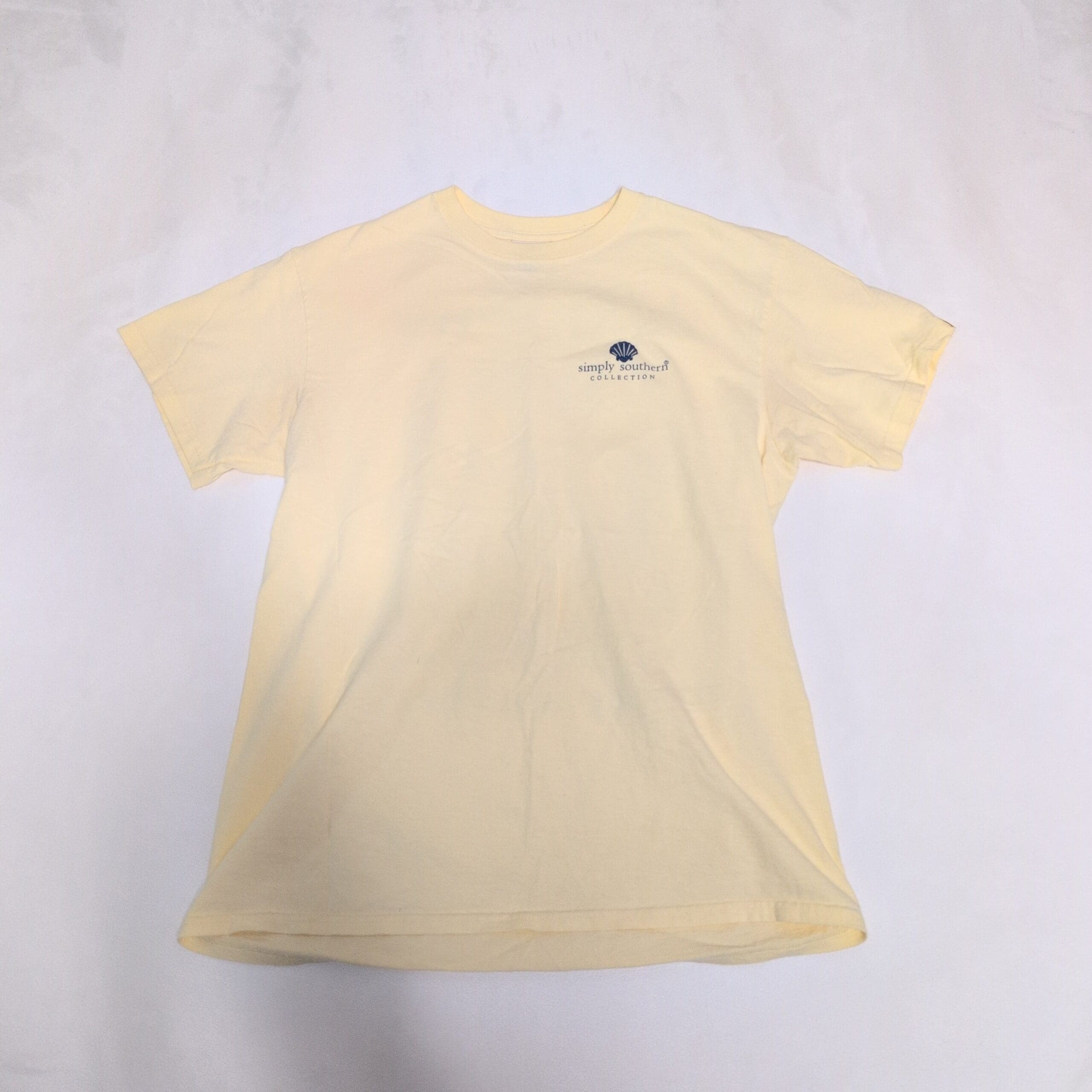 Simply Southern women’s short sleeve tee in a soft pale yellow shade. Size M (standard) with a classic crew neckline and a small navy shell logo at the left chest that reads “simply southern collection.” Comfortable casual fit perfect for everyday wear or layering. Pre-owned and gently worn with light wrinkles from storage; overall great condition with no obvious damage visible in photos.