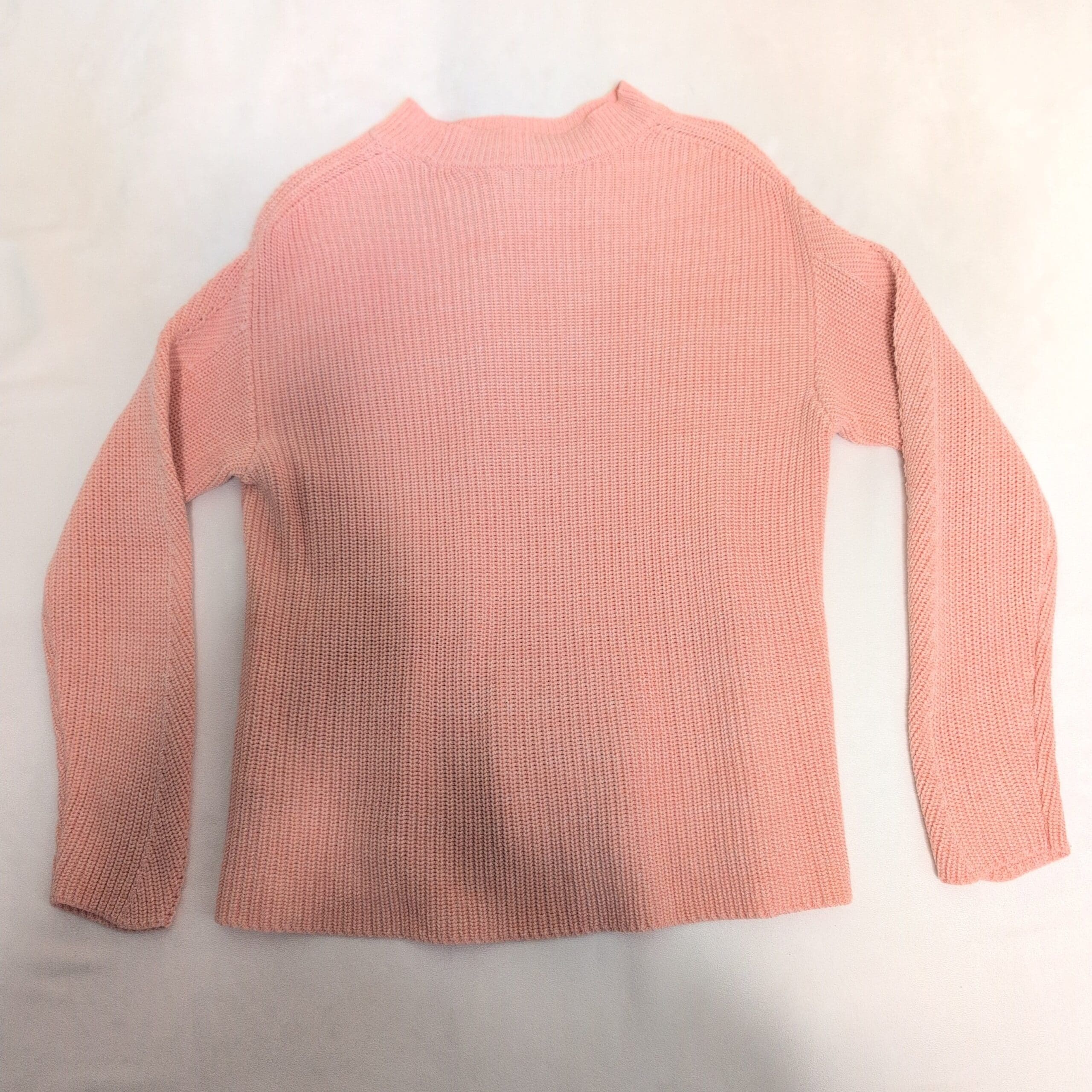 Soft pink ribbed knit mock-neck sweater by Soaked in Luxury. Size S (women). Features a relaxed, slightly A-line silhouette with vertical stitch detailing and ribbed hem and cuffs — perfect for layering over tees or under jackets. Medium-weight knit with comfortable stretch for everyday wear. Gently pre-owned and in very good condition with normal light wear. Care: machine wash cold on gentle cycle or hand wash; reshape and lay flat to dry.