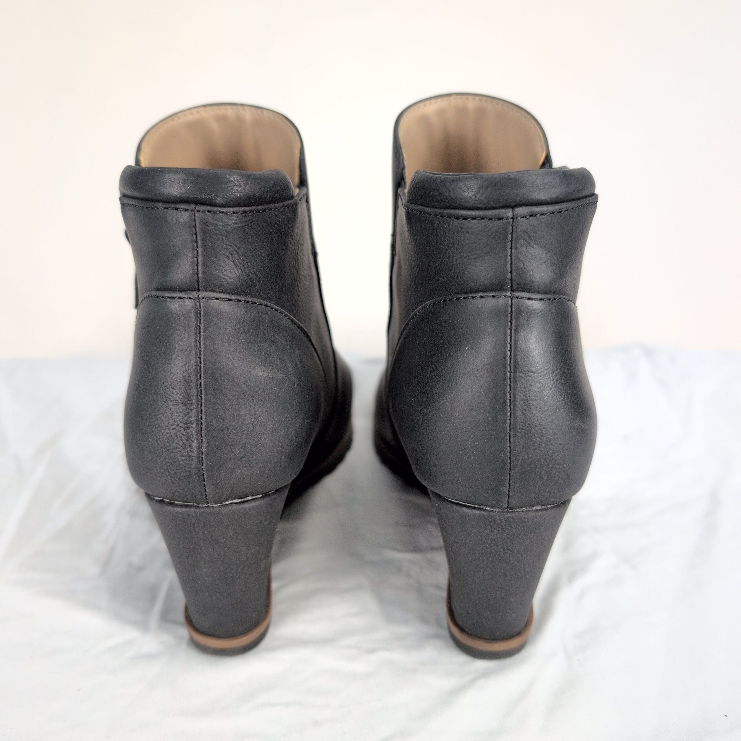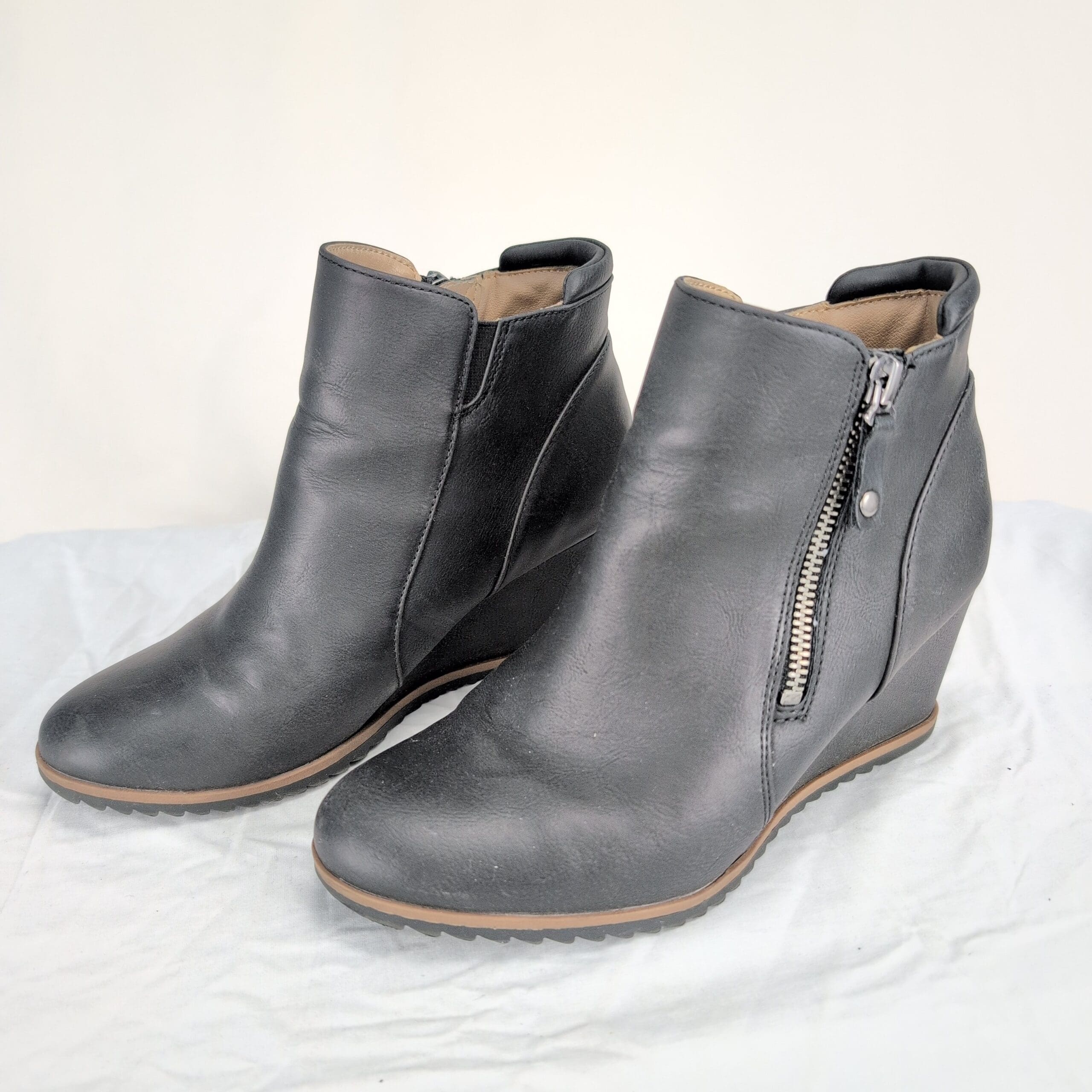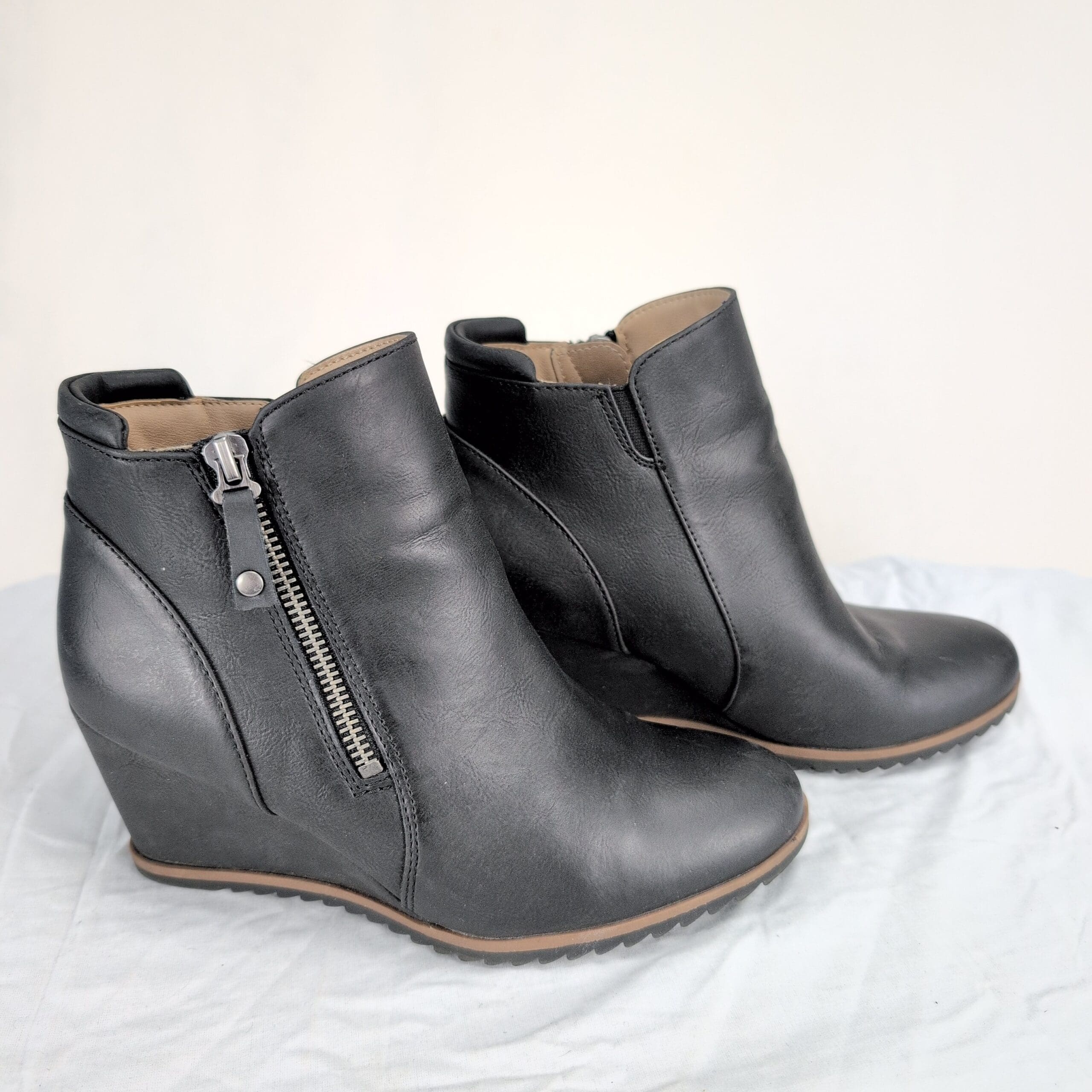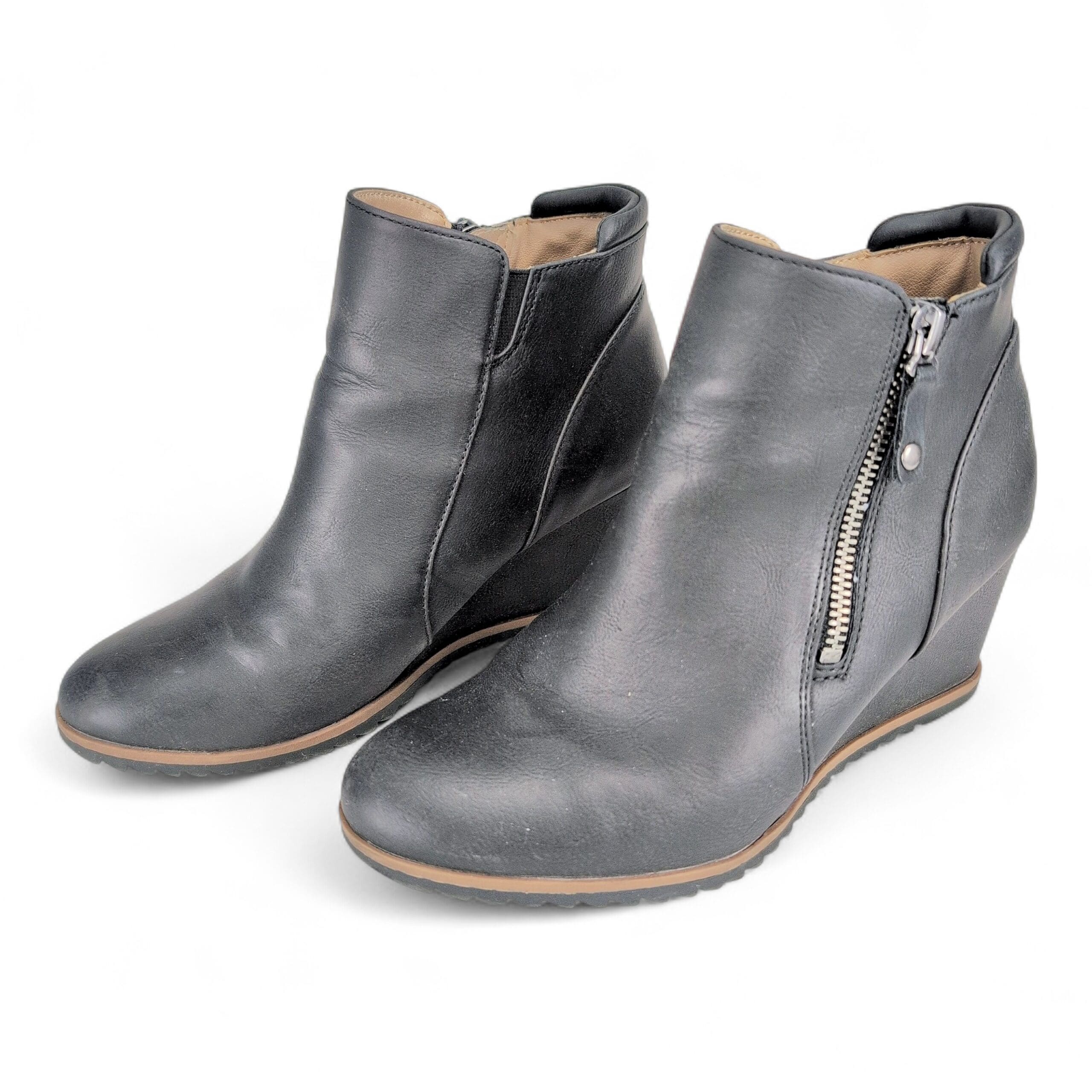 Soul Naturalizer black wedge ankle boots in women’s size 6.5. Clean, streamlined silhouette with side zipper closure and wedge heel; rubber tread sole for traction.