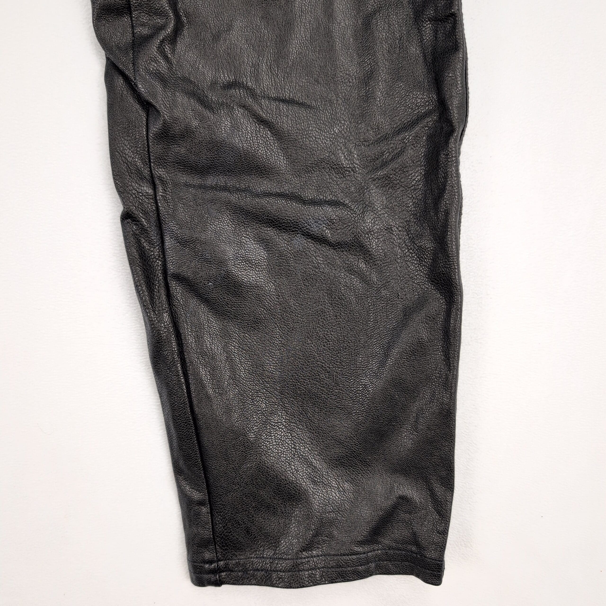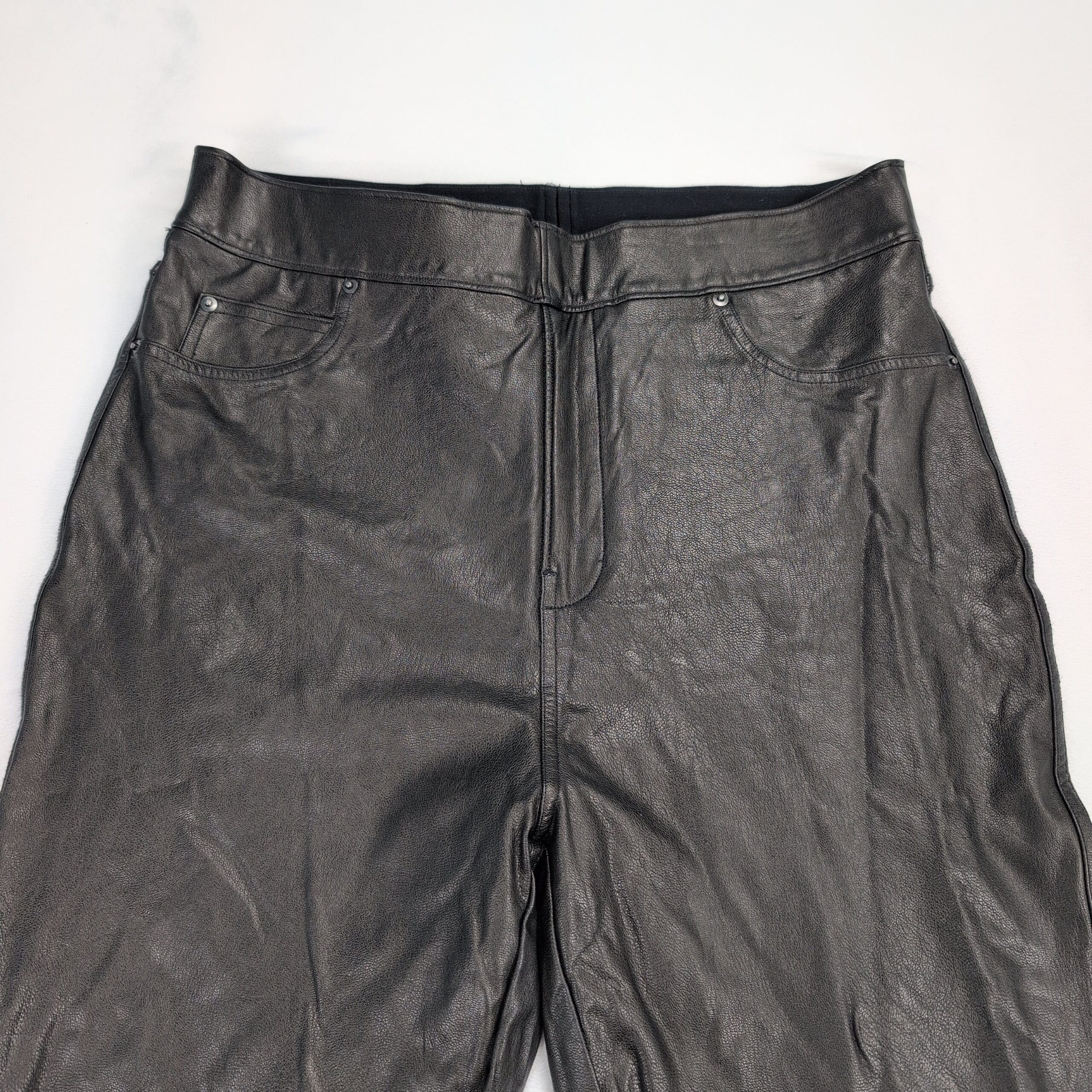 Black Spanx faux leather pull-on pants in size L. Sleek, tapered style that dresses up easily or layers under coats. Excellent used condition — free of major rips, tears, or stains; typical light wear may be present. Quality notes: faux leather construction; one area of wear on the inside of the left thigh (pictured). No measurements provided.