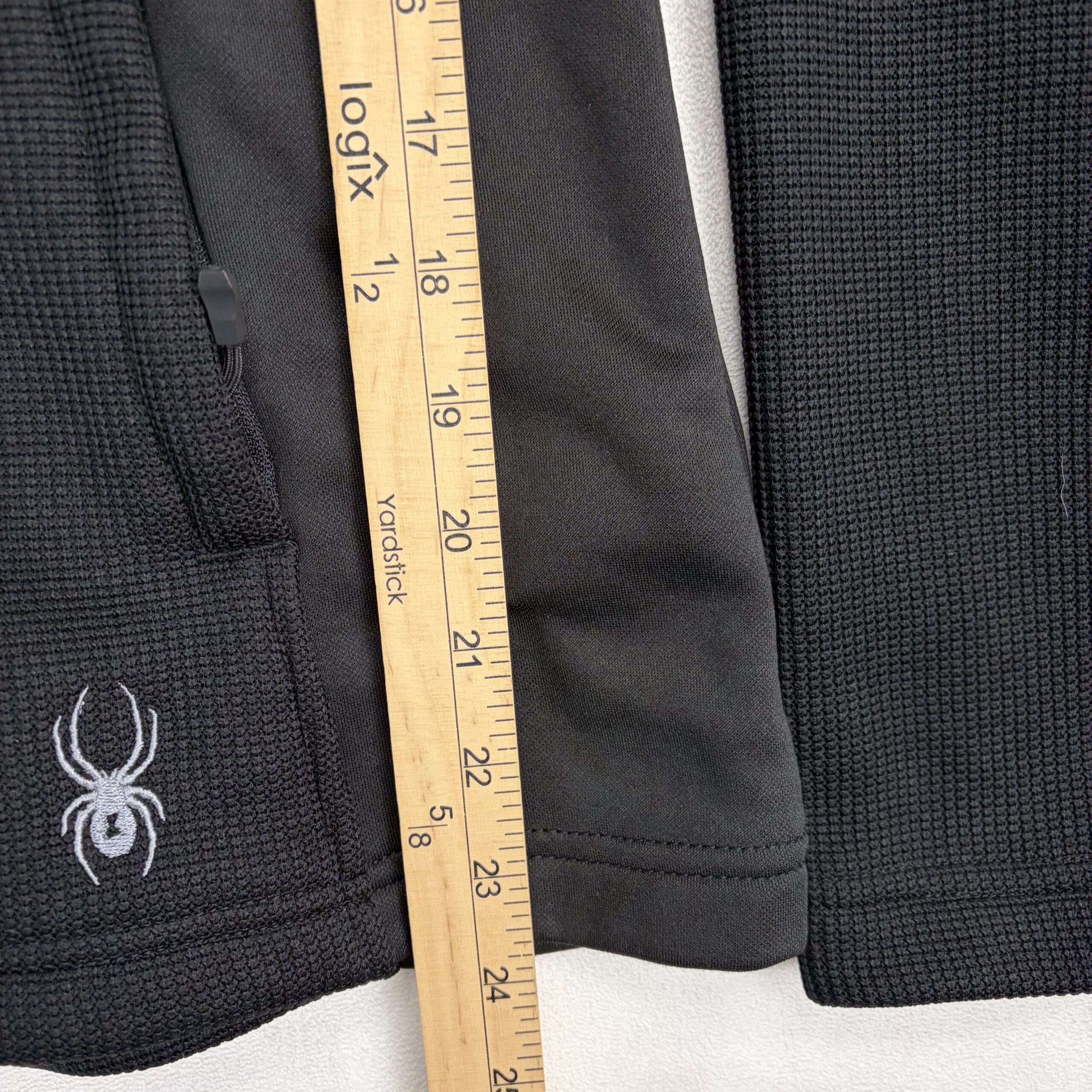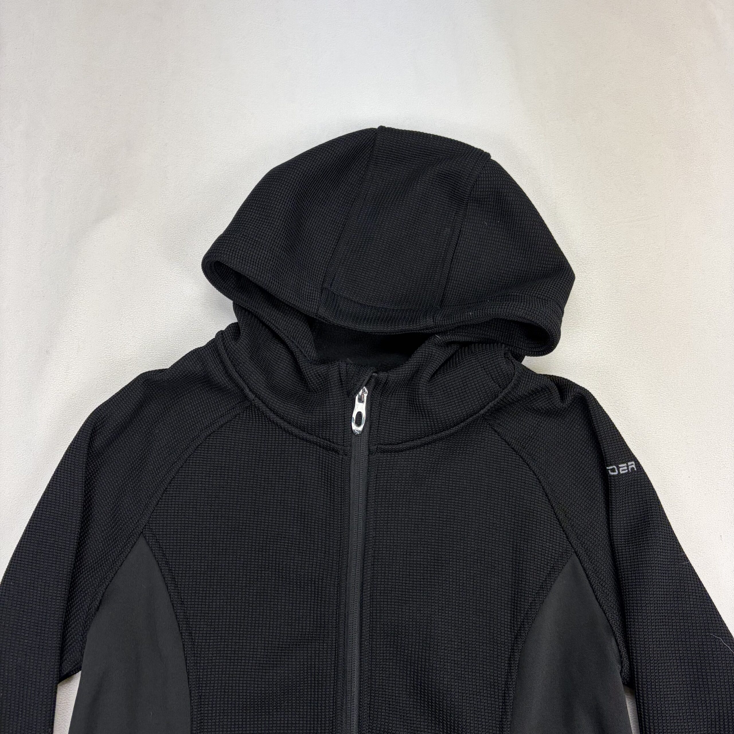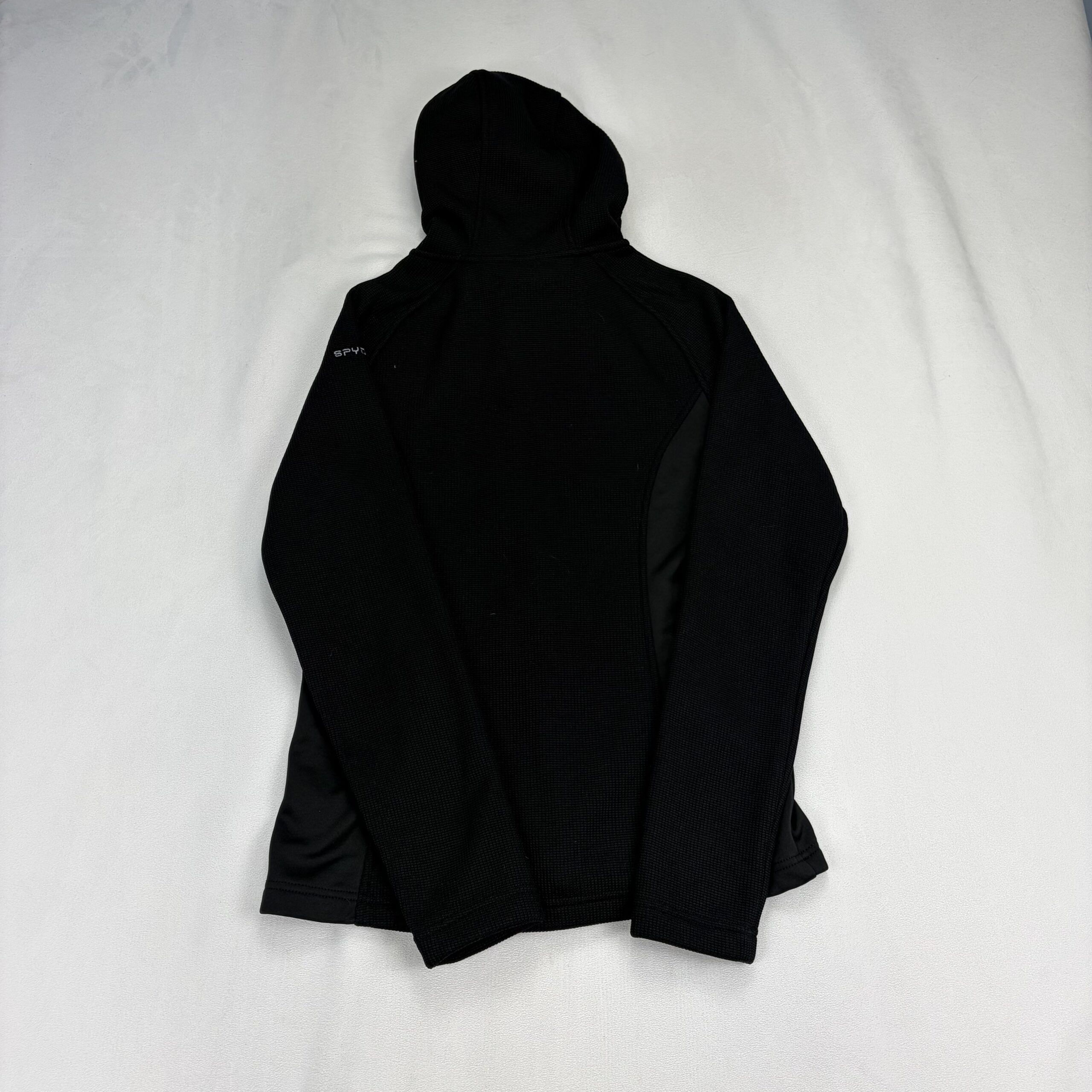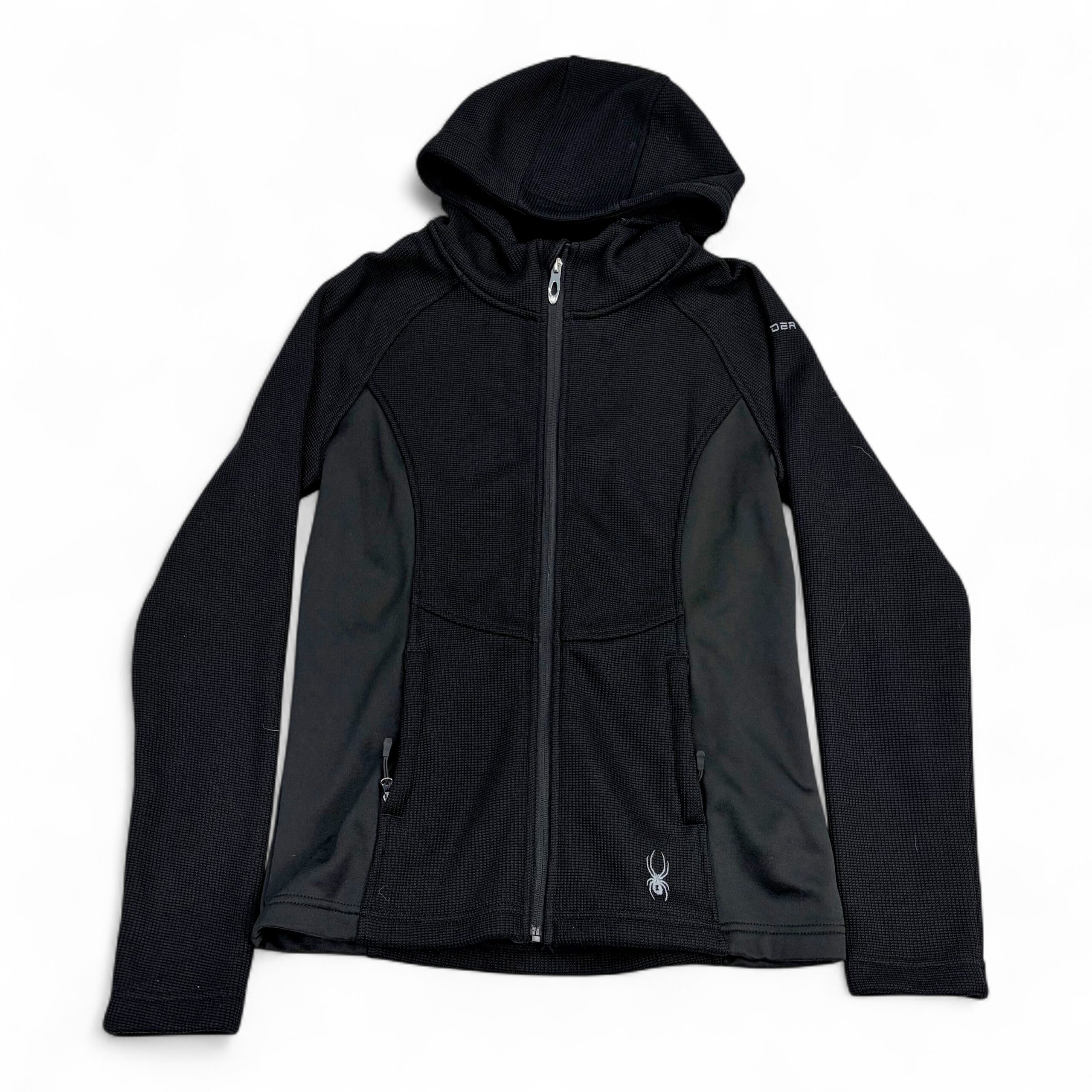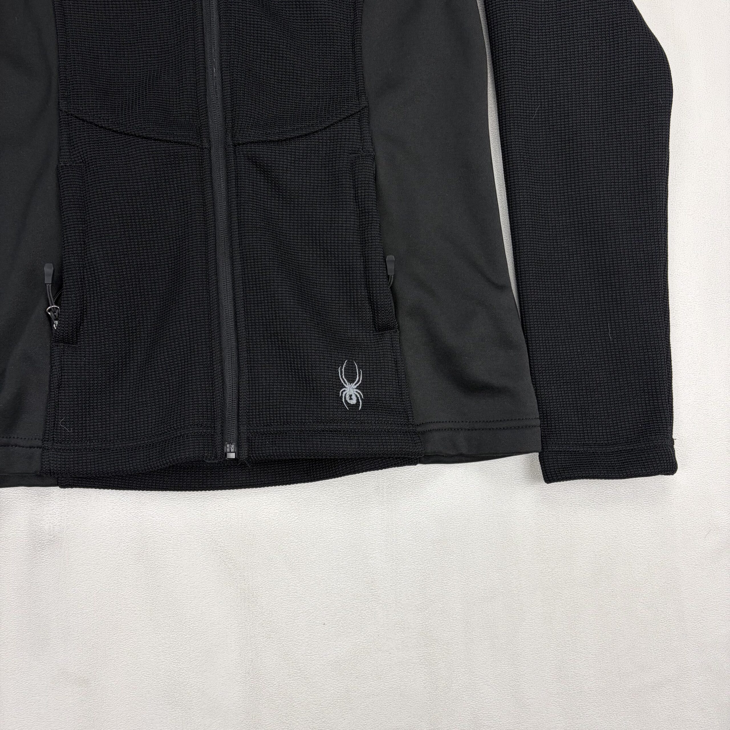Black Spyder women’s full-zip hooded jacket in size M. Technical midweight fleece with textured knit panels and smooth stretch side panels for mobility. Features full front zipper, attached hood, zippered hand pockets, and embroidered Spyder logo at hem and sleeve. Clean, classic athletic silhouette ideal for layering, workouts, or everyday wear.