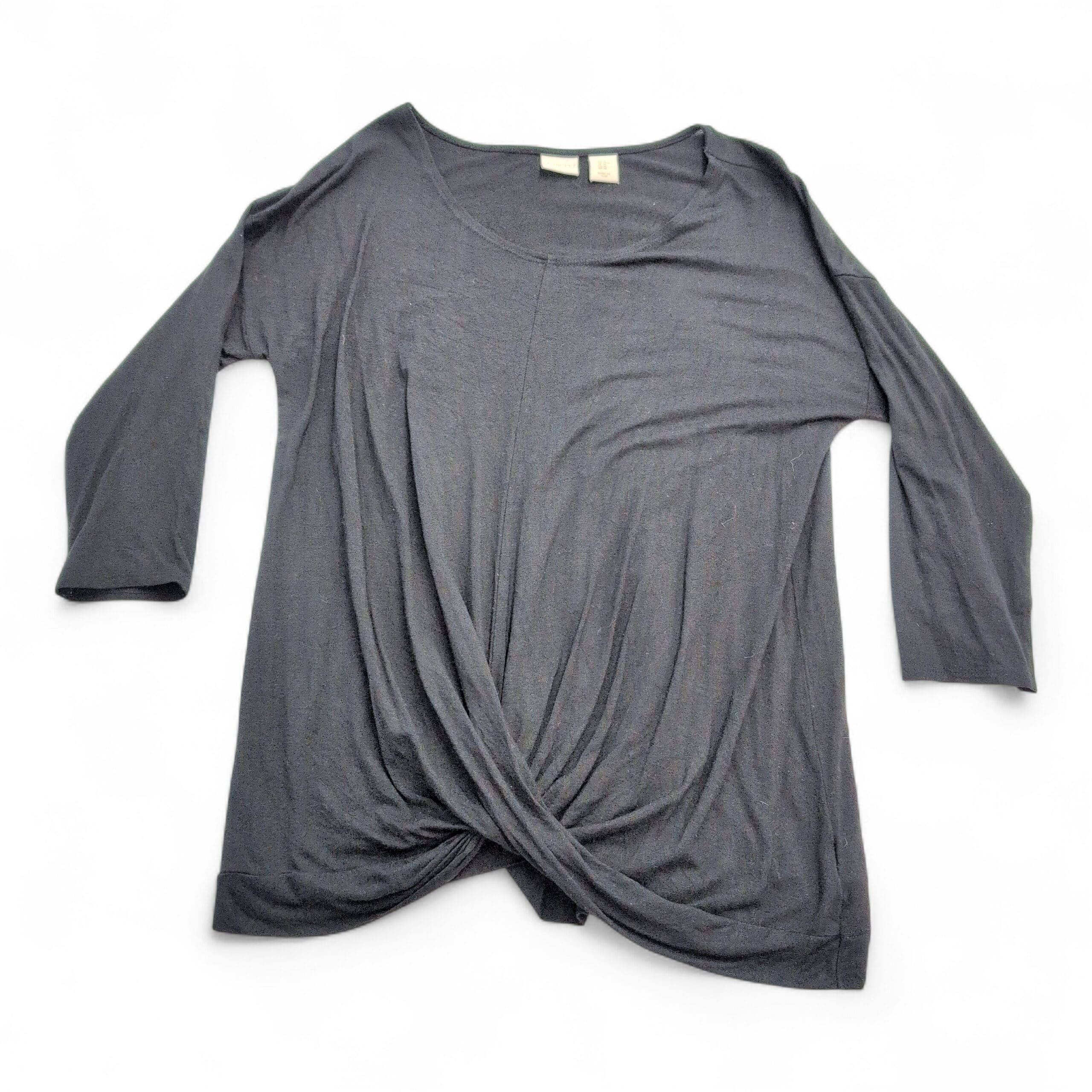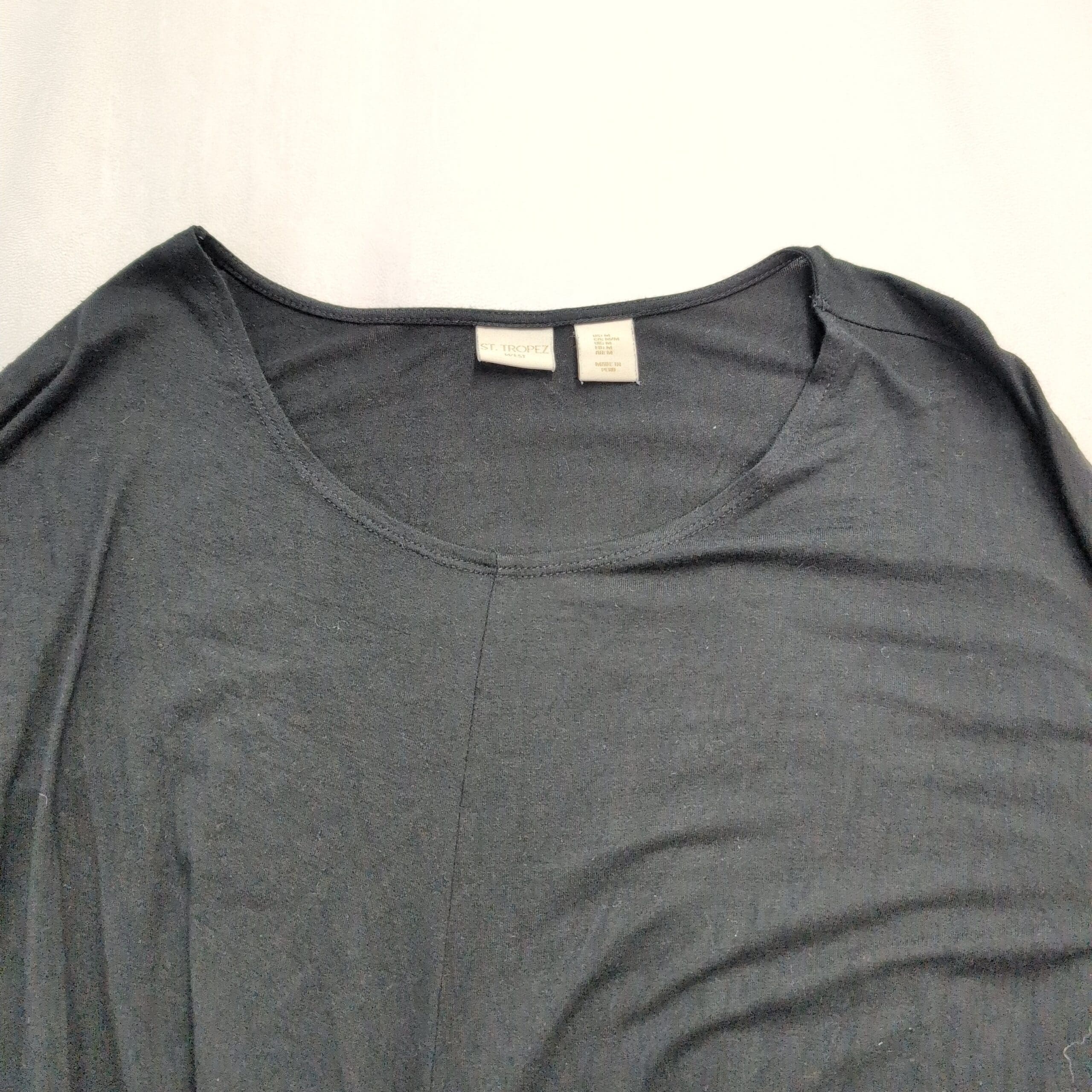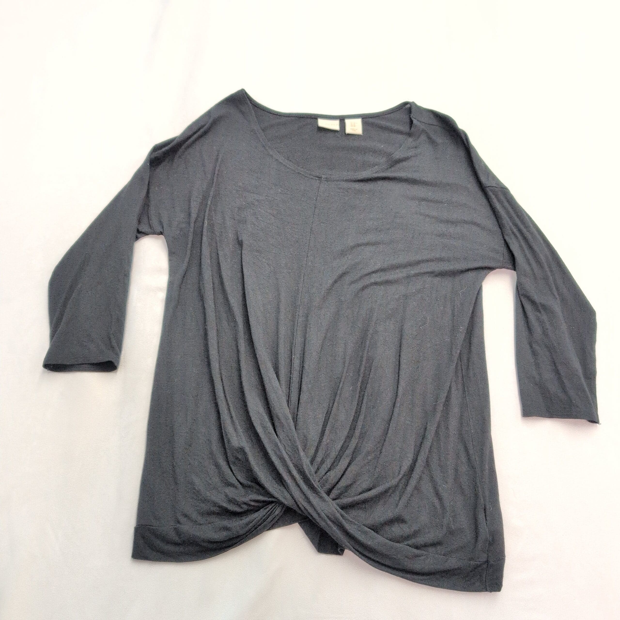 St. Tropez relaxed knit blouse in charcoal gray featuring a scoop neckline, 3/4 sleeves, and a draped twist-front detail that creates a flattering, easy silhouette. Versatile for layering or wearing solo for casual to polished looks. Size M (standard). Gently used and free of major rips, tears, or stains; shows light, typical wear including mild pilling and a few surface fibers that may brush away.