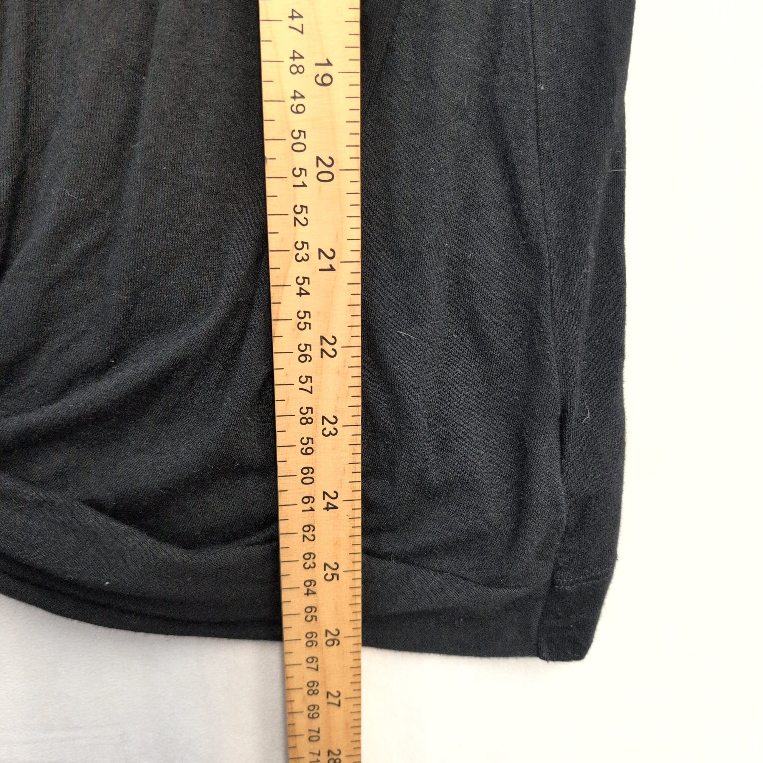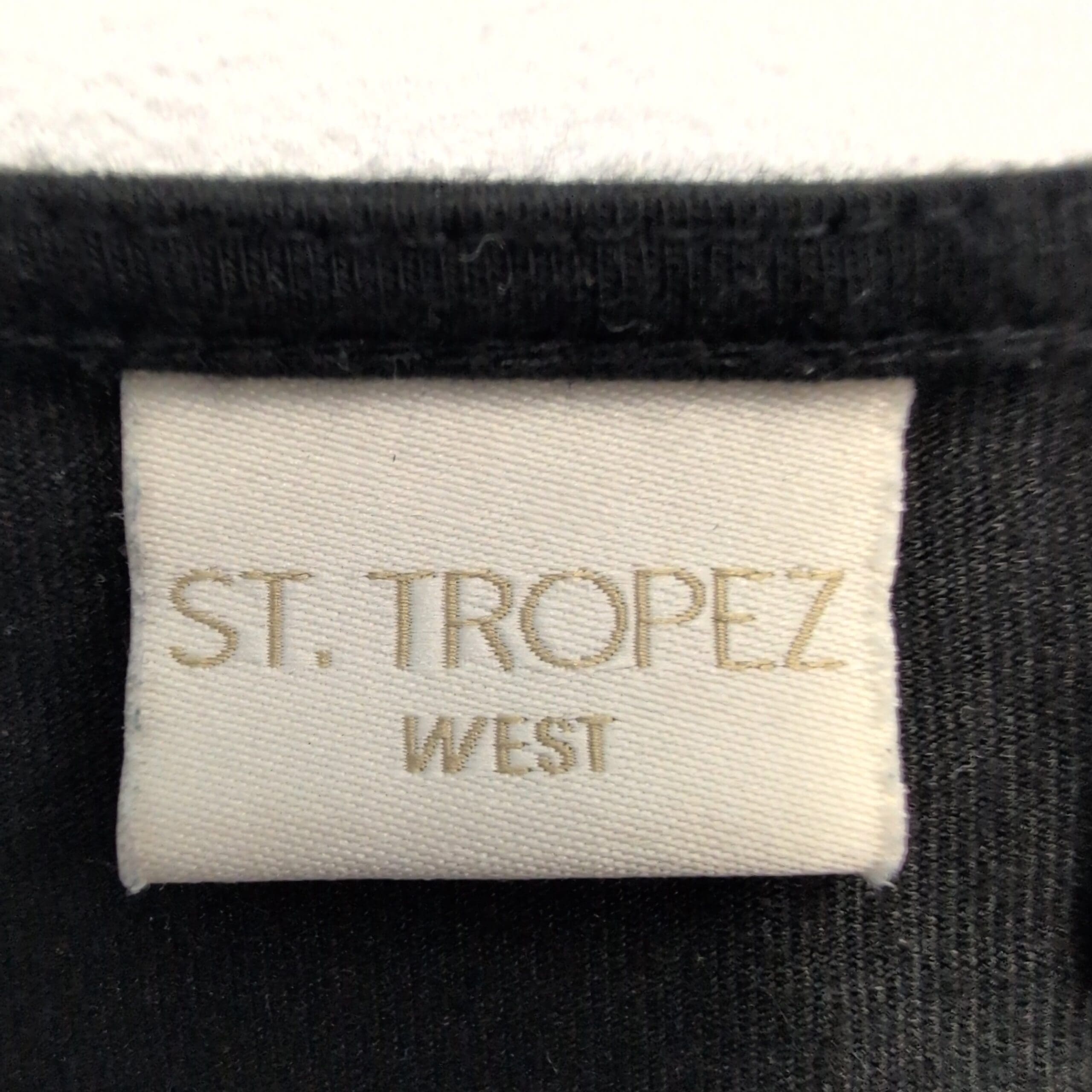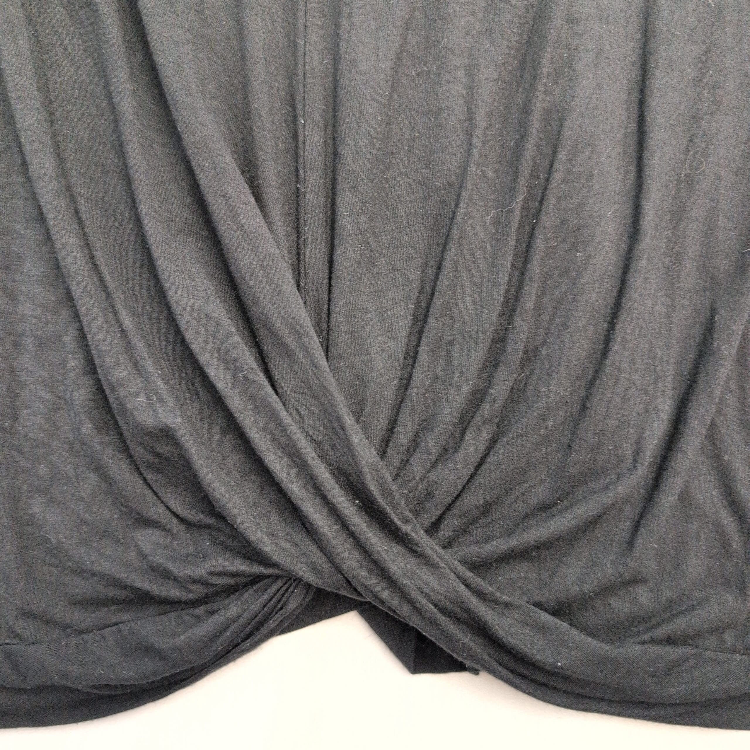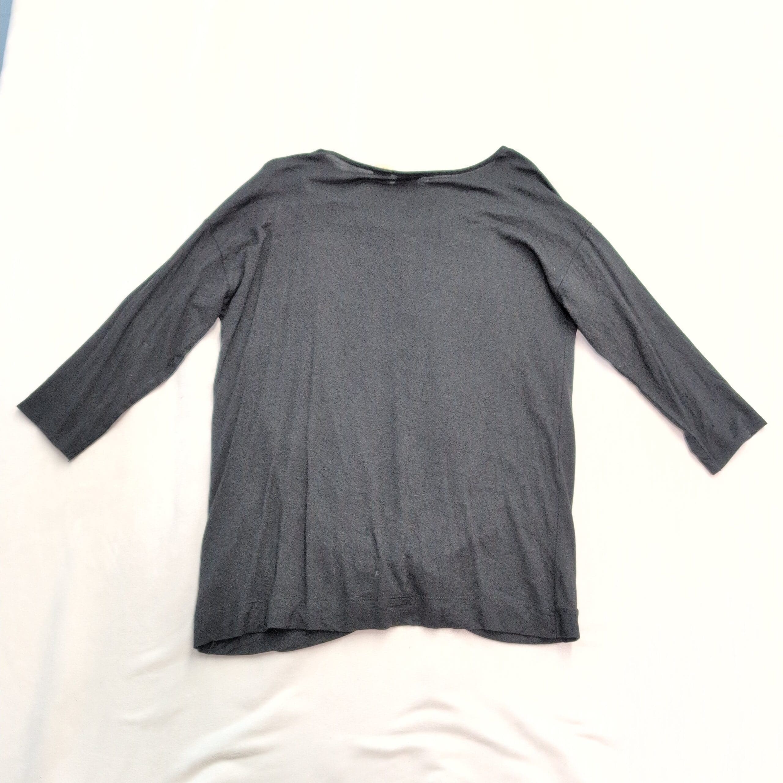 St. Tropez relaxed knit blouse in charcoal gray featuring a scoop neckline, 3/4 sleeves, and a draped twist-front detail that creates a flattering, easy silhouette. Versatile for layering or wearing solo for casual to polished looks. Size M (standard). Gently used and free of major rips, tears, or stains; shows light, typical wear including mild pilling and a few surface fibers that may brush away.