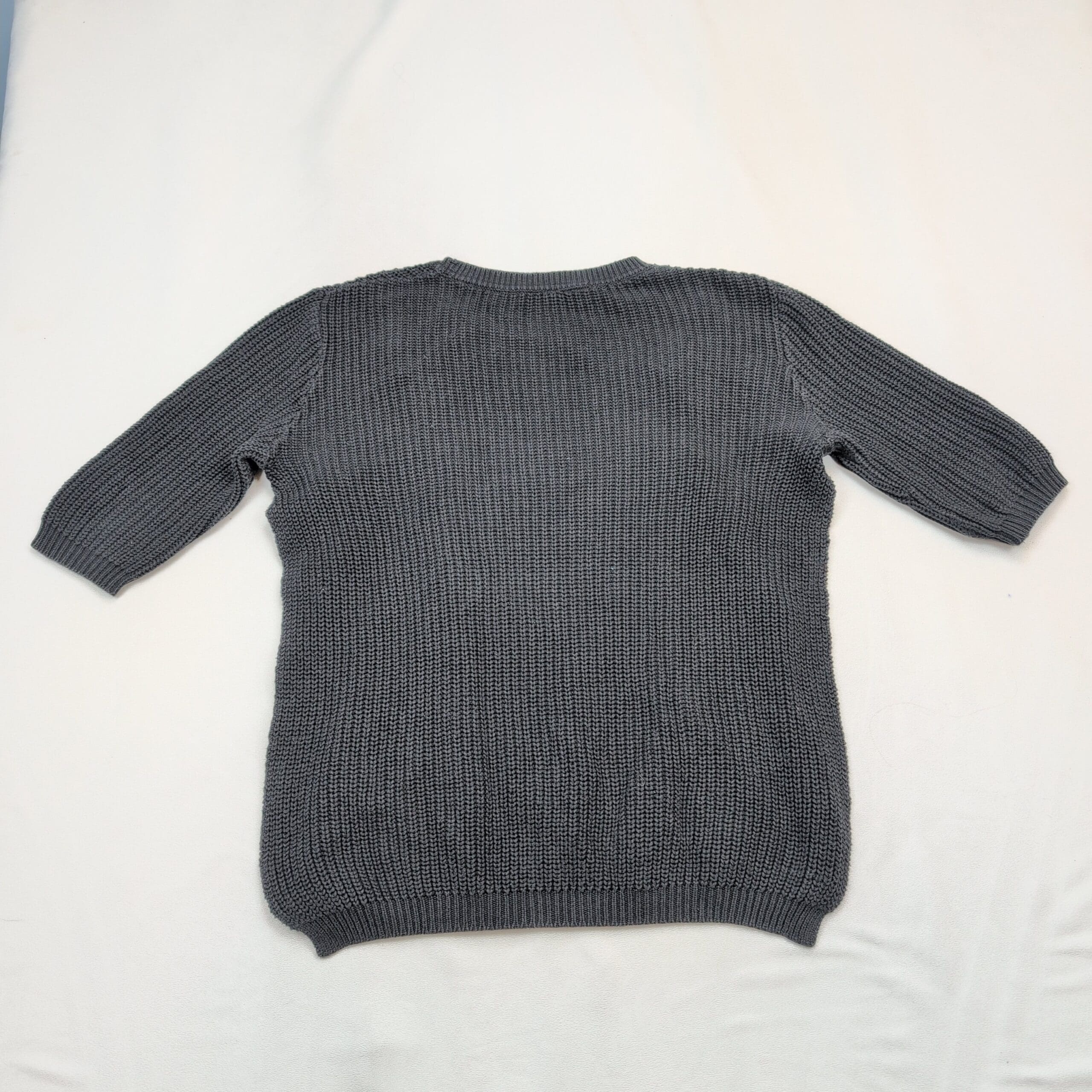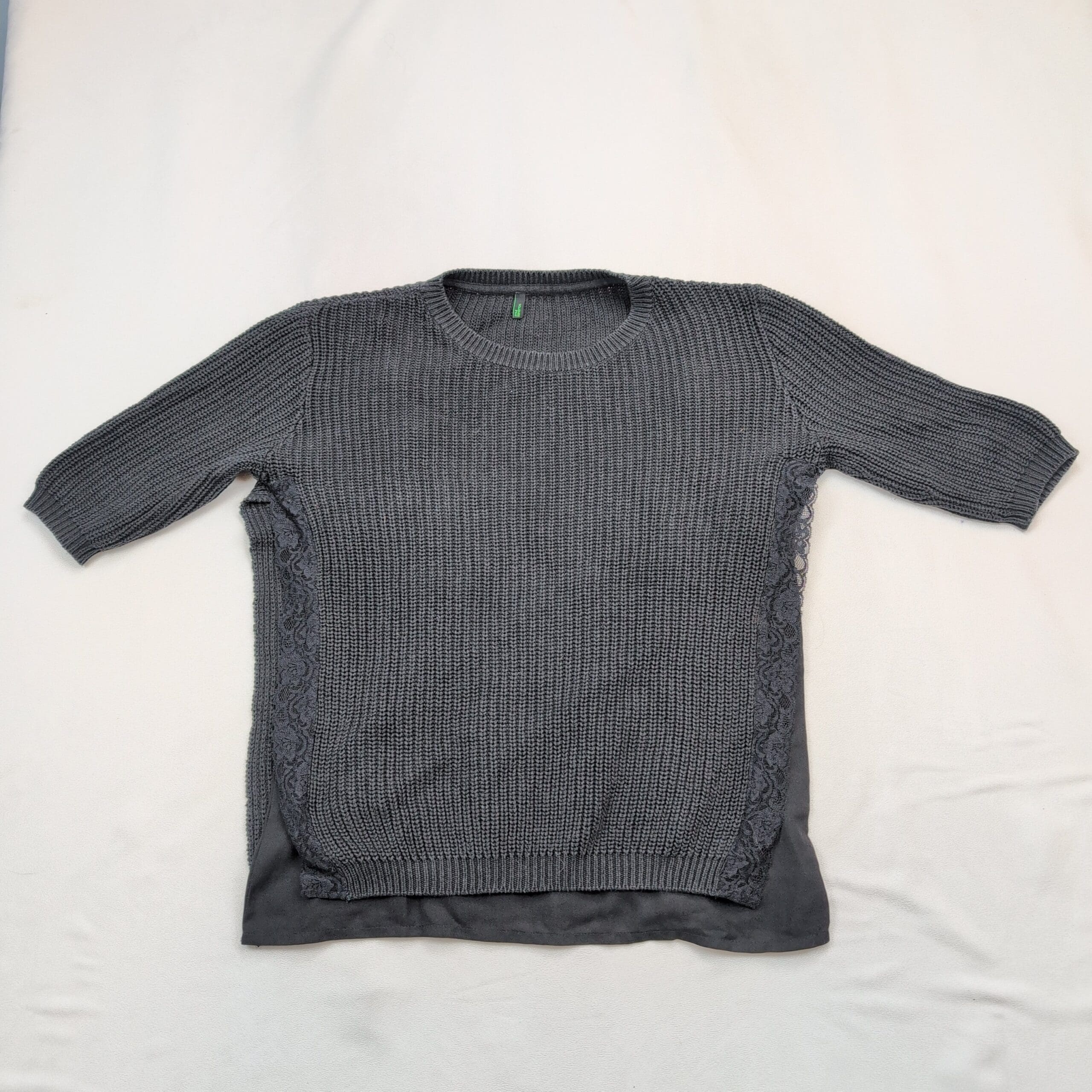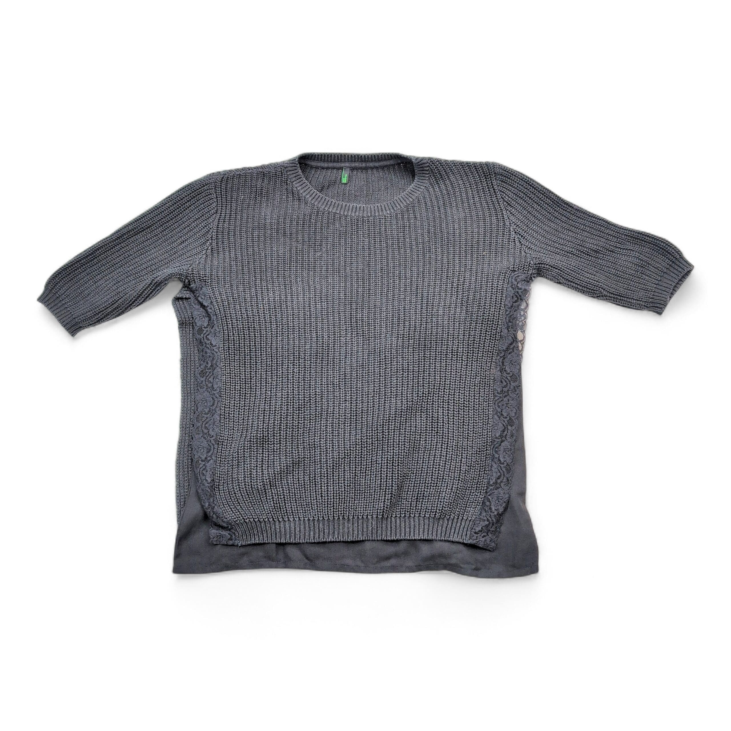 Stile Benetton women’s sweater, size M. Soft gray knit crewneck with three-quarter sleeves, delicate lace side panels and a lightweight layered chiffon hem for added texture and a feminine finish. Medium-weight knit good for transitional weather; versatile for casual or office styling. Excellent used condition — free of major rips, tears, stains, or flaws; typical light wear may be present. See photos for color and detail.