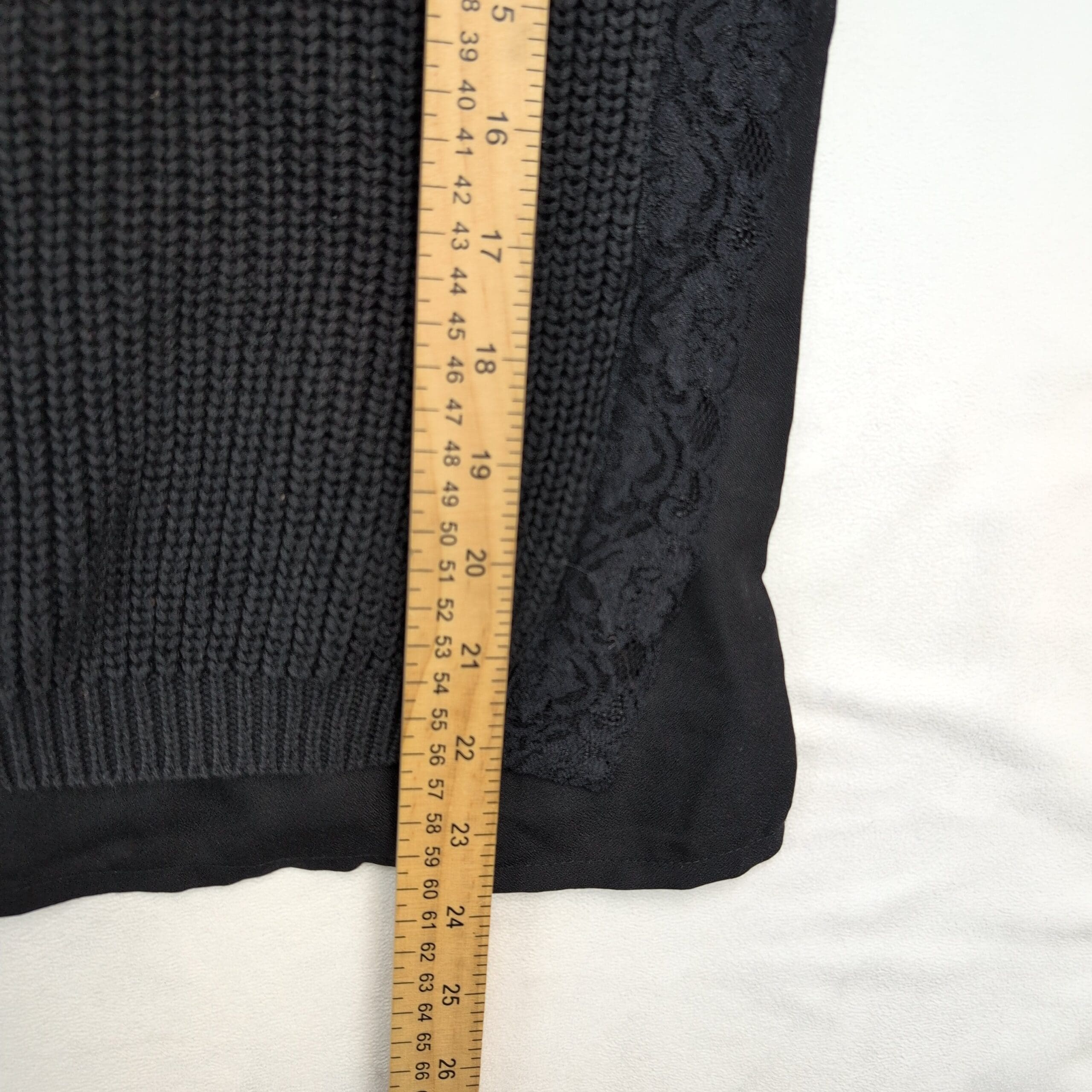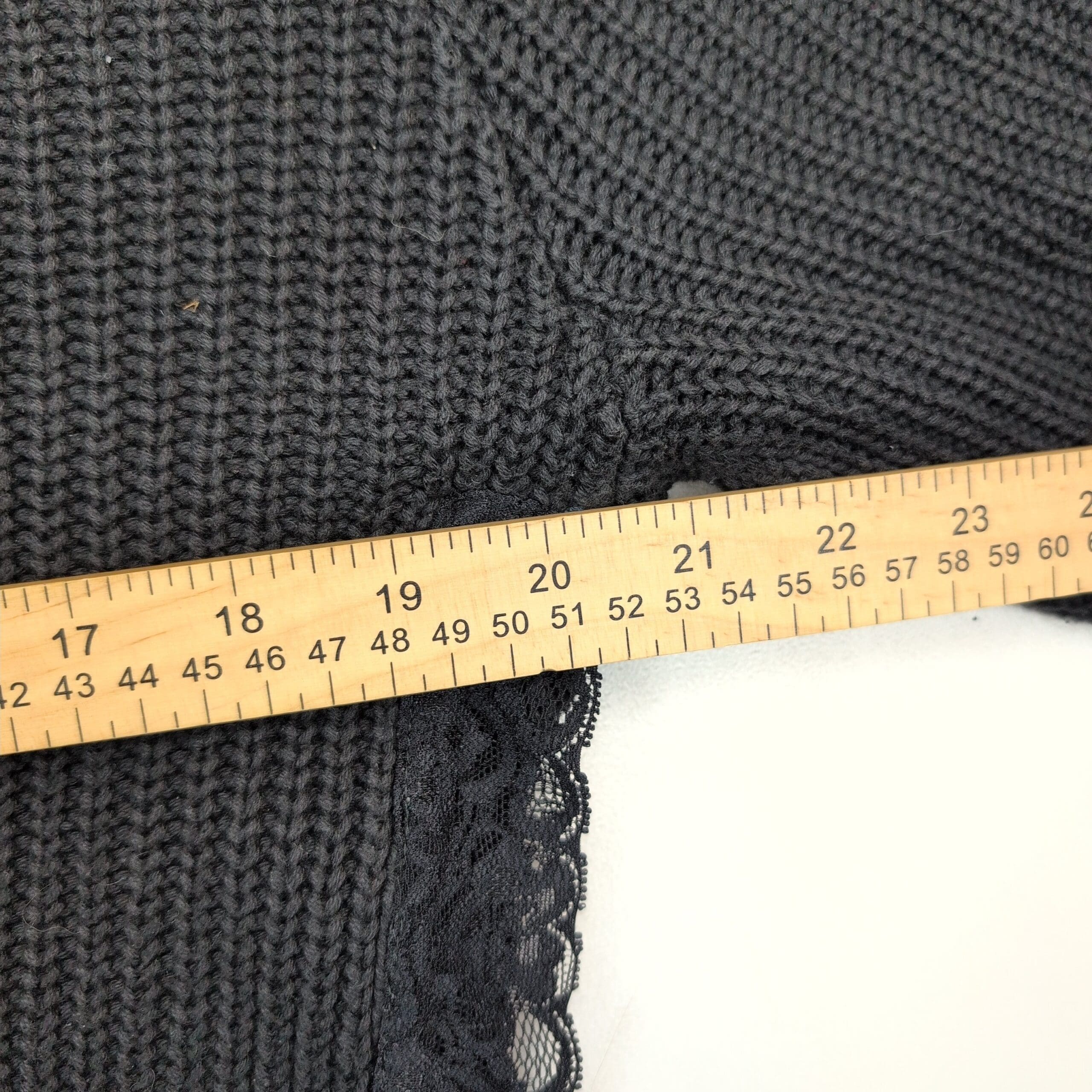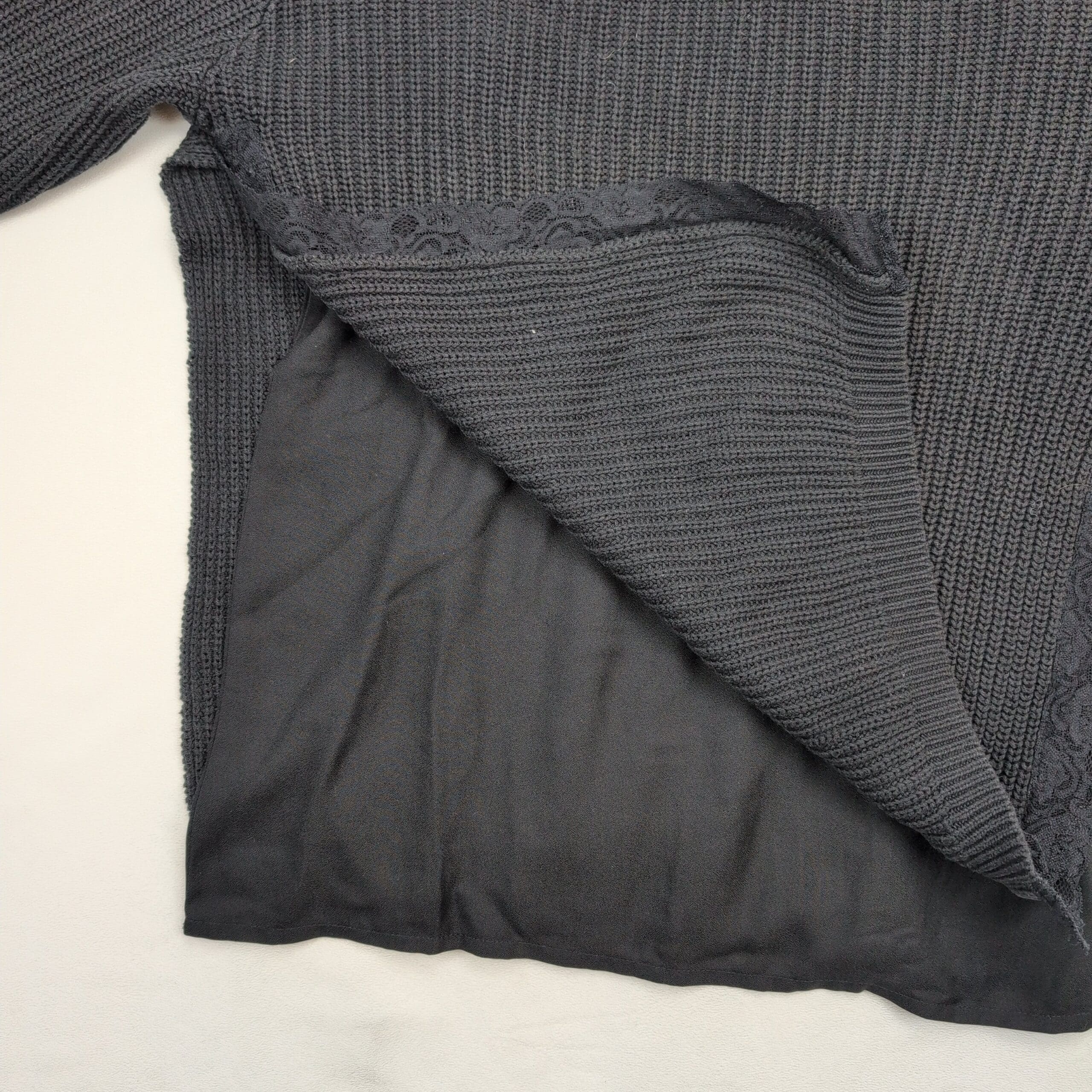 Stile Benetton women’s sweater, size M. Soft gray knit crewneck with three-quarter sleeves, delicate lace side panels and a lightweight layered chiffon hem for added texture and a feminine finish. Medium-weight knit good for transitional weather; versatile for casual or office styling. Excellent used condition — free of major rips, tears, stains, or flaws; typical light wear may be present. See photos for color and detail.