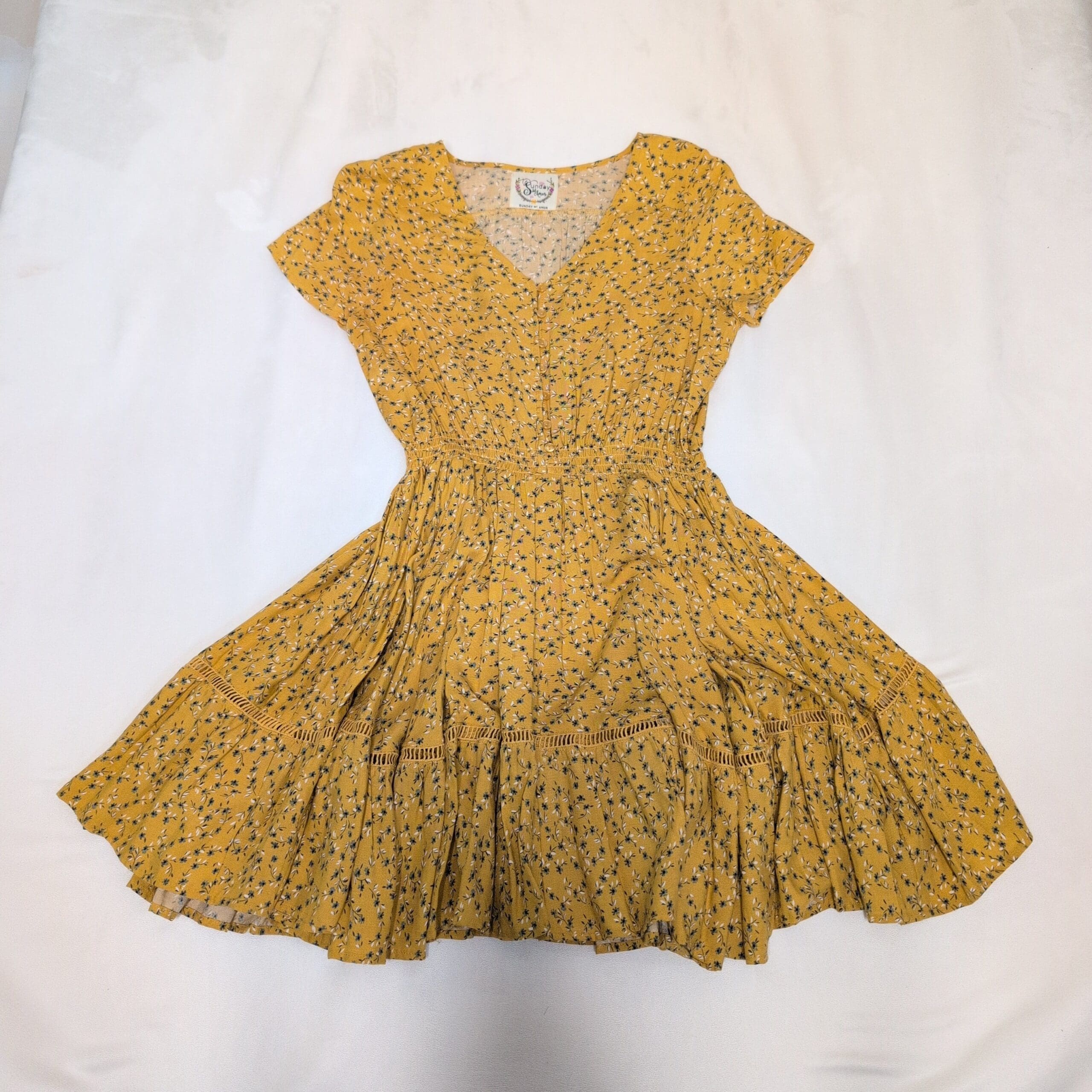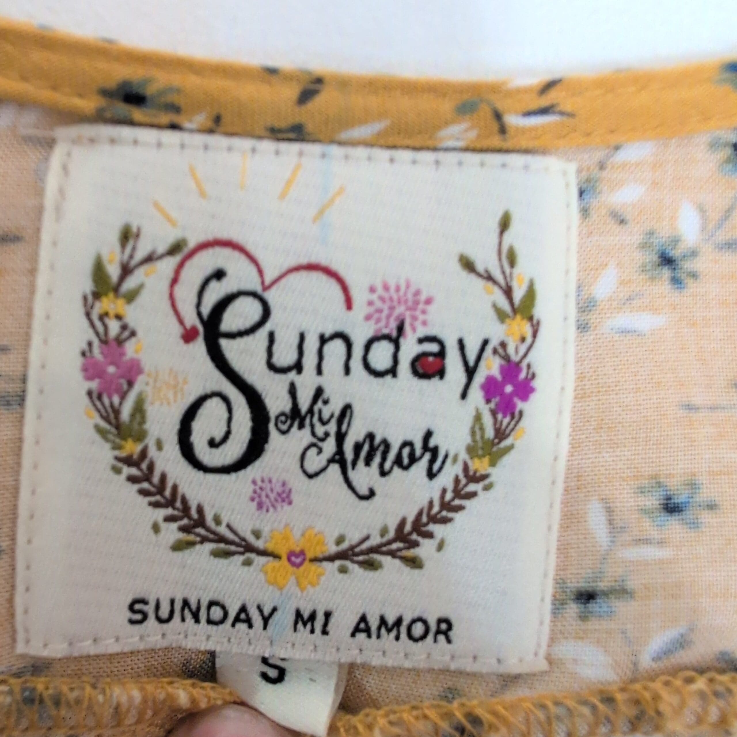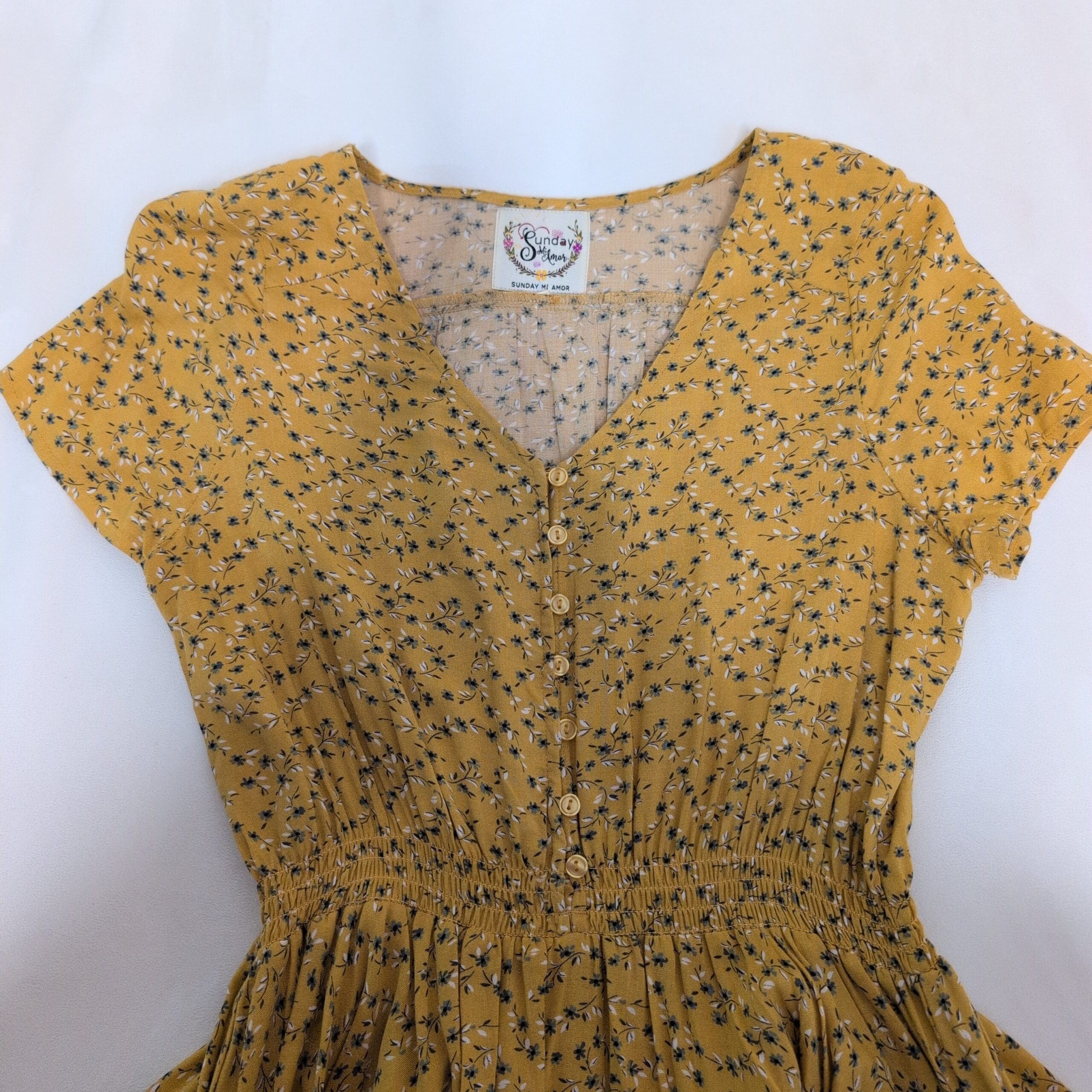 Sunday Mi Amor yellow floral dress, size S. V-neck, short sleeves, button-front bodice with smocked elastic waist and a full tiered skirt accented with crochet-style trim. Lightweight woven fabric ideal for spring and summer; versatile A-line silhouette perfect for everyday wear, brunch, or warm-weather events. Condition: pre-owned, gently used — no noticeable flaws visible in photos. Care: gentle wash or dry clean recommended; hang to dry. Please review photos for details and fit.
