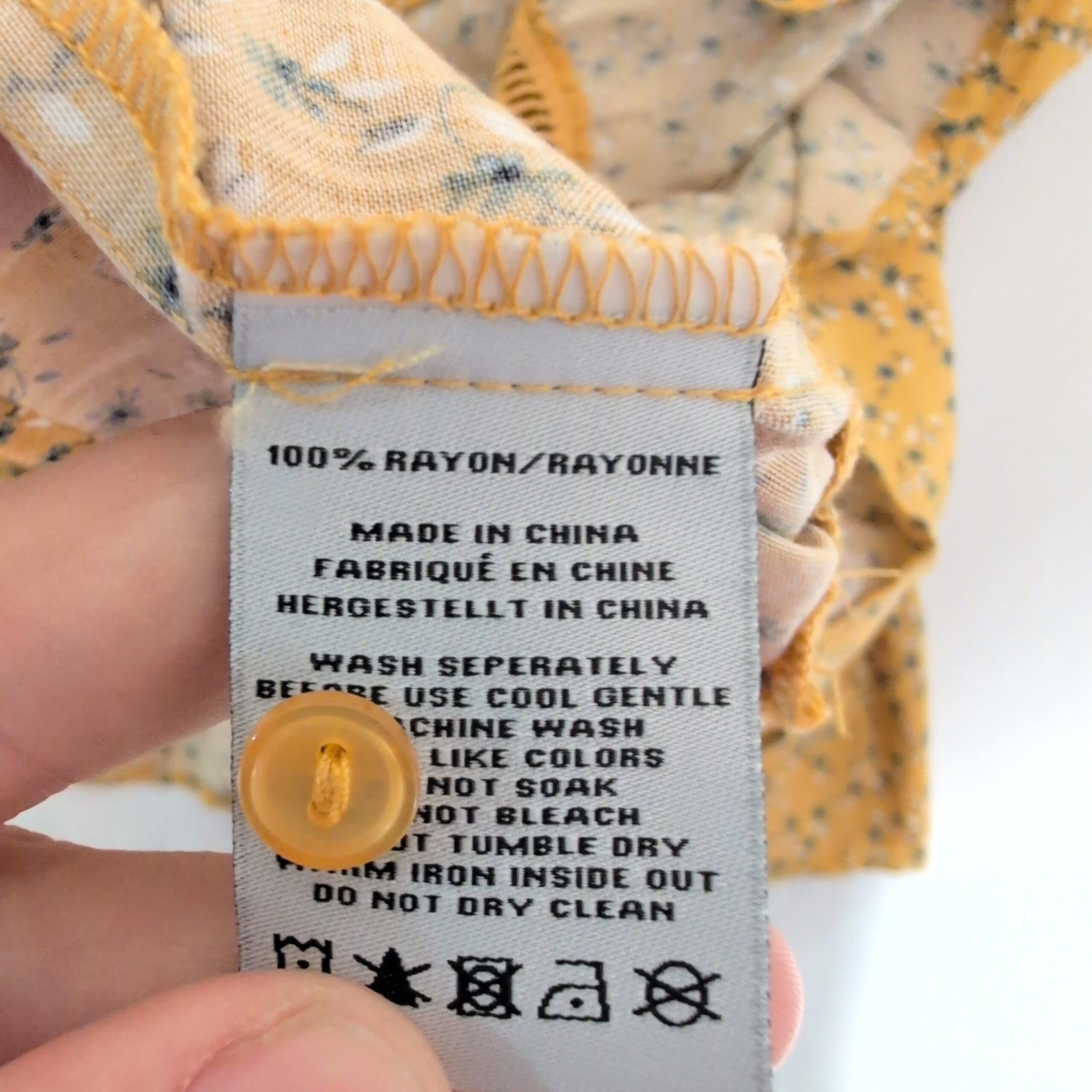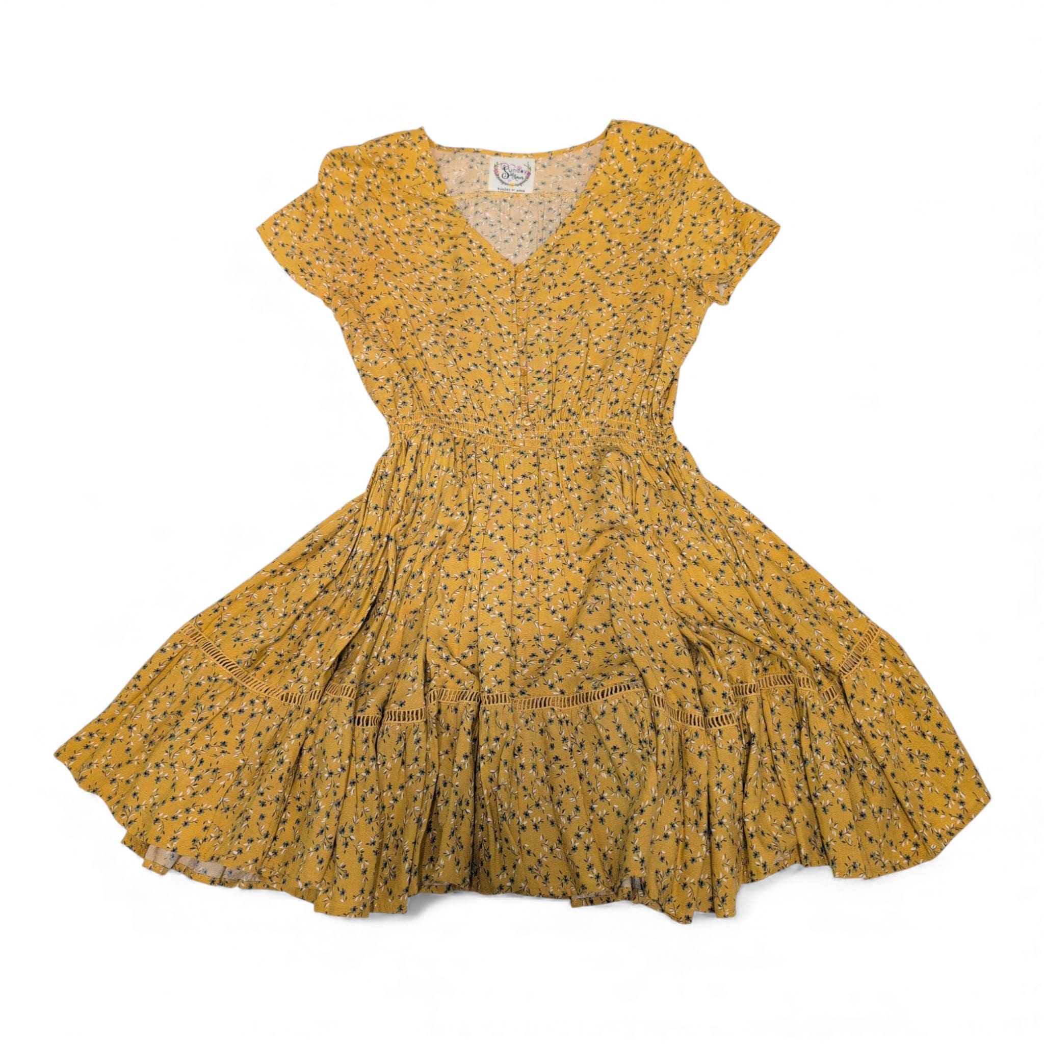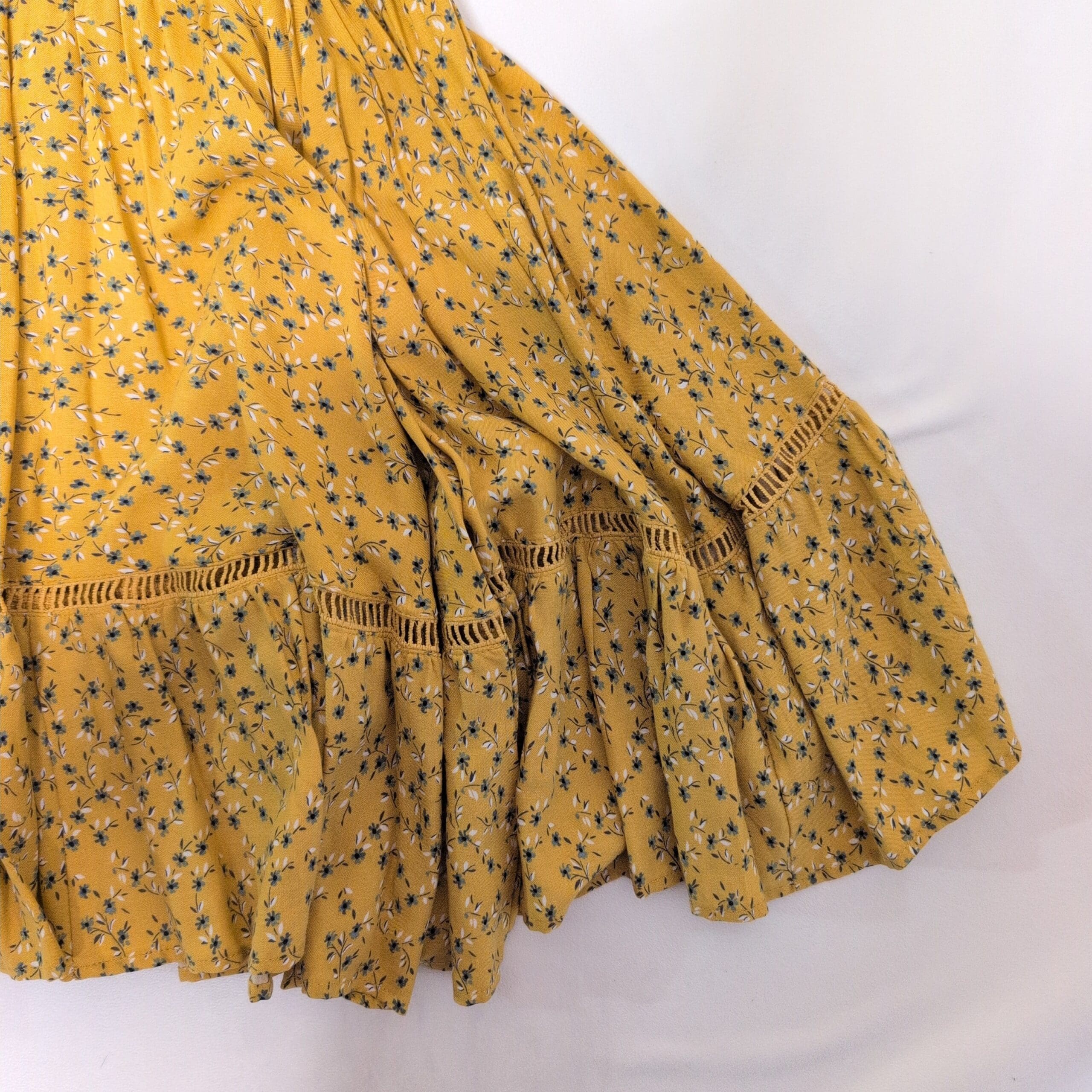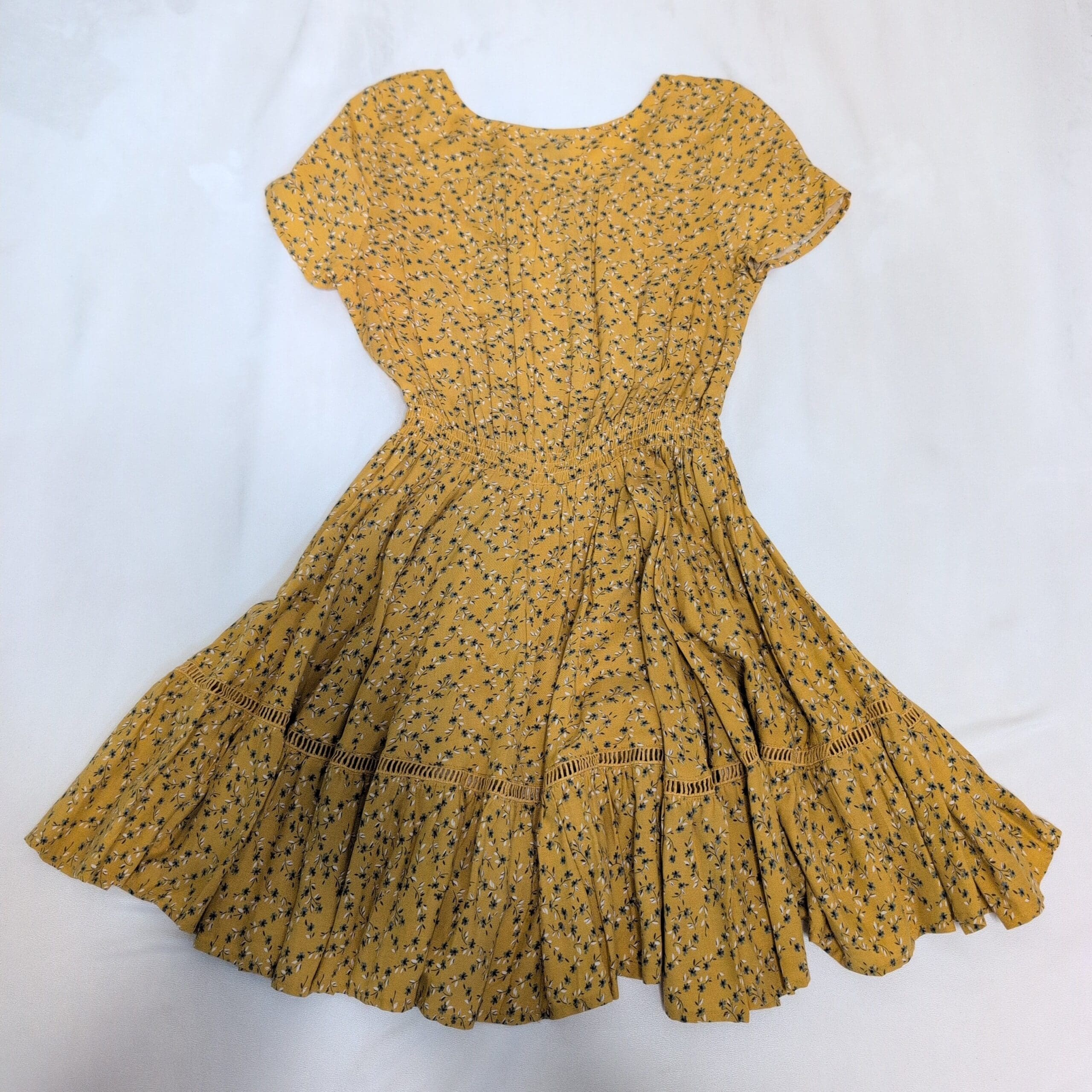 Sunday Mi Amor yellow floral dress, size S. V-neck, short sleeves, button-front bodice with smocked elastic waist and a full tiered skirt accented with crochet-style trim. Lightweight woven fabric ideal for spring and summer; versatile A-line silhouette perfect for everyday wear, brunch, or warm-weather events. Condition: pre-owned, gently used — no noticeable flaws visible in photos. Care: gentle wash or dry clean recommended; hang to dry. Please review photos for details and fit.