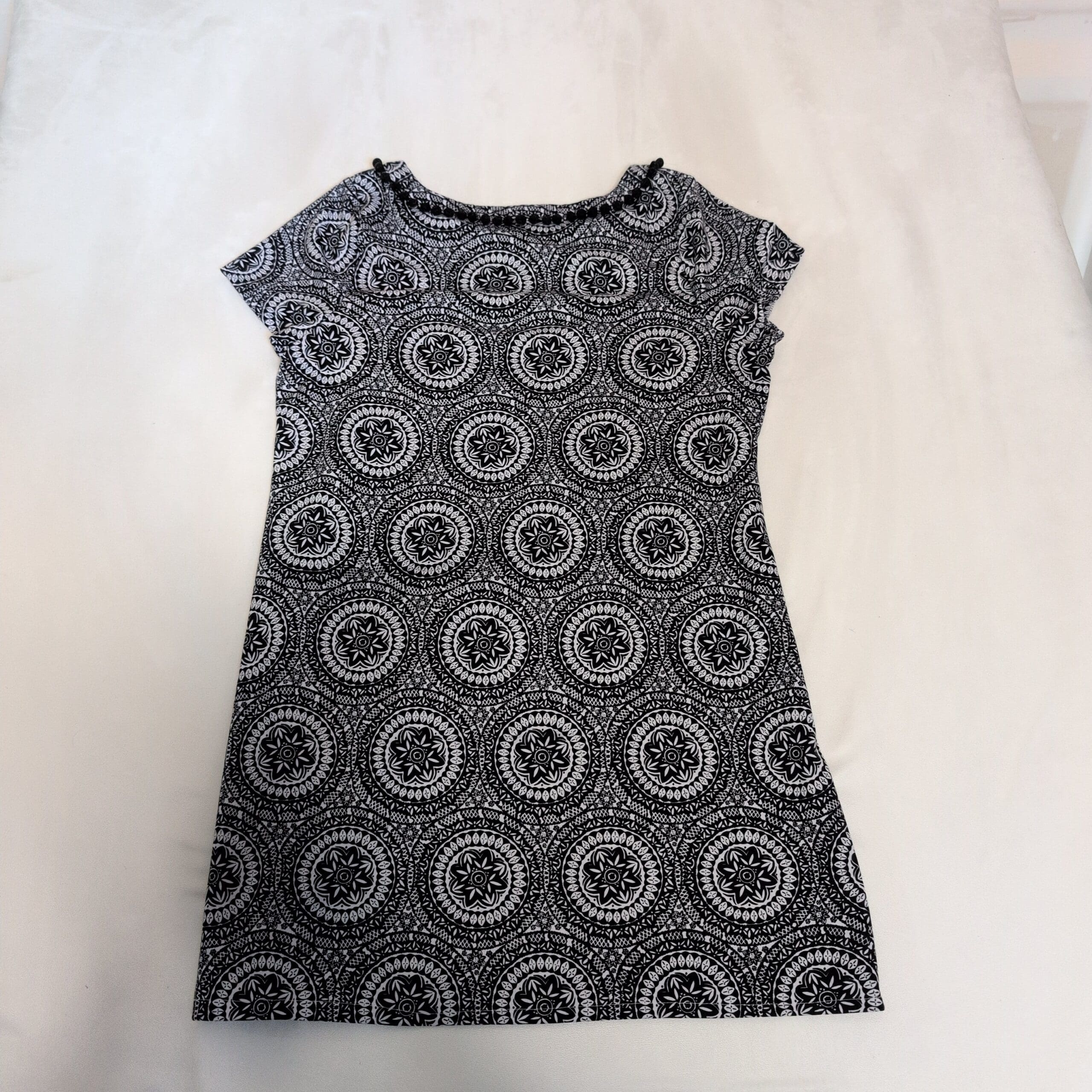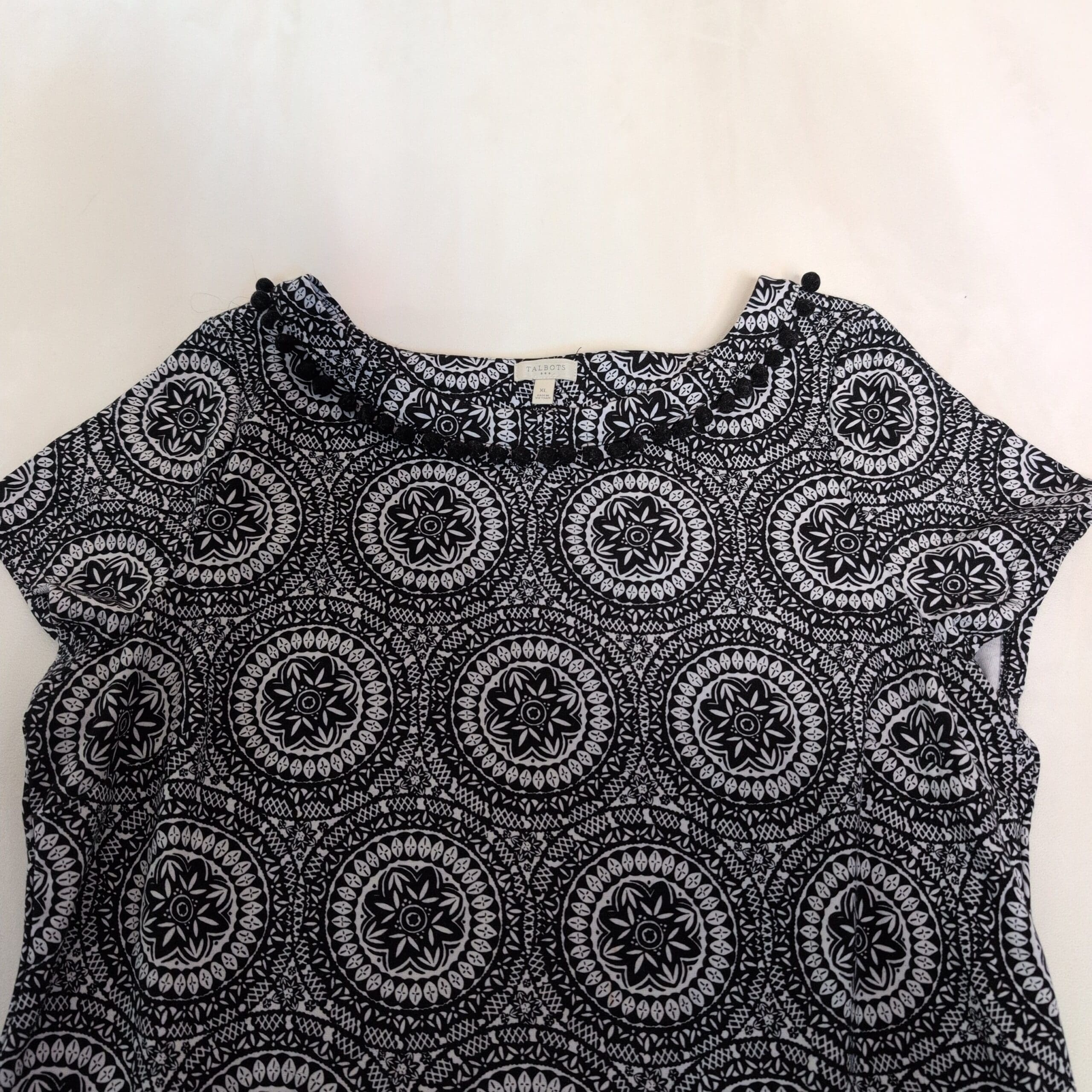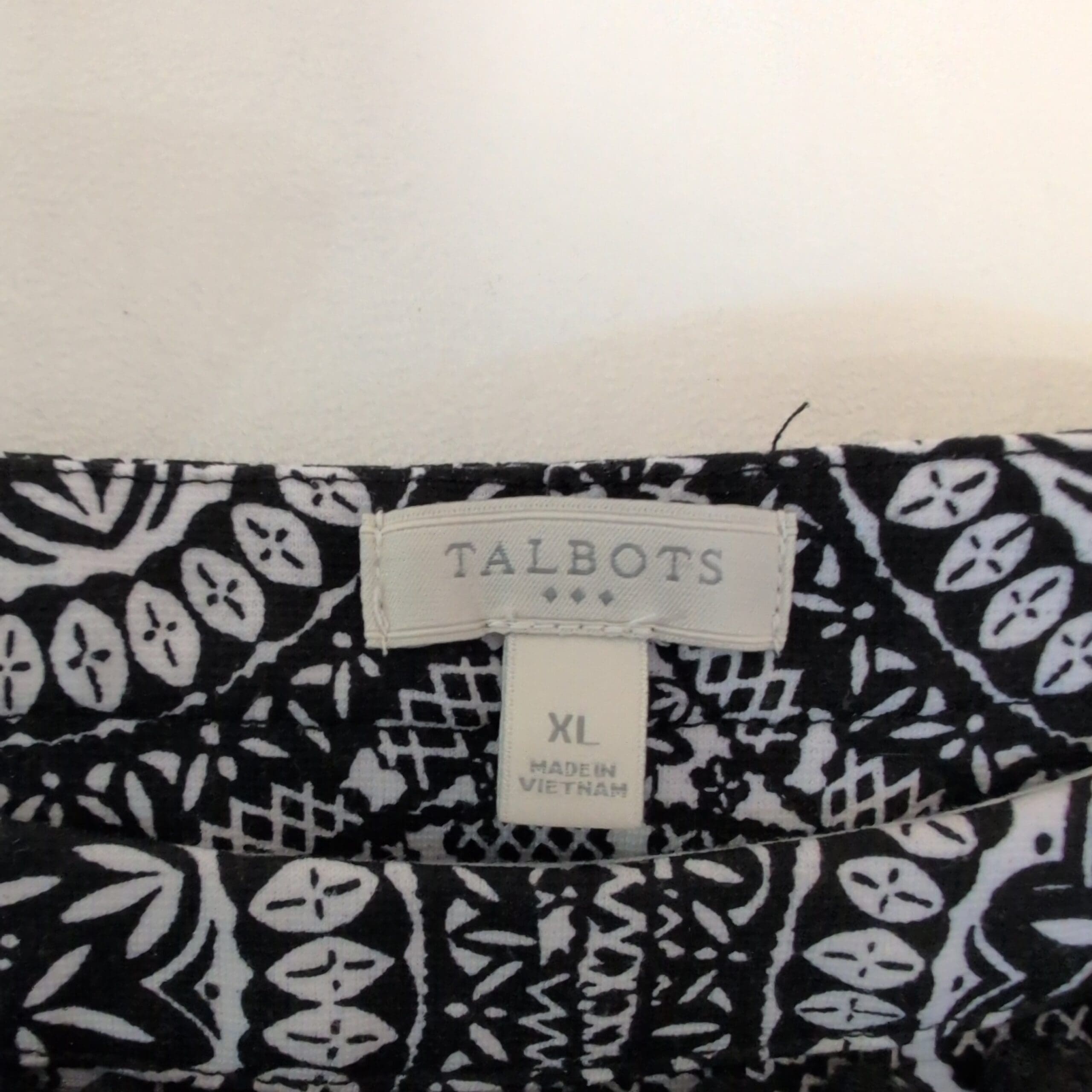 Talbots black & white medallion midi dress in size XL. Classic A-line/shift silhouette with a modest crew neckline and cap sleeves — a polished, versatile piece that dresses up for the office or down for weekends. All-over circular medallion print provides visual interest while keeping the color palette neutral and easy to style. Gently used and free of major rips, tears, stains, or flaws; typical light wear from prior use may be present. Please review photos for pattern detail and overall condition.