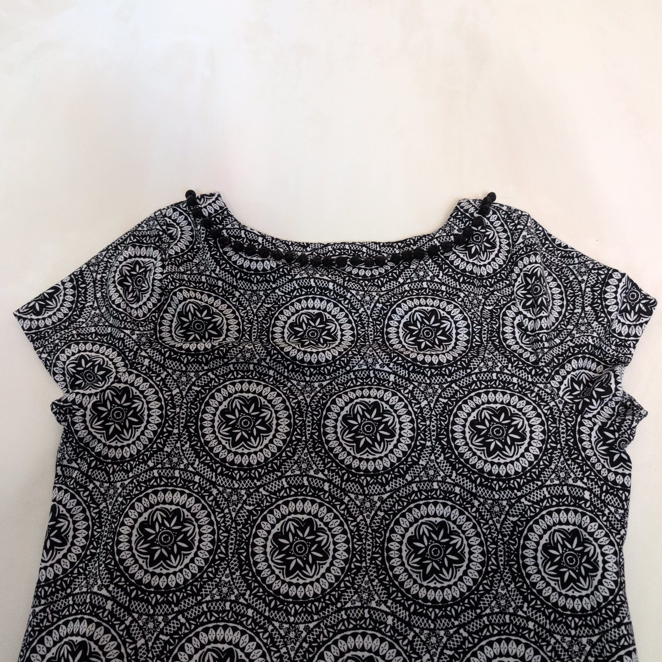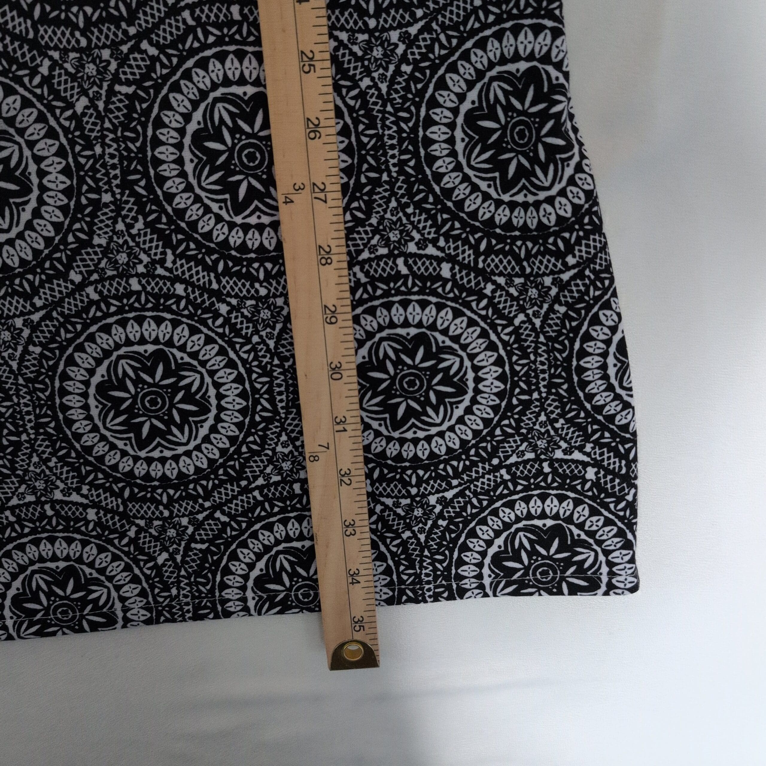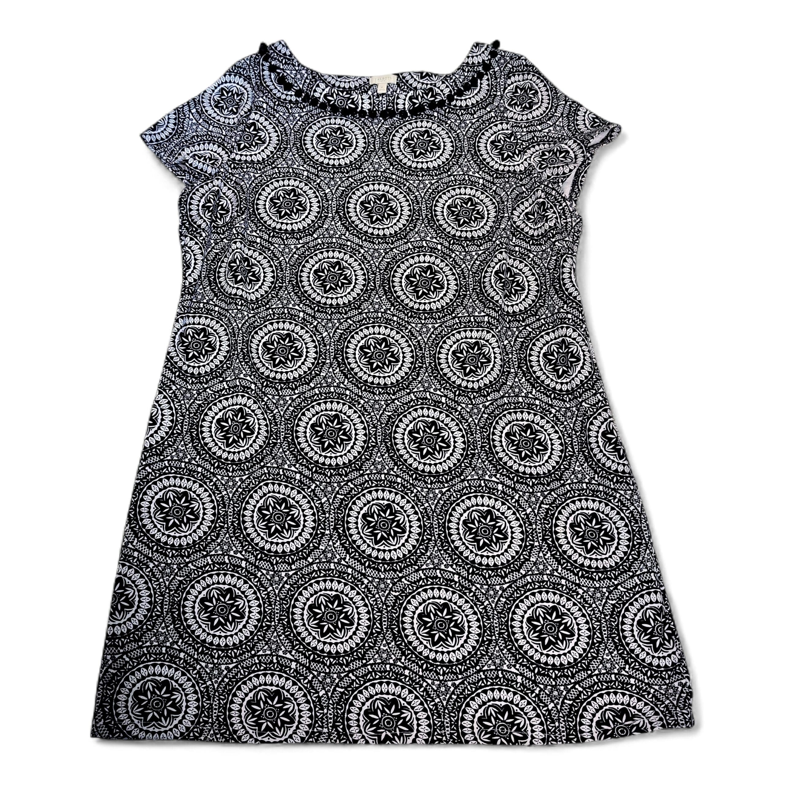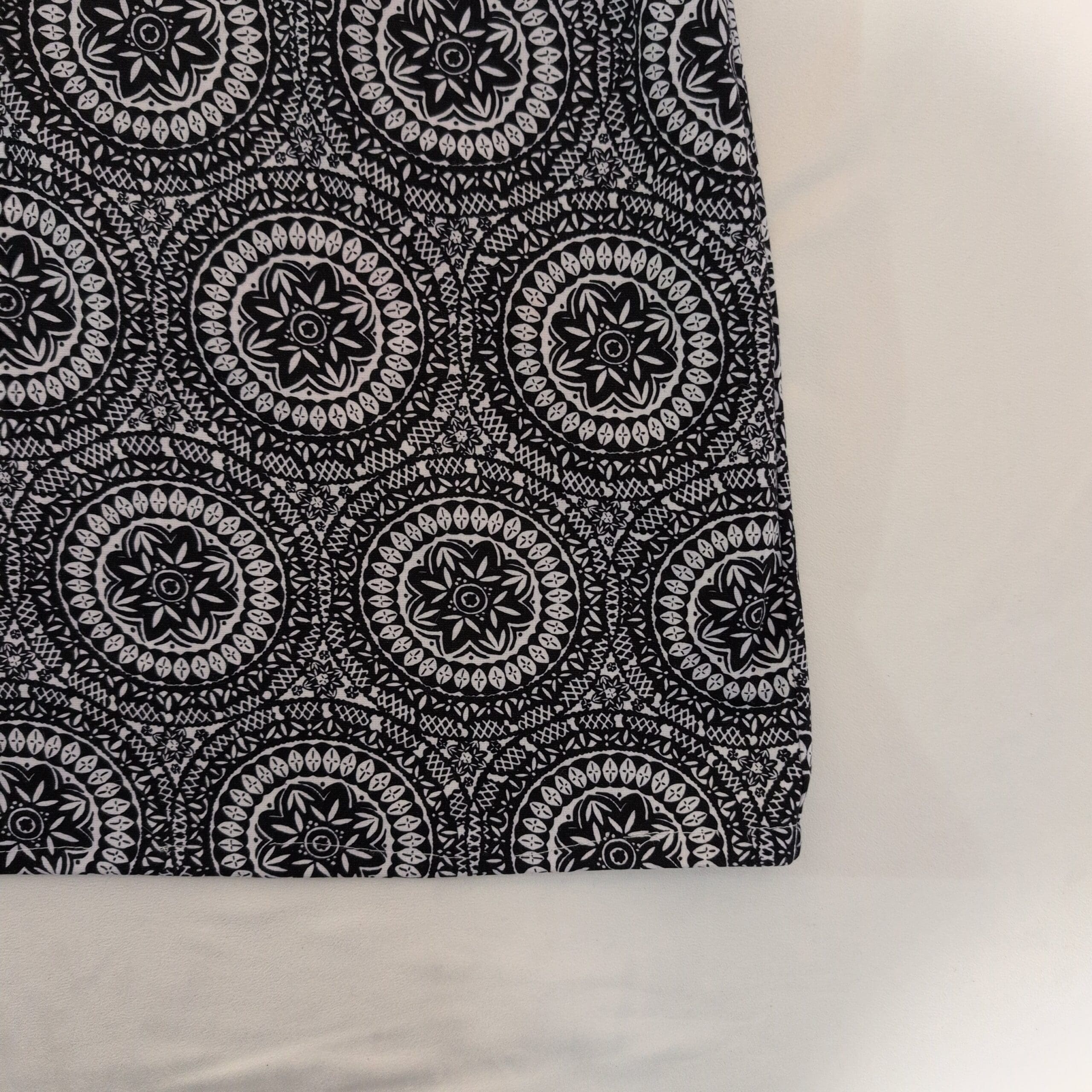 Talbots black & white medallion midi dress in size XL. Classic A-line/shift silhouette with a modest crew neckline and cap sleeves — a polished, versatile piece that dresses up for the office or down for weekends. All-over circular medallion print provides visual interest while keeping the color palette neutral and easy to style. Gently used and free of major rips, tears, stains, or flaws; typical light wear from prior use may be present. Please review photos for pattern detail and overall condition.
